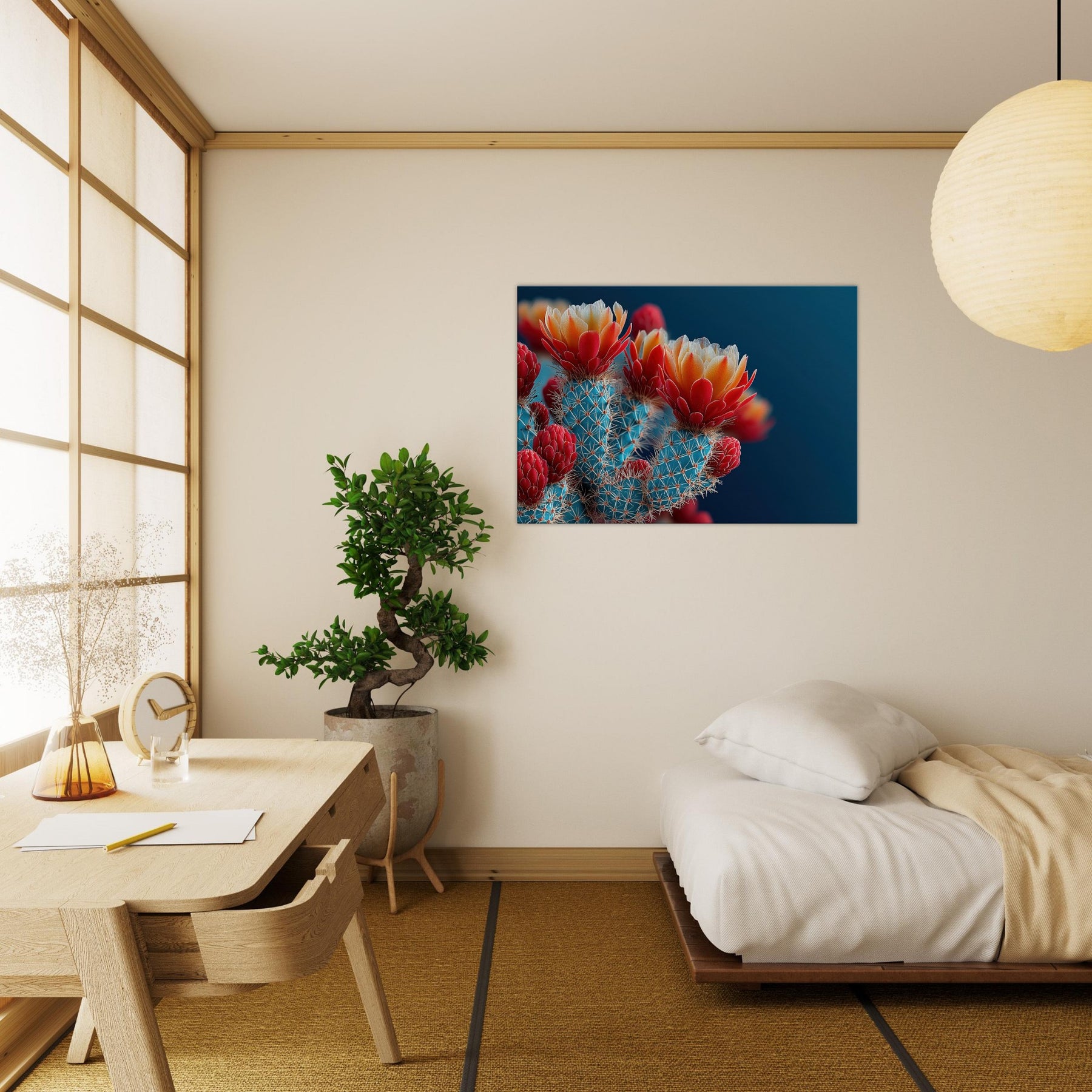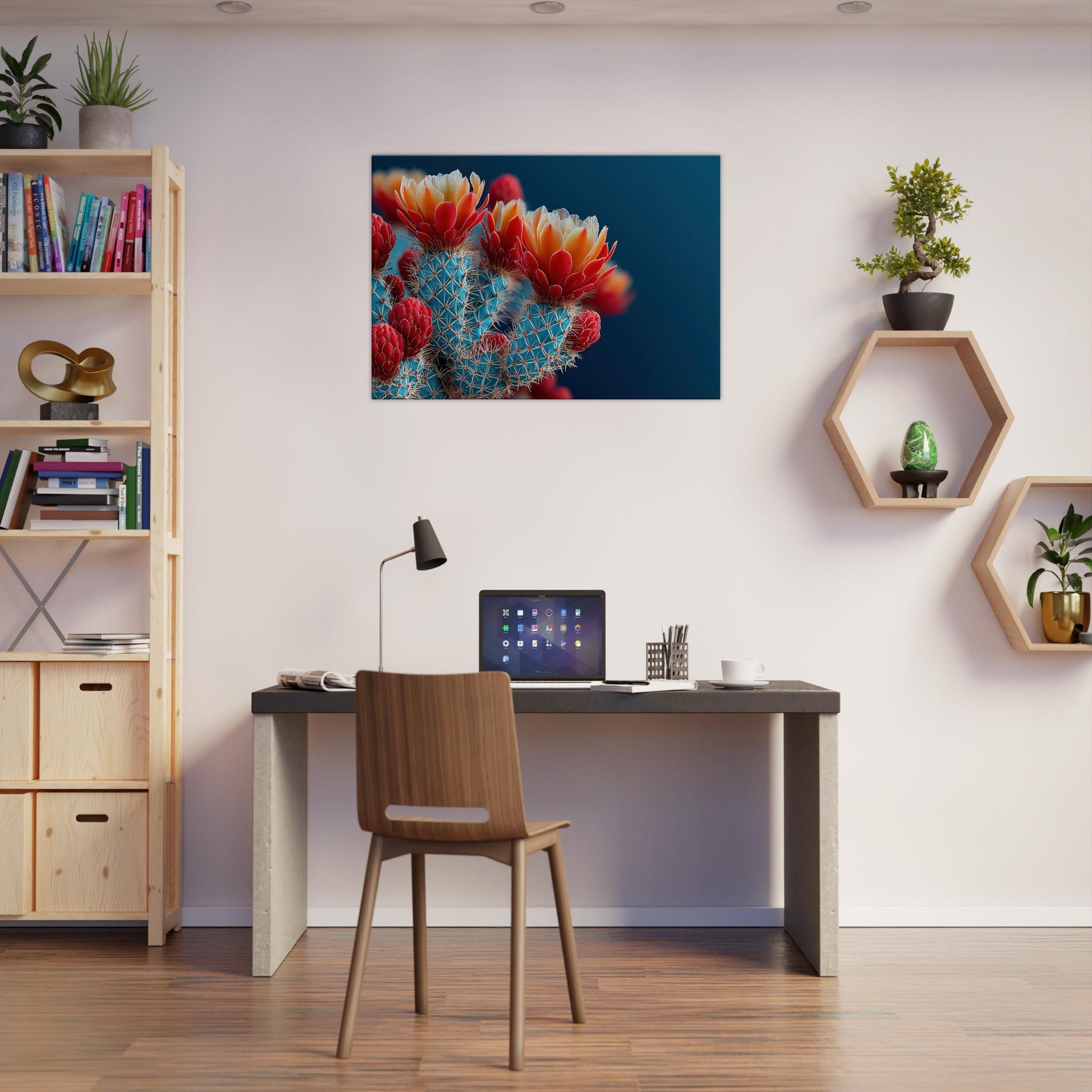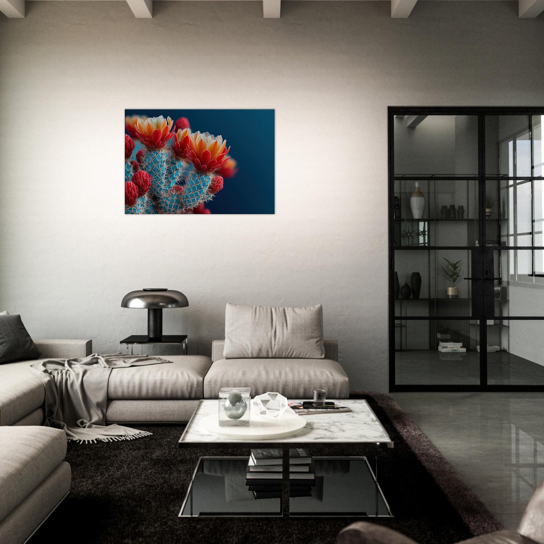 An abstract celebration of resilience and color, this cactus composition threads electric azure stems with sunlit blossoms in crimson and gold. The Primary Subject, a cactus, rises in geometric calm, while spines catch light like delicate beads. The scene hums with a quiet energy cool blue backdrop, warm florals creating a contemplative focal point that invites long gazes and soft conversations. Perfect for a living room or entry, it adds depth, texture, and a breath of desert air to everyday living.