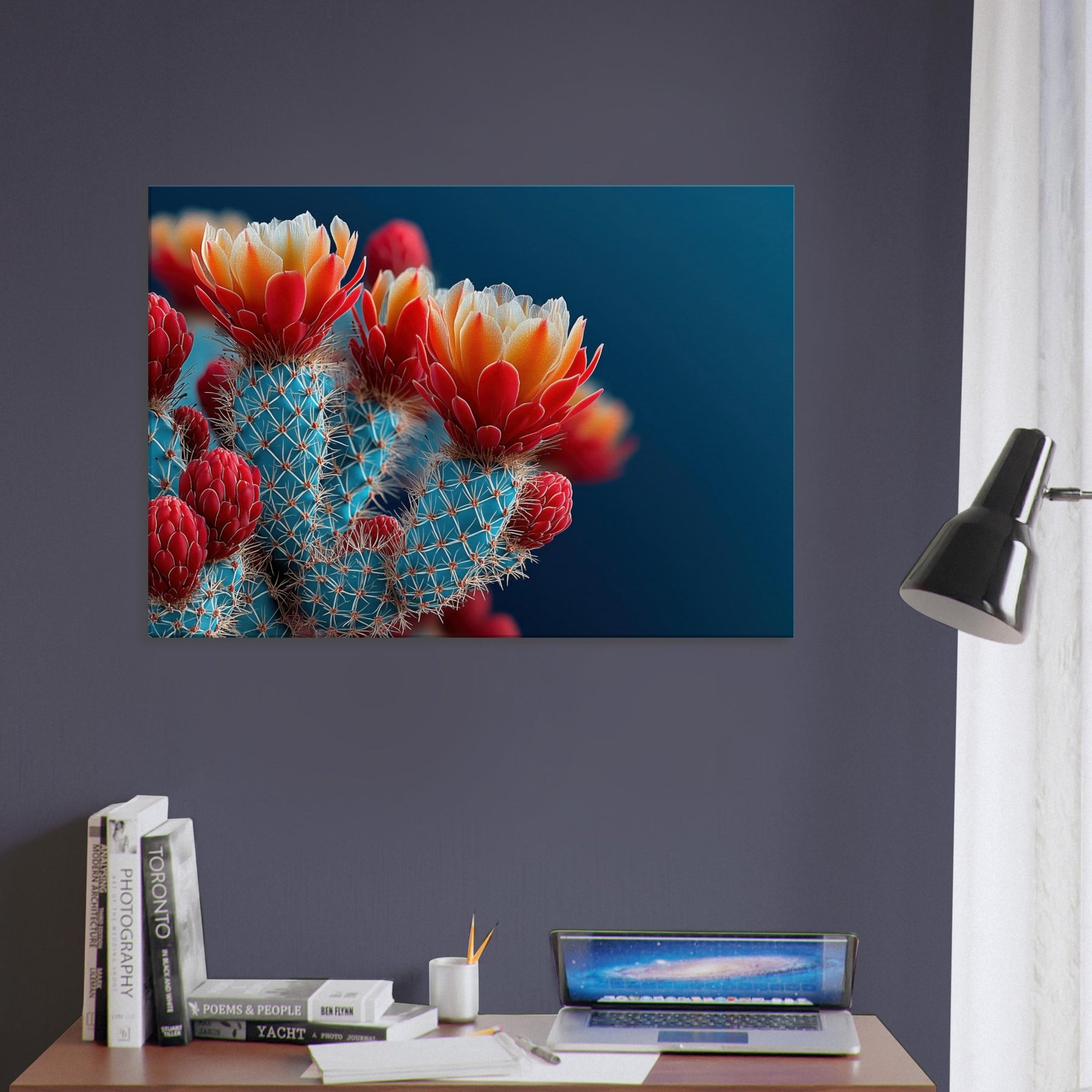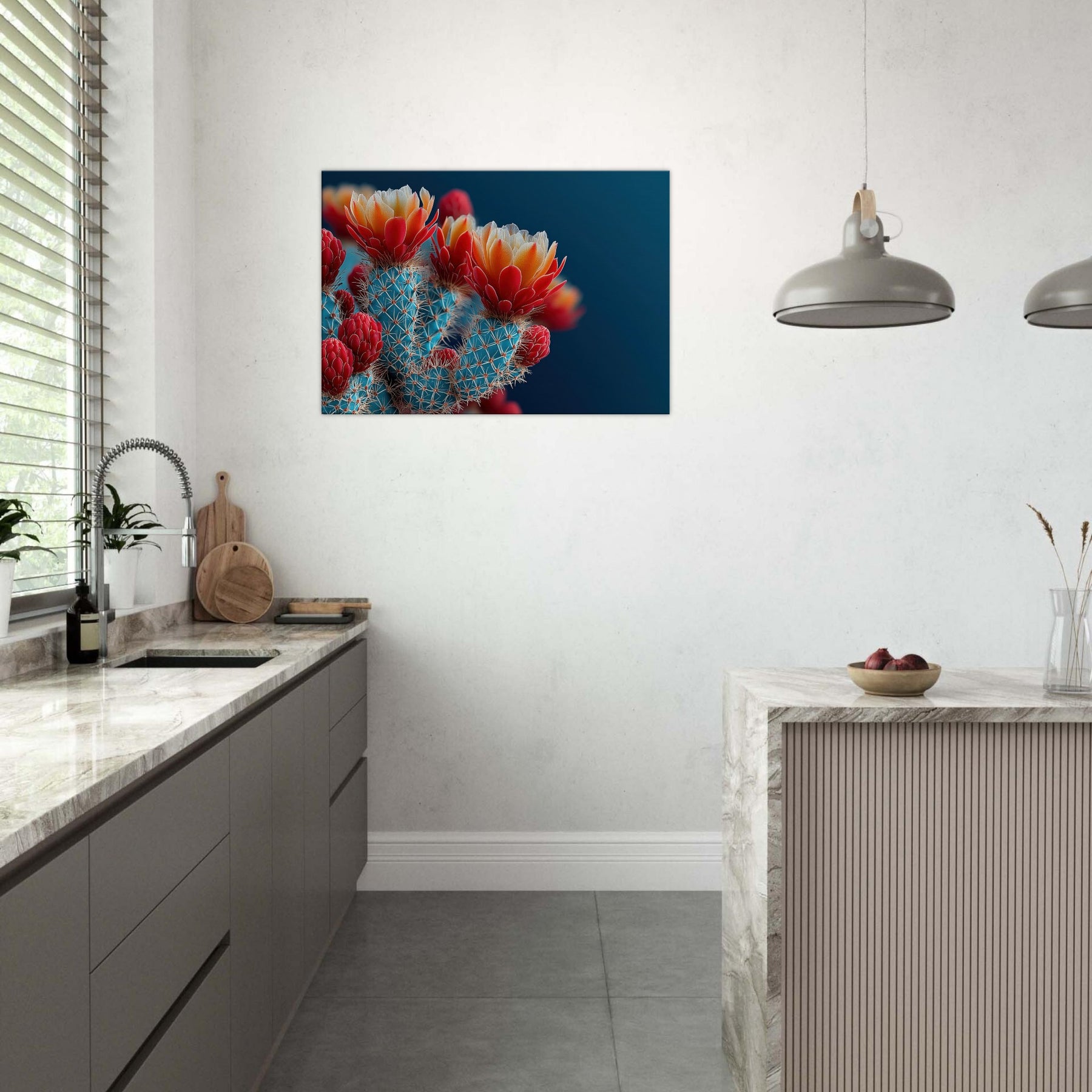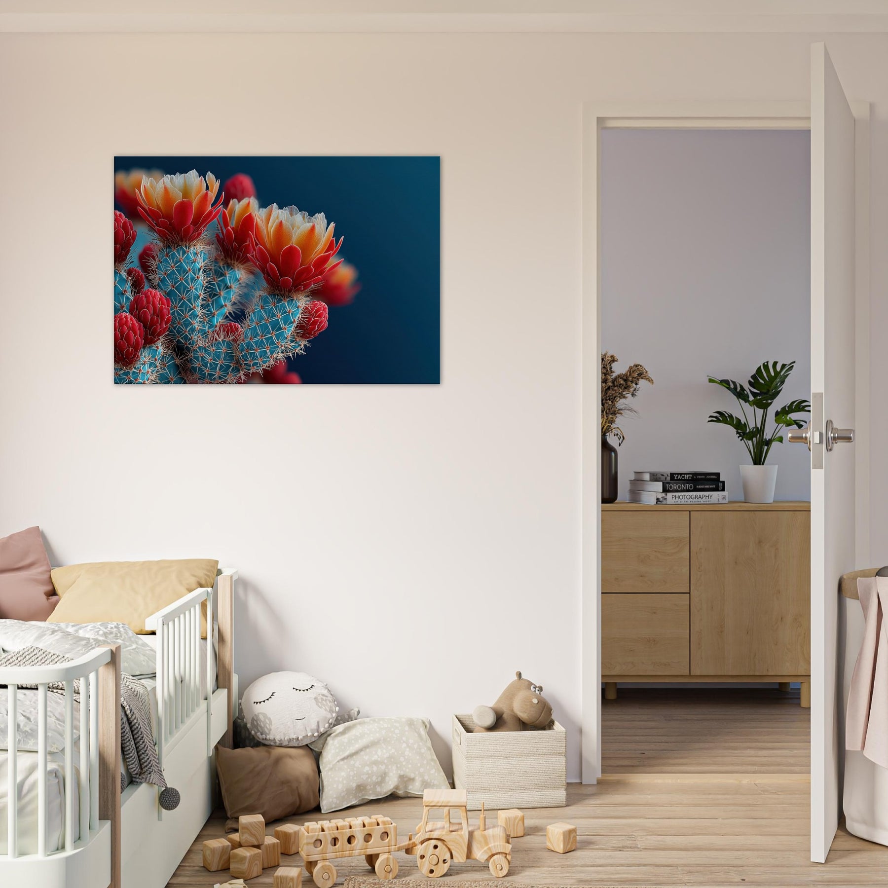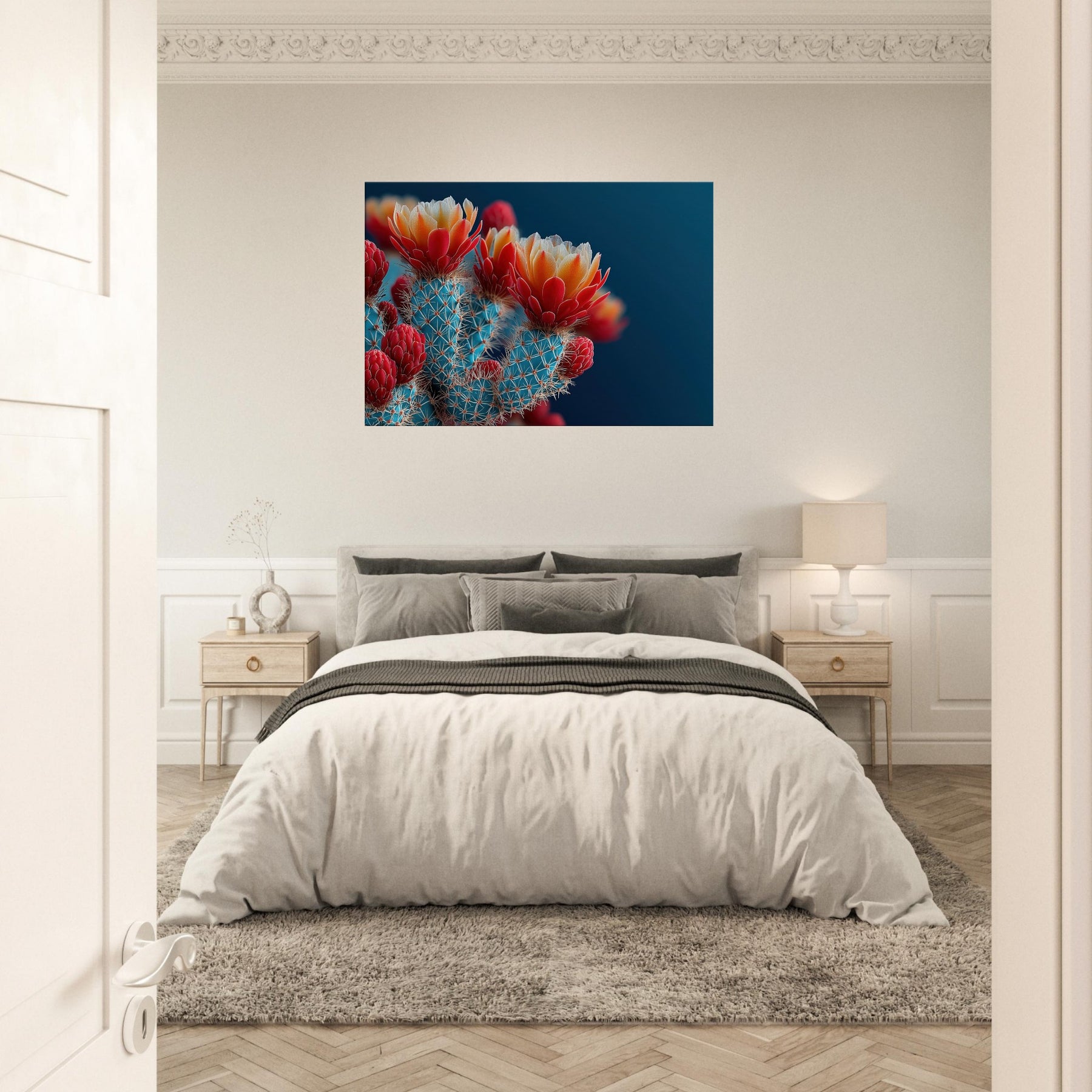 An abstract celebration of resilience and color, this cactus composition threads electric azure stems with sunlit blossoms in crimson and gold. The Primary Subject, a cactus, rises in geometric calm, while spines catch light like delicate beads. The scene hums with a quiet energy cool blue backdrop, warm florals creating a contemplative focal point that invites long gazes and soft conversations. Perfect for a living room or entry, it adds depth, texture, and a breath of desert air to everyday living.