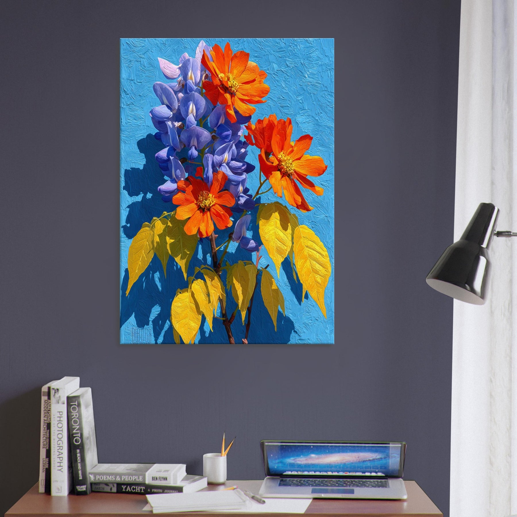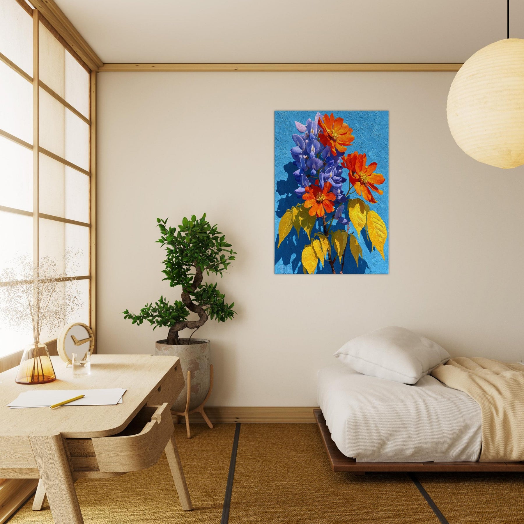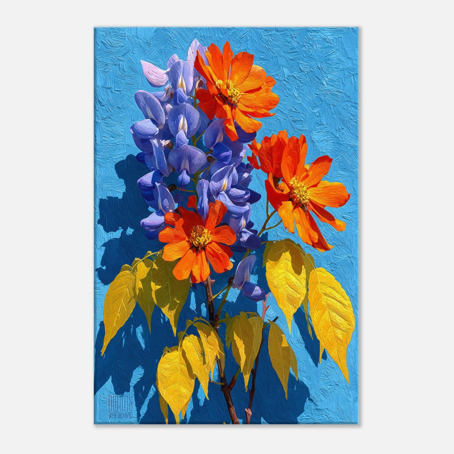 Wisteria cascades across the canvas in a living chorus of violet clusters and coral blooms, set against a radiant blue field. This abstract invitation breathes light and movement into any room, inviting quiet contemplation as color ripples with warmth and depth. The piece feels like a sunlit garden you can step into, turning a hallway or living area into a tranquil, memory rich space that nourishes everyday moments.