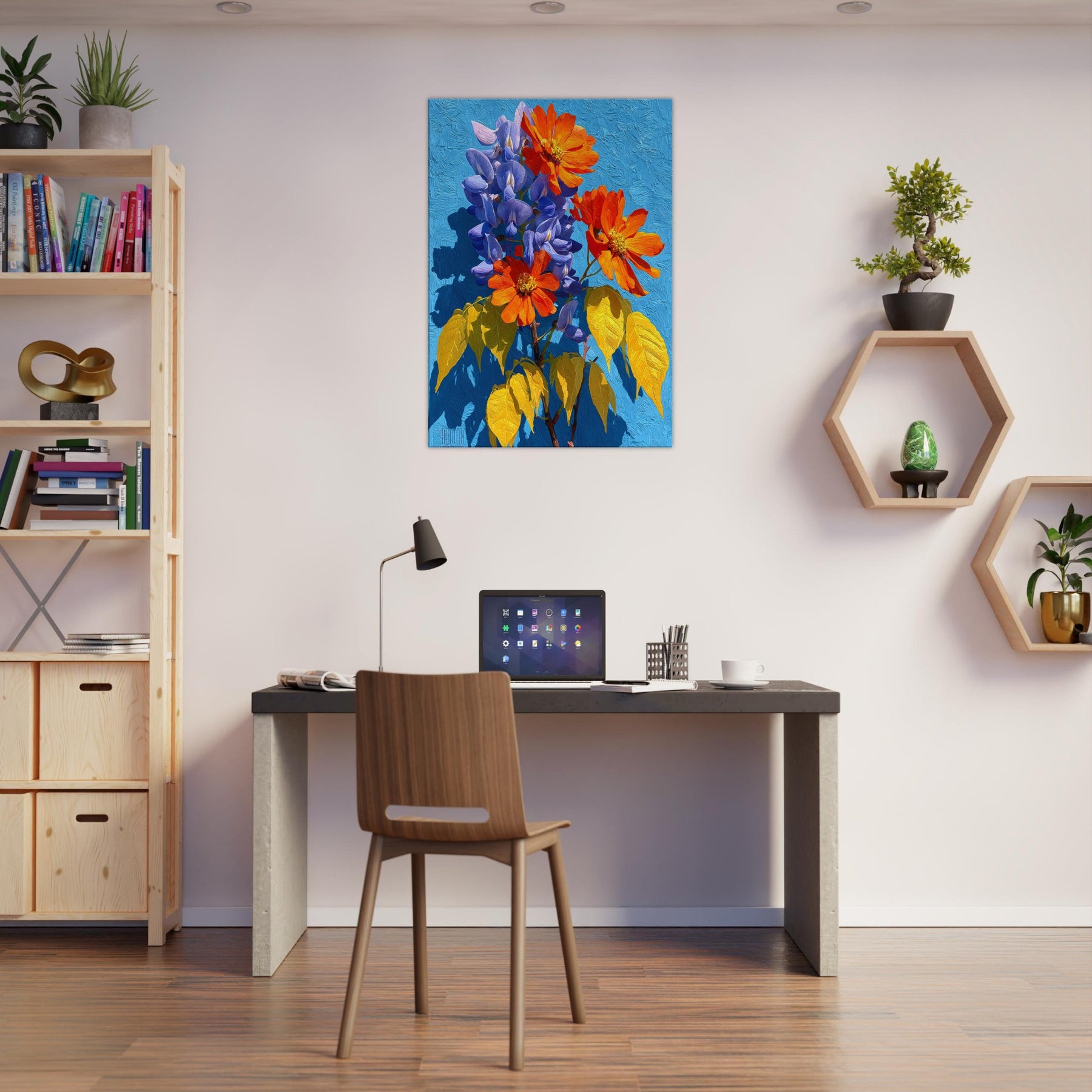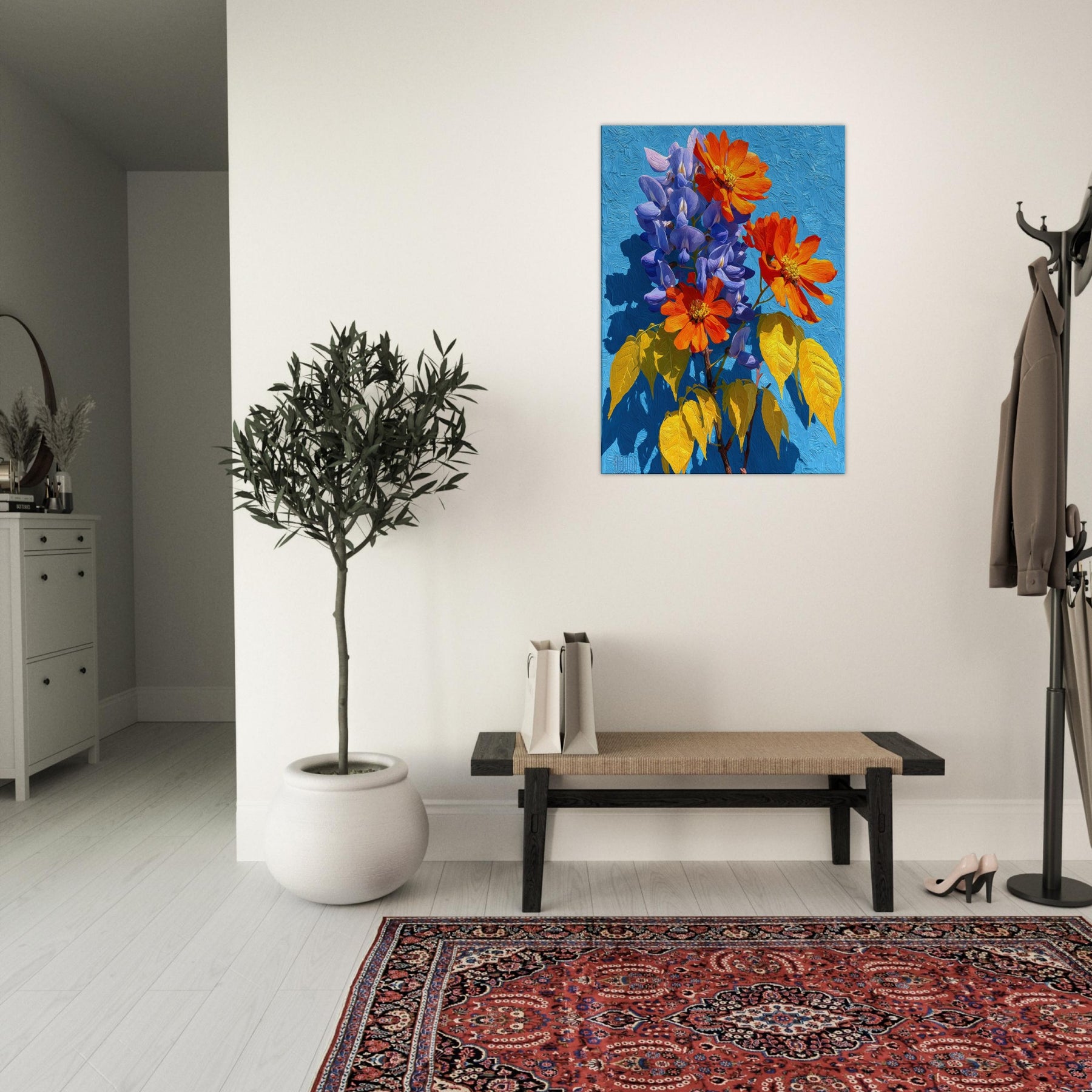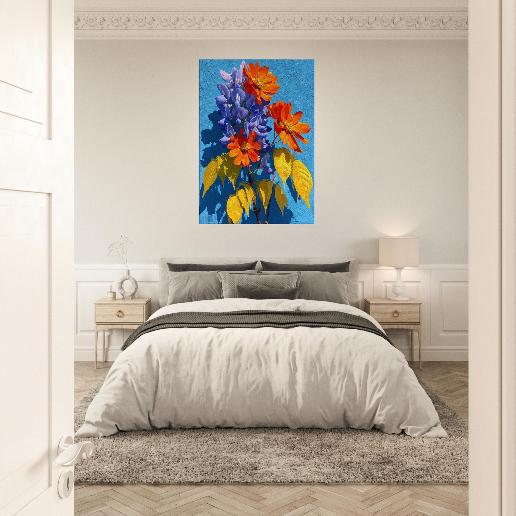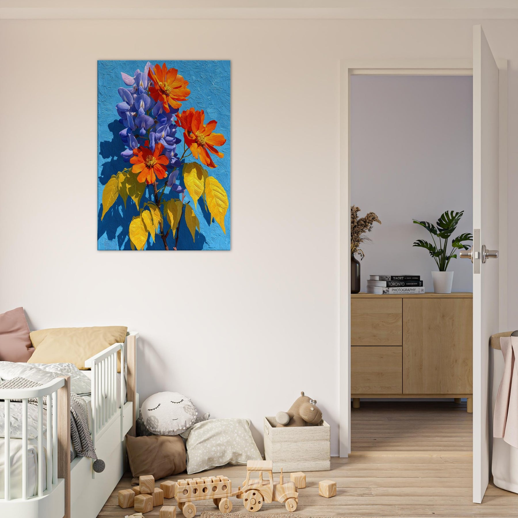 Wisteria cascades across the canvas in a living chorus of violet clusters and coral blooms, set against a radiant blue field. This abstract invitation breathes light and movement into any room, inviting quiet contemplation as color ripples with warmth and depth. The piece feels like a sunlit garden you can step into, turning a hallway or living area into a tranquil, memory rich space that nourishes everyday moments.