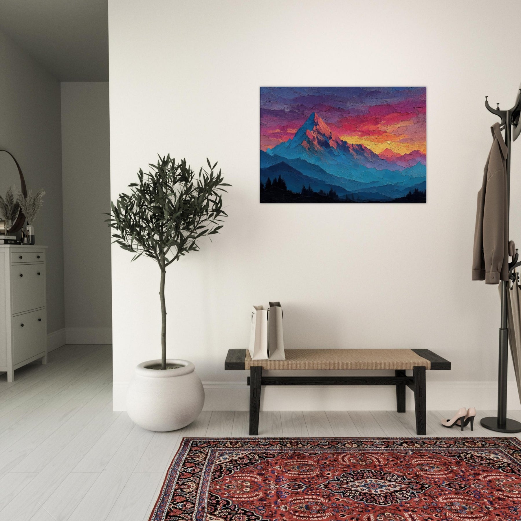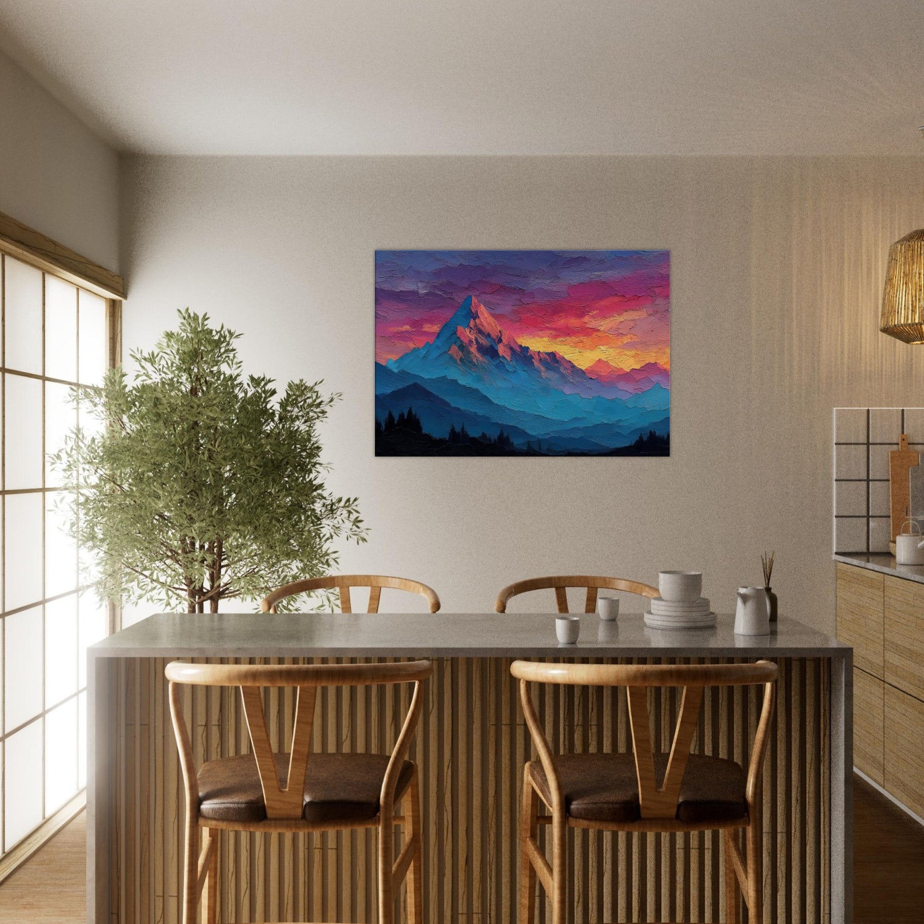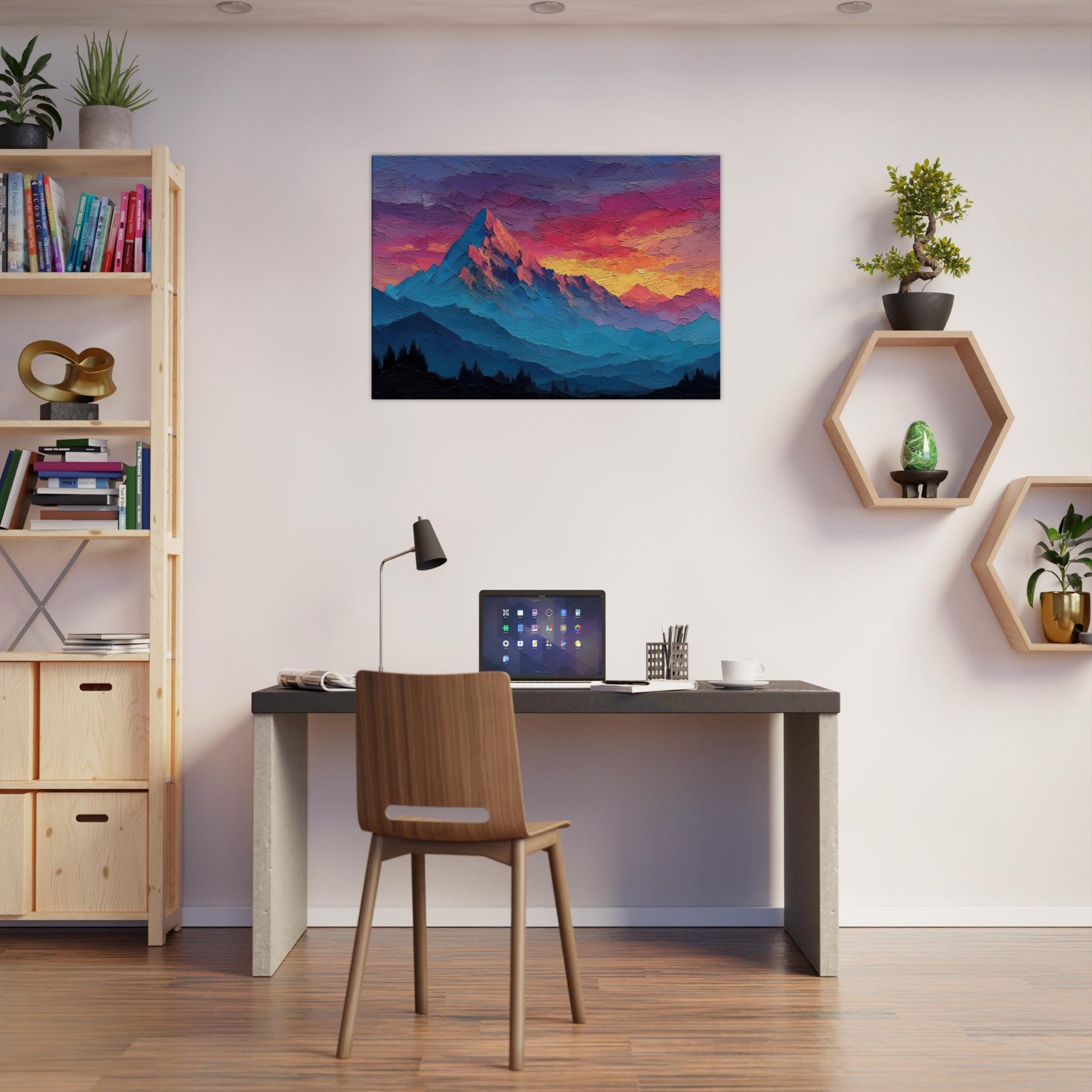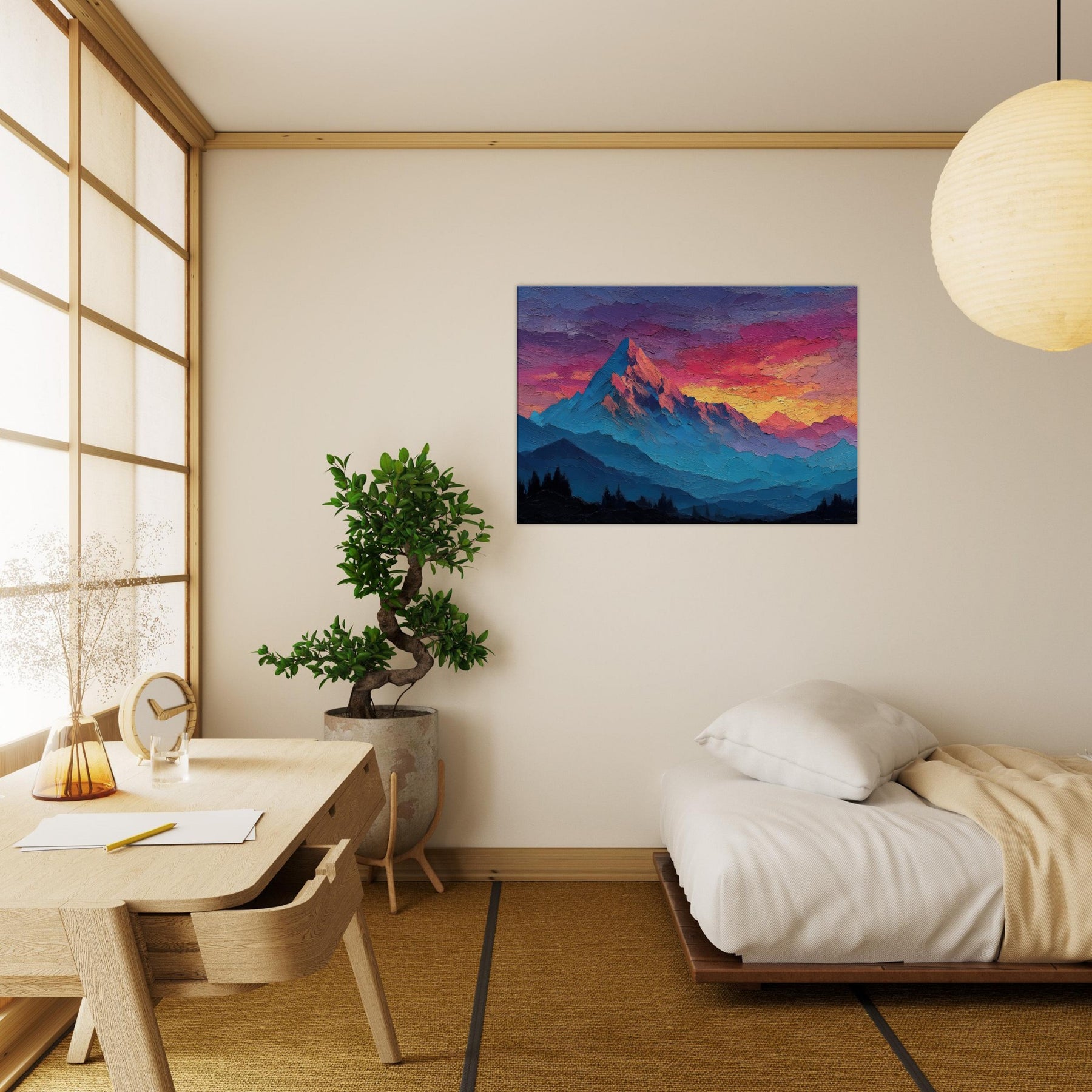 Sunset unfurls across the peaks in this abstract mountain vision, where color spills from coral and gold into cool blues and indigo shadows. The textured brushwork catches light as if the horizon itself were breathing, inviting quiet wonder into any living space. Hang it above a sofa or in a hall to create a moment of calm, a reminder that nature’s glow can soften edges, elevate mood, and turn everyday walls into a contemplative, luminous backdrop.