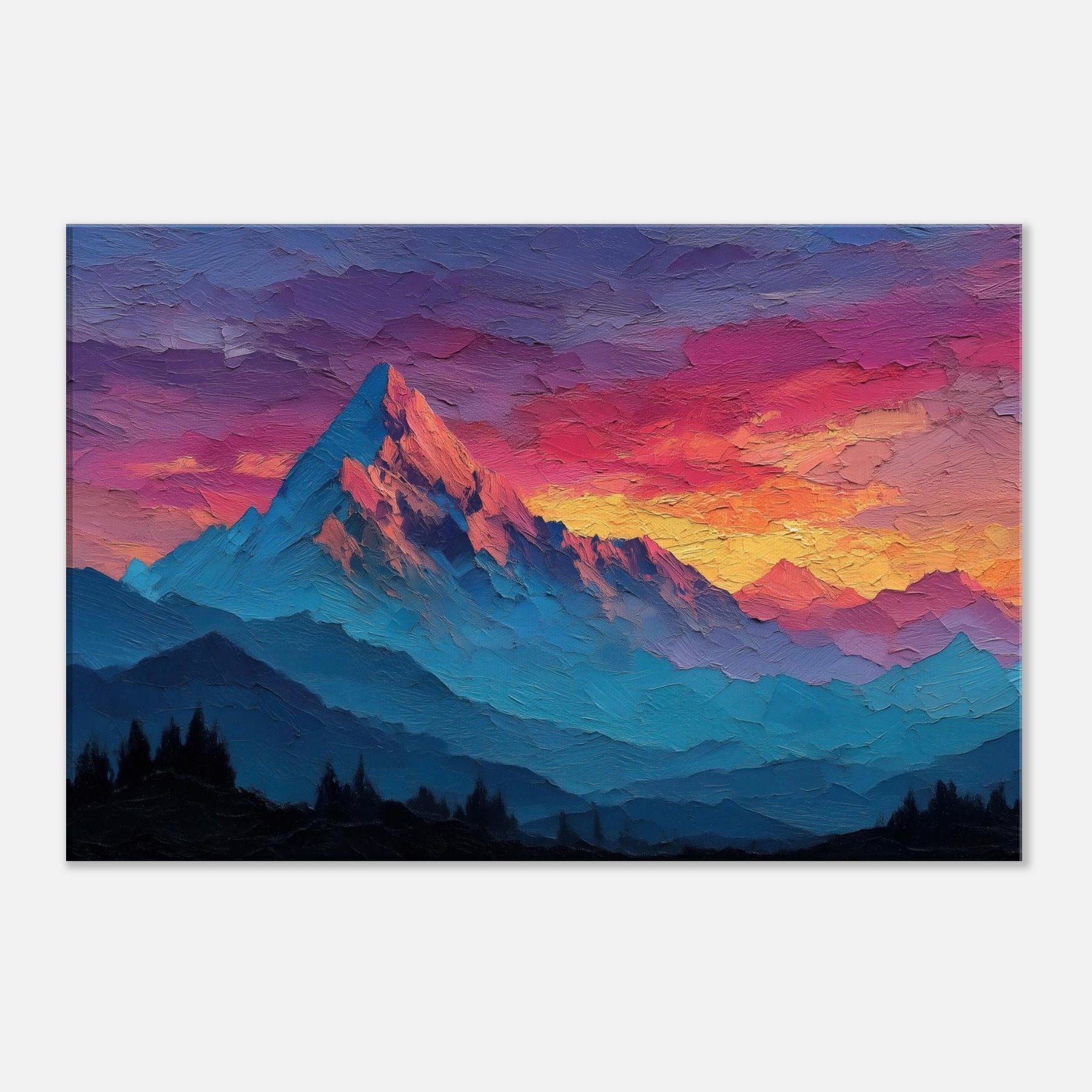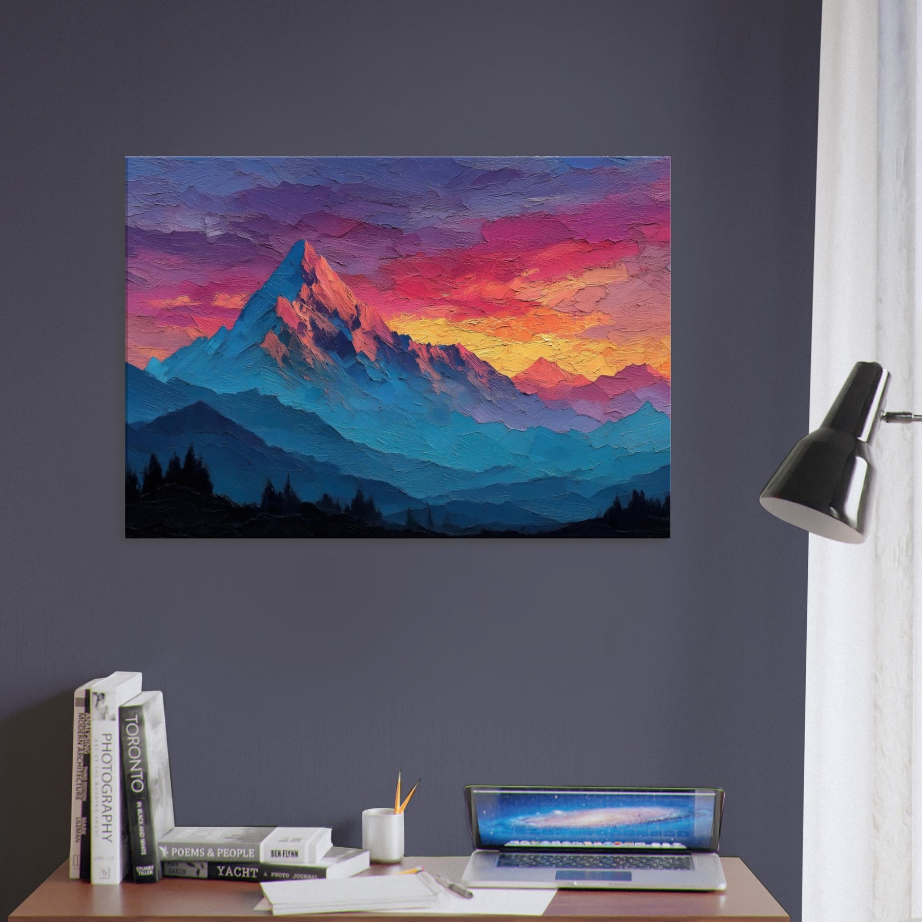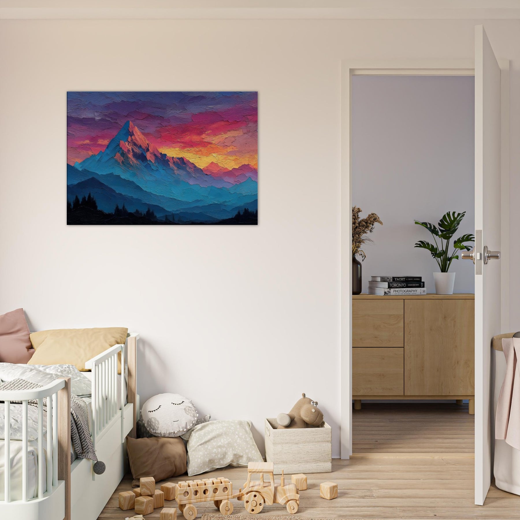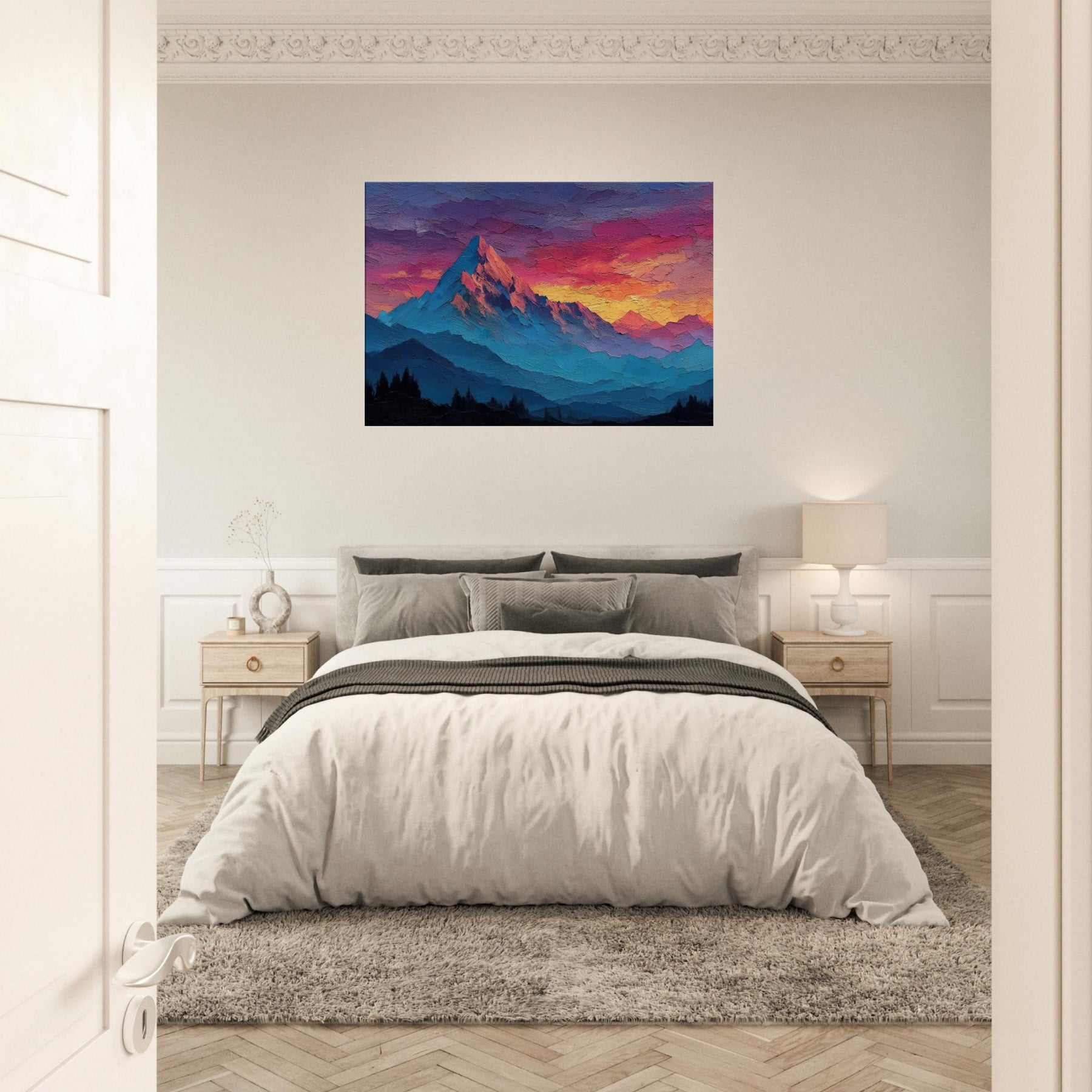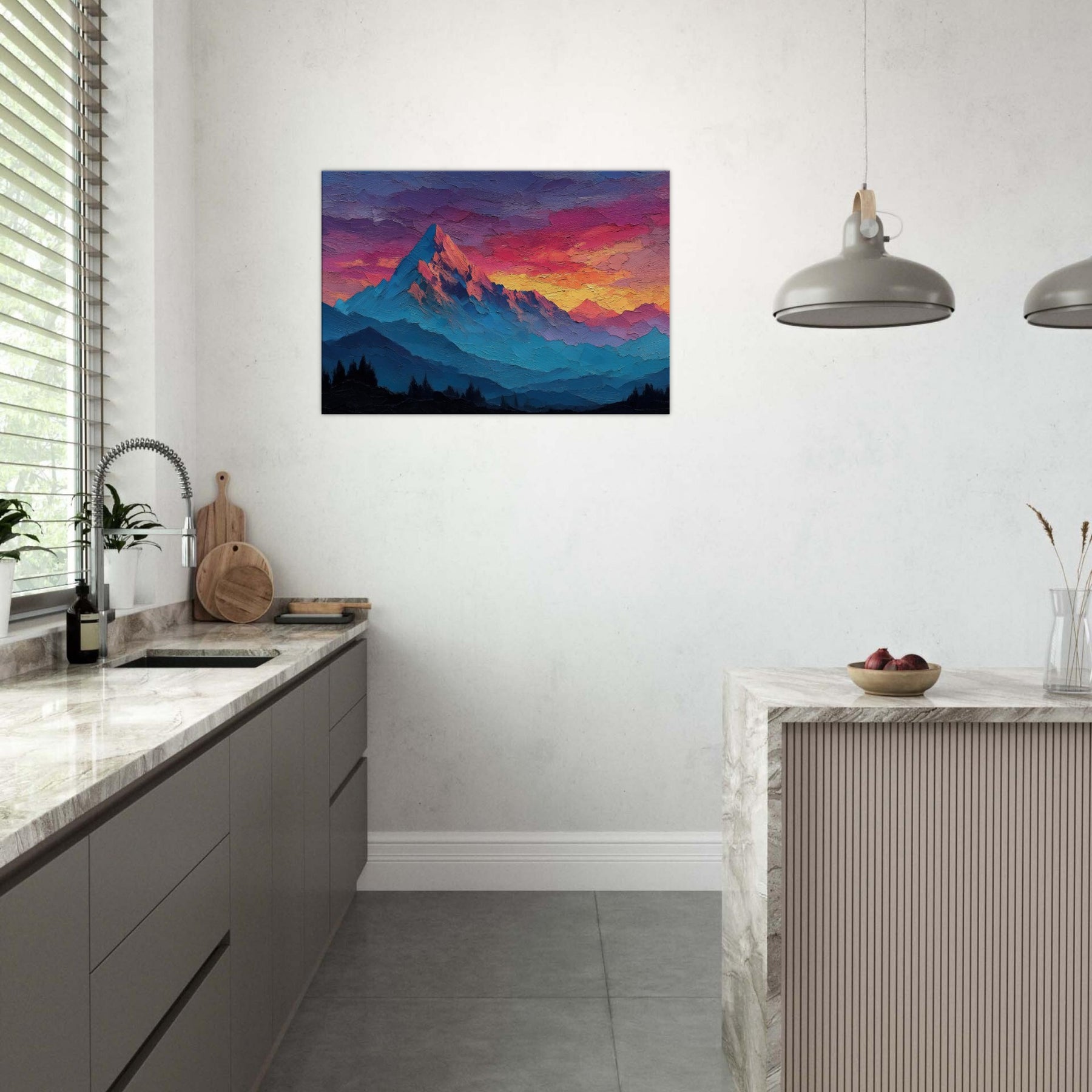 Sunset unfurls across the peaks in this abstract mountain vision, where color spills from coral and gold into cool blues and indigo shadows. The textured brushwork catches light as if the horizon itself were breathing, inviting quiet wonder into any living space. Hang it above a sofa or in a hall to create a moment of calm, a reminder that nature’s glow can soften edges, elevate mood, and turn everyday walls into a contemplative, luminous backdrop.