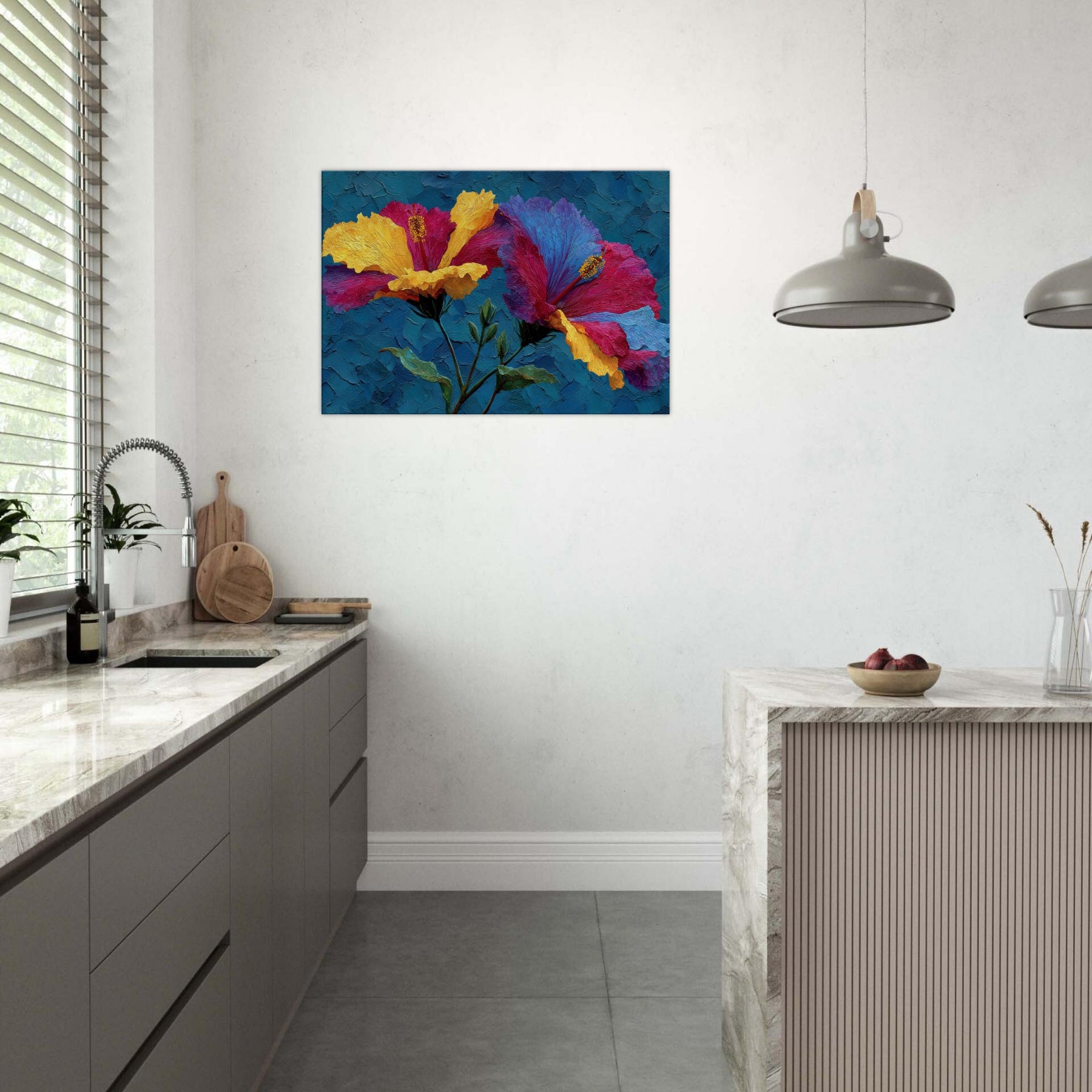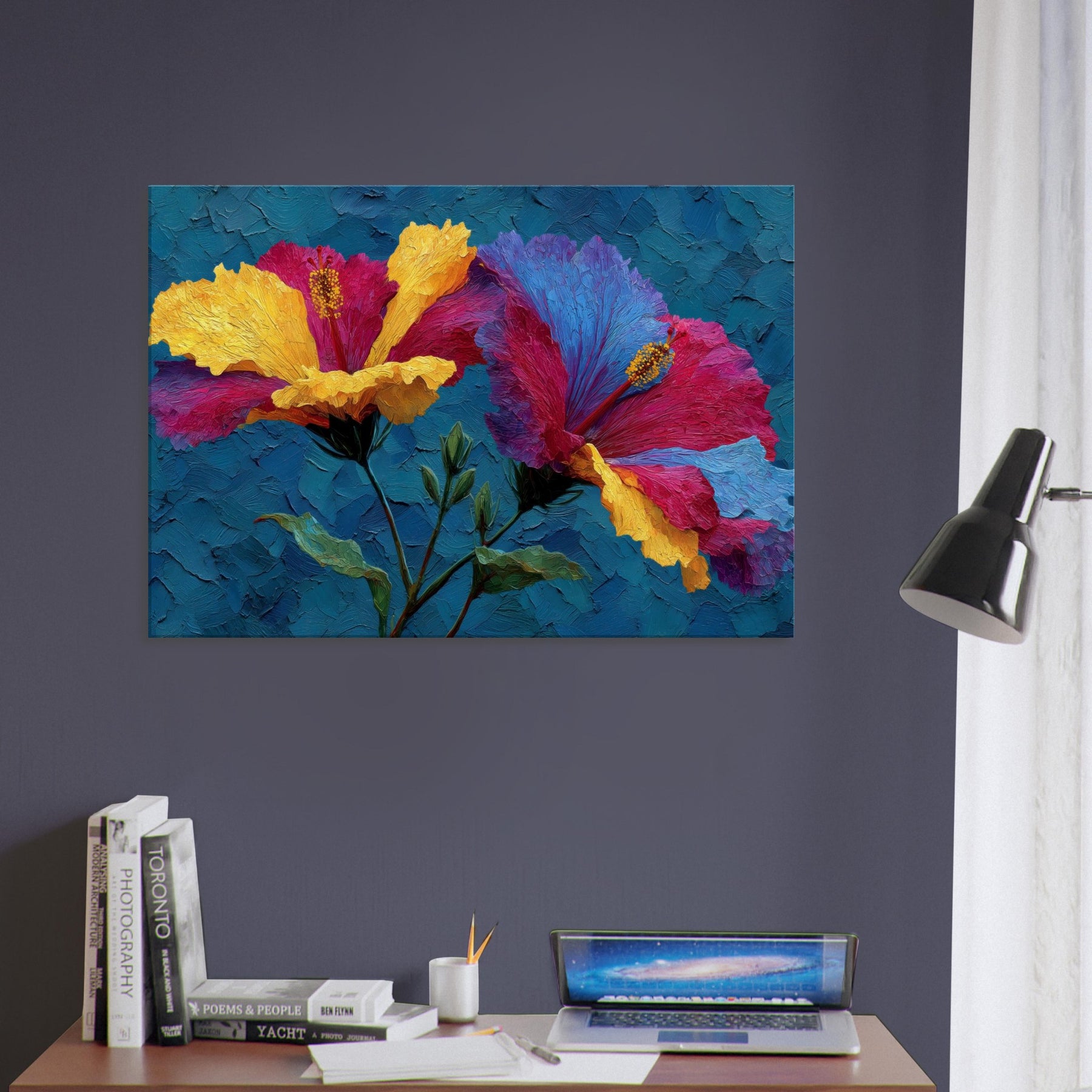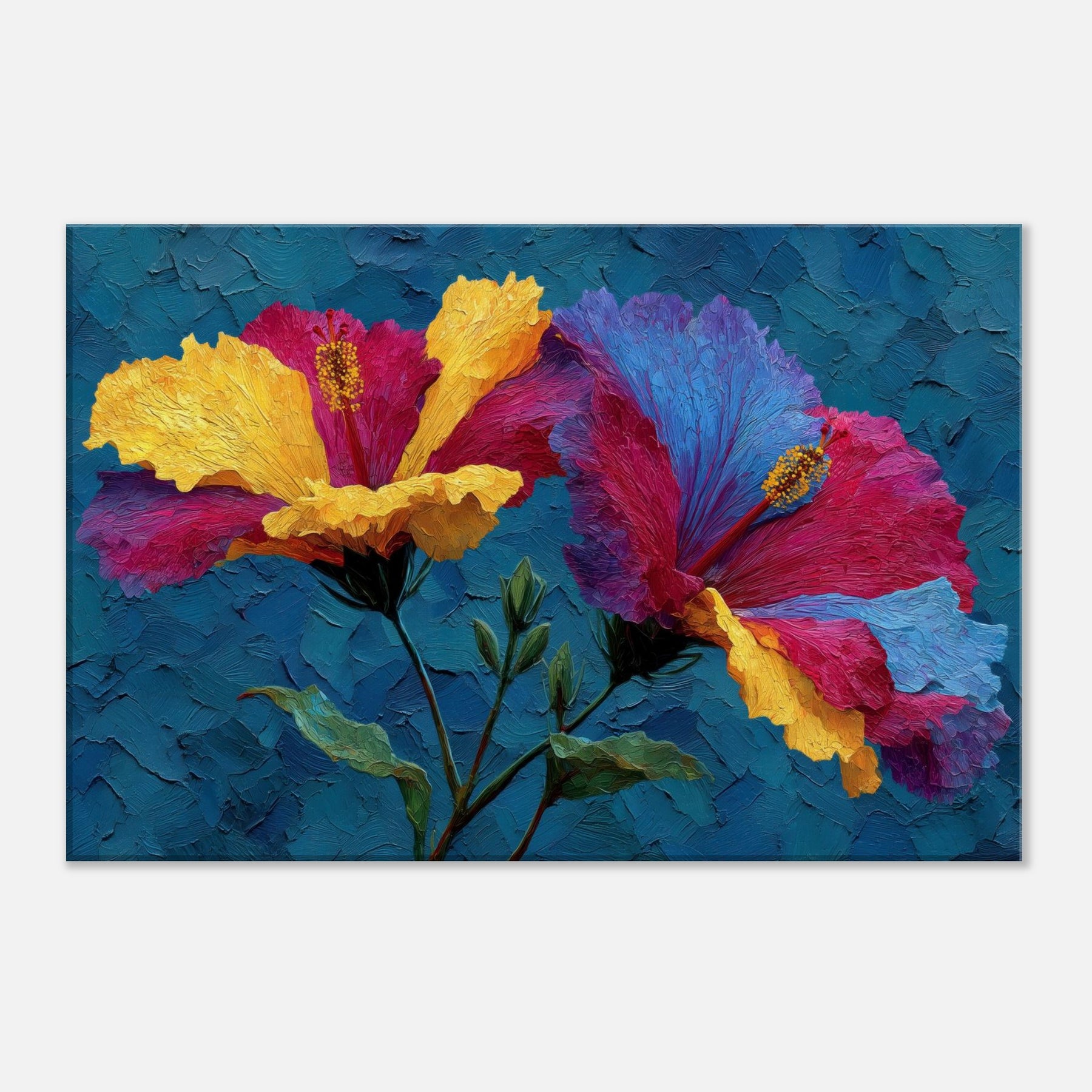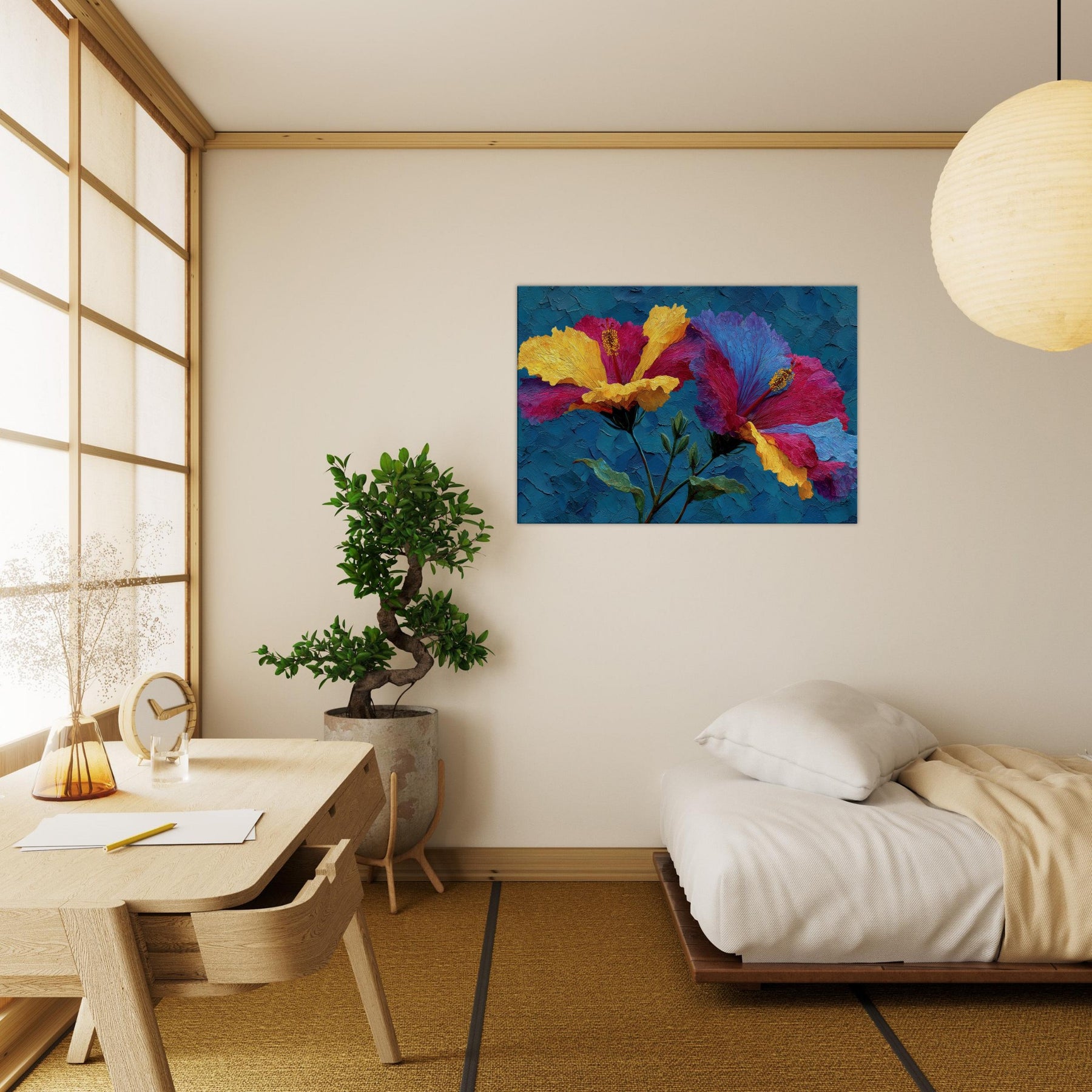 Against a moody blue backdrop, this vibrant hibiscus arrangement blooms in electric yellows, magenta, and cobalt, its petals sculpted with thick impasto that catches light and shadow. The result is a visceral, tropical atmosphere that invites slow, contemplative moments perfect for a living room or entryway. Let the Primary Subject Hibiscus anchor the space as color energy pulses through the room, turning everyday walls into a sunlit garden you can practically walk into.