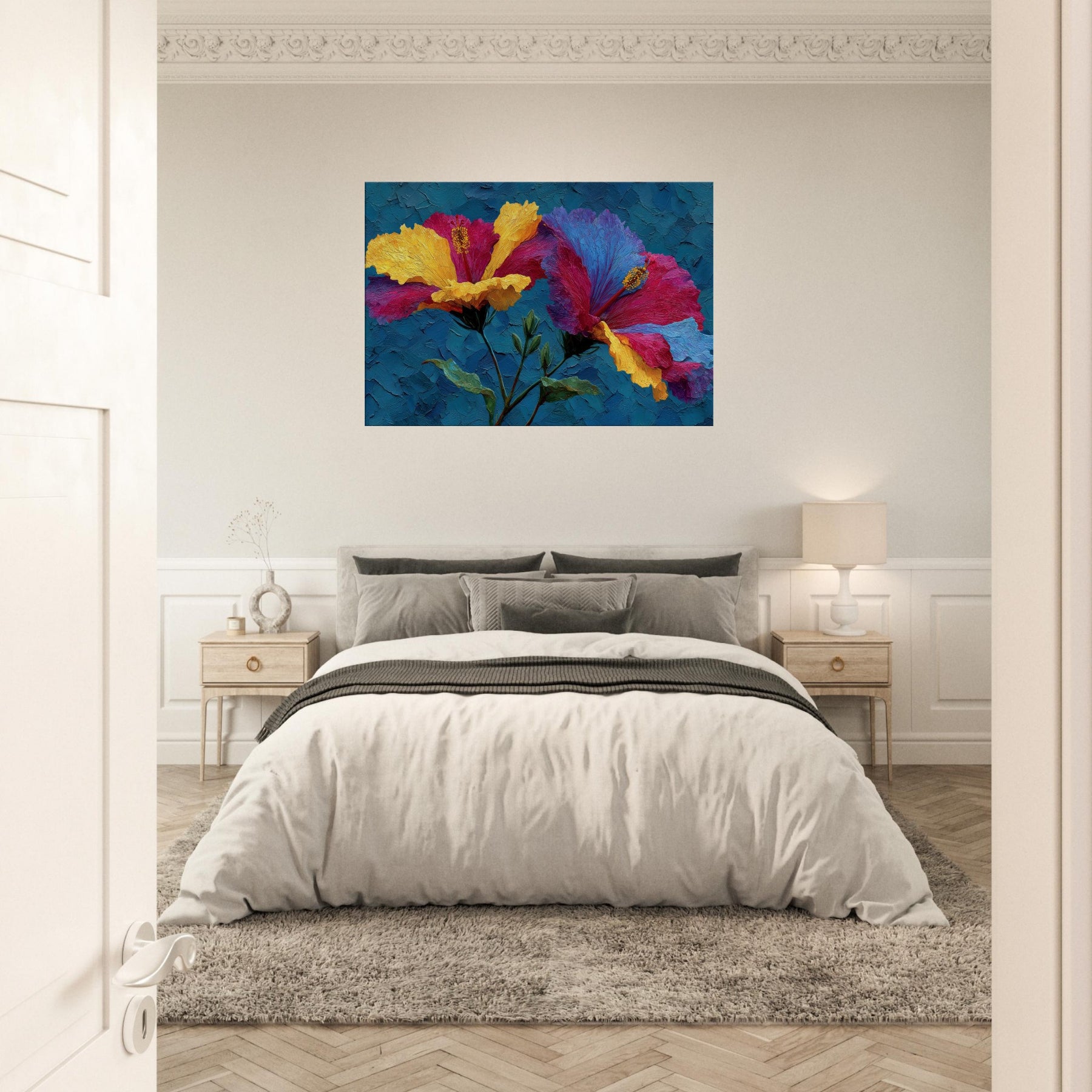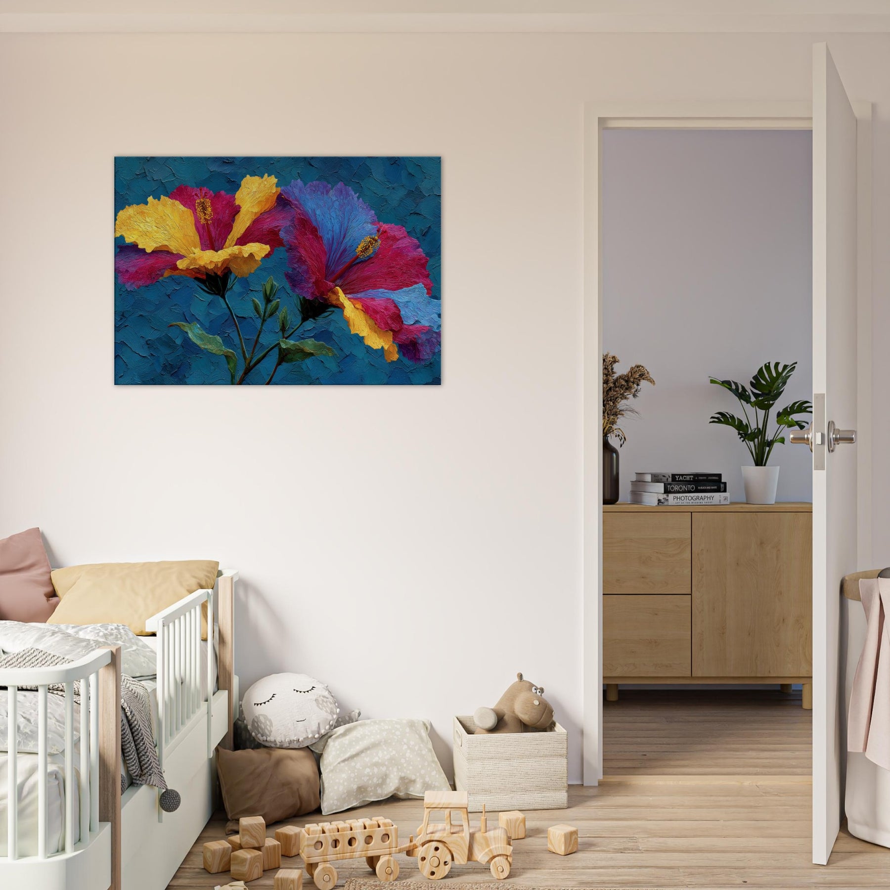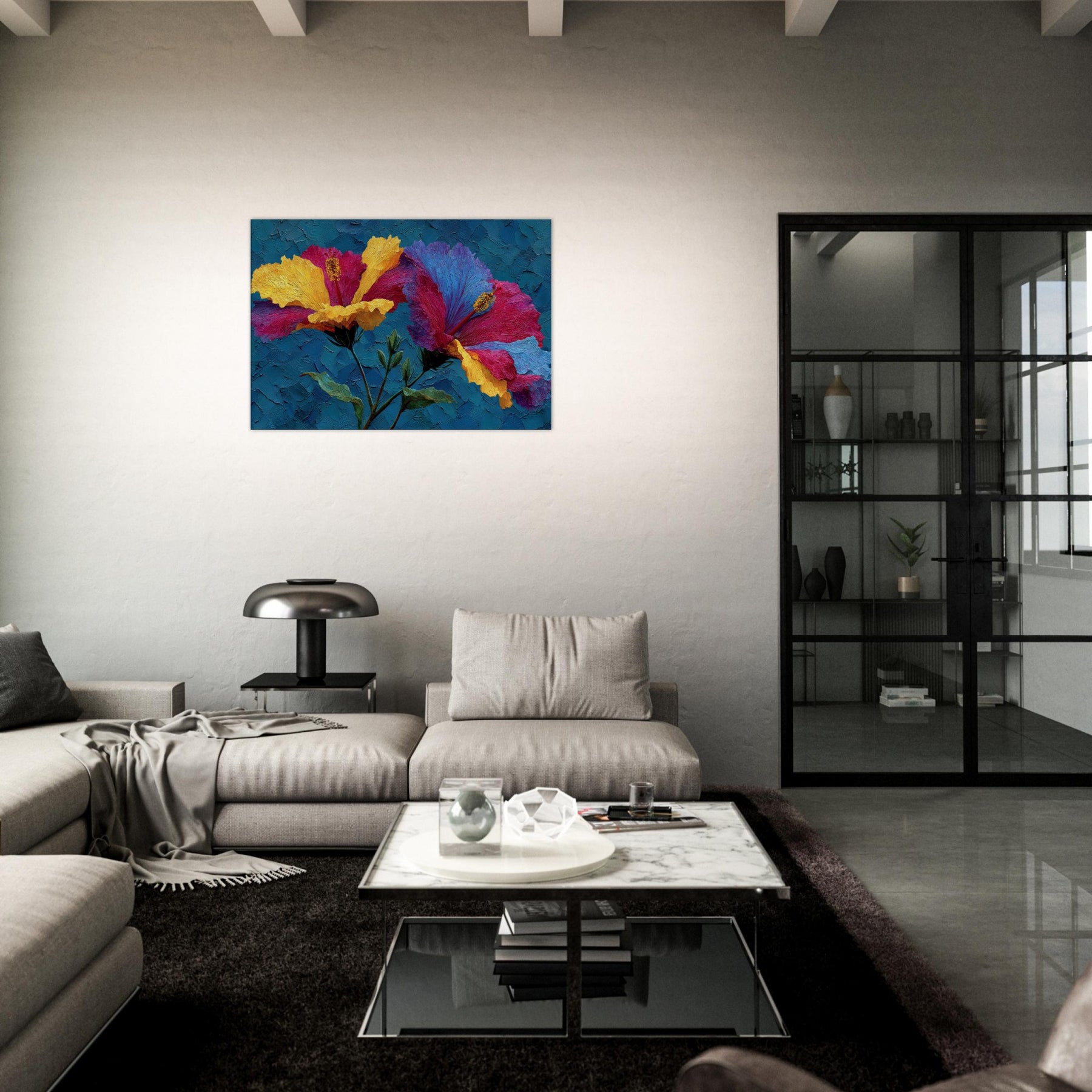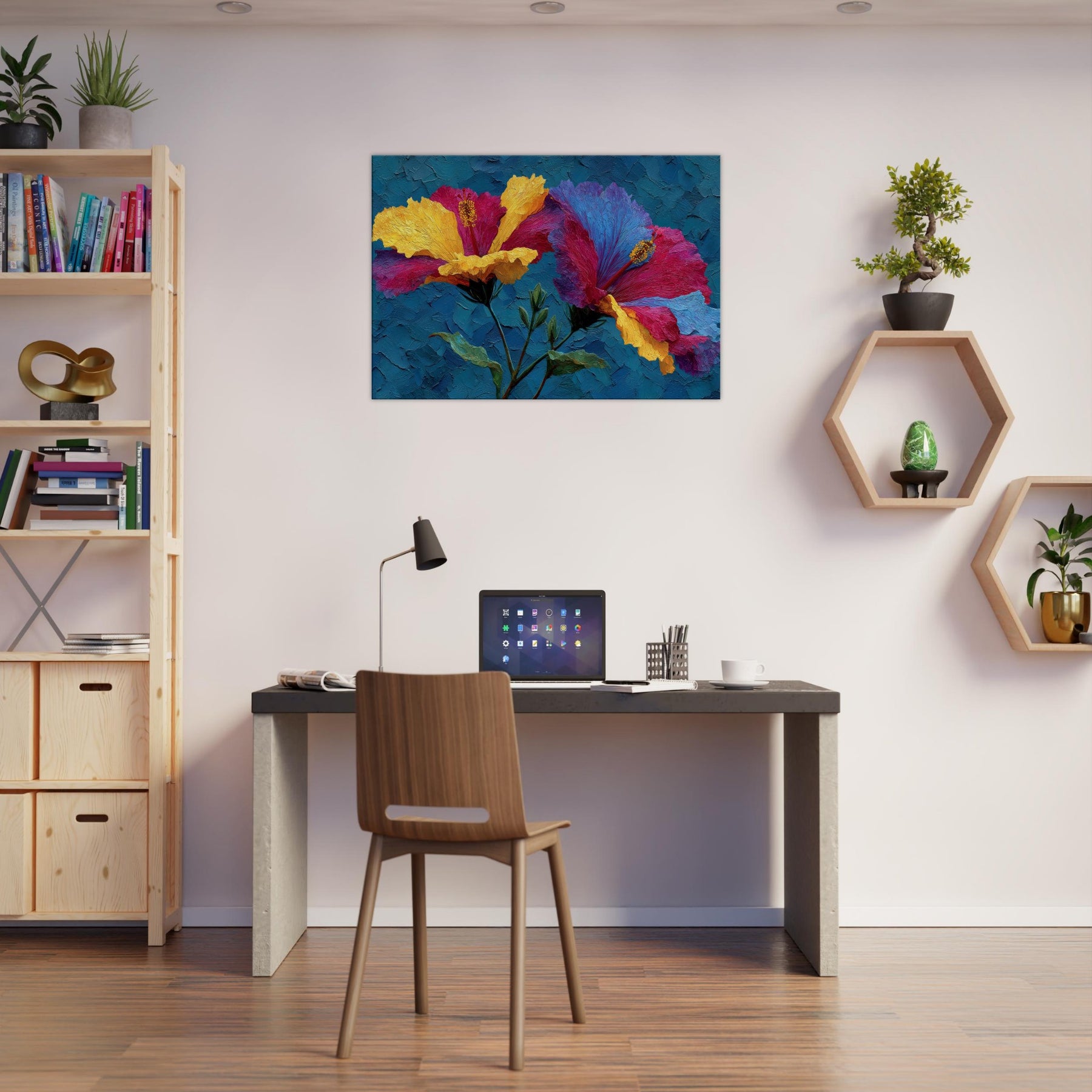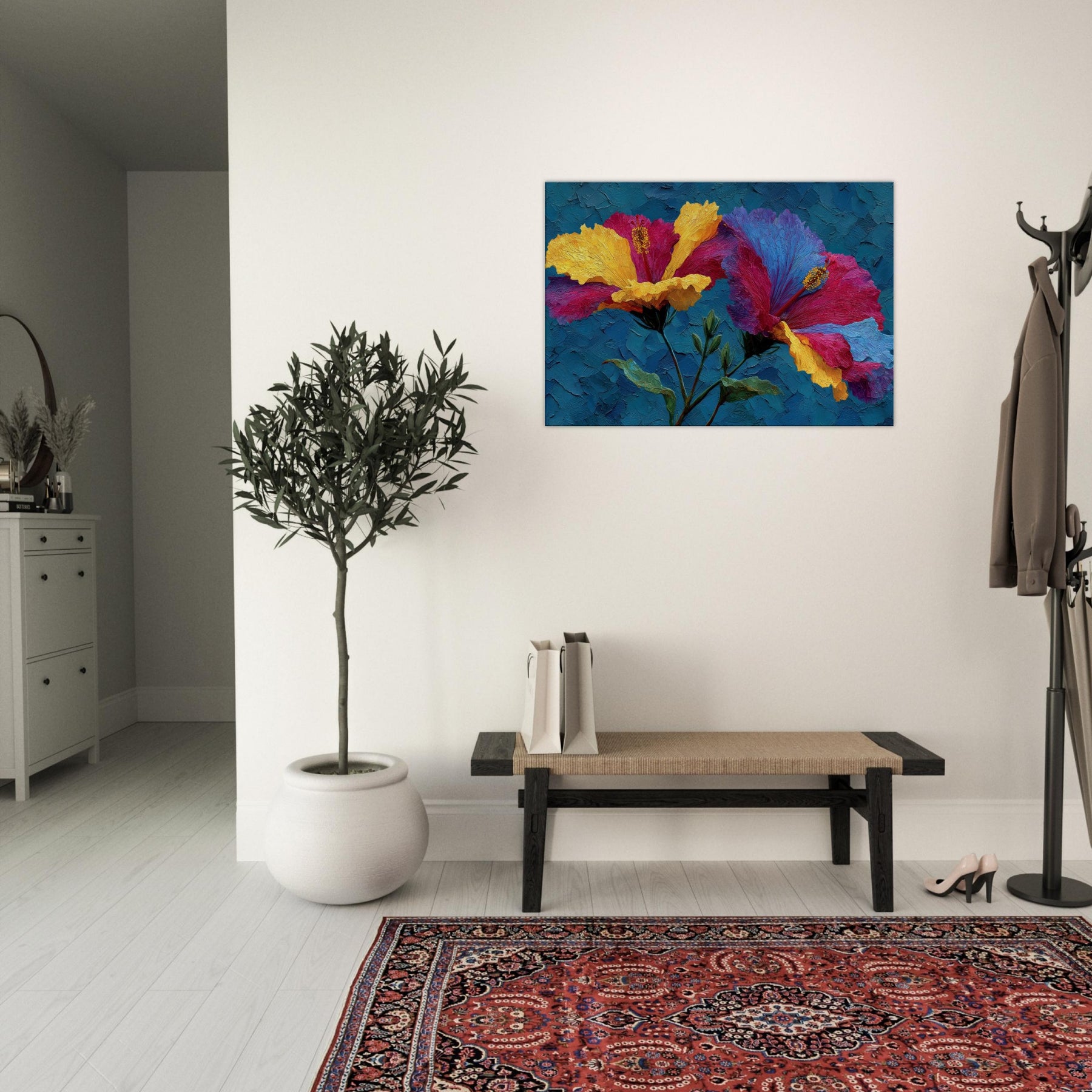 Against a moody blue backdrop, this vibrant hibiscus arrangement blooms in electric yellows, magenta, and cobalt, its petals sculpted with thick impasto that catches light and shadow. The result is a visceral, tropical atmosphere that invites slow, contemplative moments perfect for a living room or entryway. Let the Primary Subject Hibiscus anchor the space as color energy pulses through the room, turning everyday walls into a sunlit garden you can practically walk into.