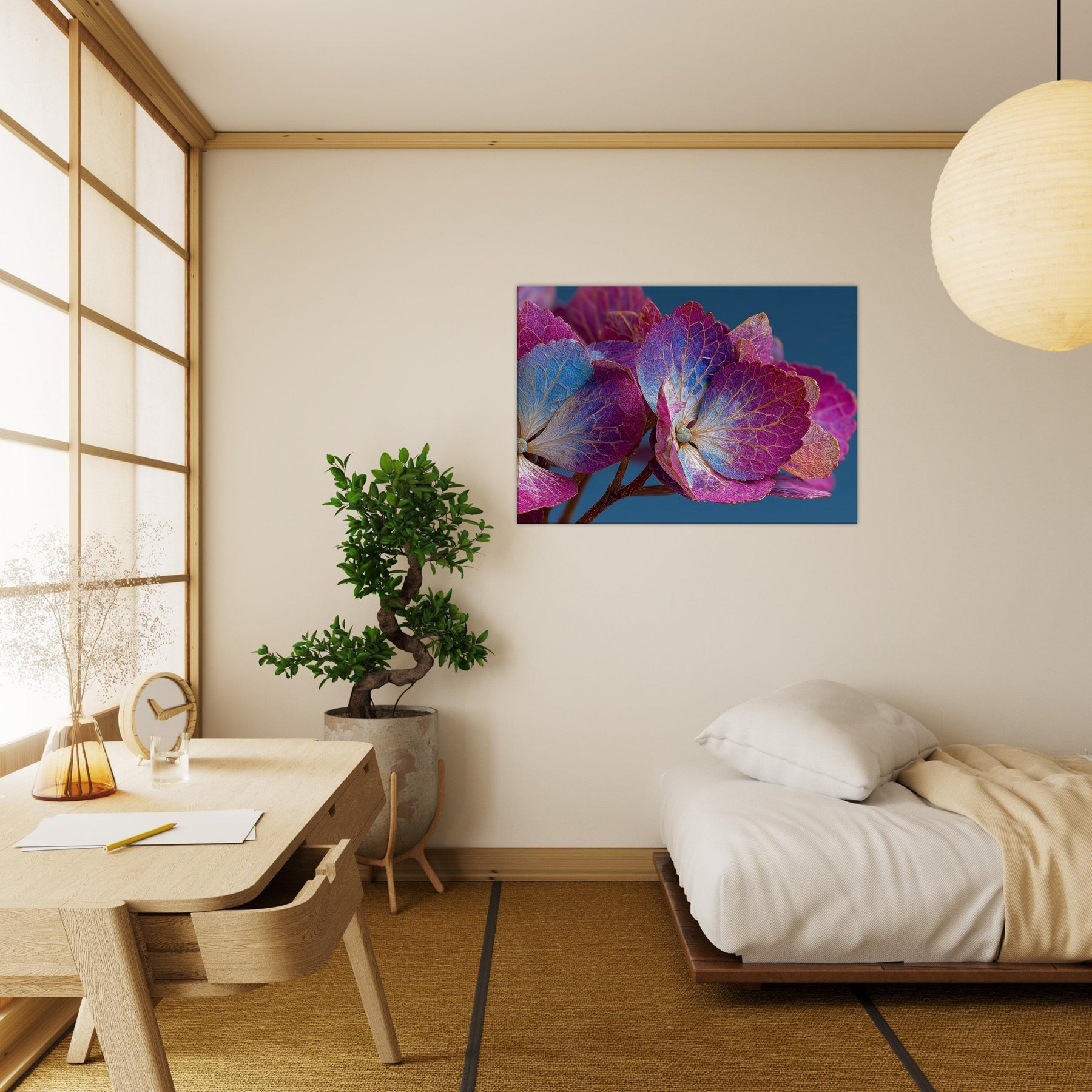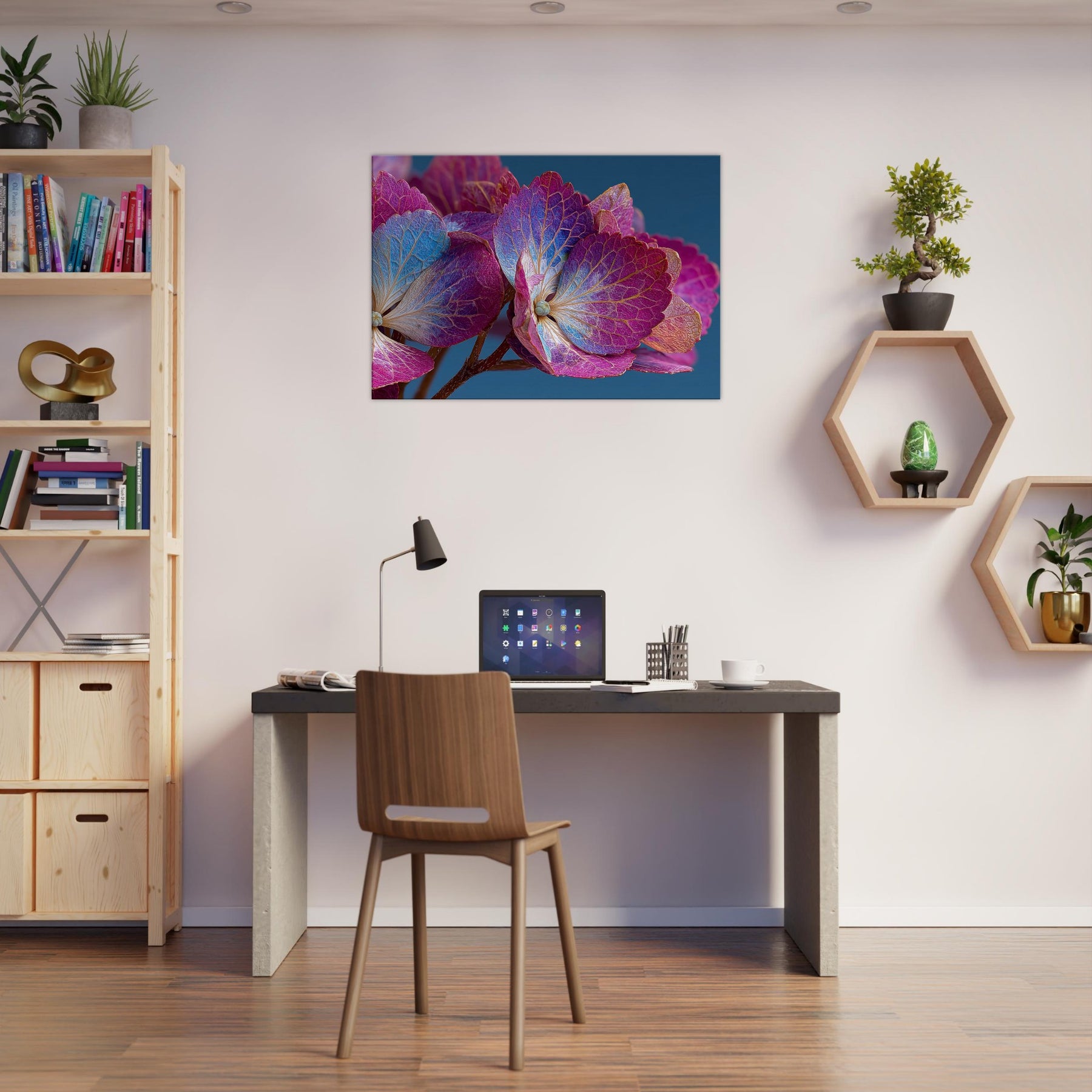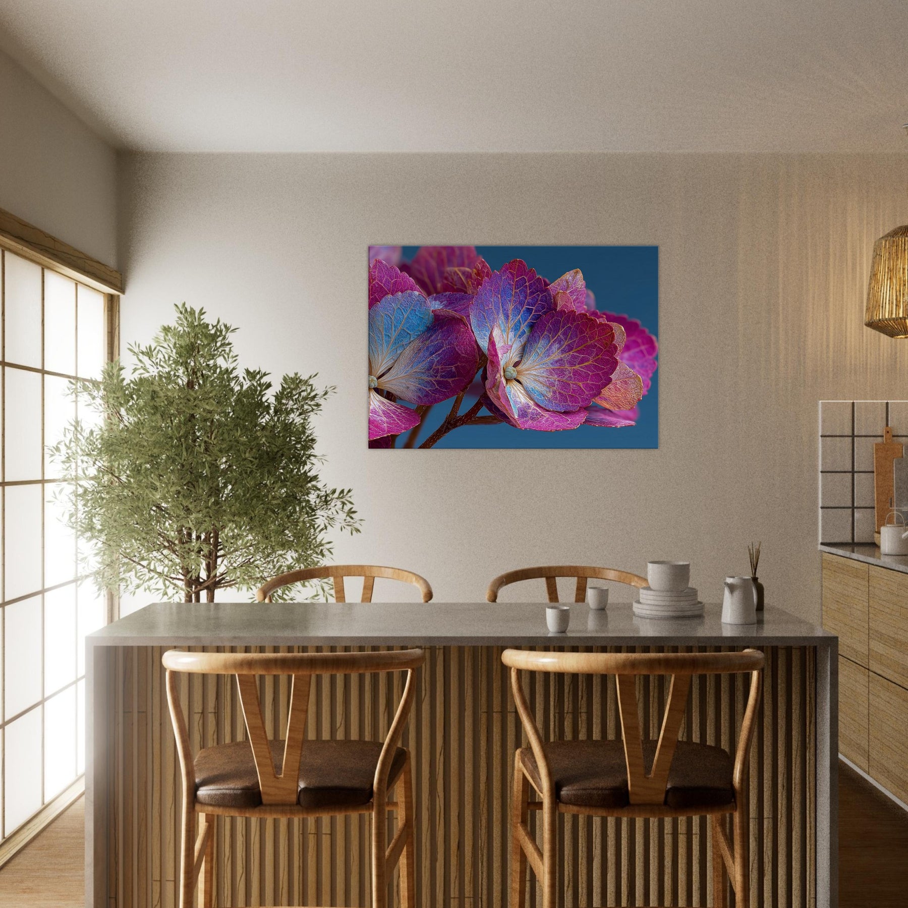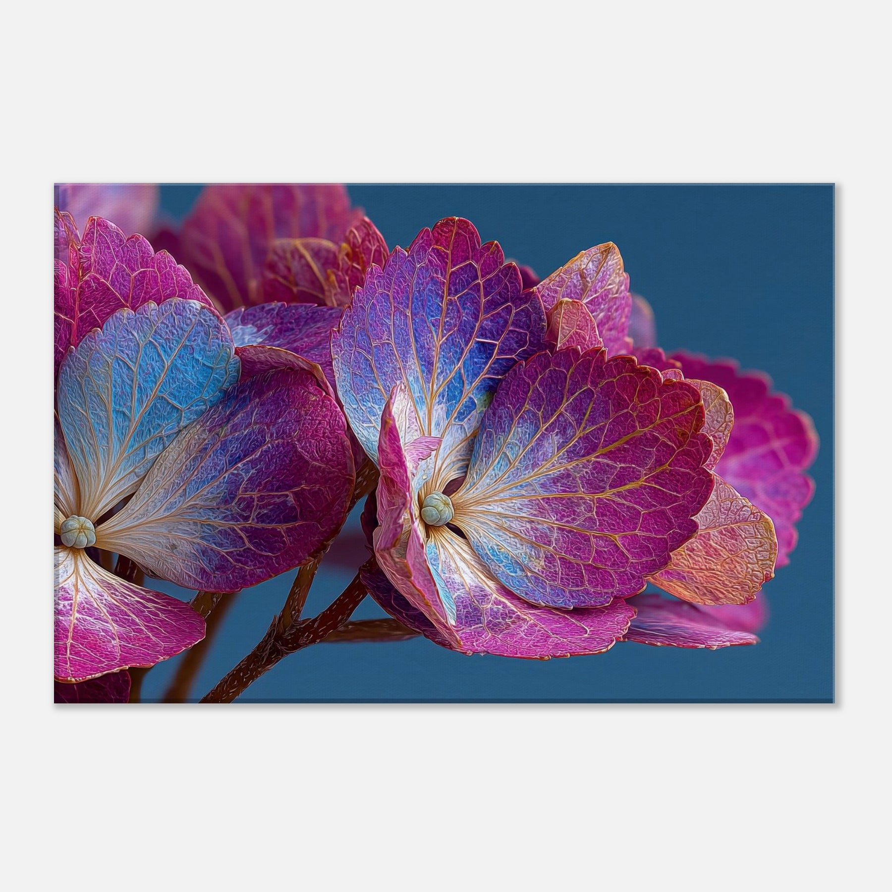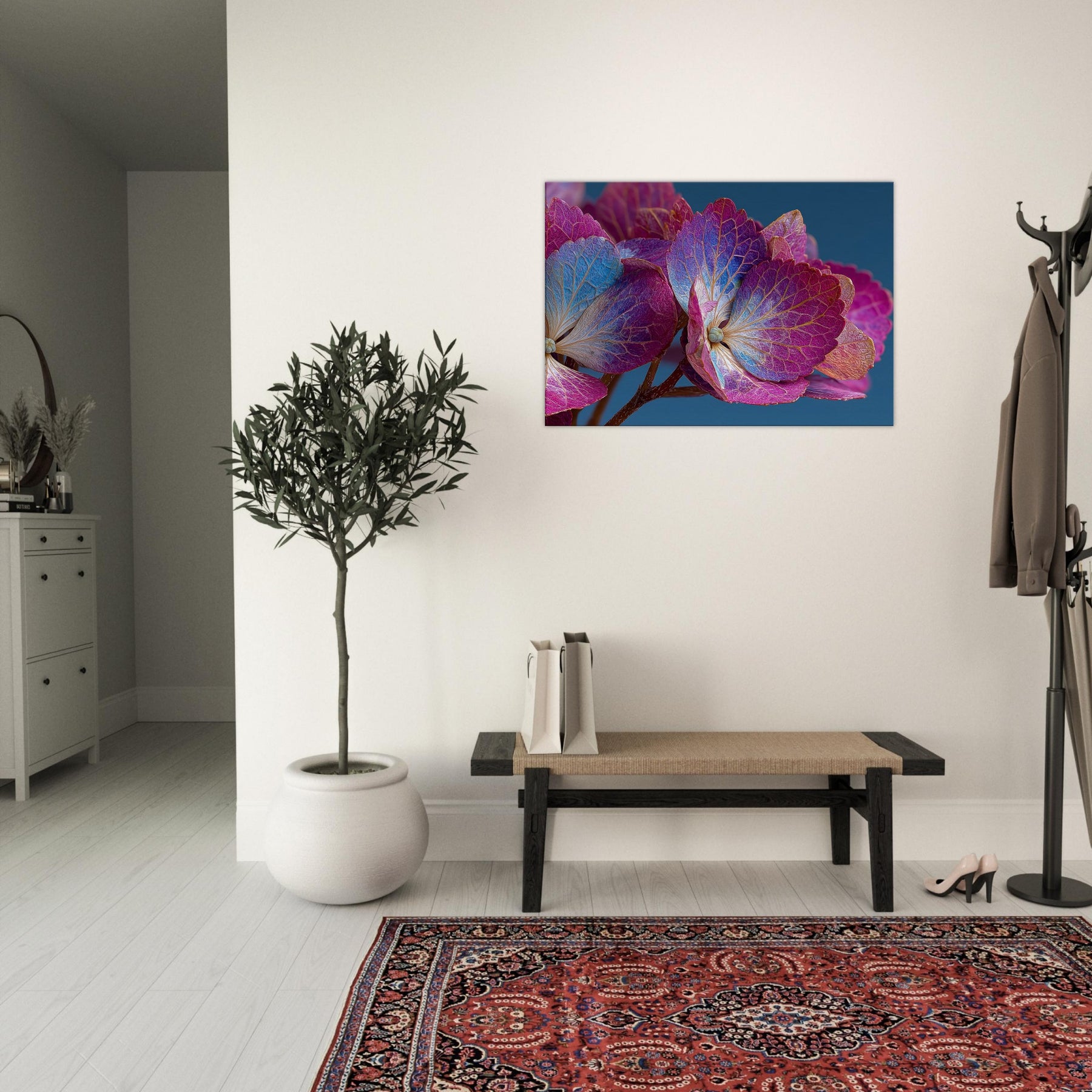A riot of color in bloom, this Hydrangea study unfolds as an abstract celebration of nature and light. The petals drift in watercolor gradients blue, lavender, pink and cream their veining revealed in luminous, almost glassy detail. Set against a quiet, cool backdrop, the composition invites meditation and a sense of spaciousness, as if you could step closer and hear the rustle of petals. Ideal for a living room or foyer, it adds warmth, texture, and a refined, contemporary voice to any space.