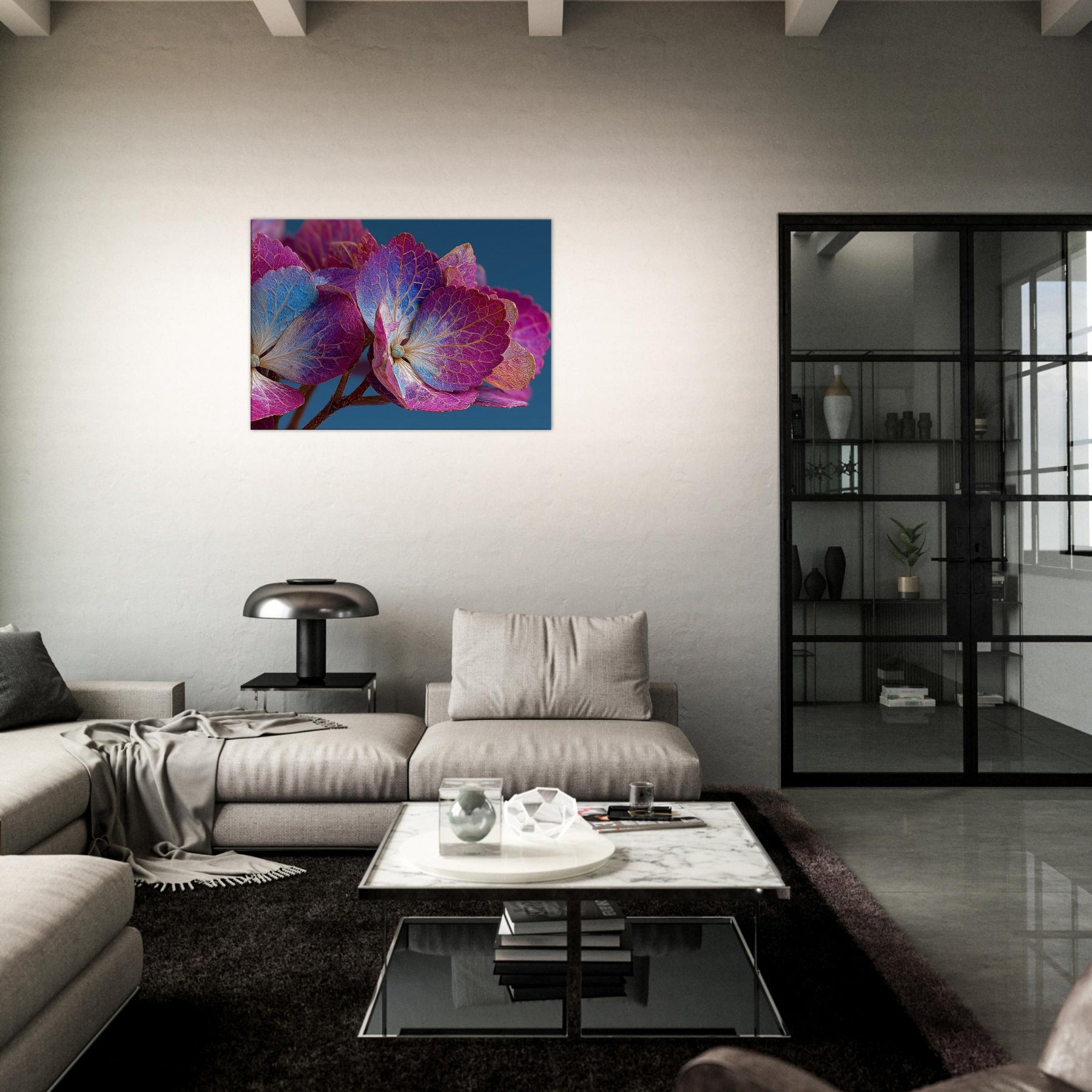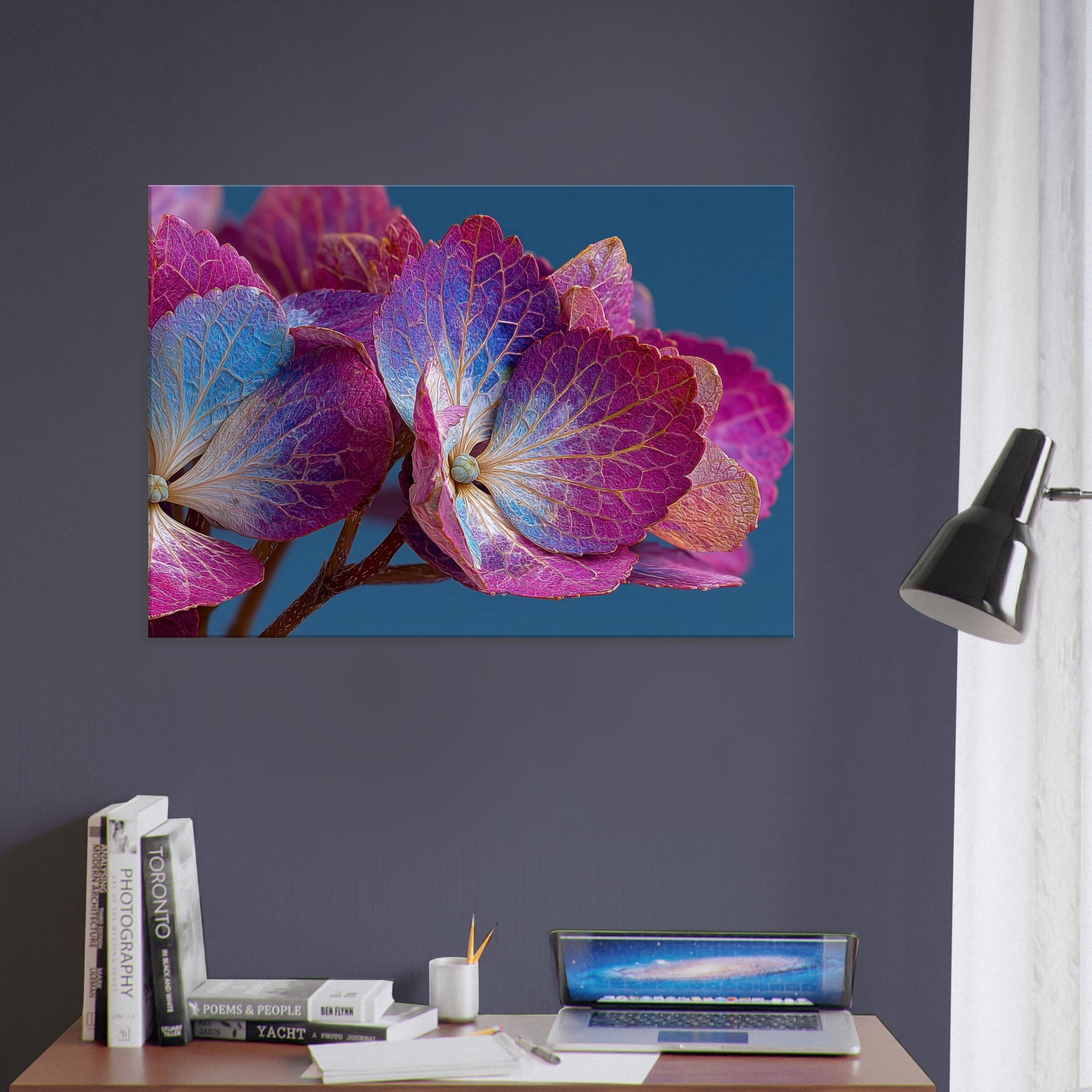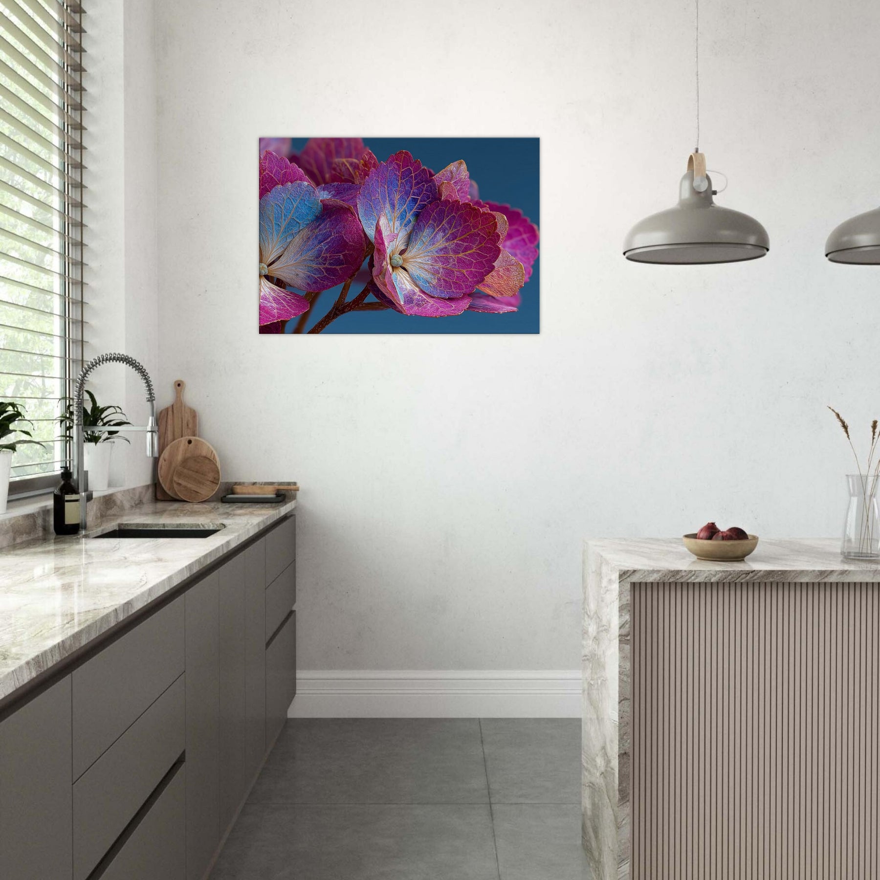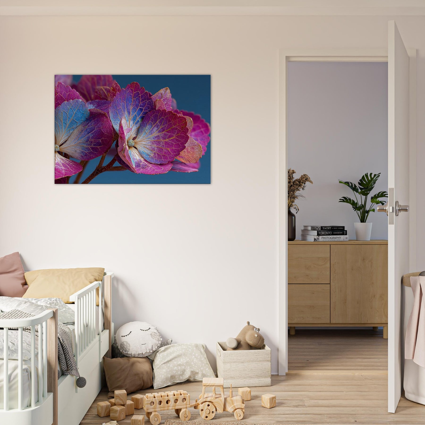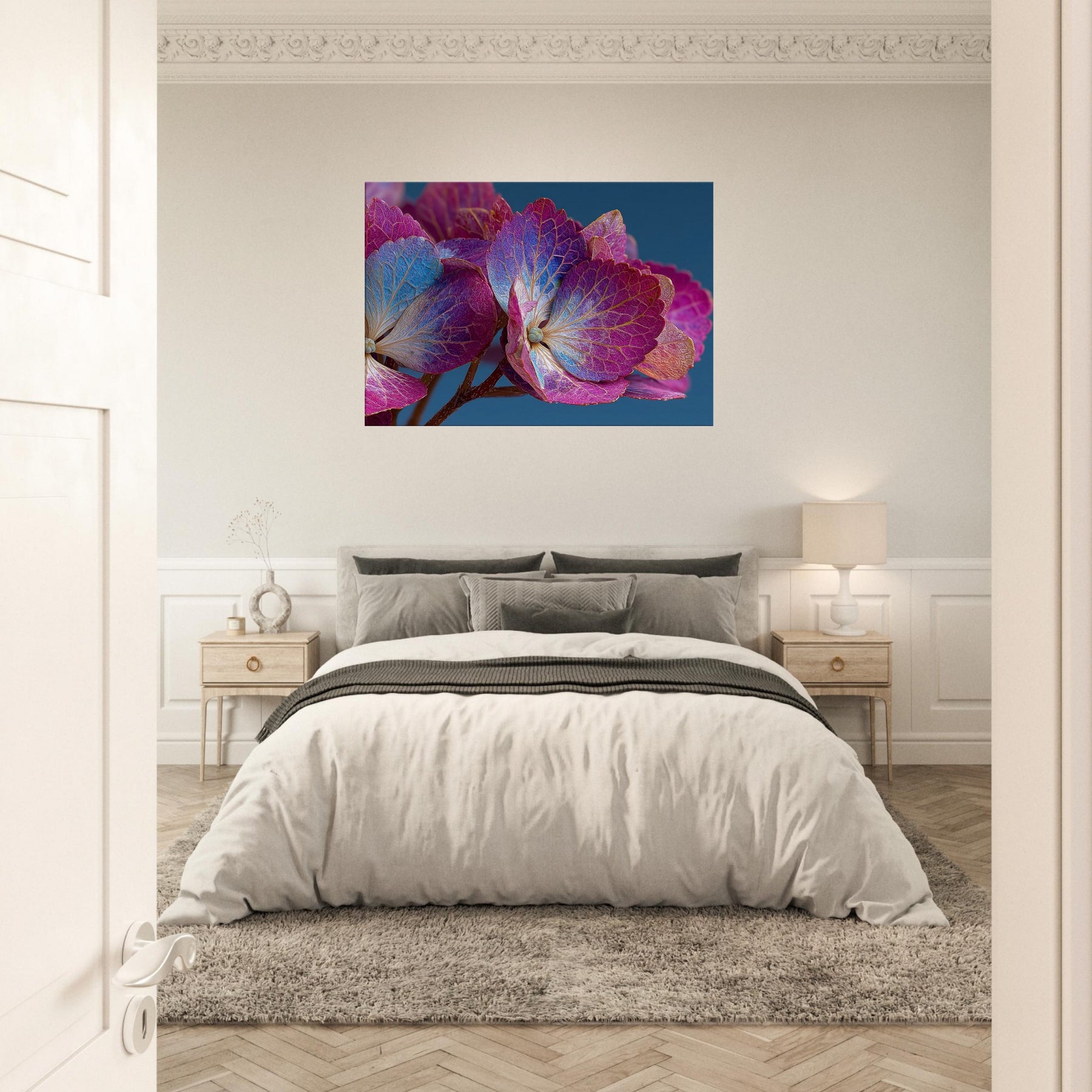 A riot of color in bloom, this Hydrangea study unfolds as an abstract celebration of nature and light. The petals drift in watercolor gradients blue, lavender, pink and cream their veining revealed in luminous, almost glassy detail. Set against a quiet, cool backdrop, the composition invites meditation and a sense of spaciousness, as if you could step closer and hear the rustle of petals. Ideal for a living room or foyer, it adds warmth, texture, and a refined, contemporary voice to any space.