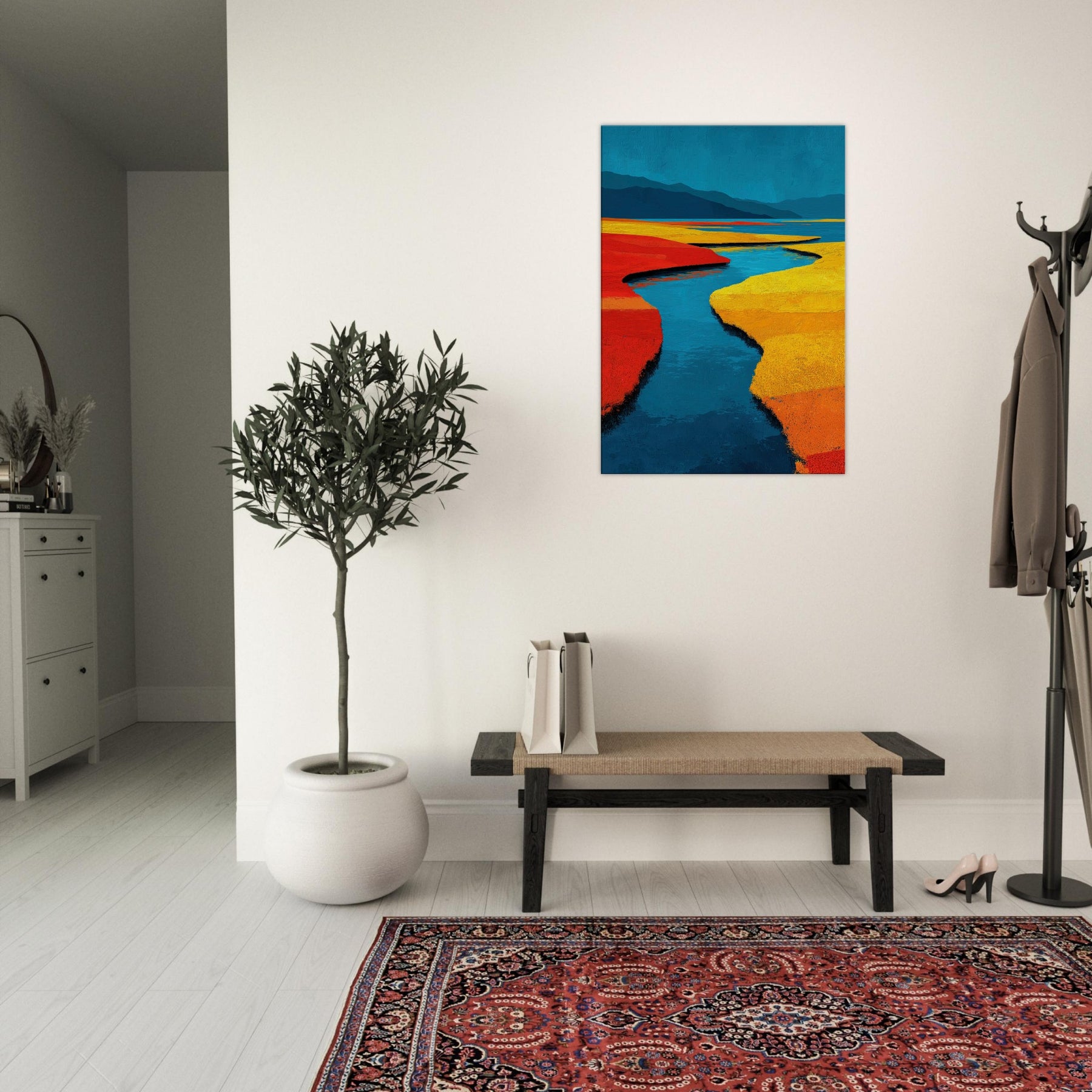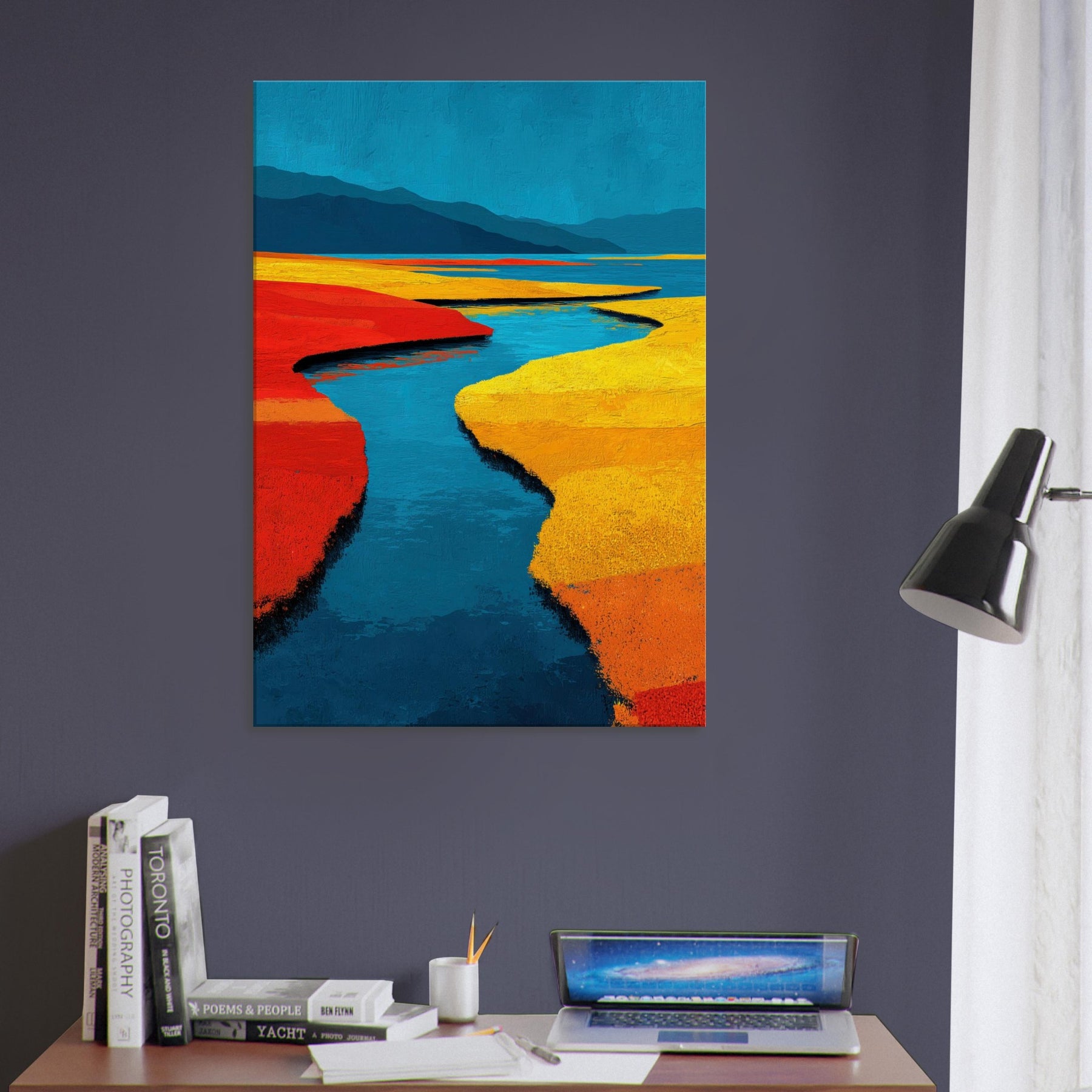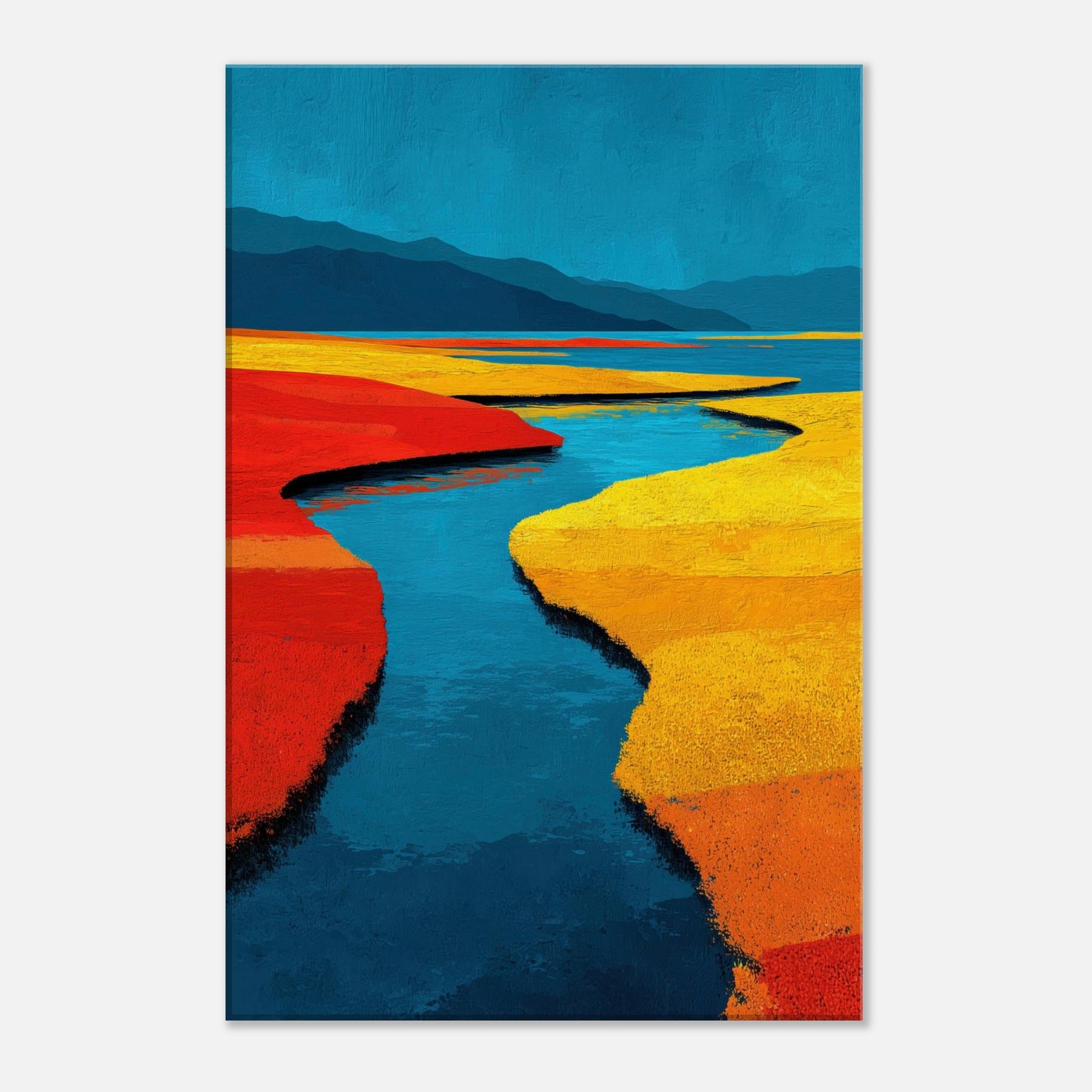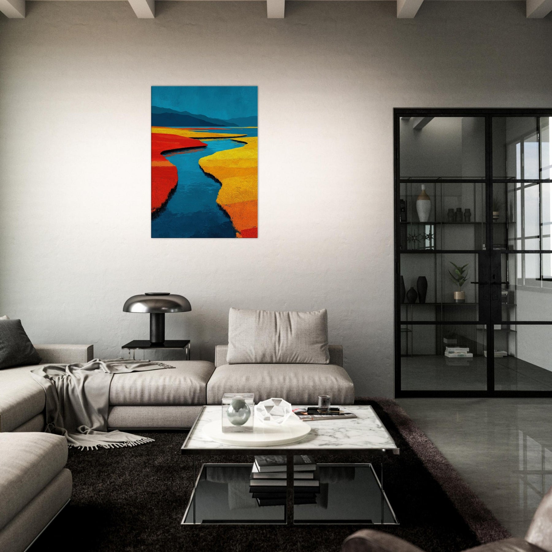 Lake of light drifts across a bold, abstract , inviting the eye to follow a winding blue thread through fields of sunlit yellow and warming red. The atmosphere feels serene yet electric, a quiet horizon that expands a room with depth and mood. This piece anchors a living space with a focal calm, turning walls into an open shoreline where morning air seems to glow. Perfect for dining rooms or lounges, it adds texture, movement, and a lyrical sense of nature's vastness.