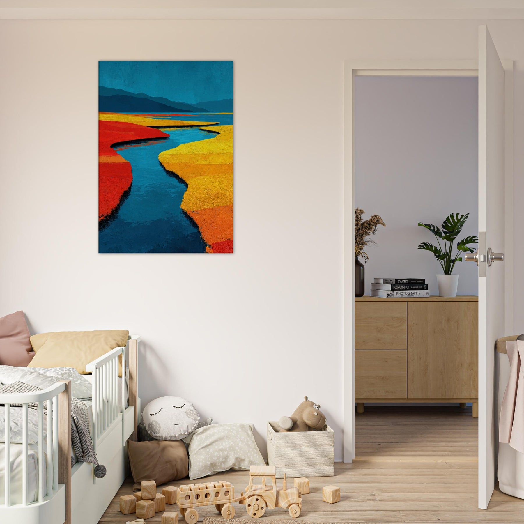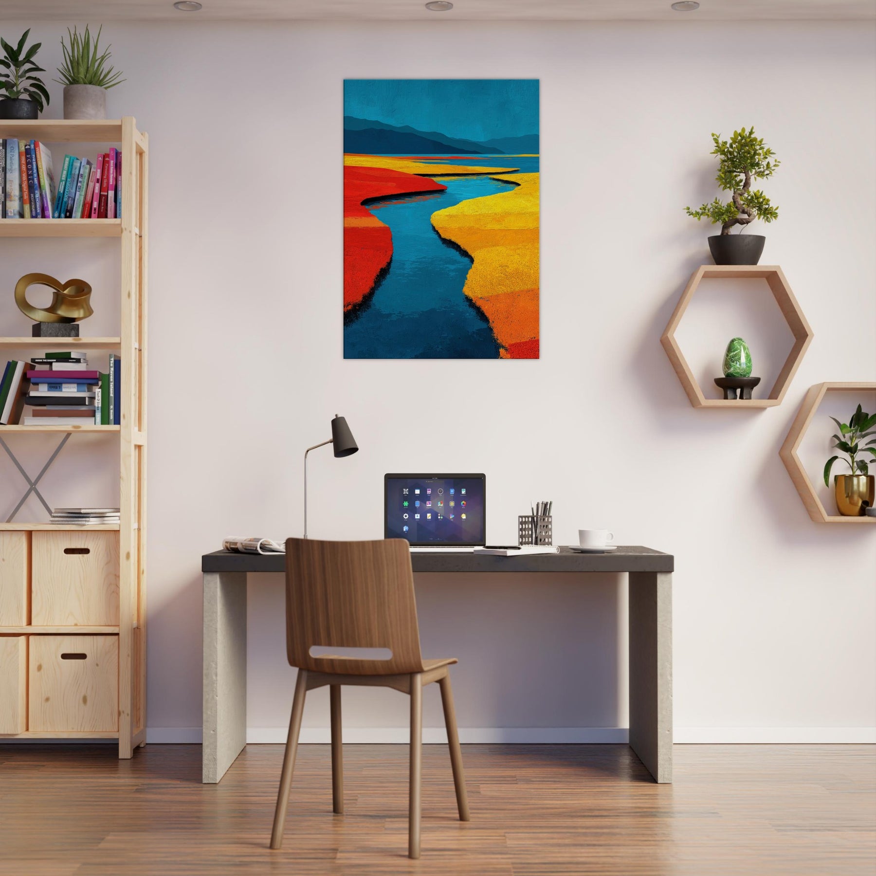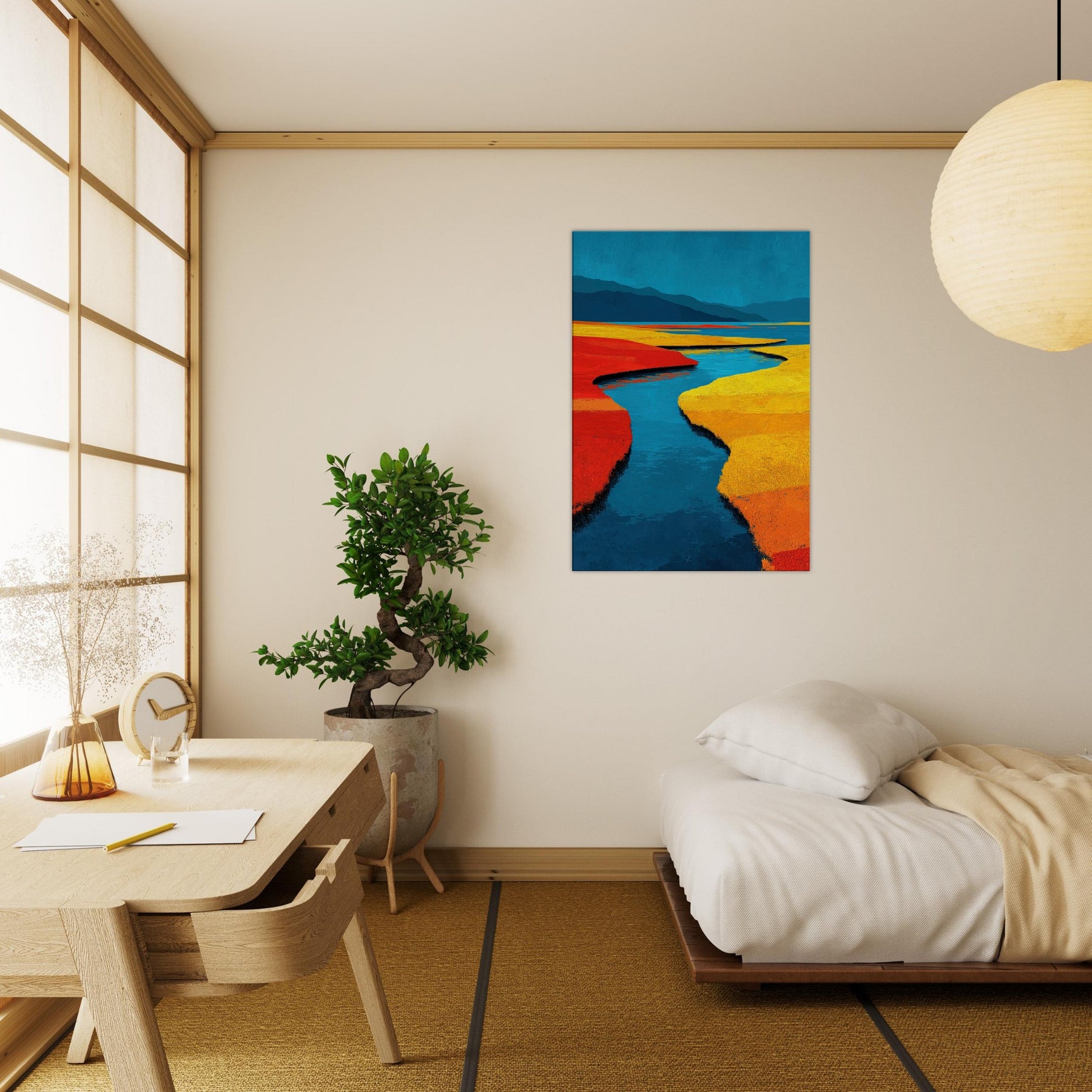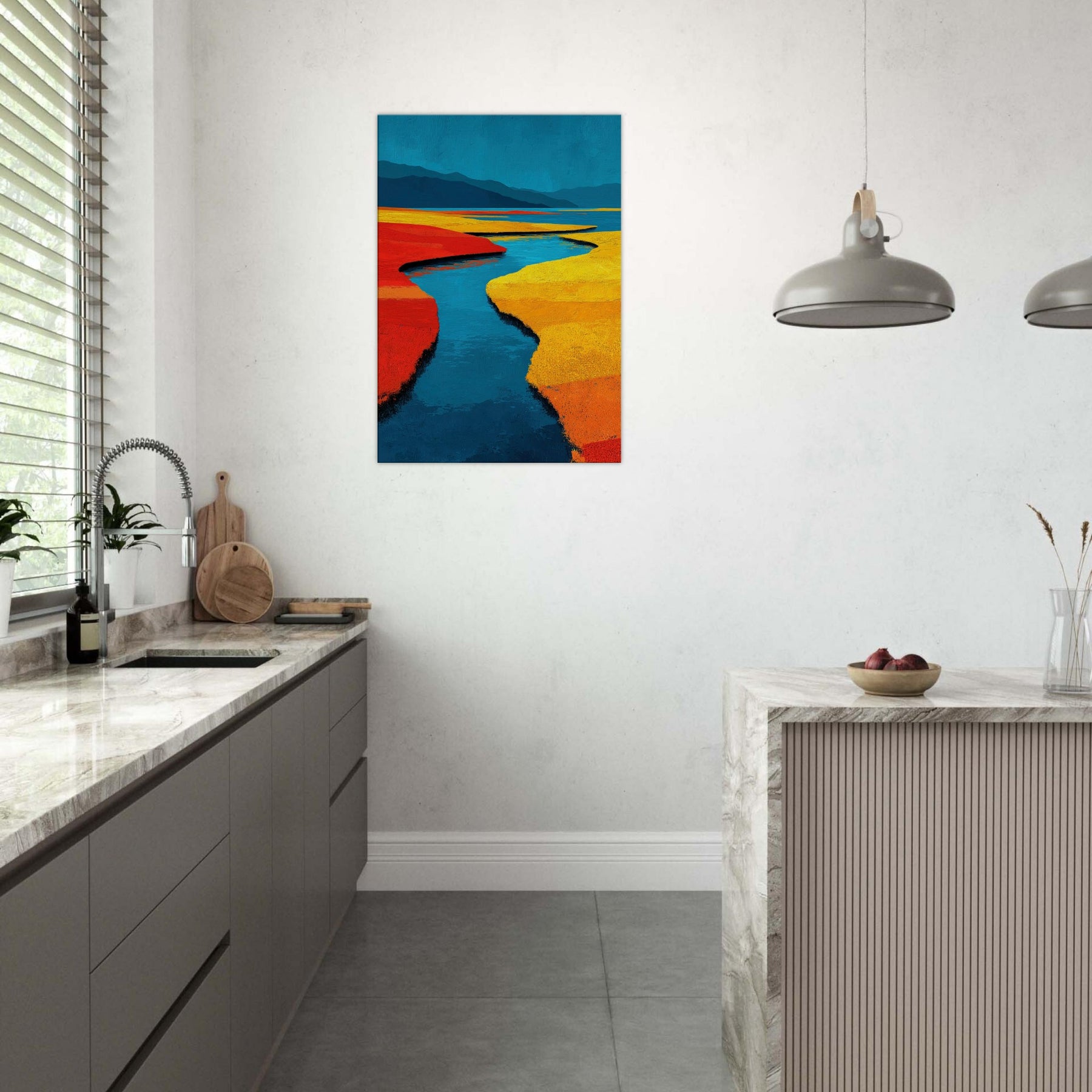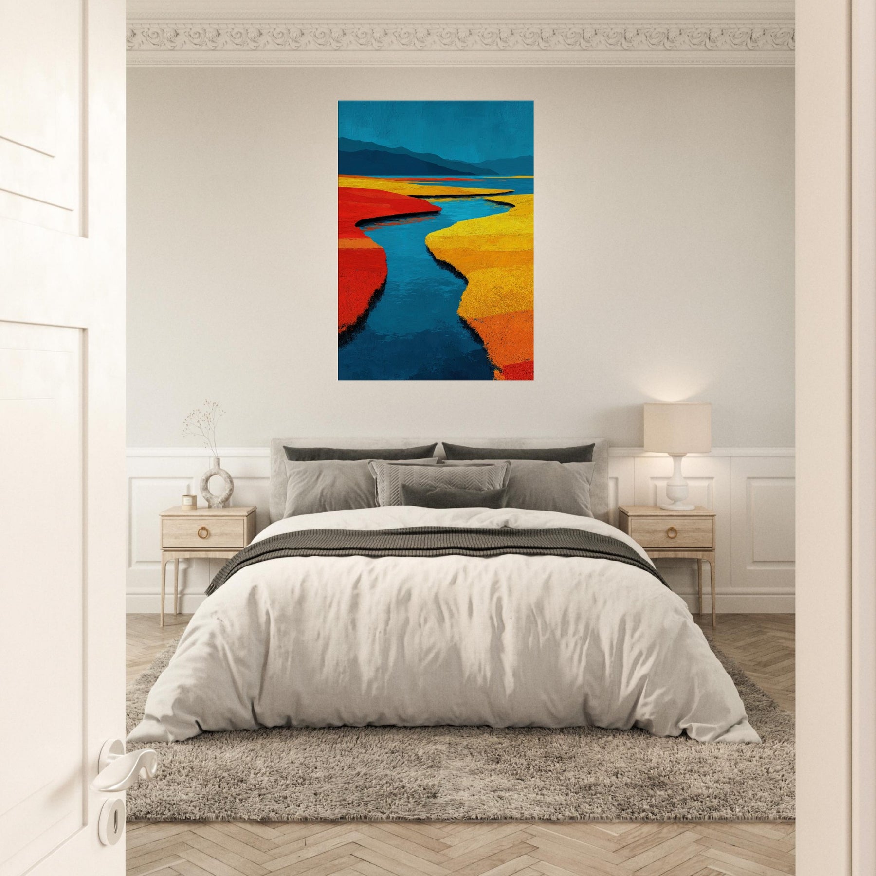 Lake of light drifts across a bold, abstract , inviting the eye to follow a winding blue thread through fields of sunlit yellow and warming red. The atmosphere feels serene yet electric, a quiet horizon that expands a room with depth and mood. This piece anchors a living space with a focal calm, turning walls into an open shoreline where morning air seems to glow. Perfect for dining rooms or lounges, it adds texture, movement, and a lyrical sense of nature's vastness.