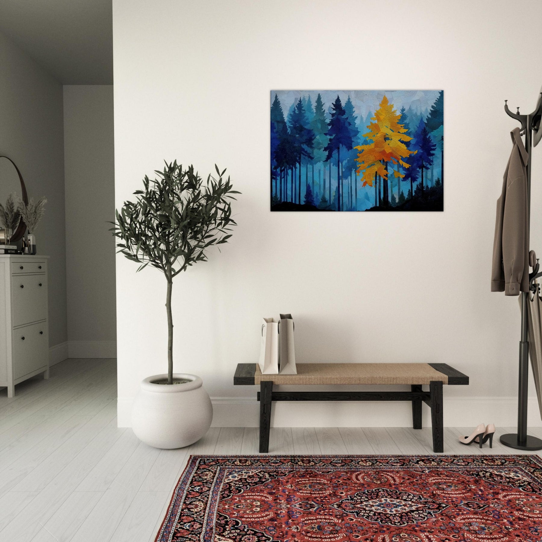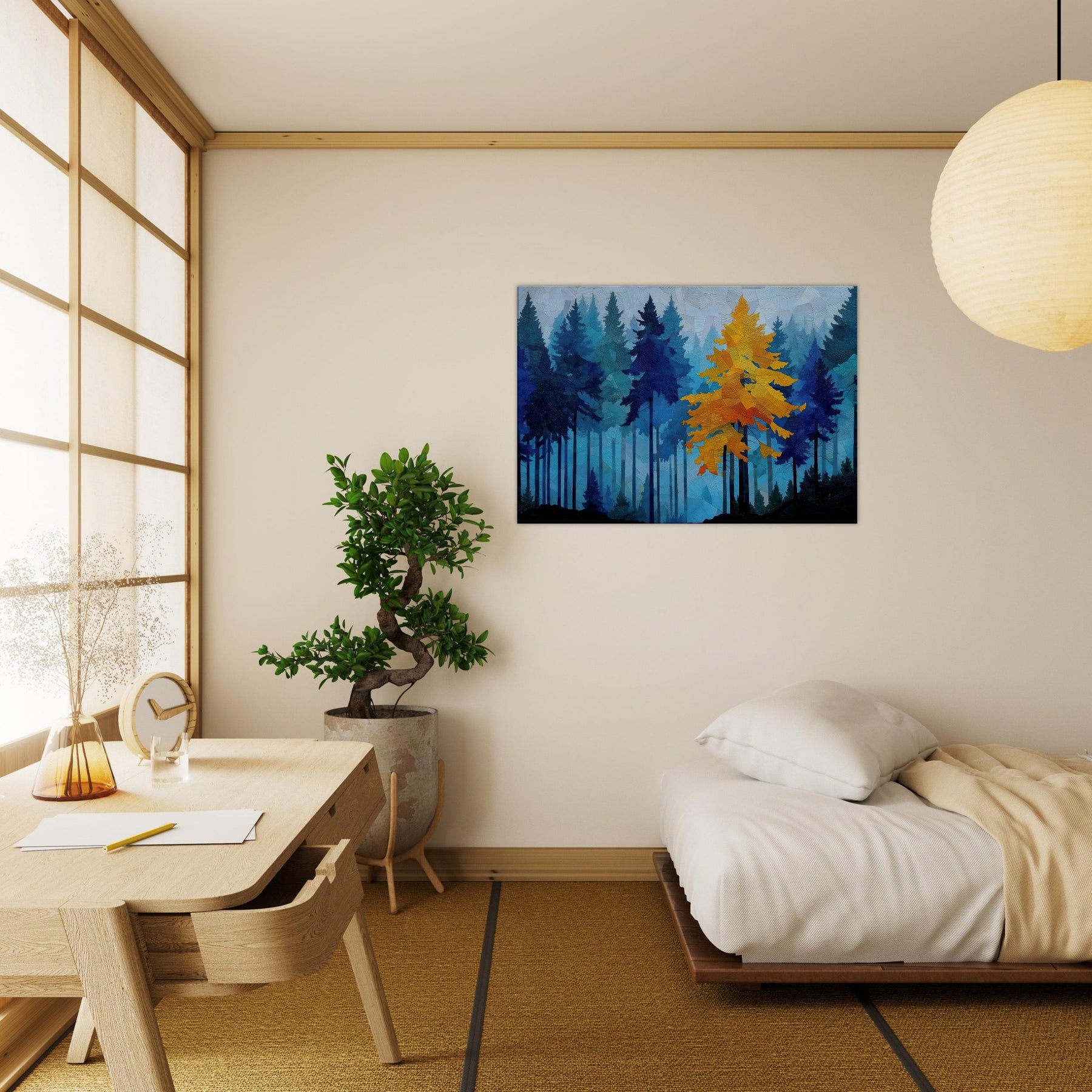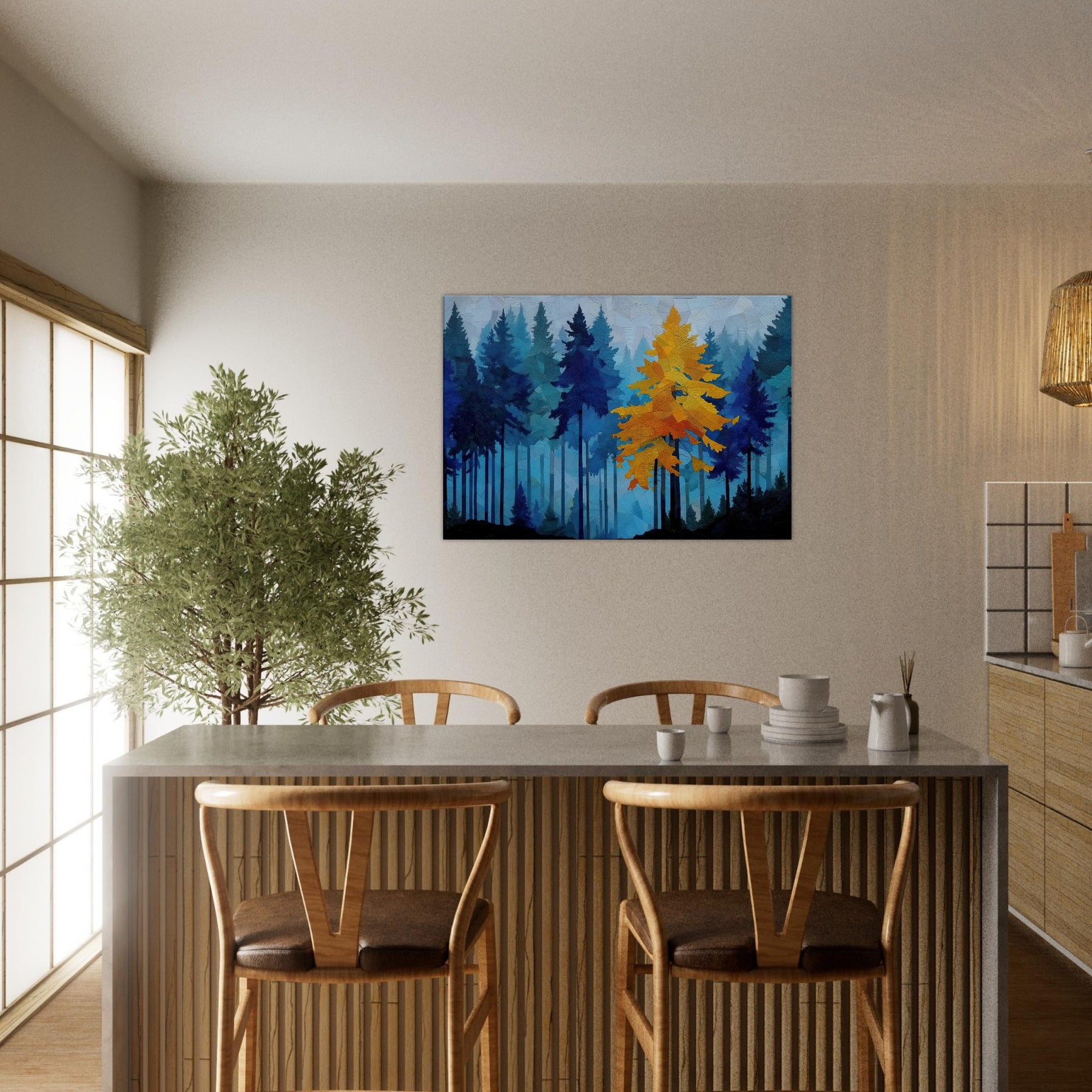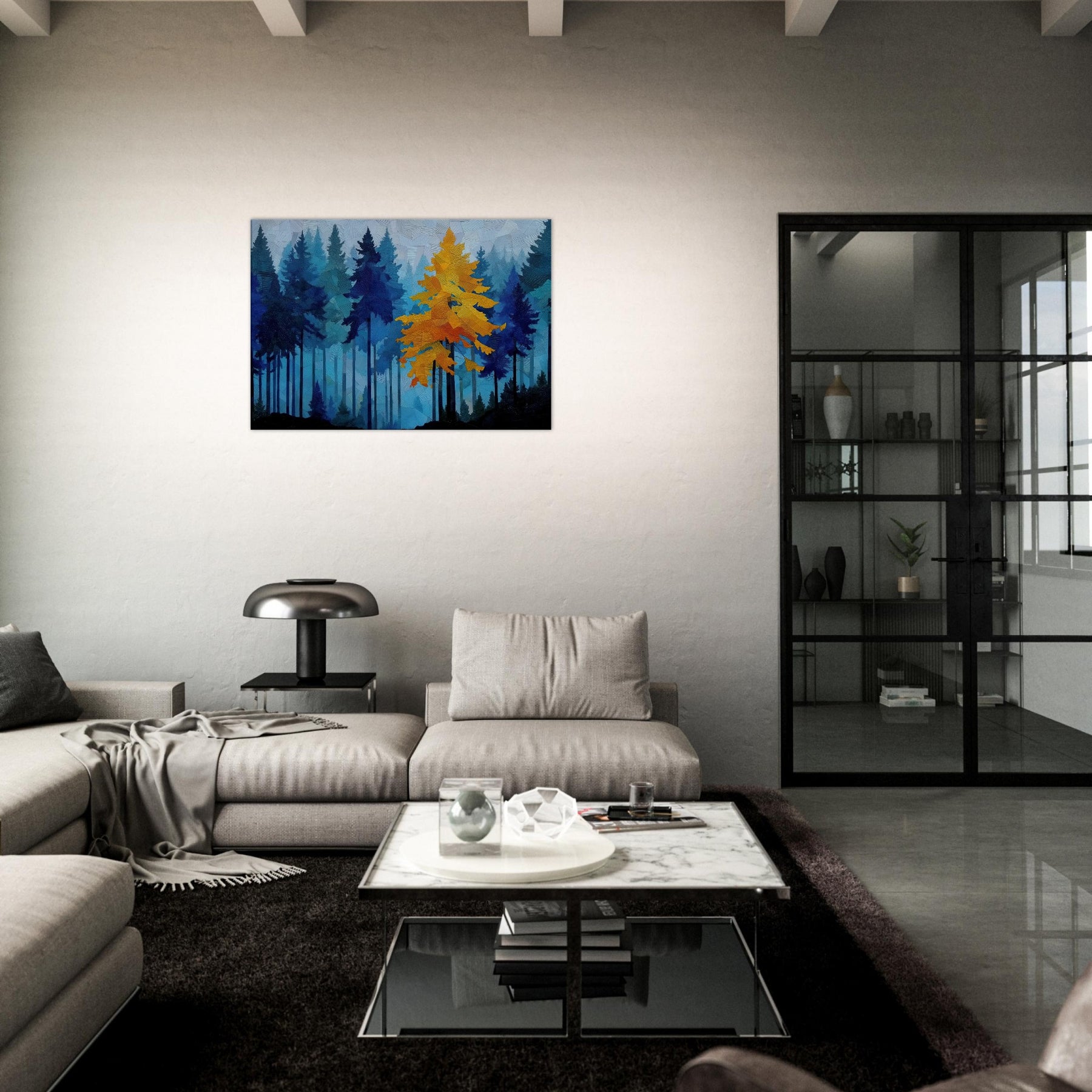 In this Foggy Forest study, the abstract composition invites a slow breath and attentive gaze. Layers of blue and teal recede into misty silhouettes while one luminous golden tree anchors the scene, like a sunlit beacon through morning fog. The textured surface adds tactile depth, as if forest air and dew brush the room. It softens a living space, reflects light with quiet shimmer, and elevates a corner into a serene, contemplative refuge.