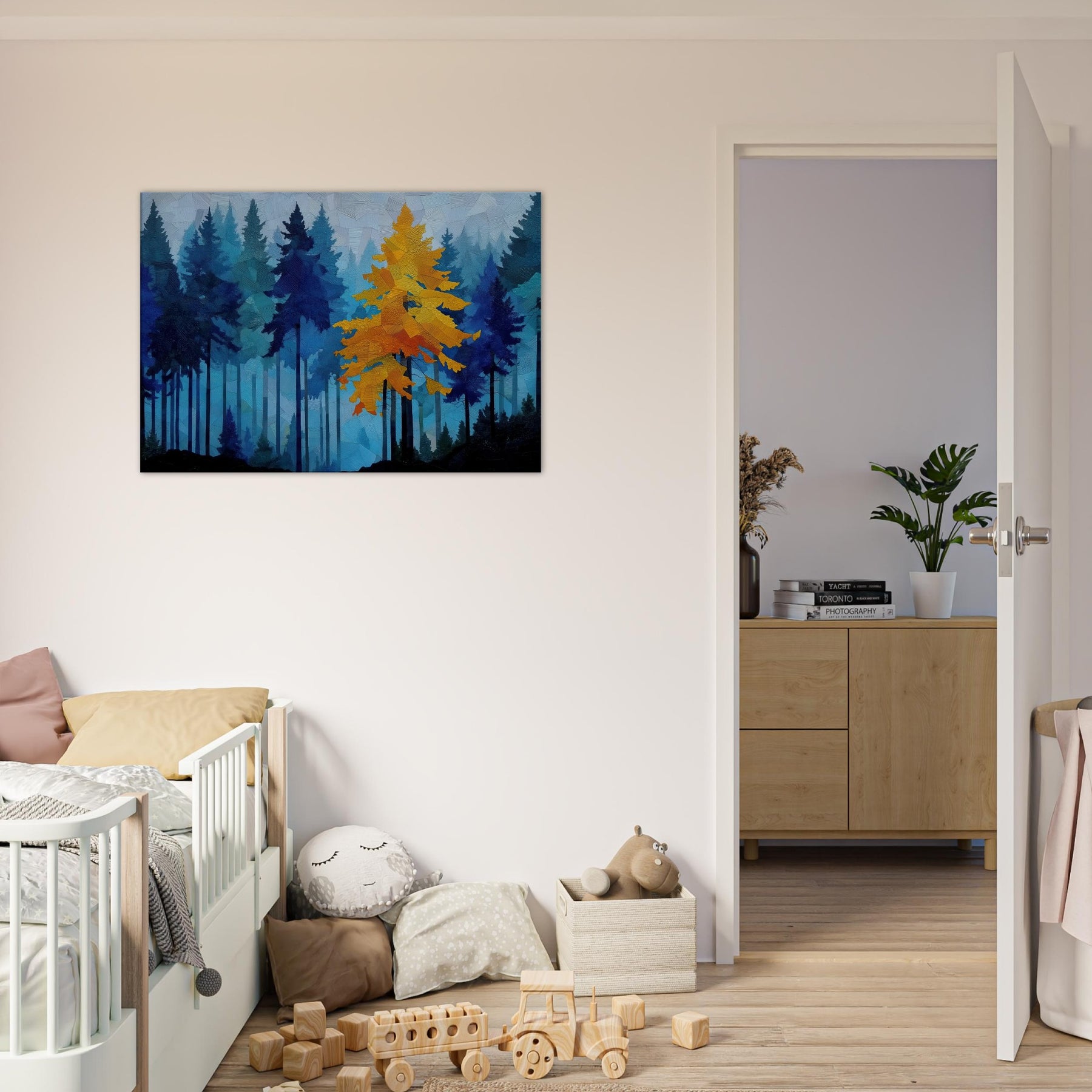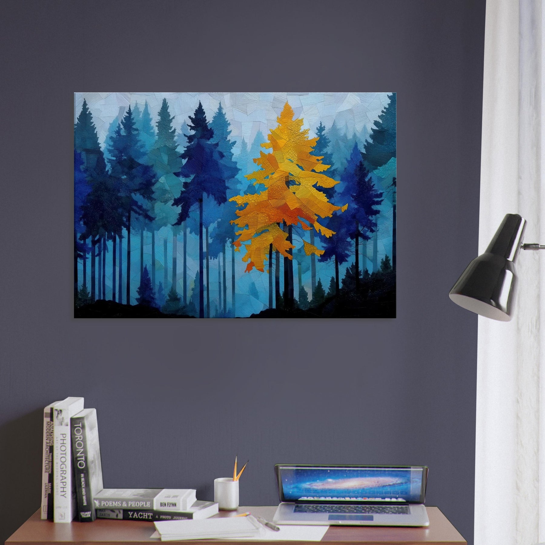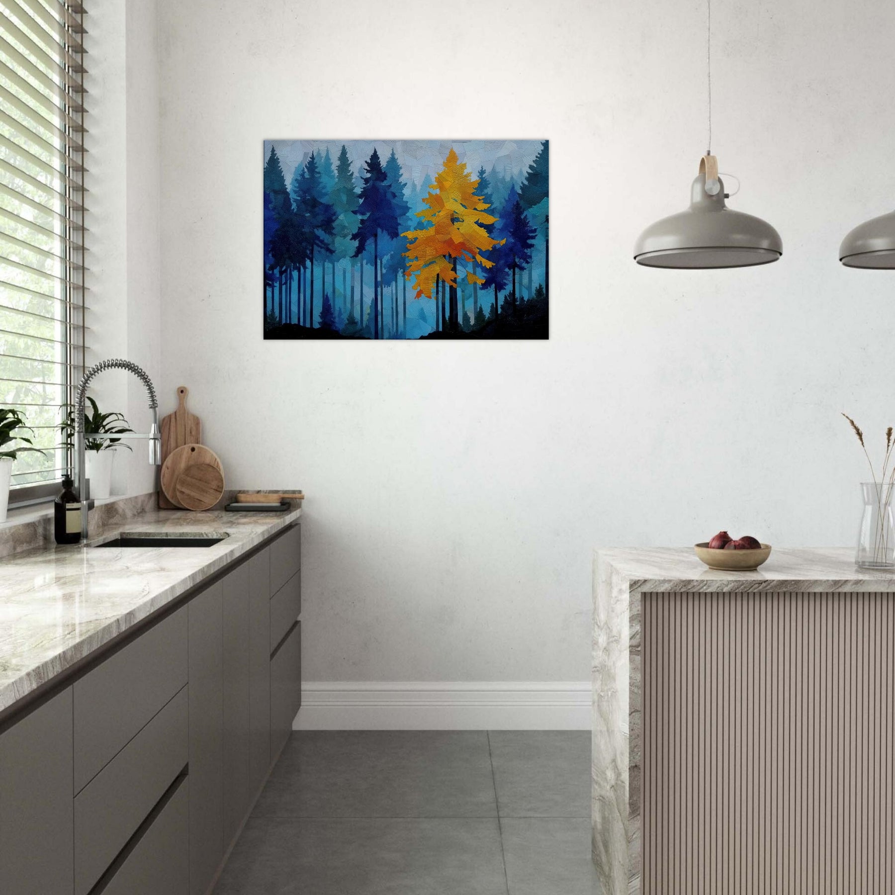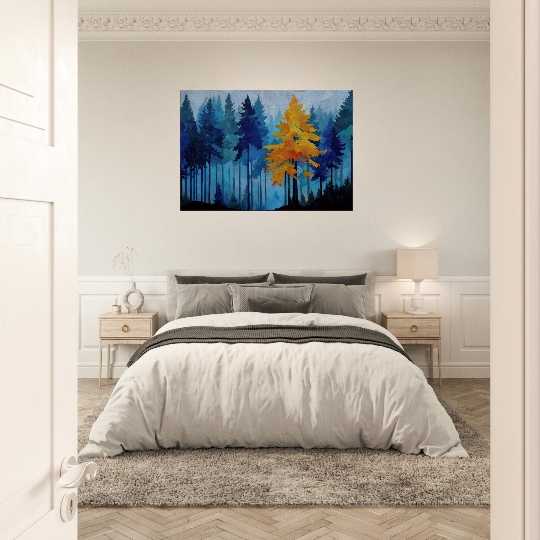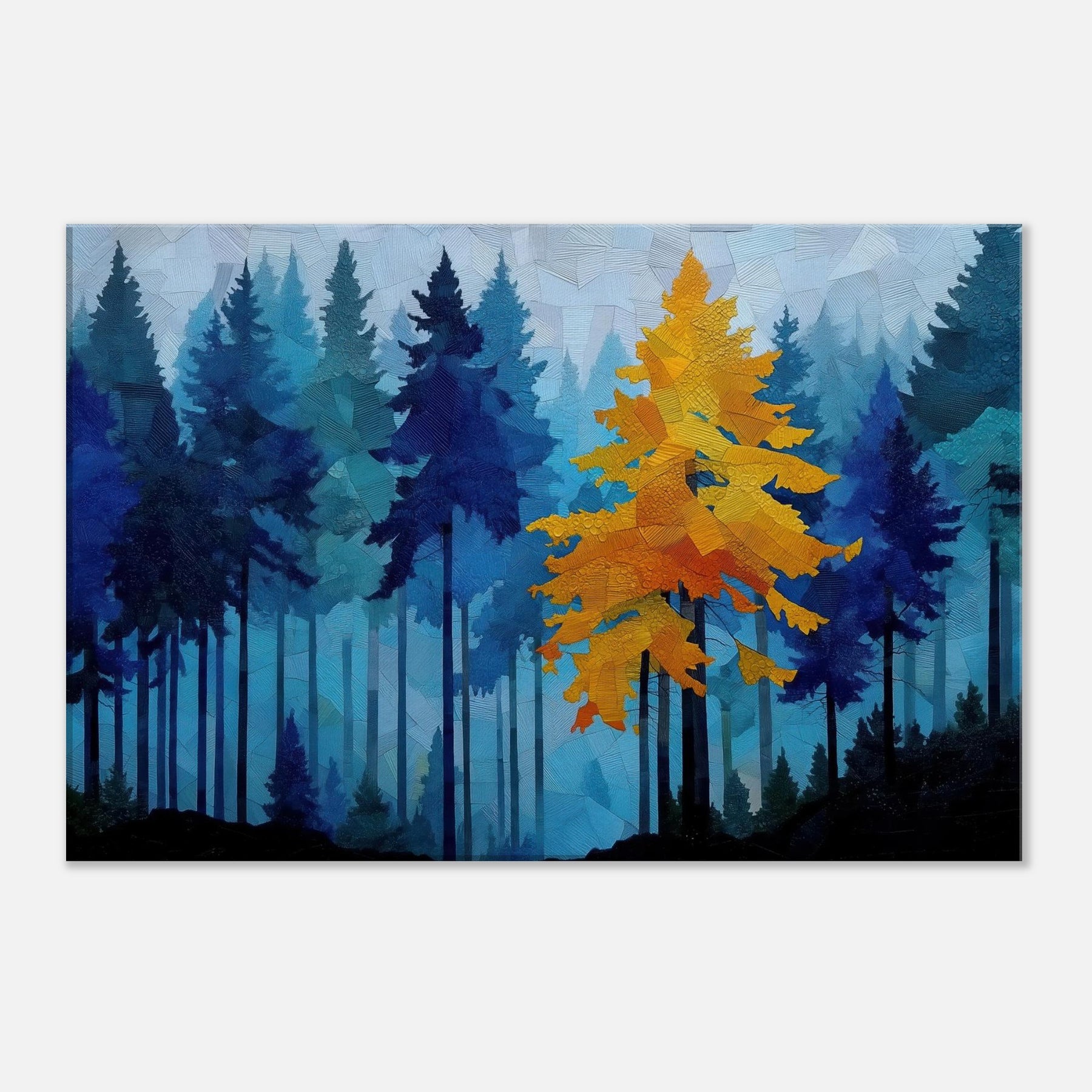 In this Foggy Forest study, the abstract composition invites a slow breath and attentive gaze. Layers of blue and teal recede into misty silhouettes while one luminous golden tree anchors the scene, like a sunlit beacon through morning fog. The textured surface adds tactile depth, as if forest air and dew brush the room. It softens a living space, reflects light with quiet shimmer, and elevates a corner into a serene, contemplative refuge.