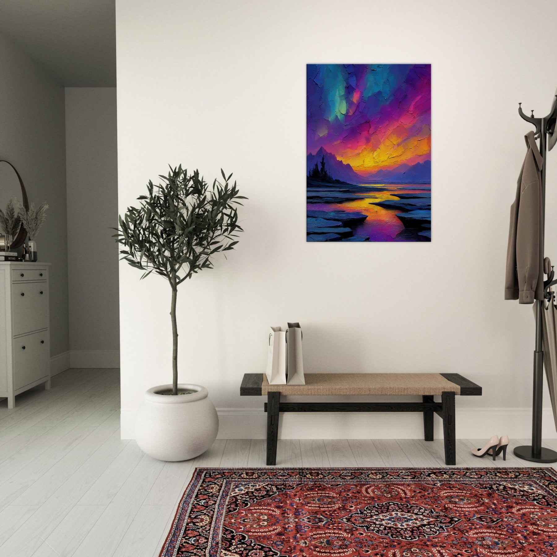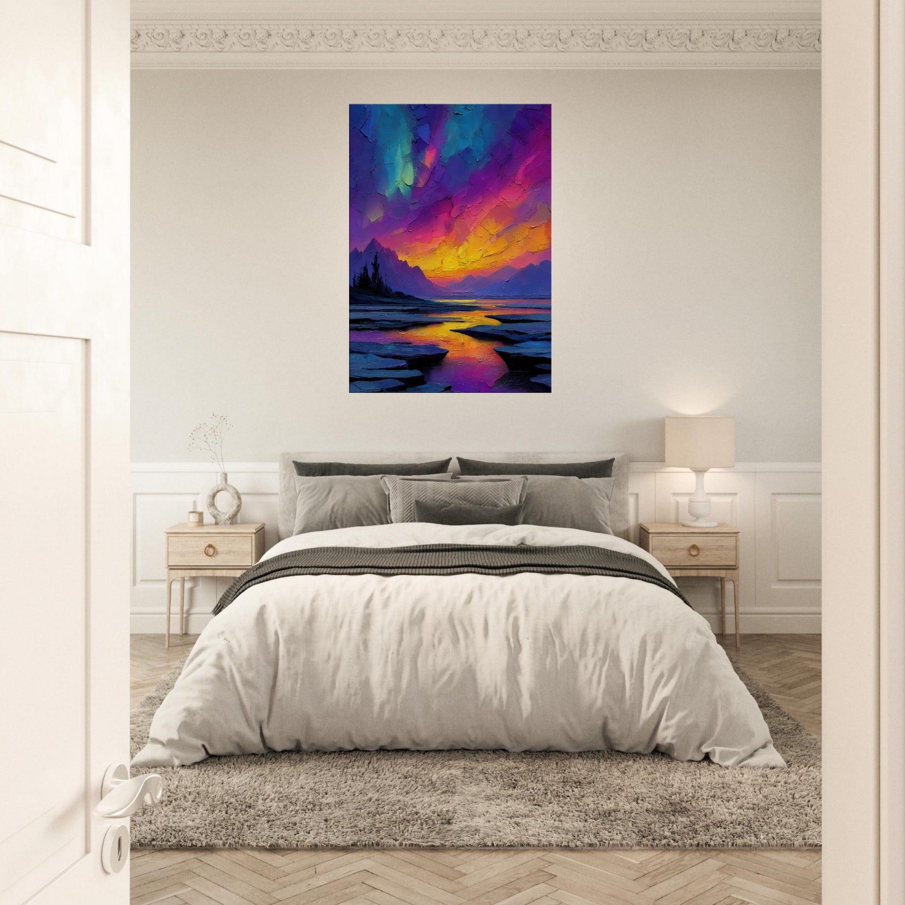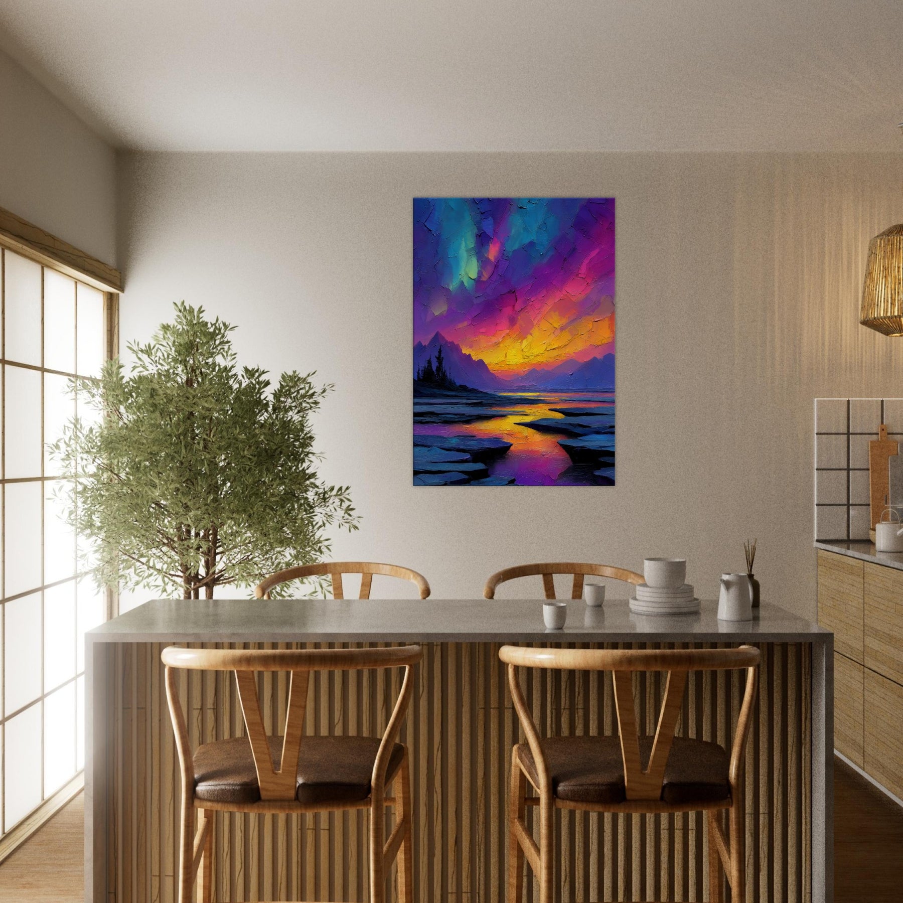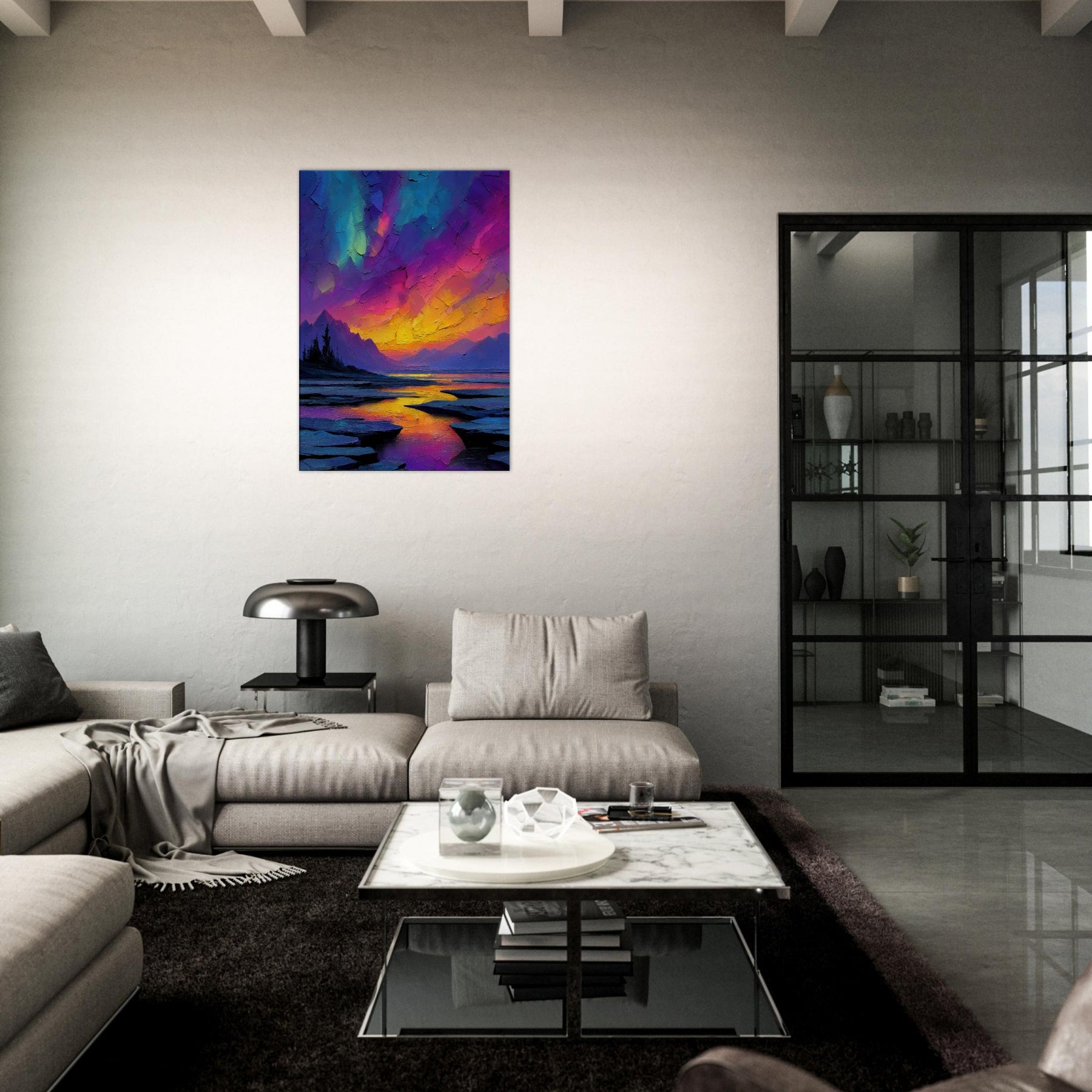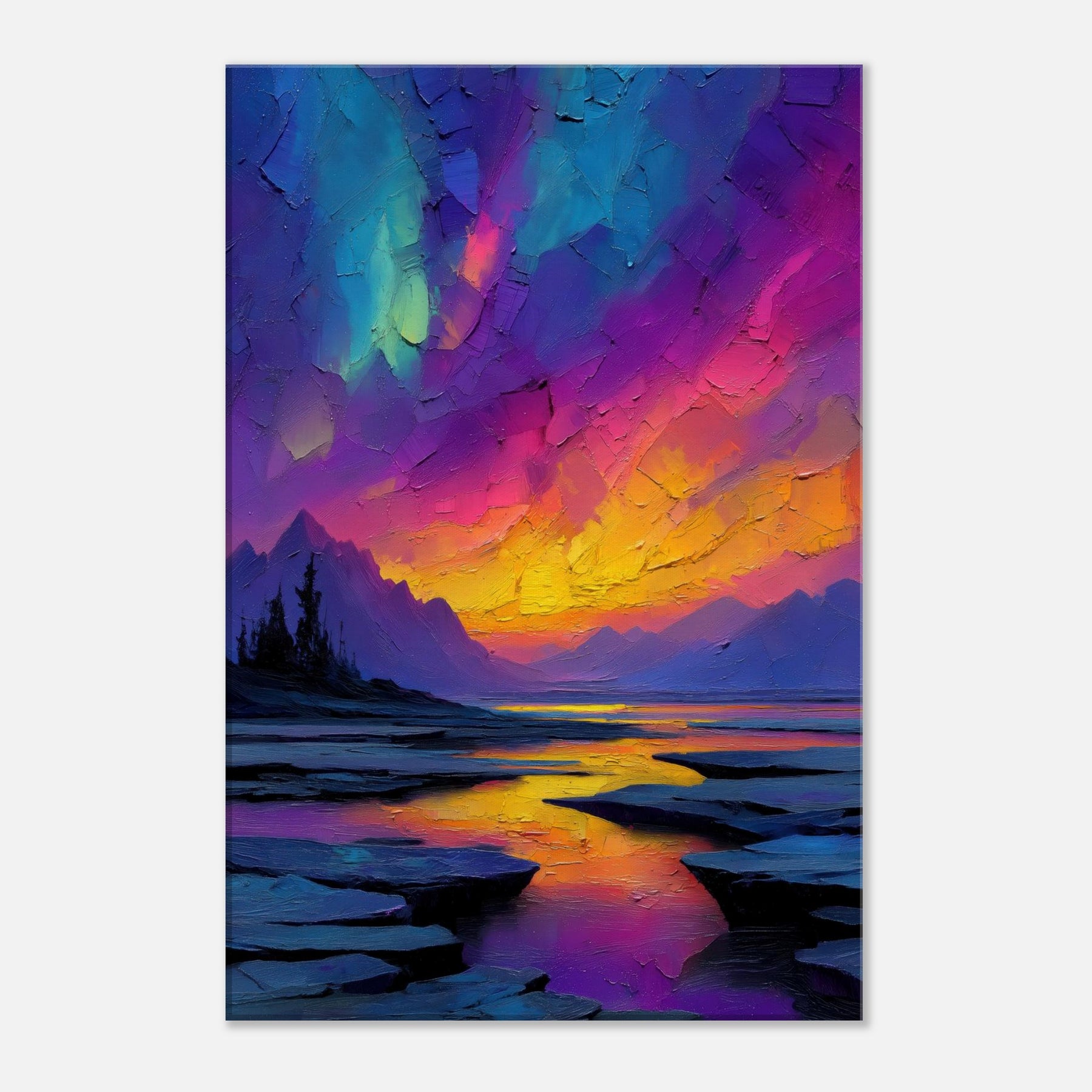 Emerging from a luminous horizon, Aurora Borealis washes the sky in a symphony of electric greens, violets, and gold. This abstract feels both celestial and tactile, as if light itself has been pressed into paint. The scene pools along a tranquil shoreline, where reflective bands of color ripple across water and ice. Hang it in a living room to invite quiet wonder, to glow with every sunset, and to transform the space into a serene sanctuary of imagination and nature.