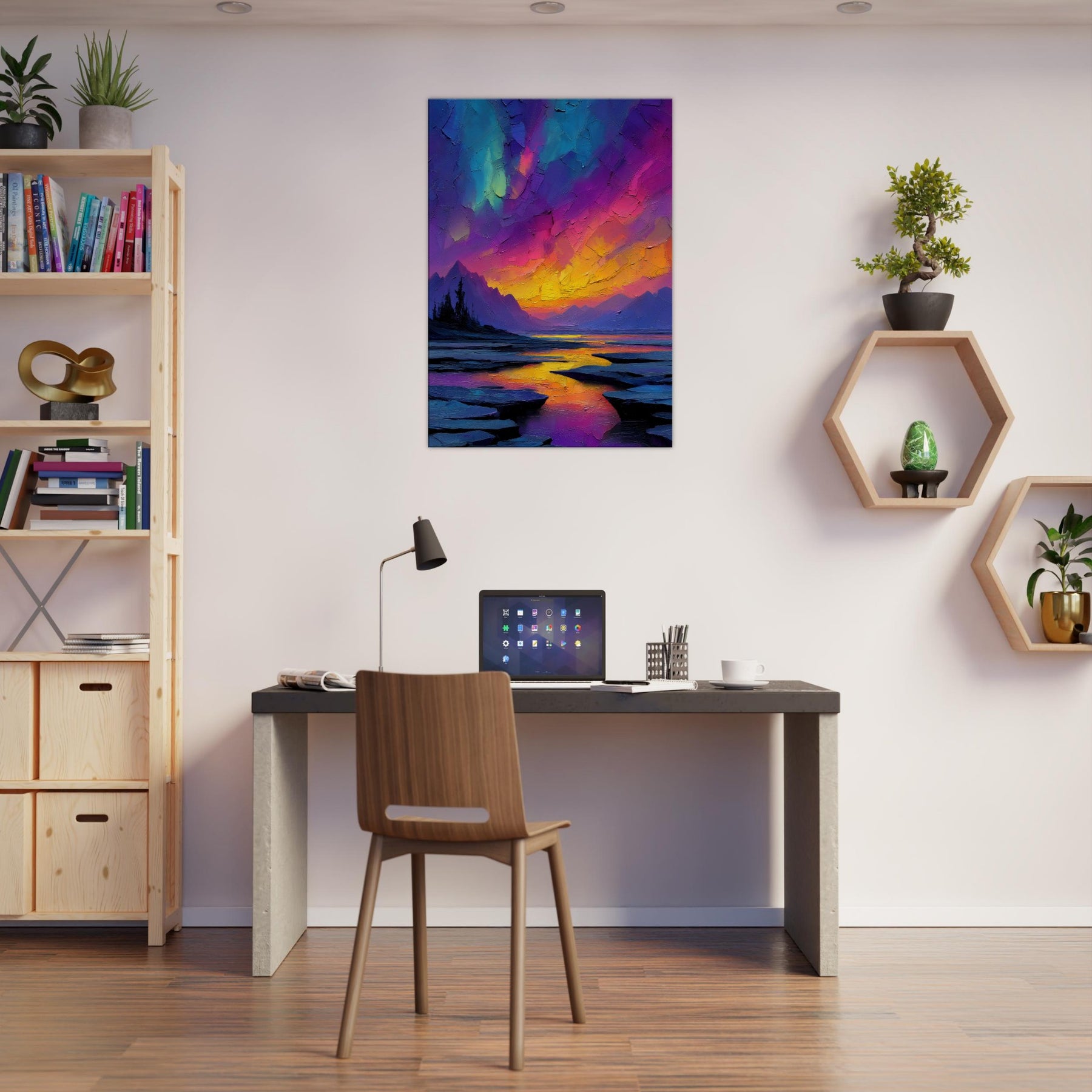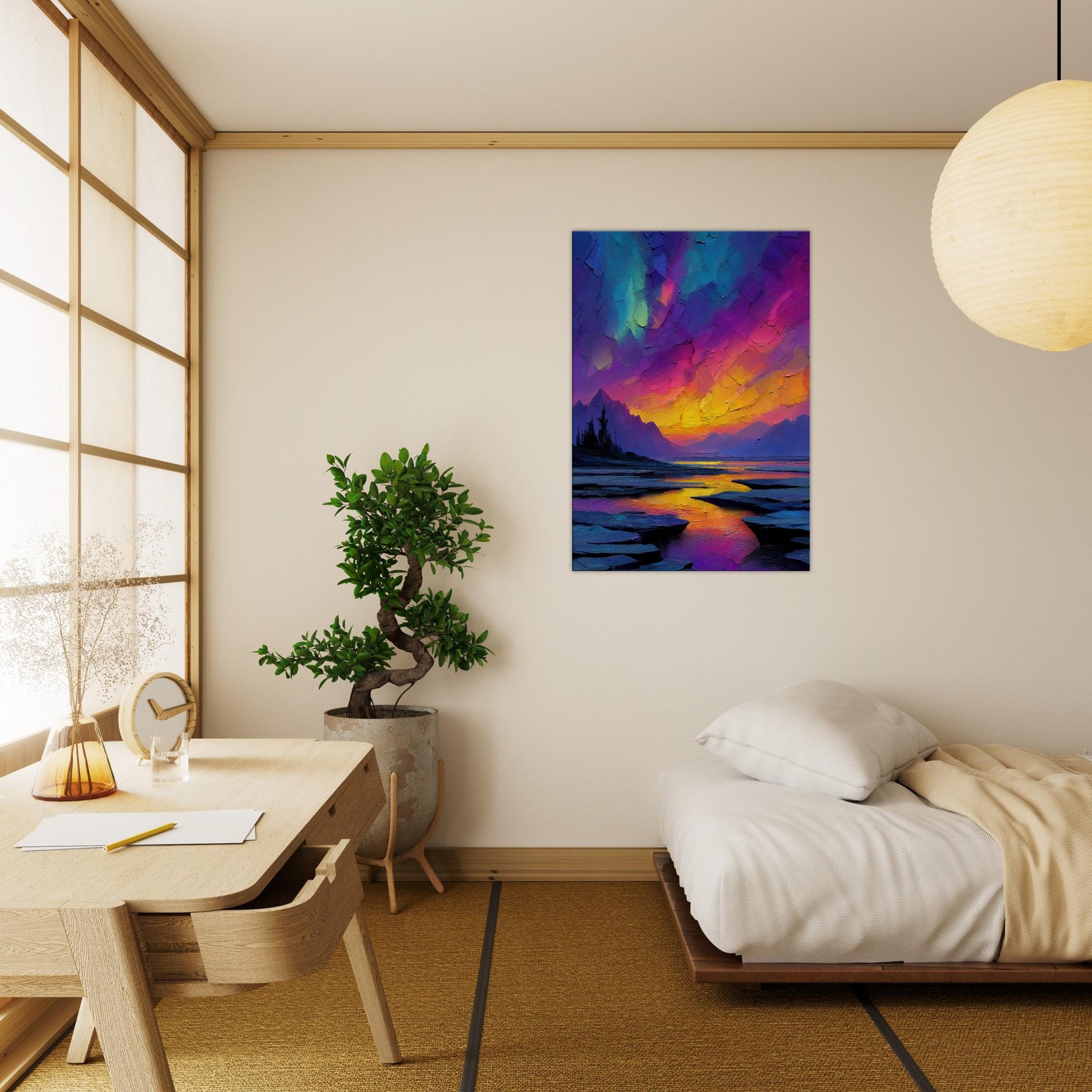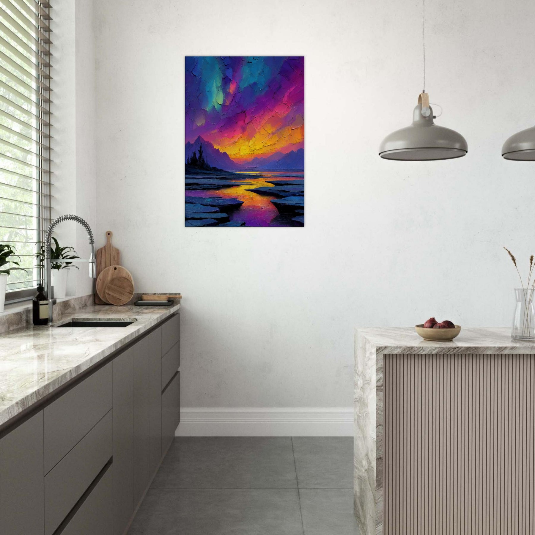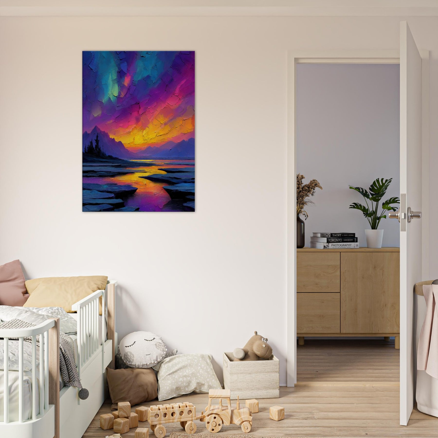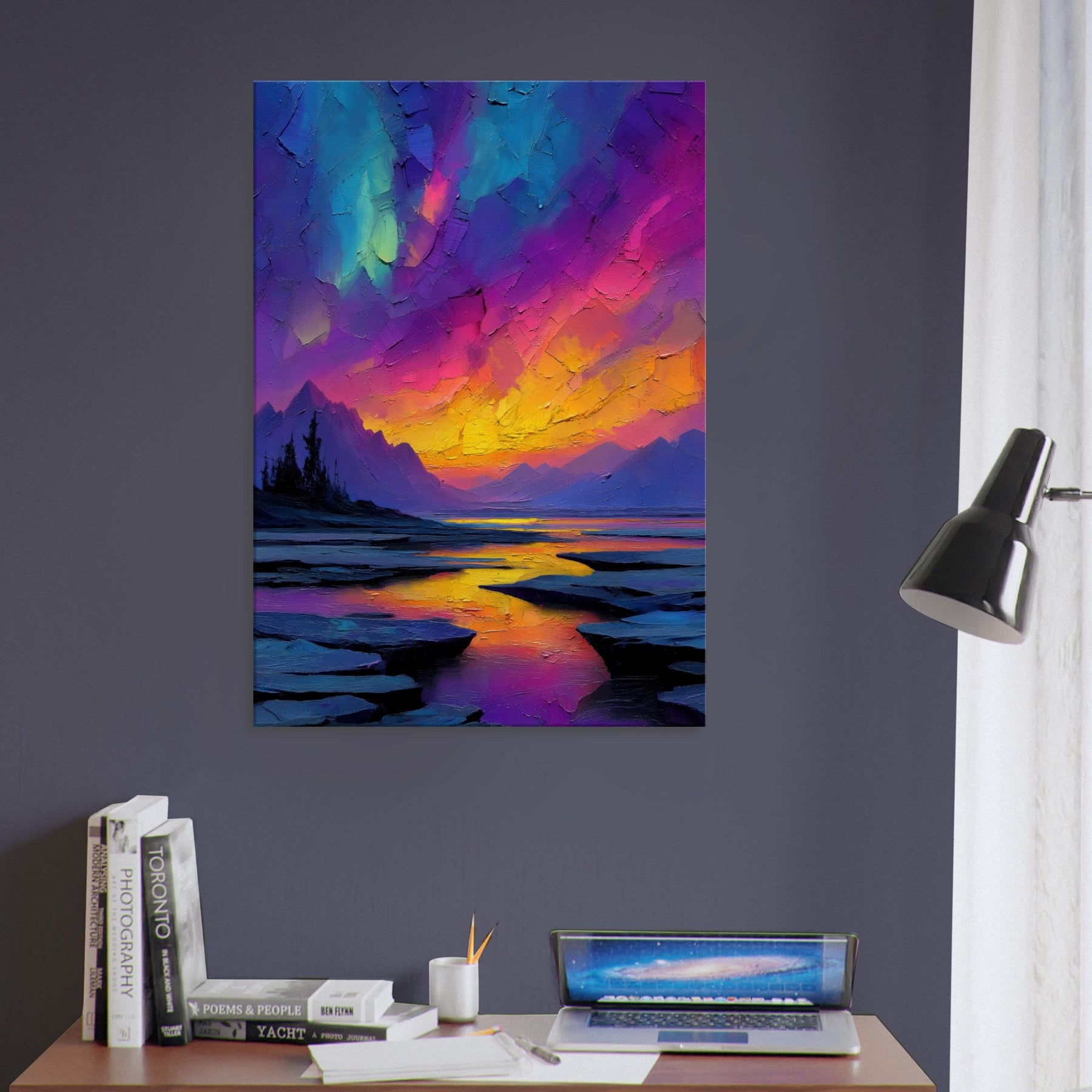 Emerging from a luminous horizon, Aurora Borealis washes the sky in a symphony of electric greens, violets, and gold. This abstract feels both celestial and tactile, as if light itself has been pressed into paint. The scene pools along a tranquil shoreline, where reflective bands of color ripple across water and ice. Hang it in a living room to invite quiet wonder, to glow with every sunset, and to transform the space into a serene sanctuary of imagination and nature.