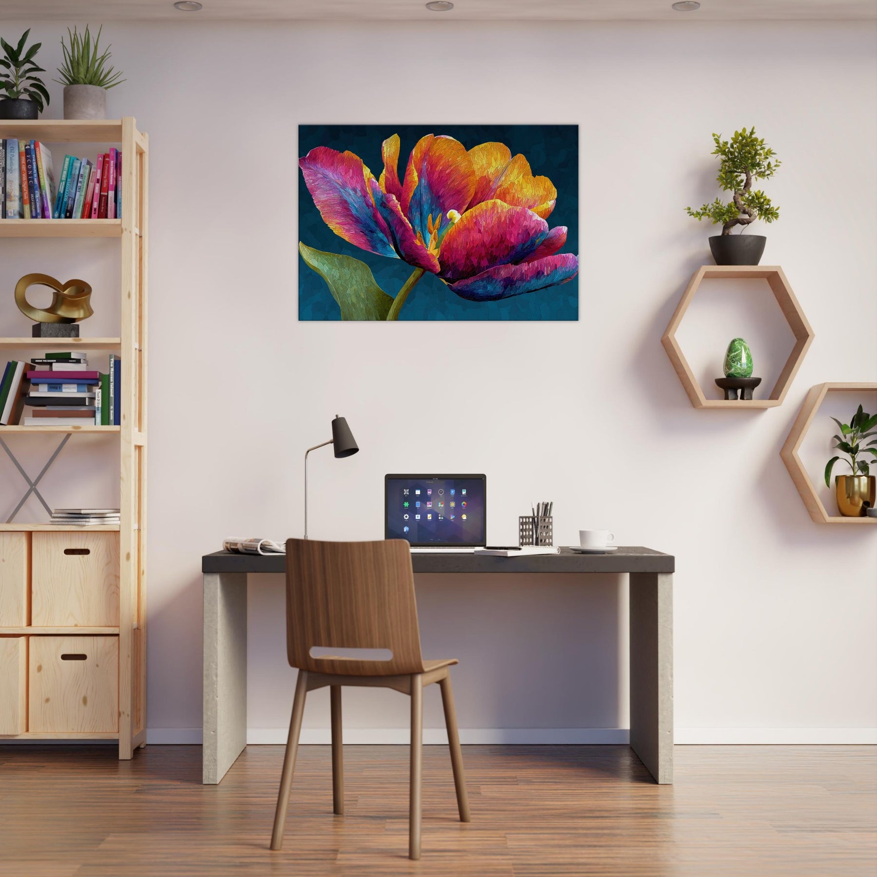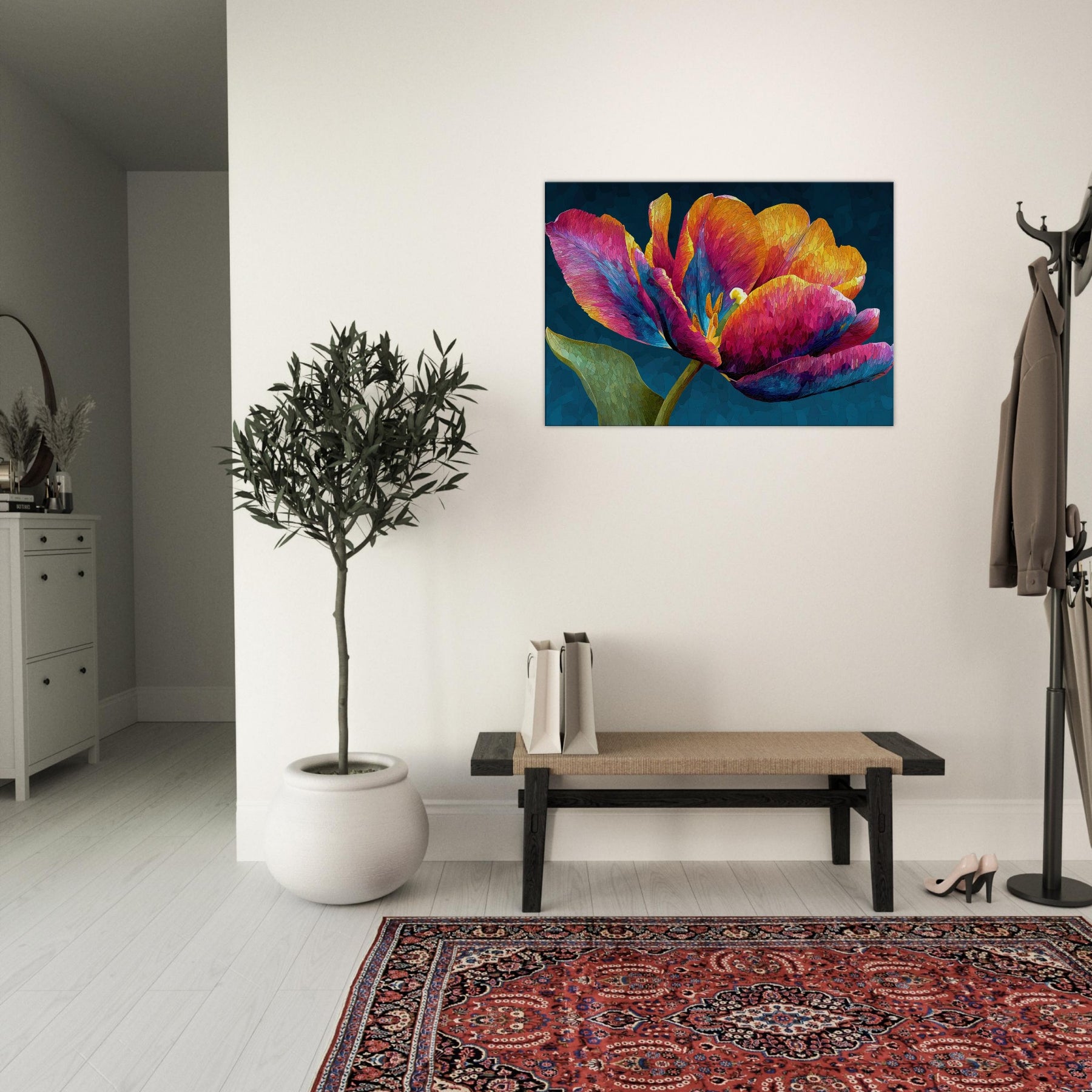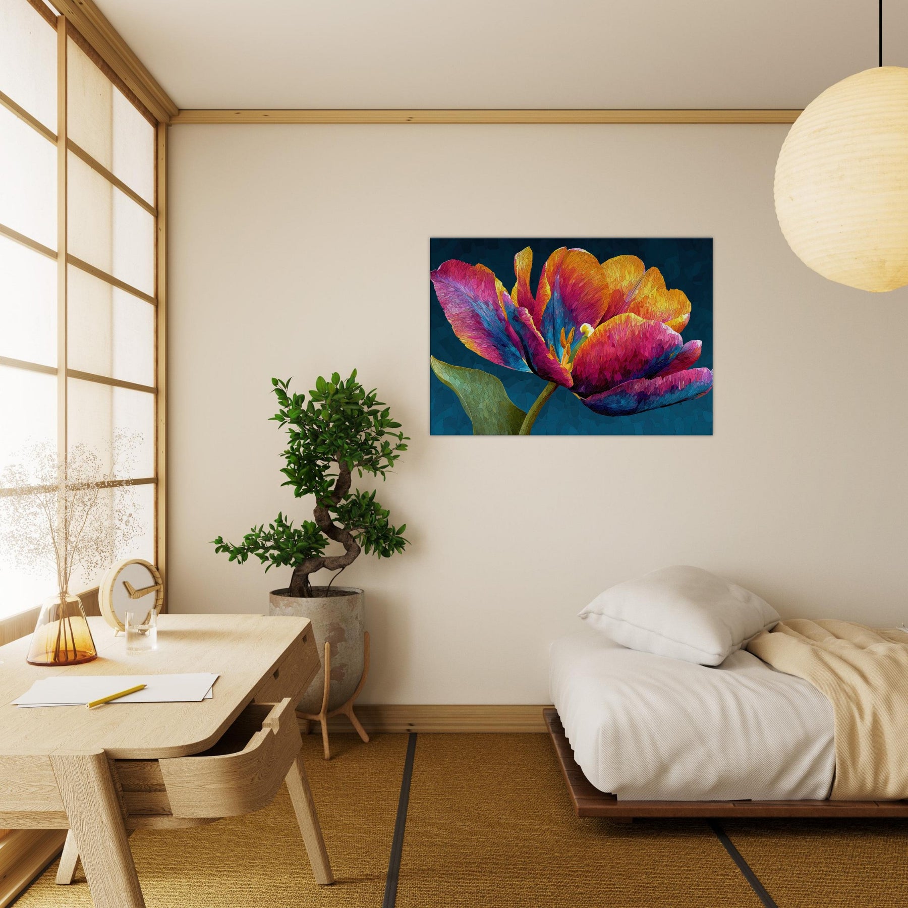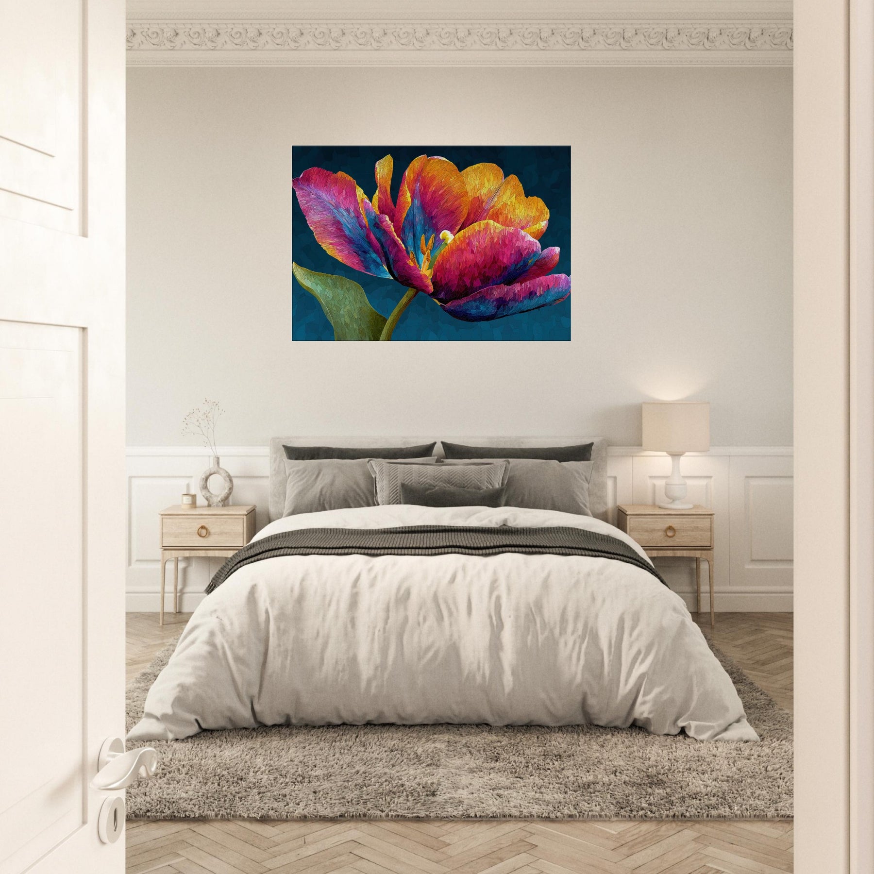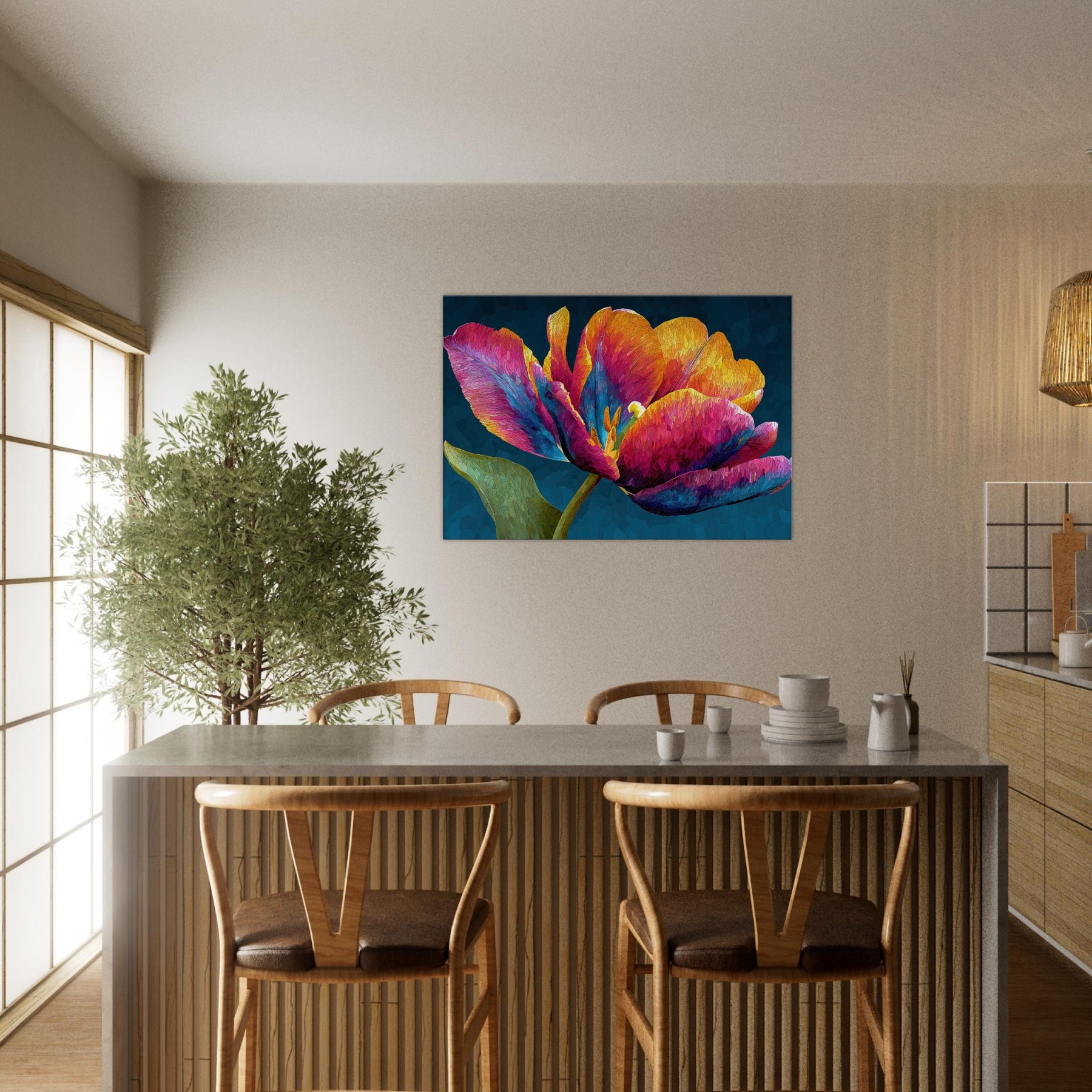 A lyrical study of a Tulip unfurled in radiant, liquid color. This abstract bloom dissolves into a symphony of pinks, oranges, violets and blues, drifting against a midnight teal field. The piece invites the eye to wander, echoing sunlight and a gentle breeze, making walls feel breathable and alive. Perfect for a living room or bedroom, it acts as a kinetic focal point, transforming quiet evenings into a moment of bright, cinematic calm.