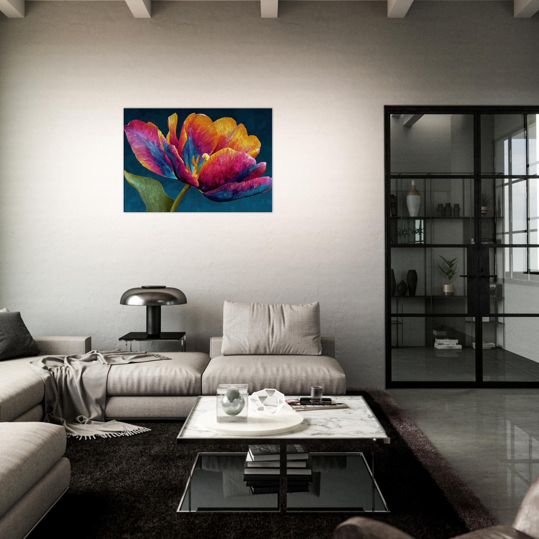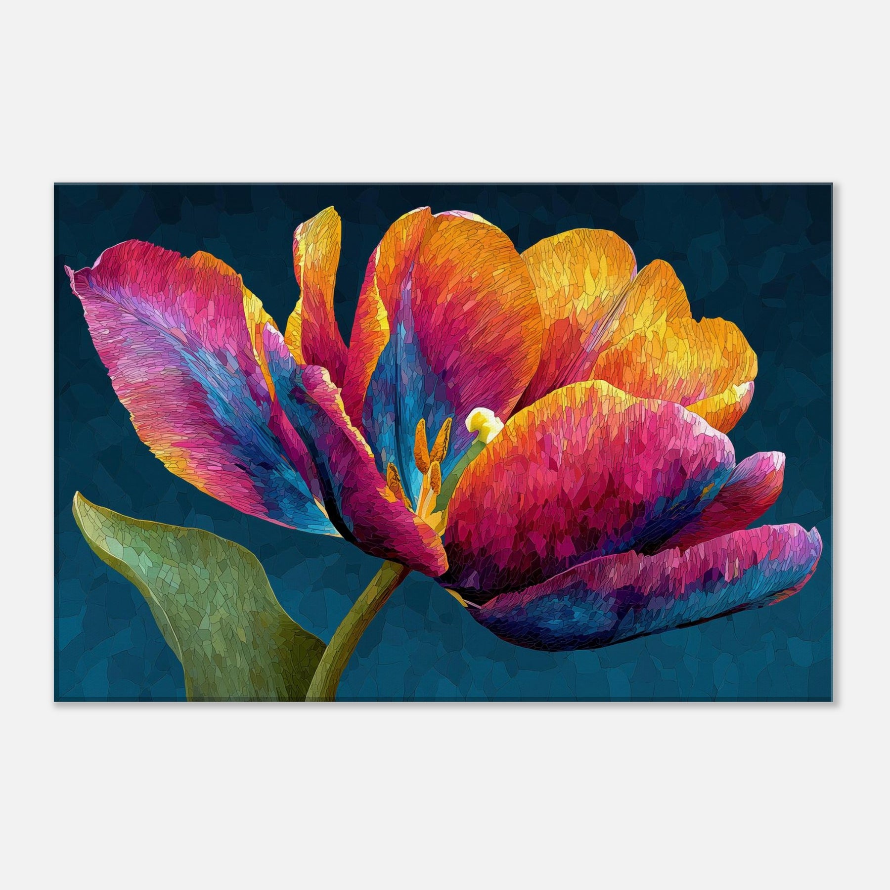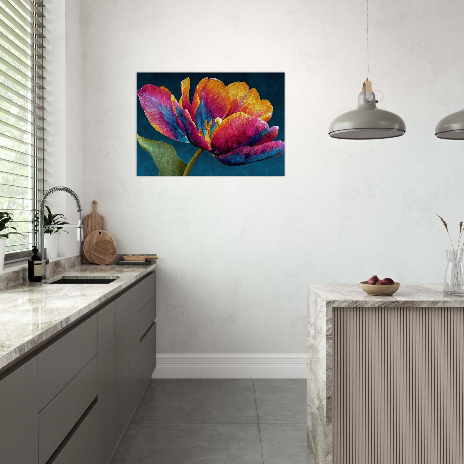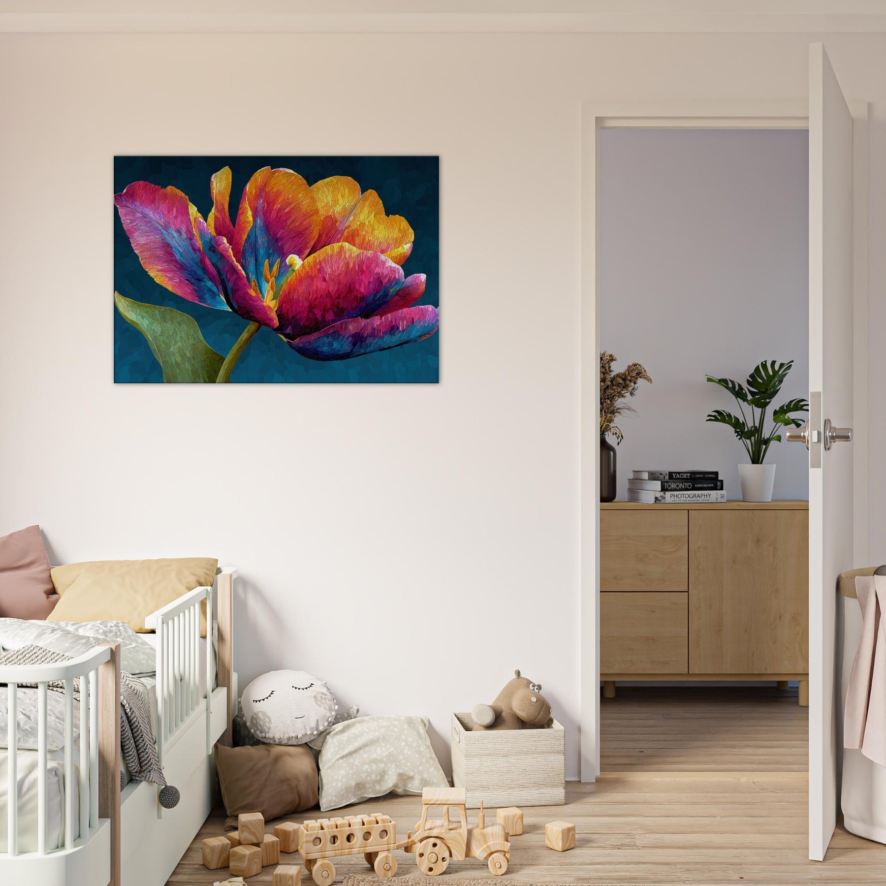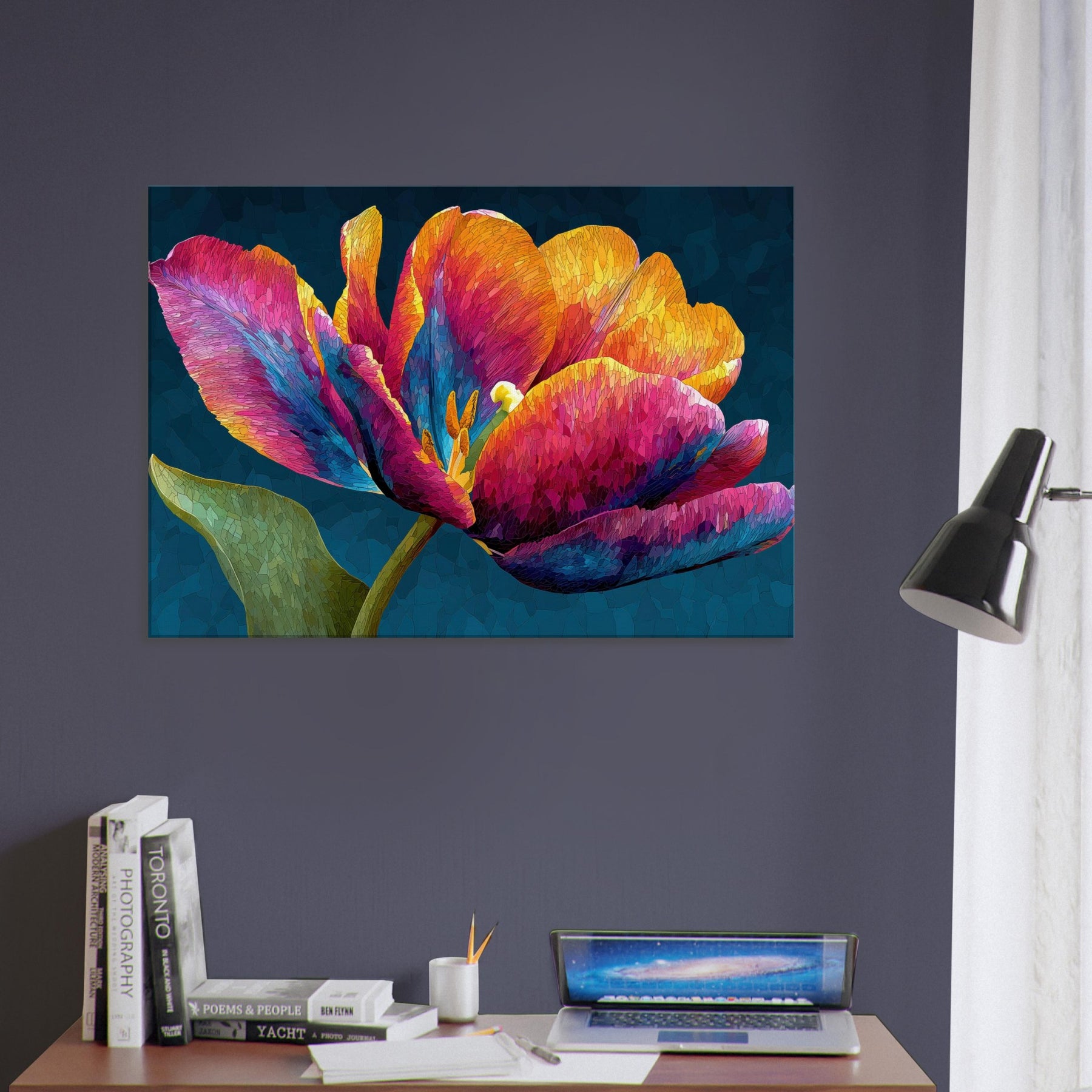 A lyrical study of a Tulip unfurled in radiant, liquid color. This abstract bloom dissolves into a symphony of pinks, oranges, violets and blues, drifting against a midnight teal field. The piece invites the eye to wander, echoing sunlight and a gentle breeze, making walls feel breathable and alive. Perfect for a living room or bedroom, it acts as a kinetic focal point, transforming quiet evenings into a moment of bright, cinematic calm.