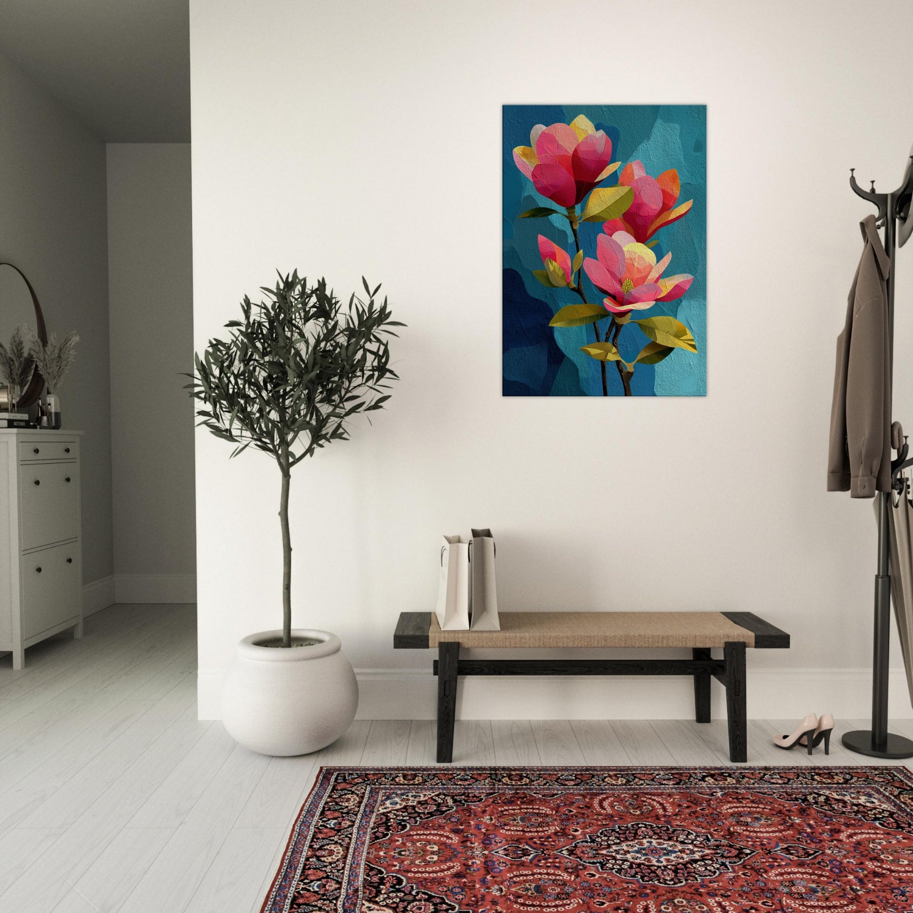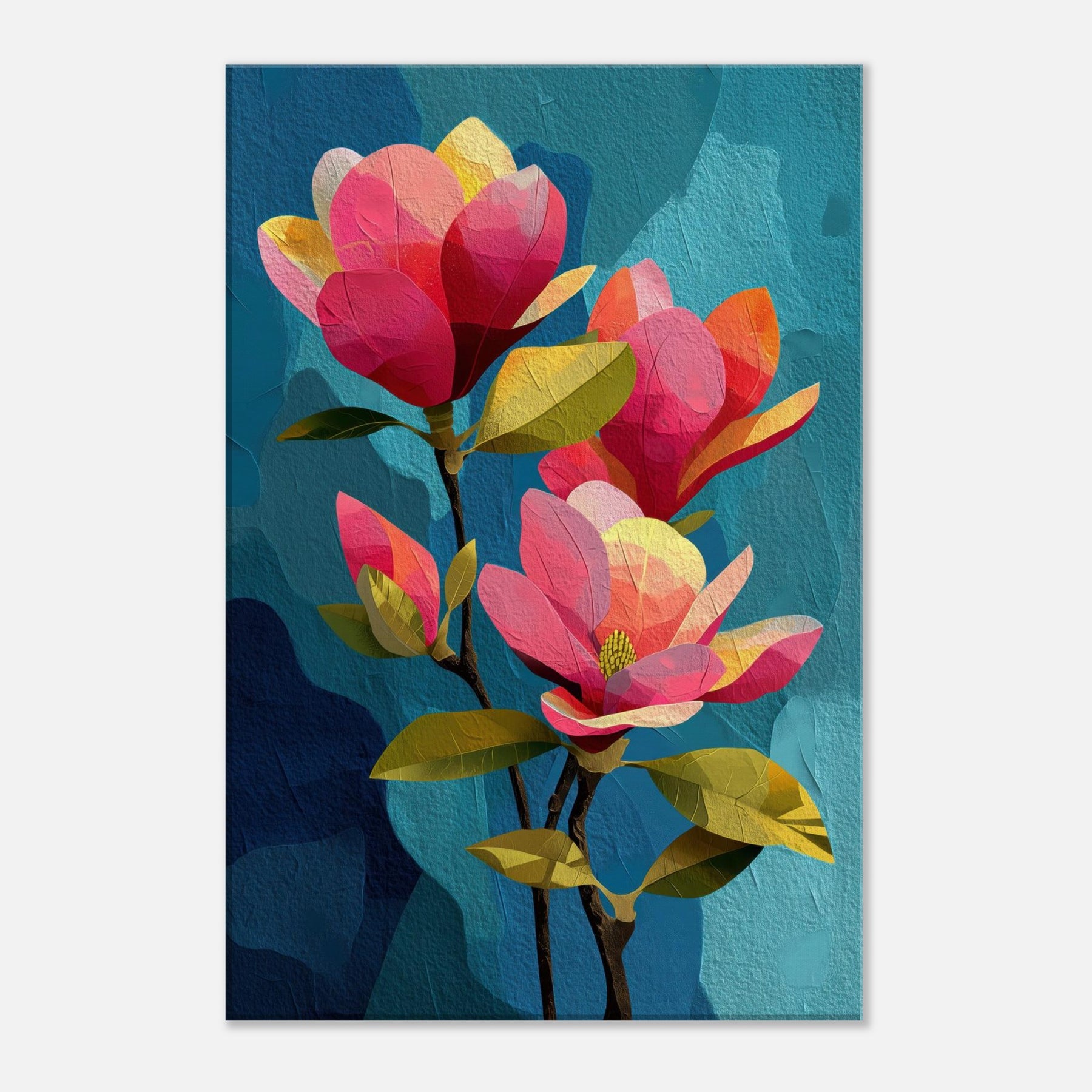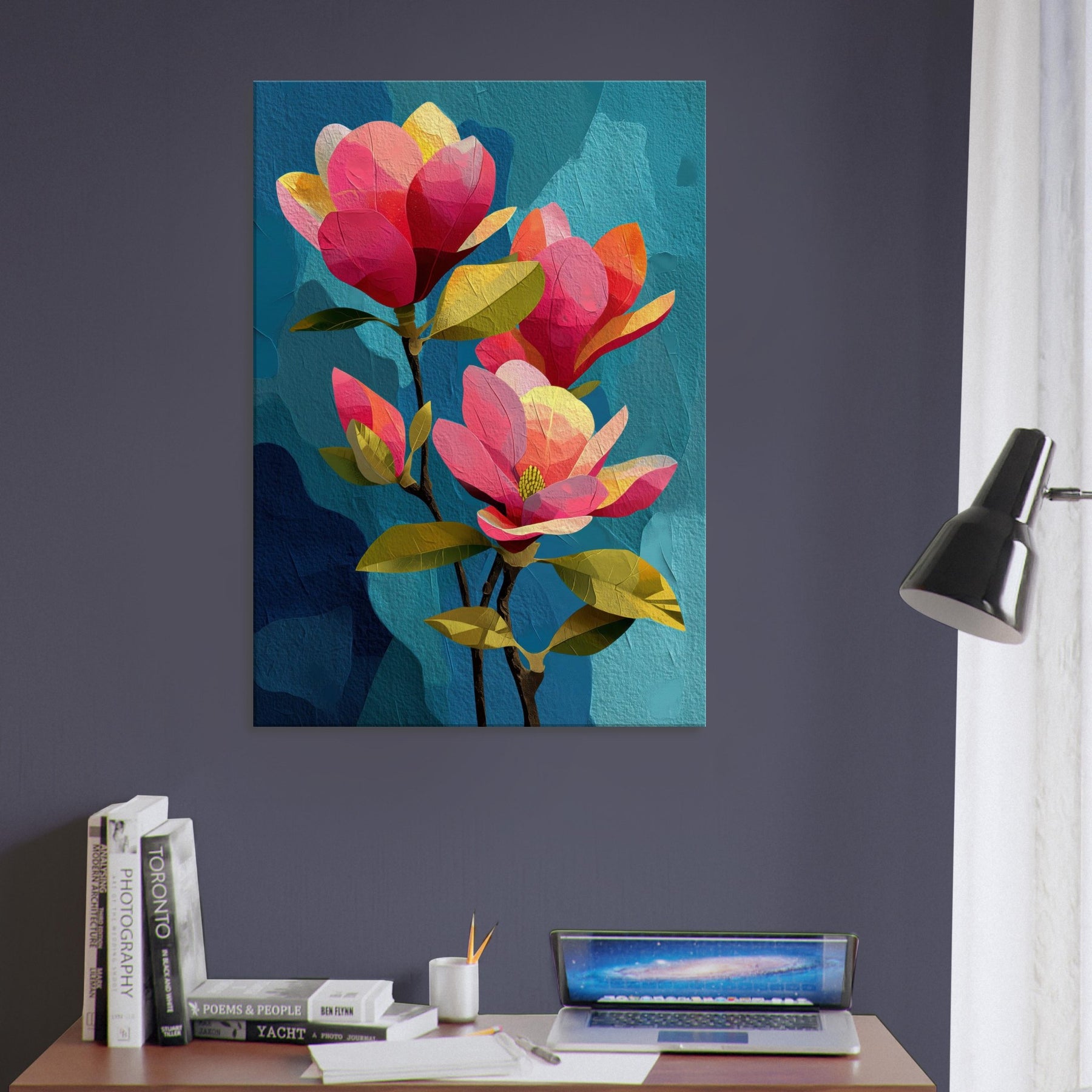 Let Magnolia bloom beyond the frame in a symphony of color and light. This abstract composition folds petals into luminous gradients of pink, coral, and sunlit yellow against a cooling teal backdrop, evoking a tranquil garden at dusk. The tactile brushwork suggests depth and movement, inviting a moment of calm in a busy room. Hang it in a living room or hallway to conjure a contemporary natural oasis softening edges, brightening mood, and giving the space a refined botanical heartbeat.