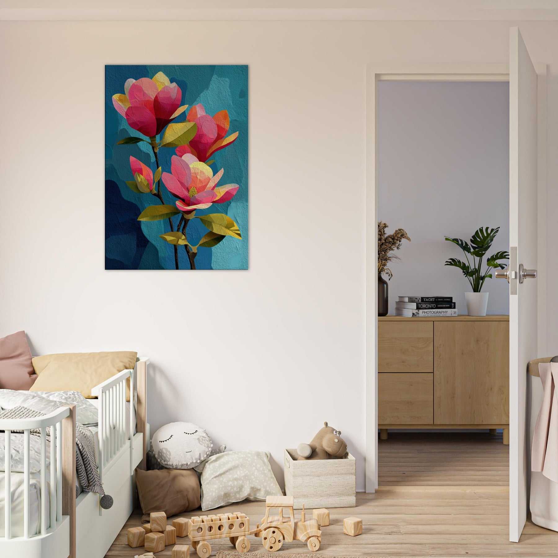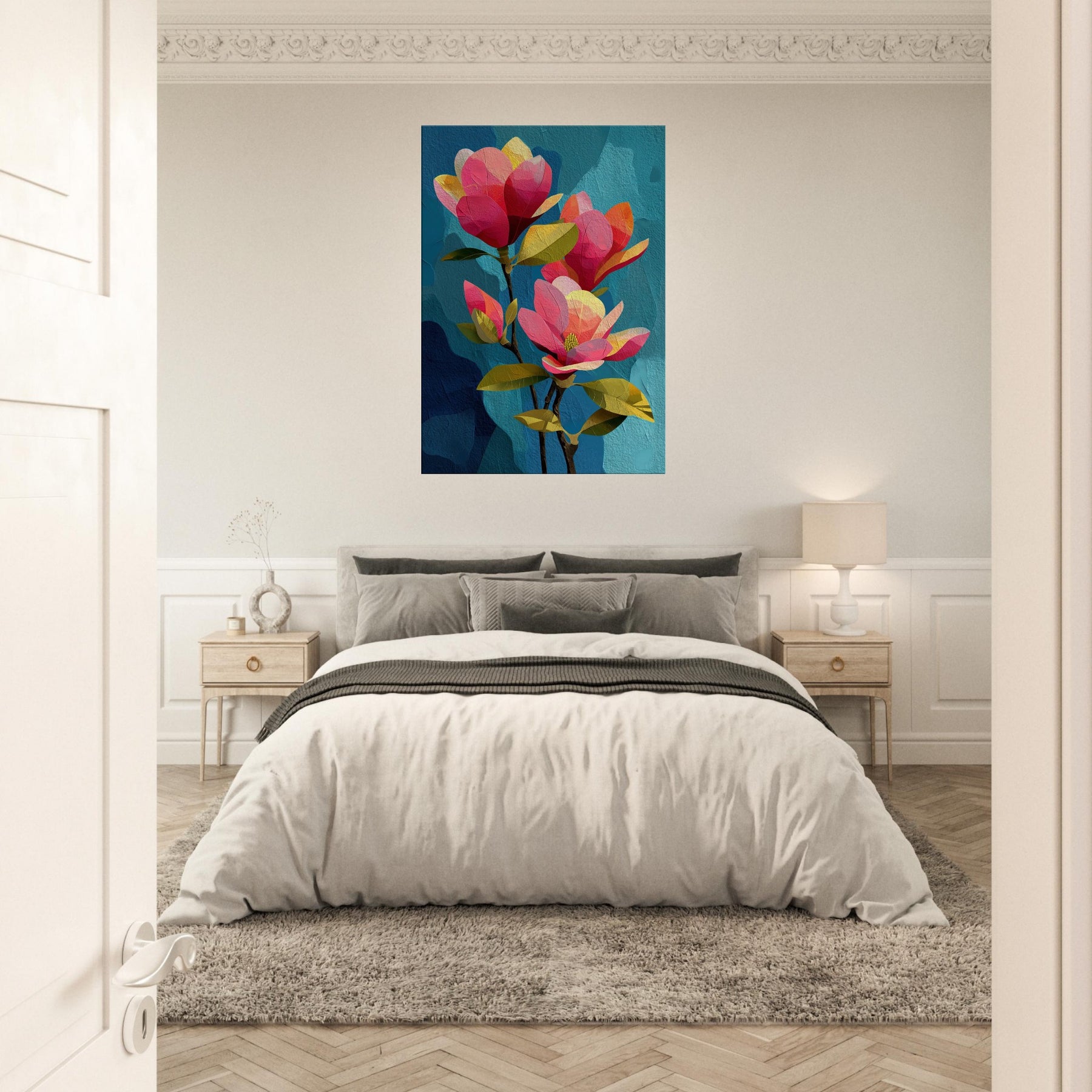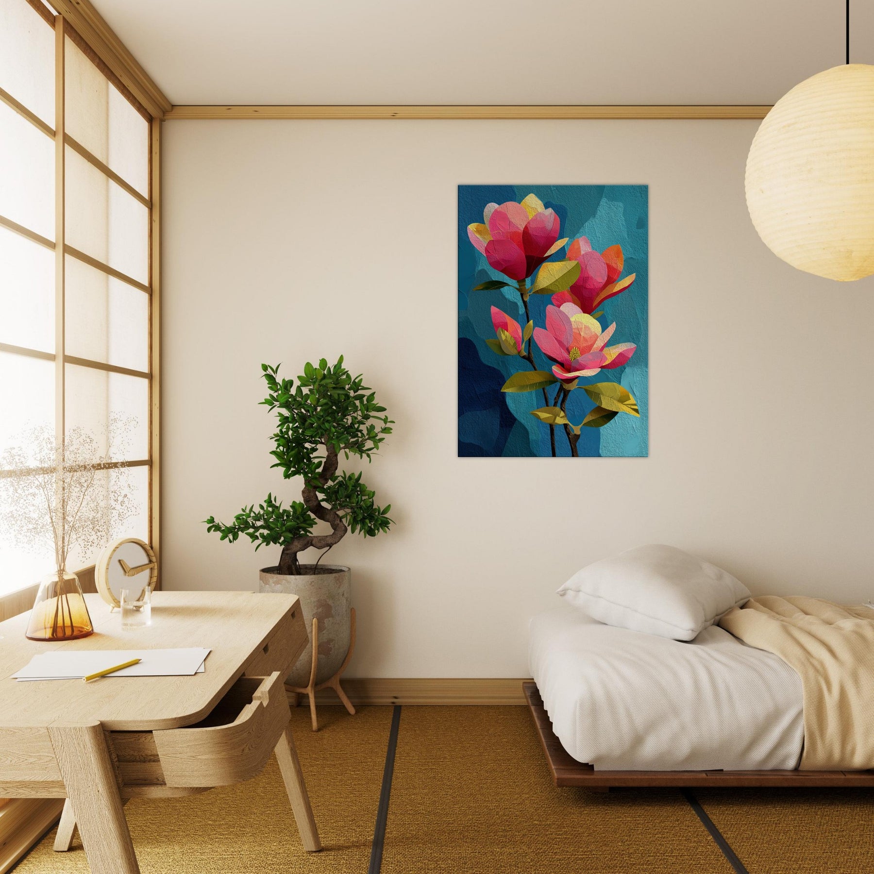 Let Magnolia bloom beyond the frame in a symphony of color and light. This abstract composition folds petals into luminous gradients of pink, coral, and sunlit yellow against a cooling teal backdrop, evoking a tranquil garden at dusk. The tactile brushwork suggests depth and movement, inviting a moment of calm in a busy room. Hang it in a living room or hallway to conjure a contemporary natural oasis softening edges, brightening mood, and giving the space a refined botanical heartbeat.