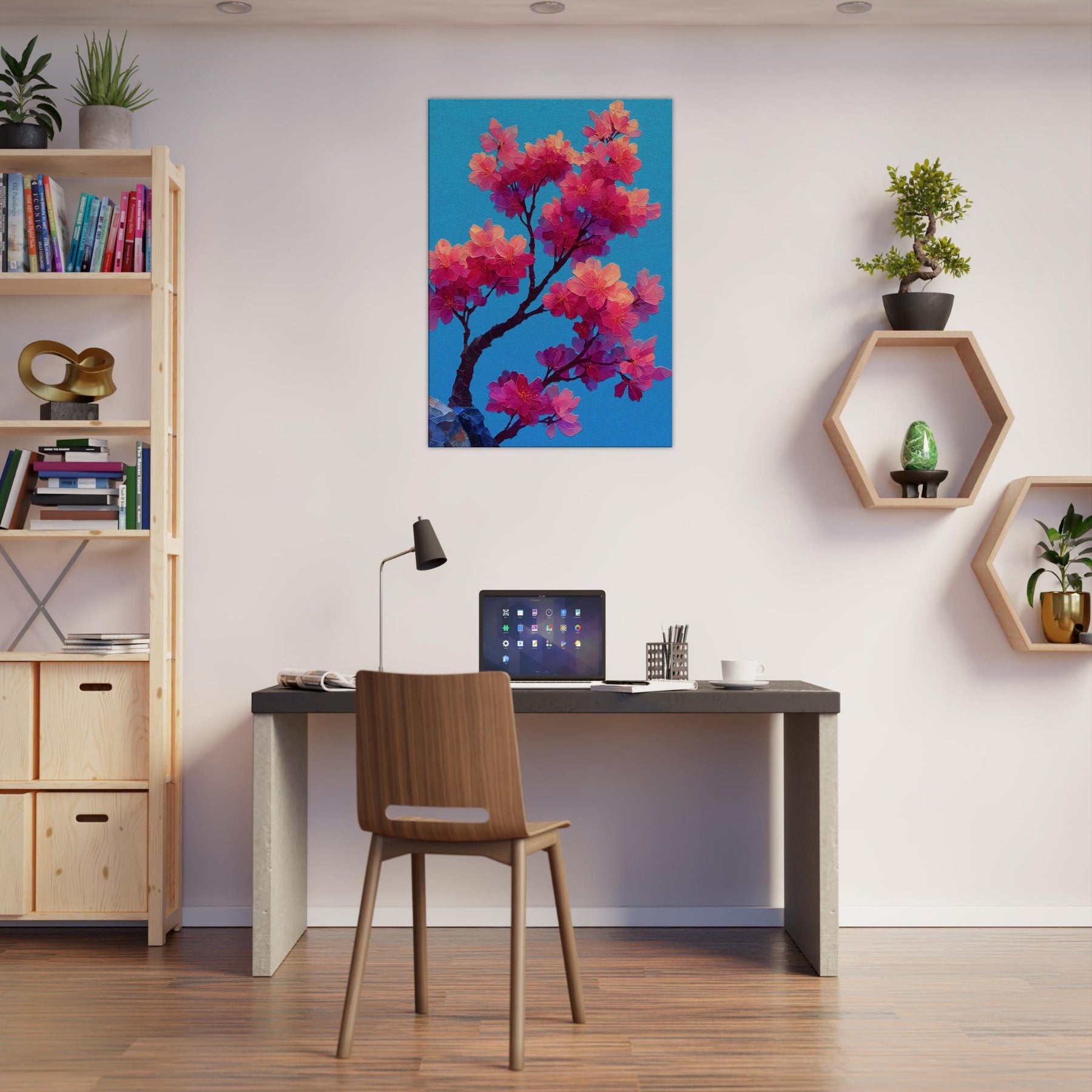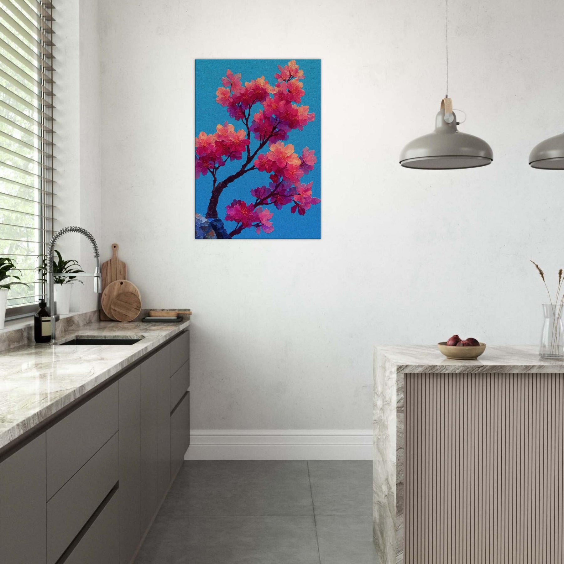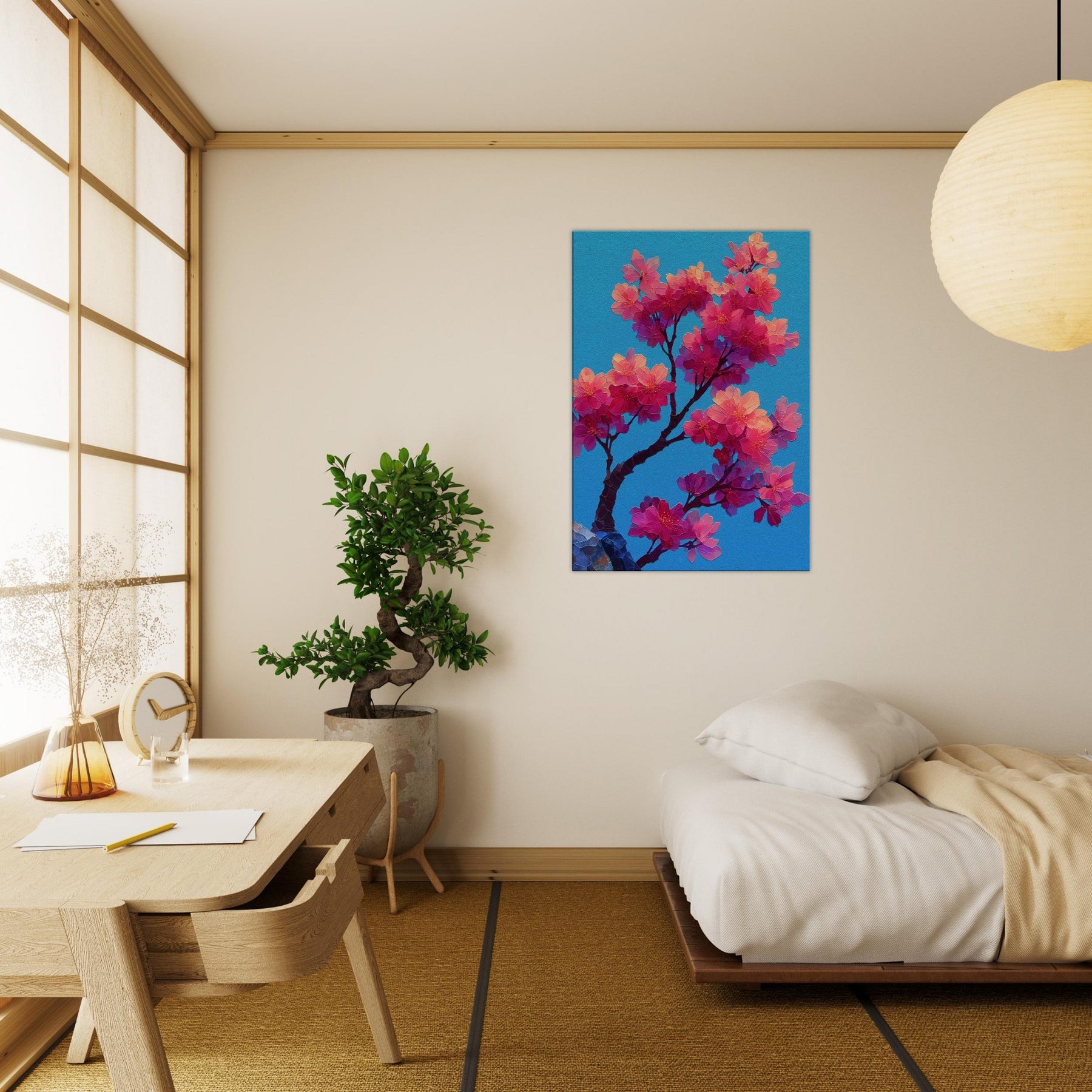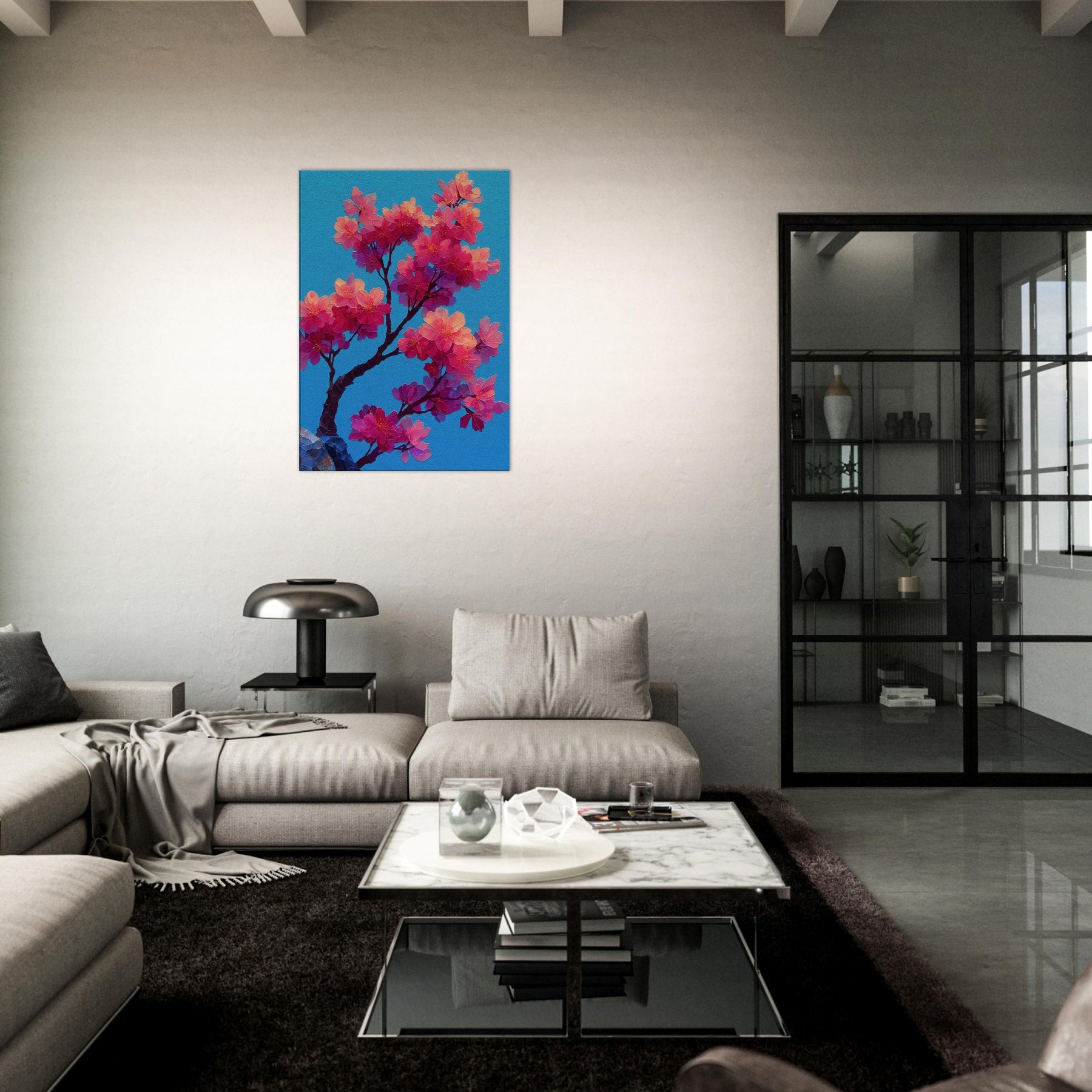 Embrace the Sakura Branch in a celebration of color and form. This abstract composition threads luminous pink blossoms along a deep blue canvas, where each petal appears to catch the light and glow. The dark, sculptural branches ground the piece, giving space to breathe and wonder. The atmosphere feels sun washed and serene, offering a focal calm to living rooms, bedrooms, or entryways. A subtle tension between warmth and shade invites longer look, changing with the light and becoming a daily, intimate moment of nature indoors.