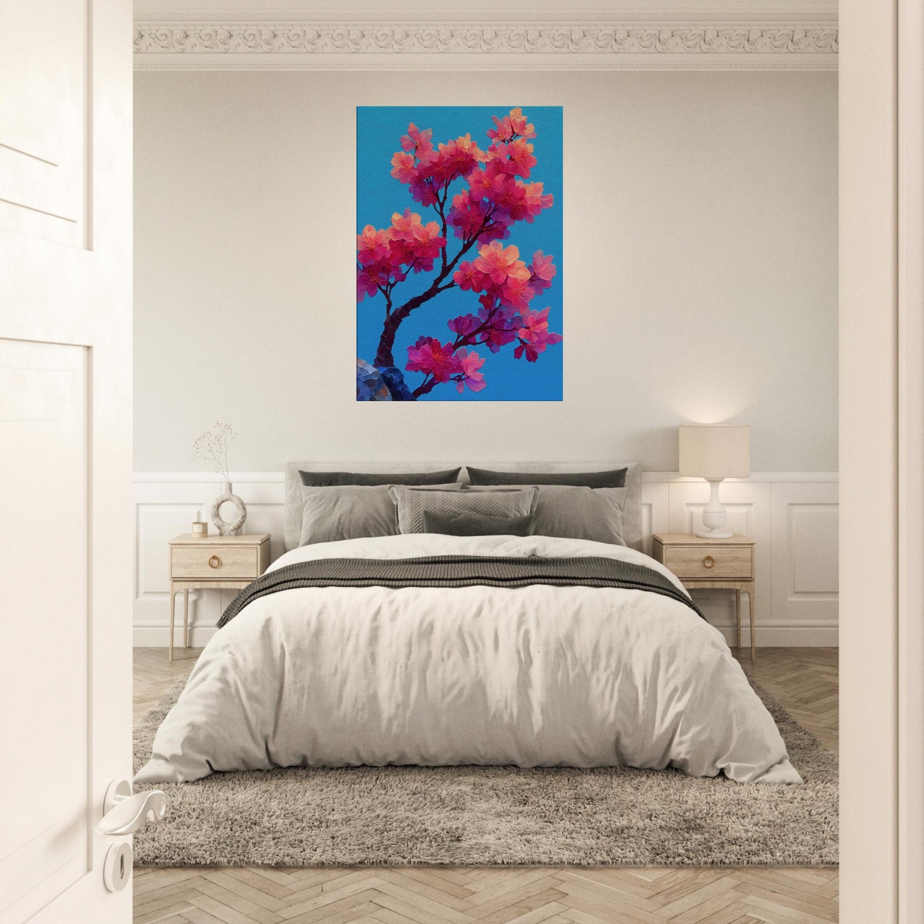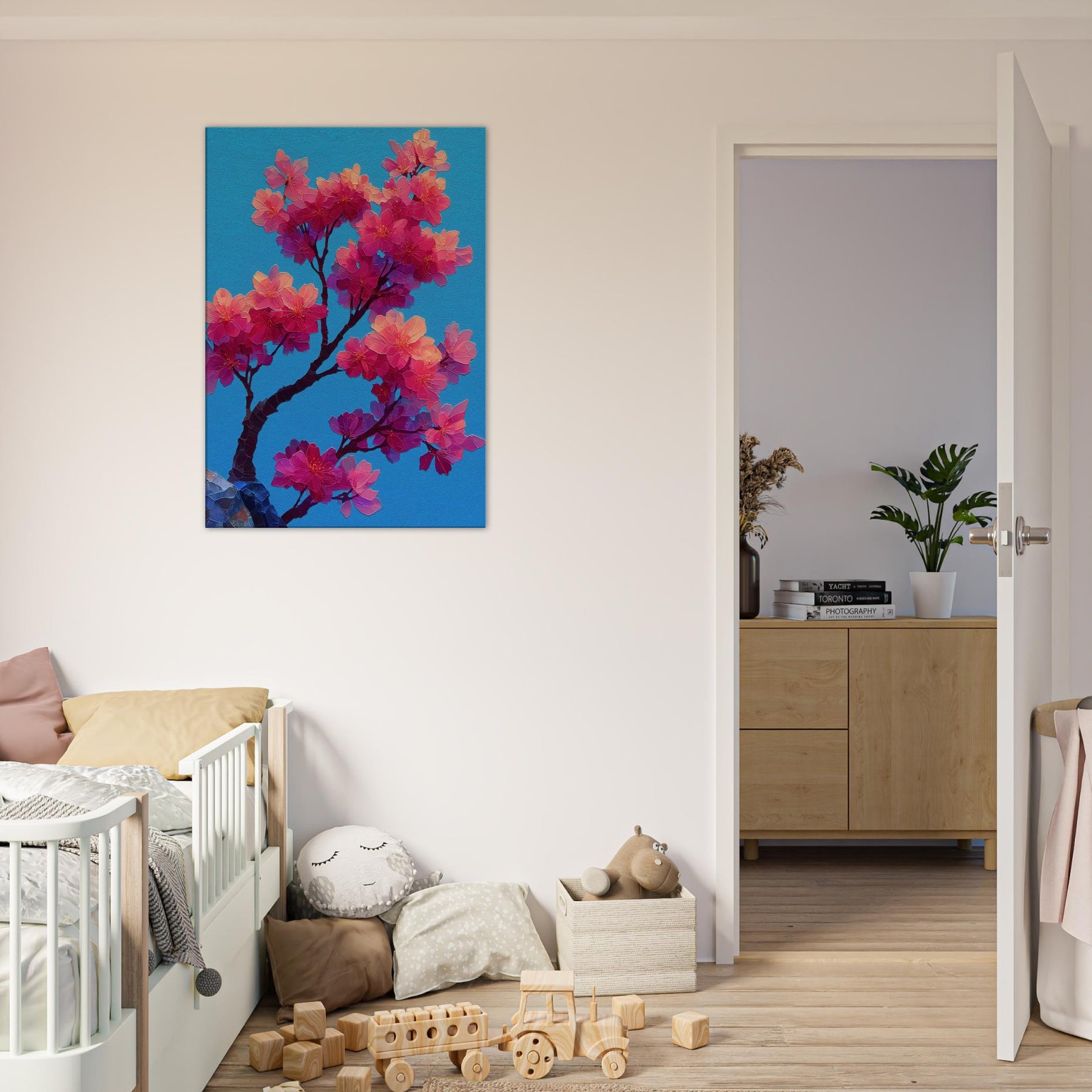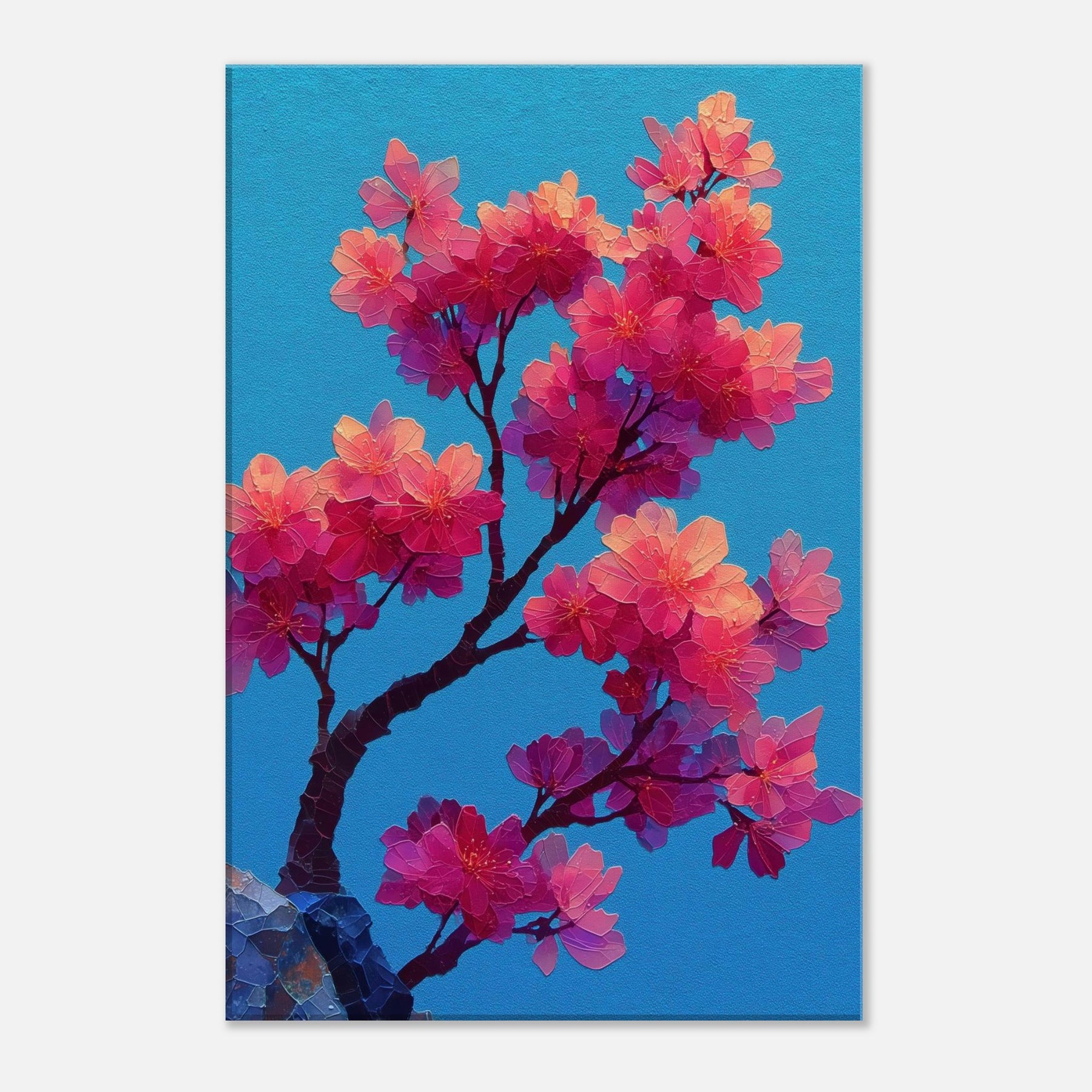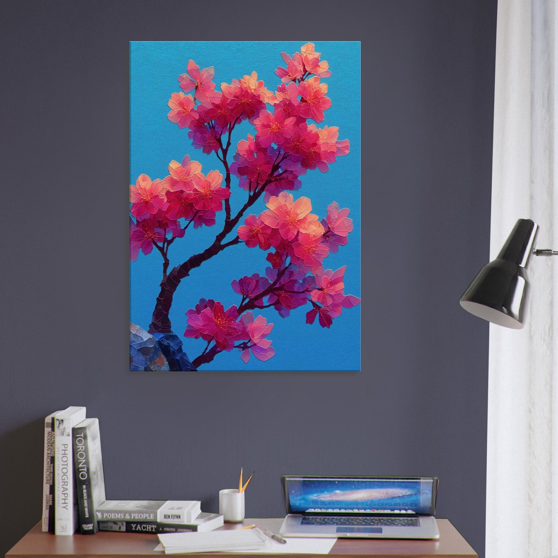 Embrace the Sakura Branch in a celebration of color and form. This abstract composition threads luminous pink blossoms along a deep blue canvas, where each petal appears to catch the light and glow. The dark, sculptural branches ground the piece, giving space to breathe and wonder. The atmosphere feels sun washed and serene, offering a focal calm to living rooms, bedrooms, or entryways. A subtle tension between warmth and shade invites longer look, changing with the light and becoming a daily, intimate moment of nature indoors.