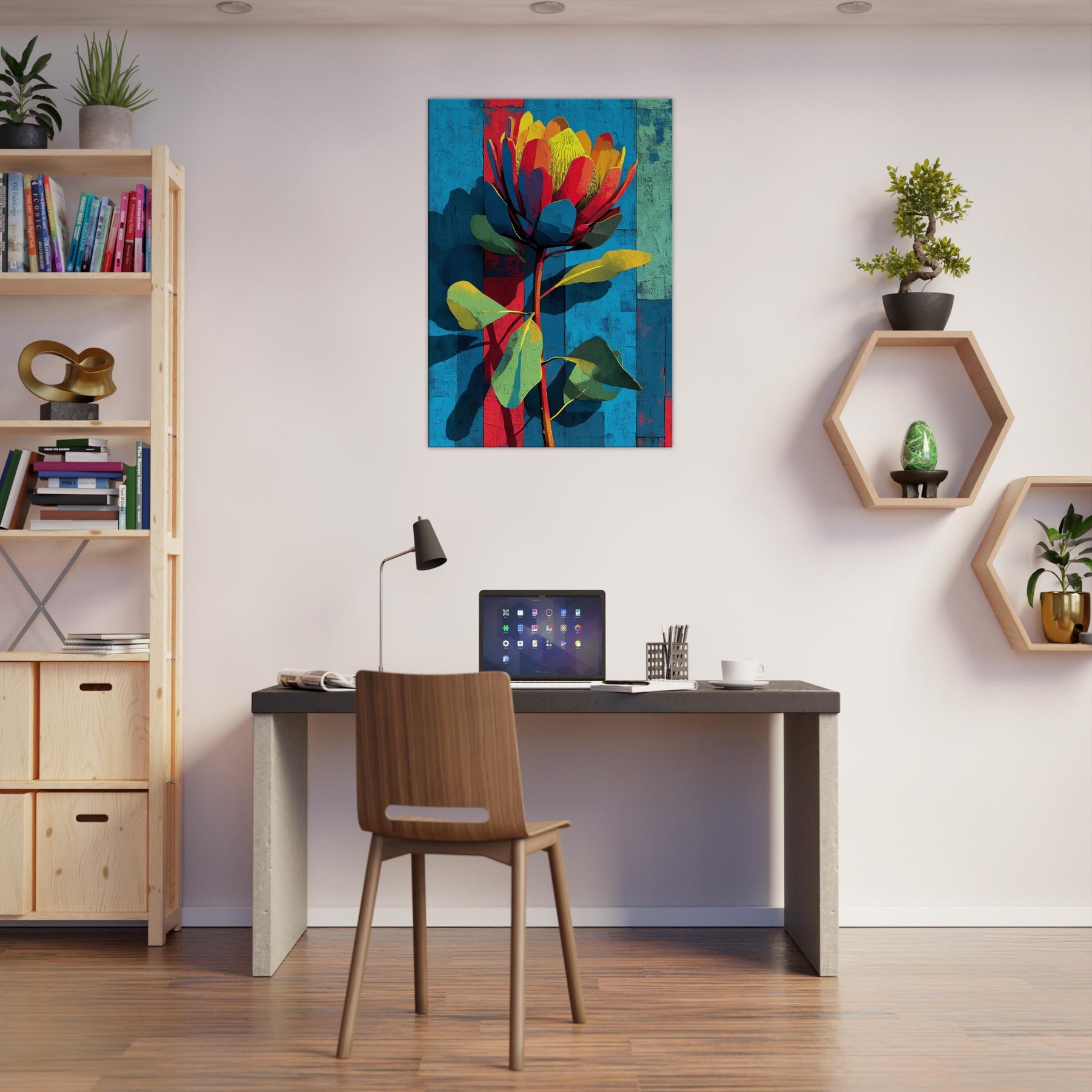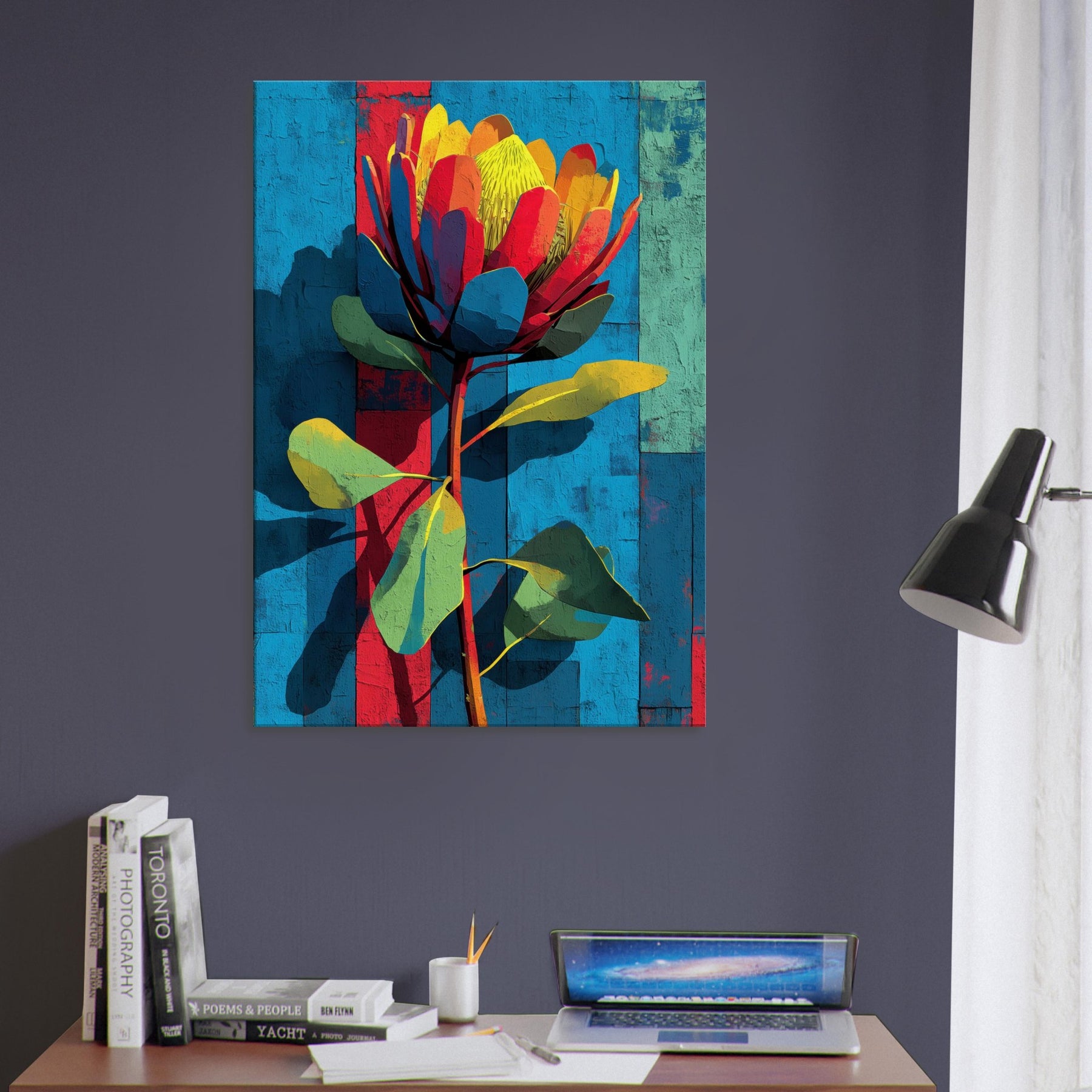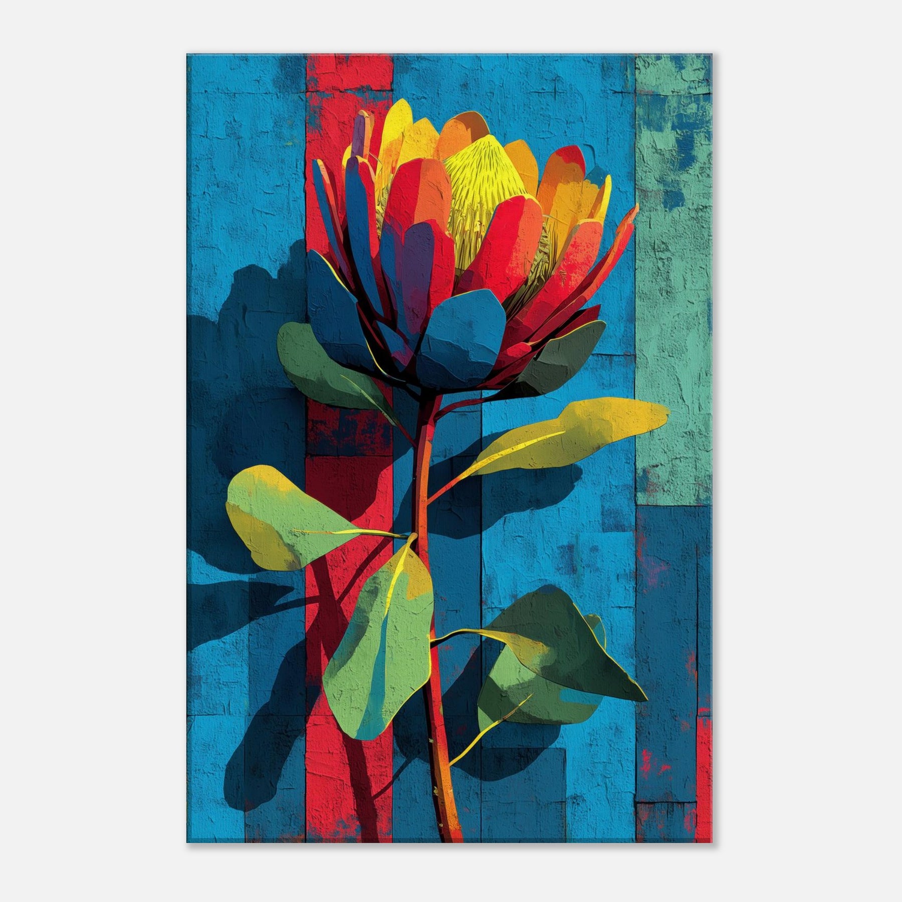 Protea rises in a constellation of color against a sun warmed, textured backdrop. This abstract blossom feels both tropical and architectural, its petals a mosaic of coral, teal, and sunlit yellow that catches and refracts the room's light. The piece breathes movement and quiet confidence, turning a sofa or entryway into a living moment of nature's boldness. It invites touch and conversation, transforming walls into a gallery of warm, modern botanical allure.
