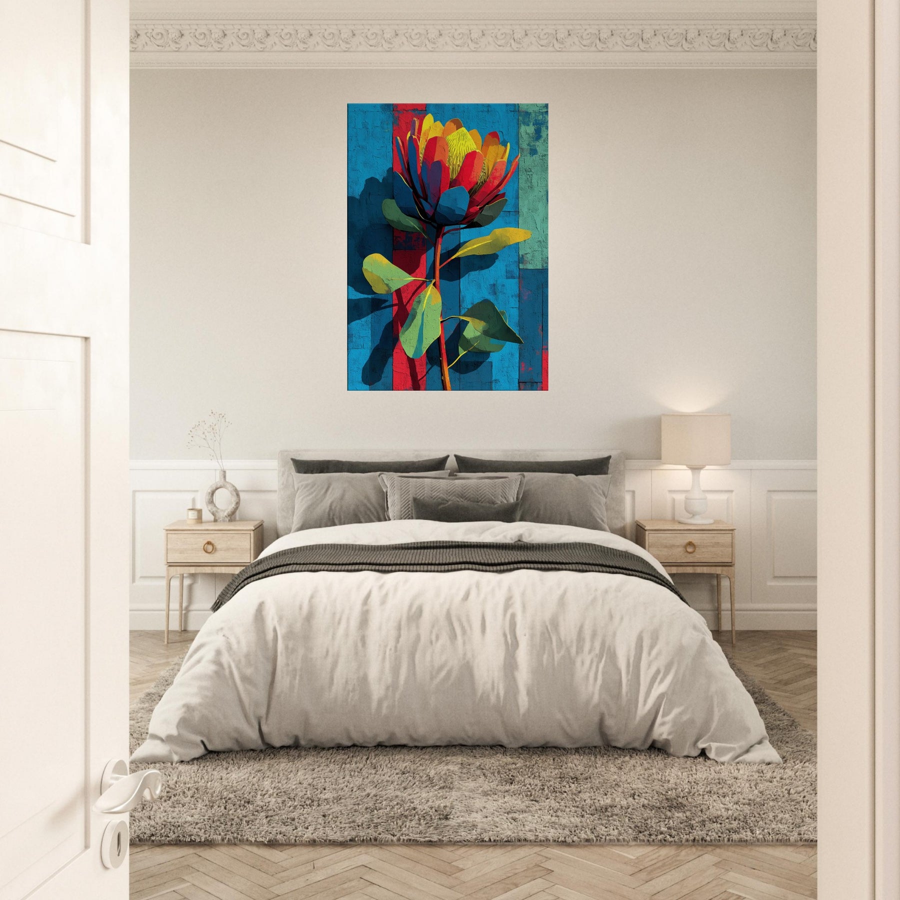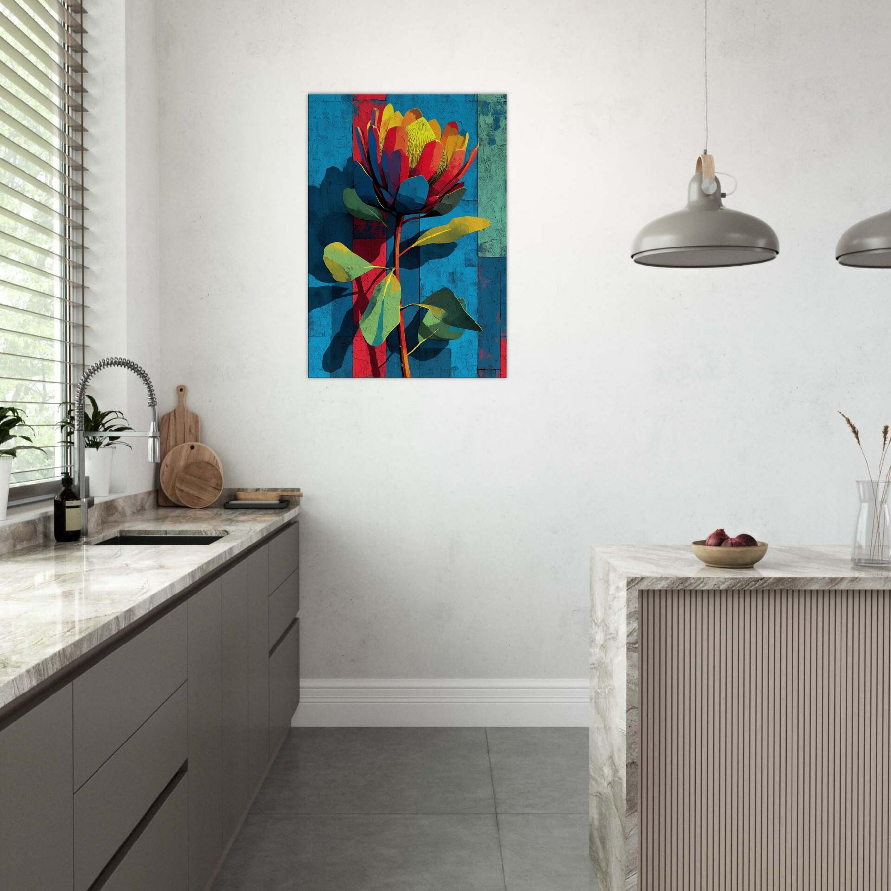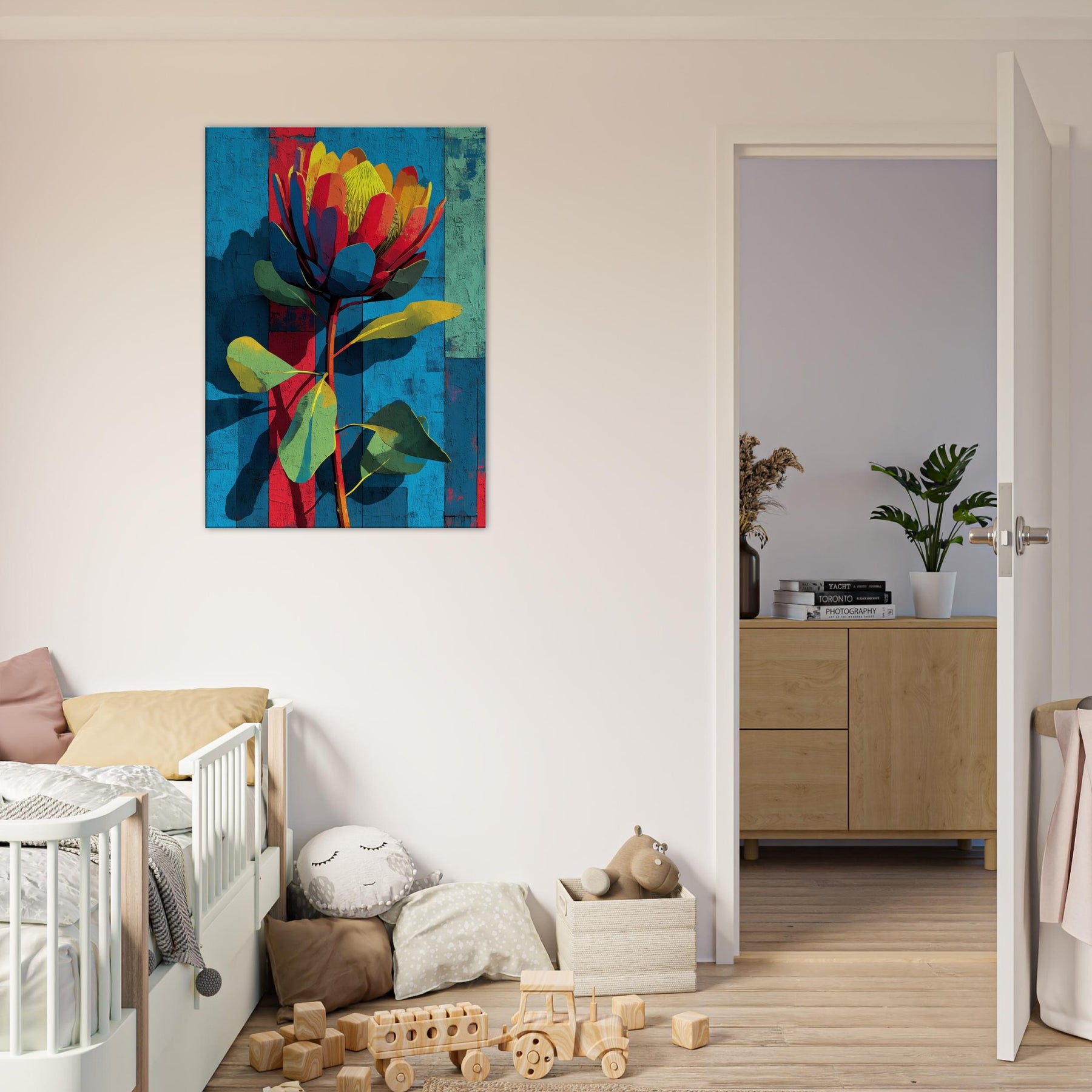 Protea rises in a constellation of color against a sun warmed, textured backdrop. This abstract blossom feels both tropical and architectural, its petals a mosaic of coral, teal, and sunlit yellow that catches and refracts the room's light. The piece breathes movement and quiet confidence, turning a sofa or entryway into a living moment of nature's boldness. It invites touch and conversation, transforming walls into a gallery of warm, modern botanical allure.