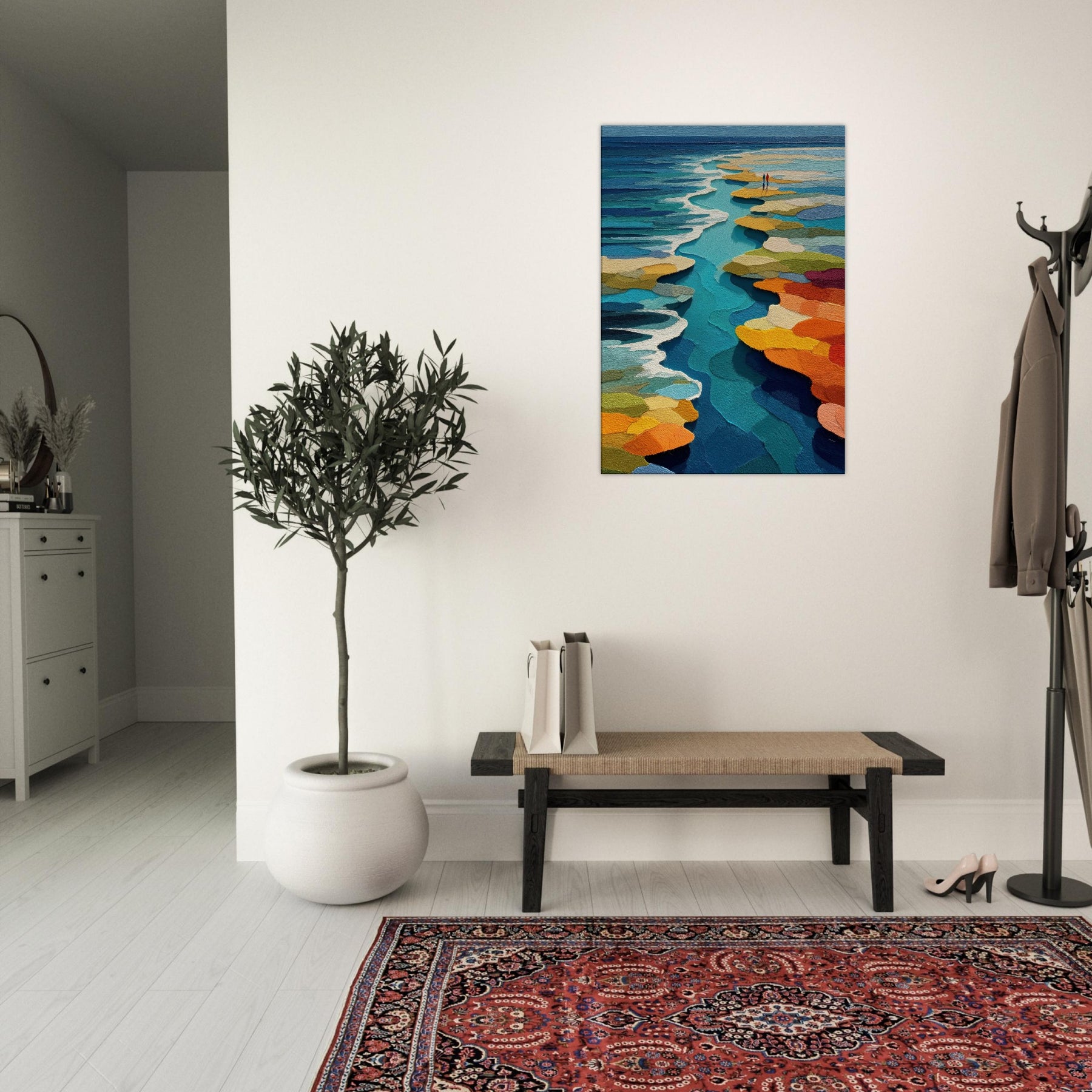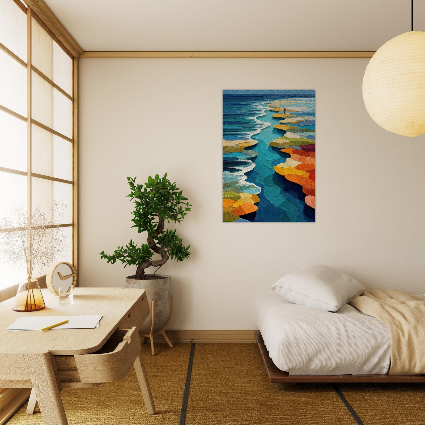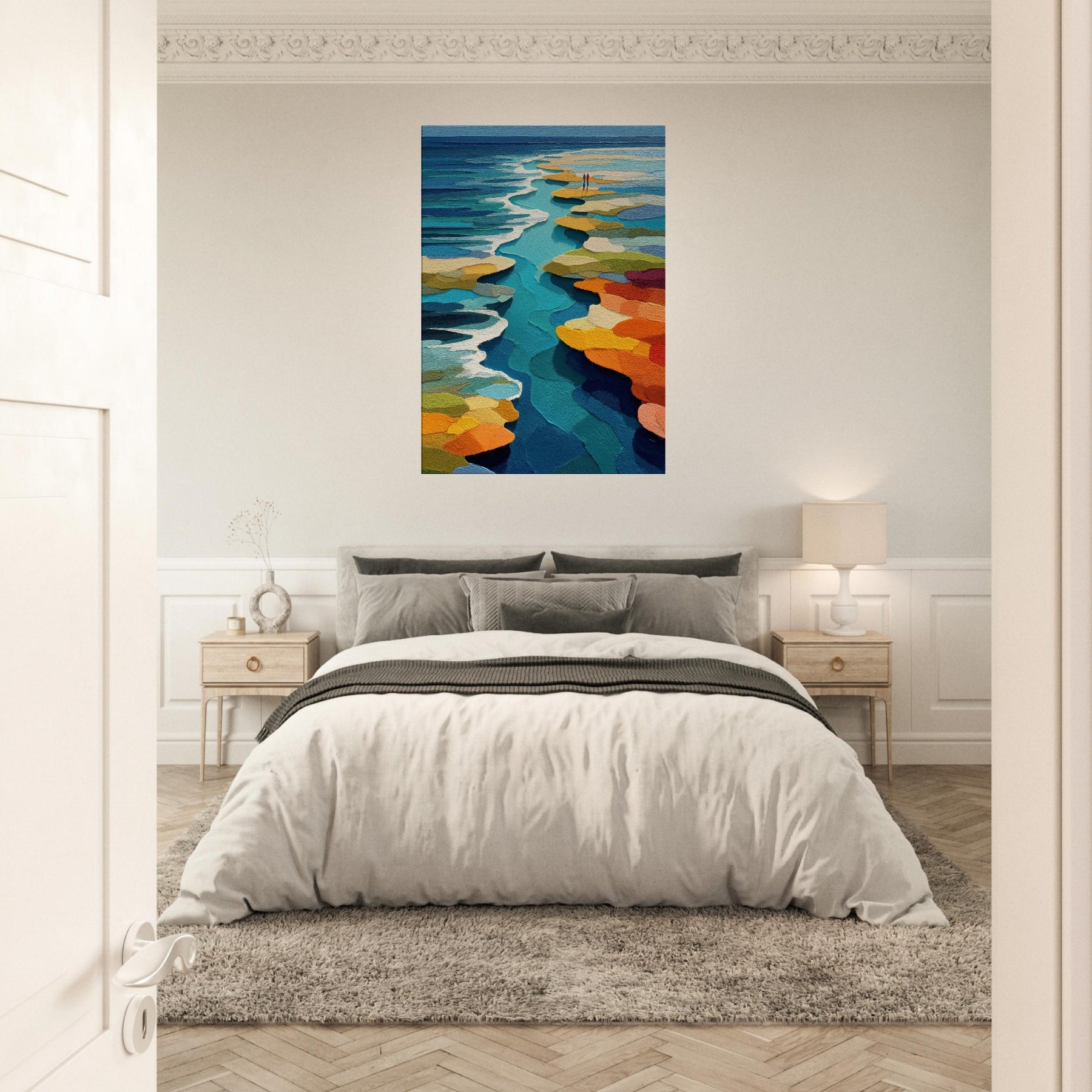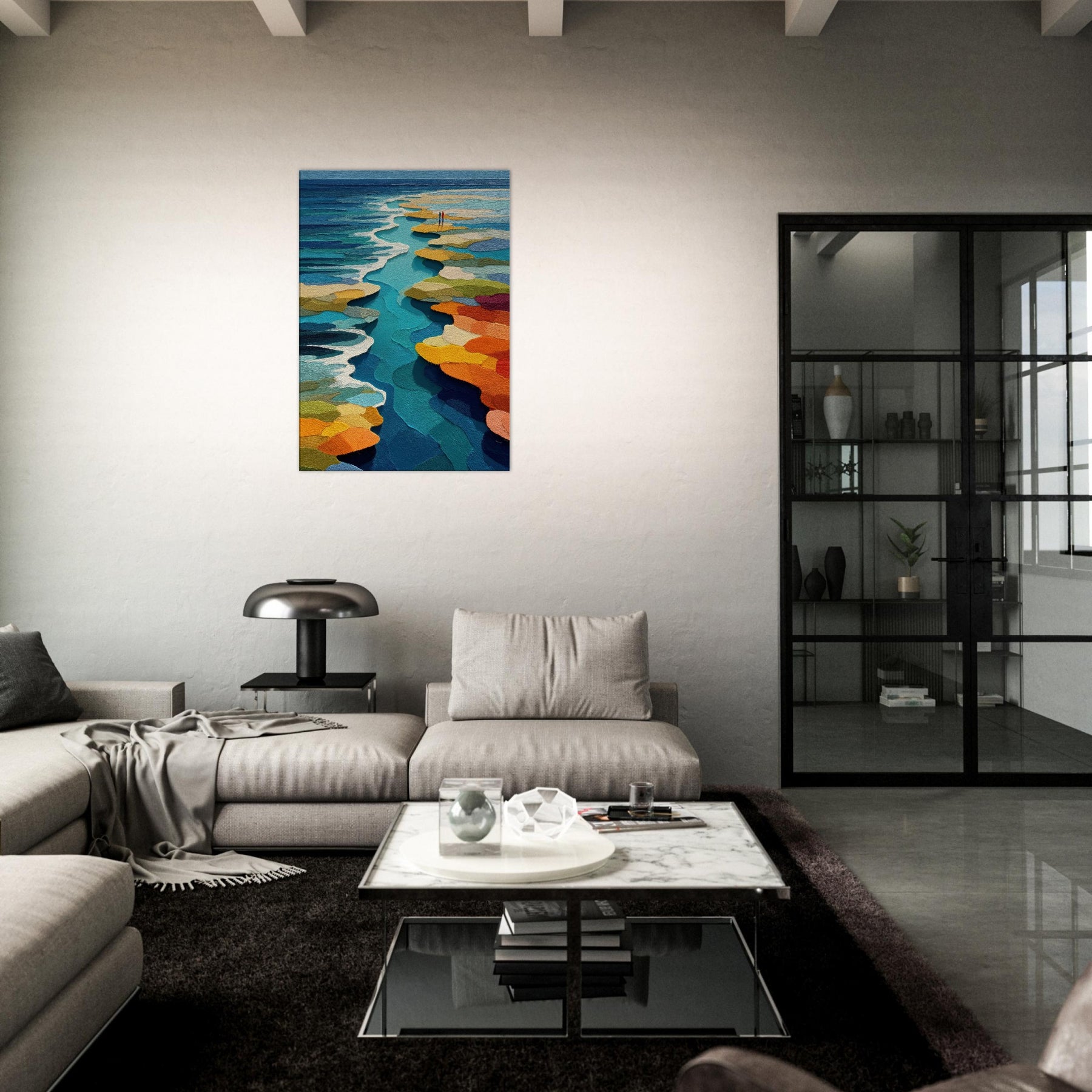 Let the Beach breathe into your space. This composition dissolves the shore into luminous, layered fields of color turquoise currents, sun bleached sands, and coral hued landmasses that hum with warmth. The rhythm of tides and contemporary shapes evokes salt air, distant horizons, and a quiet sense of escape, inviting calm mornings and lingering evenings. Placed above a sofa or in a bedroom, it becomes a soft horizon you can step toward an intimate mood setter that elevates light, texture, and conversation.