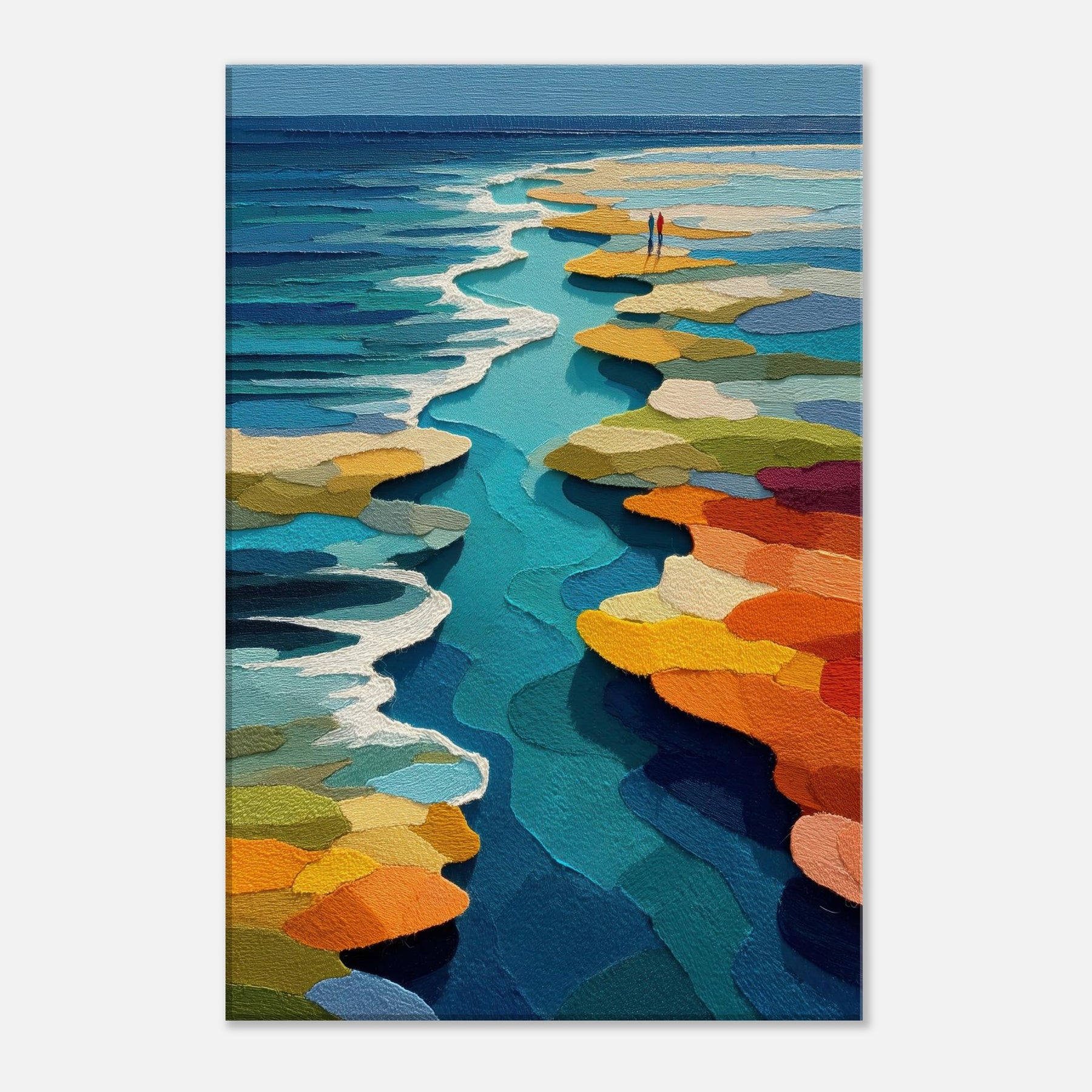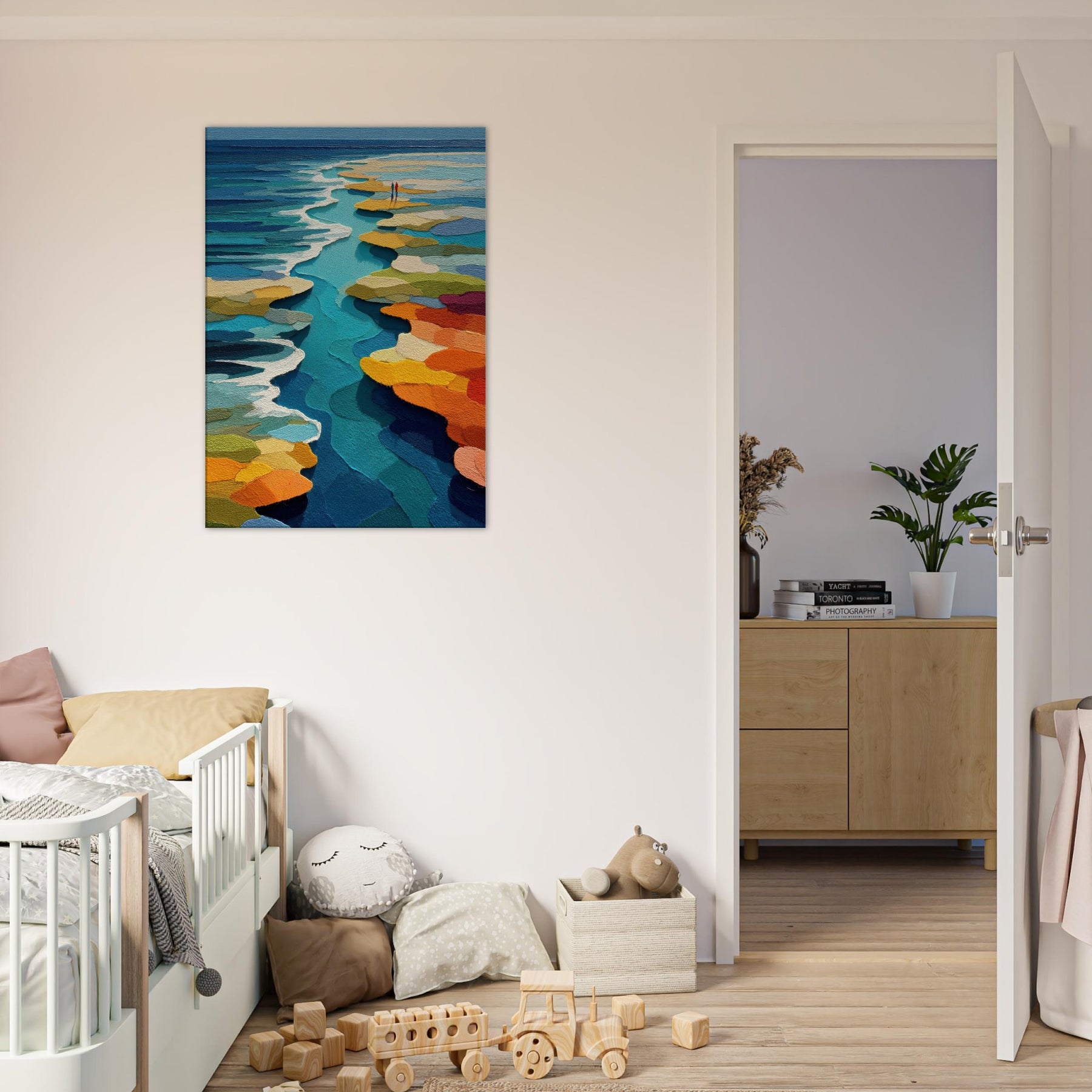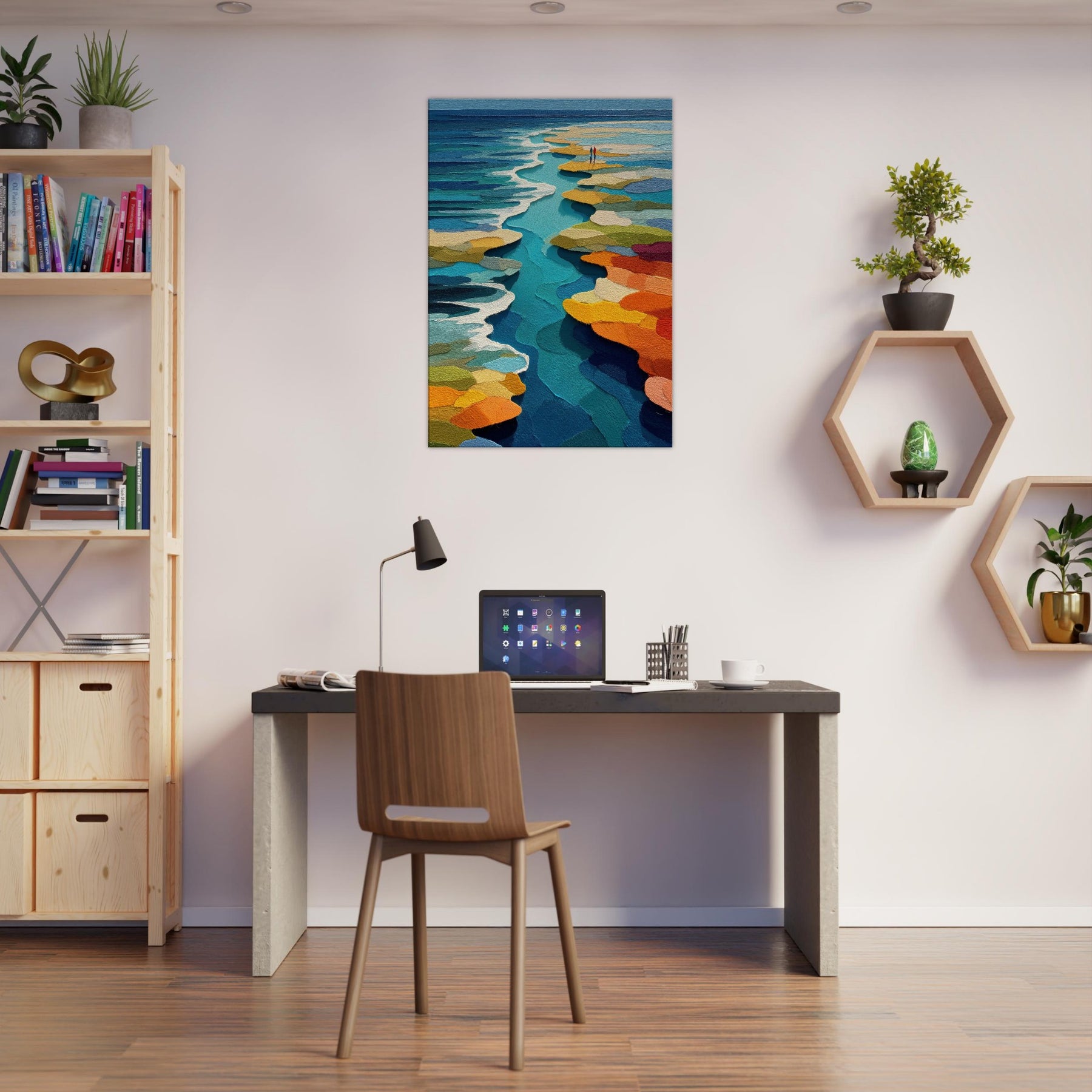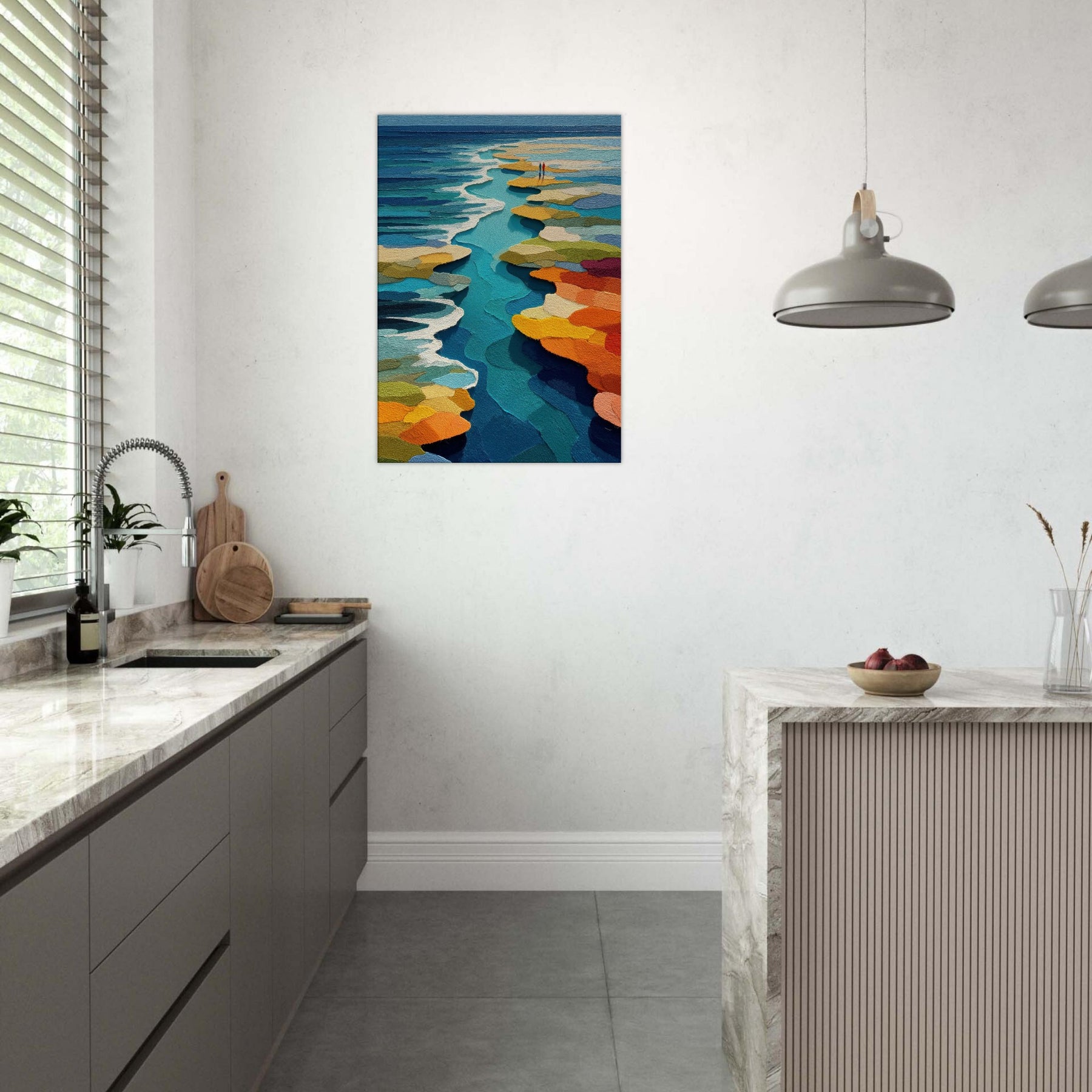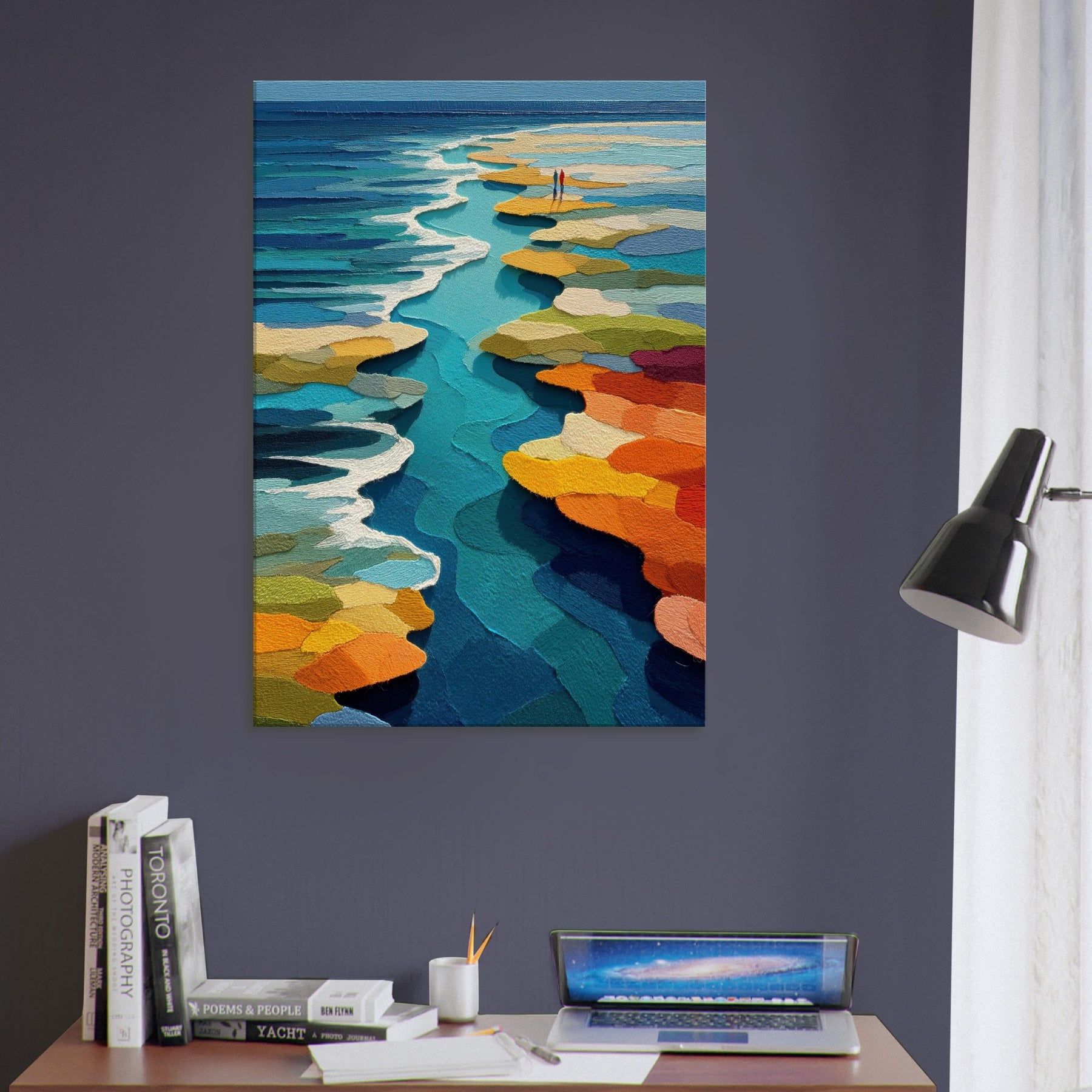 Let the Beach breathe into your space. This composition dissolves the shore into luminous, layered fields of color turquoise currents, sun bleached sands, and coral hued landmasses that hum with warmth. The rhythm of tides and contemporary shapes evokes salt air, distant horizons, and a quiet sense of escape, inviting calm mornings and lingering evenings. Placed above a sofa or in a bedroom, it becomes a soft horizon you can step toward an intimate mood setter that elevates light, texture, and conversation.
