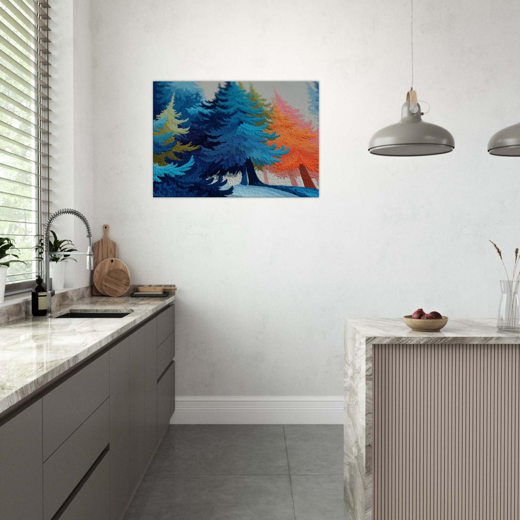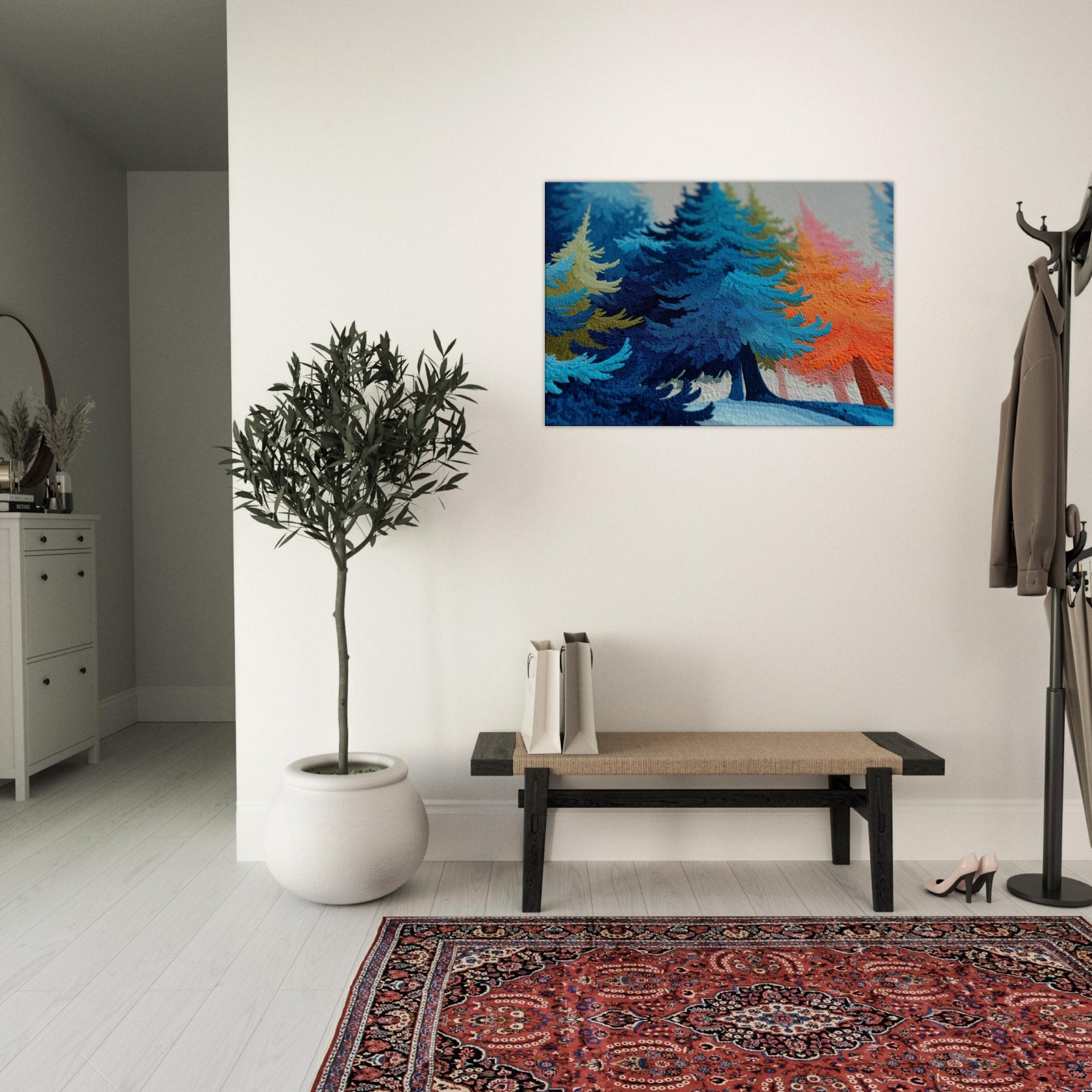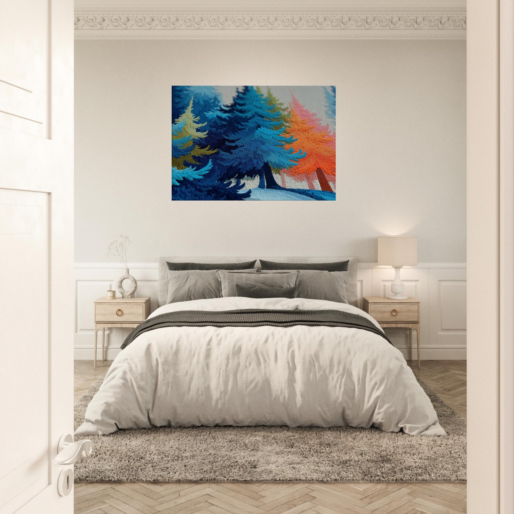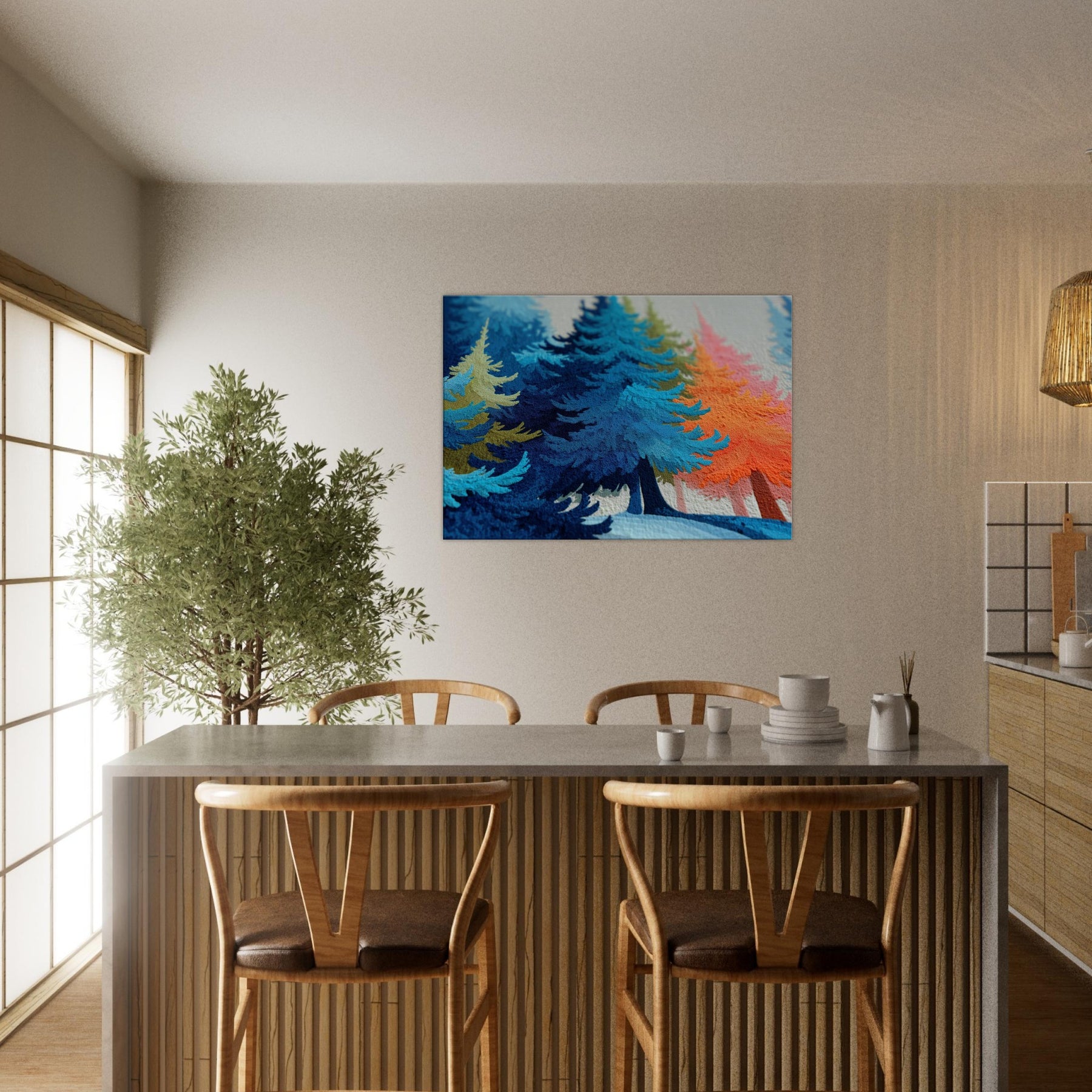 Snowy Forest unfurls in a quiet chorus of color, where every branch becomes a painterly whisper against soft winter light. The abstract composition wraps a living room in a cool, contemplative atmosphere crisp blues, emerald greens, and radiant apricot that glow like sunset on fresh powder. Hang it above a sofa or console to invite calm, spark conversation, and make the room feel larger, brighter, and more alive with the hush of Snowy Forest come to life.