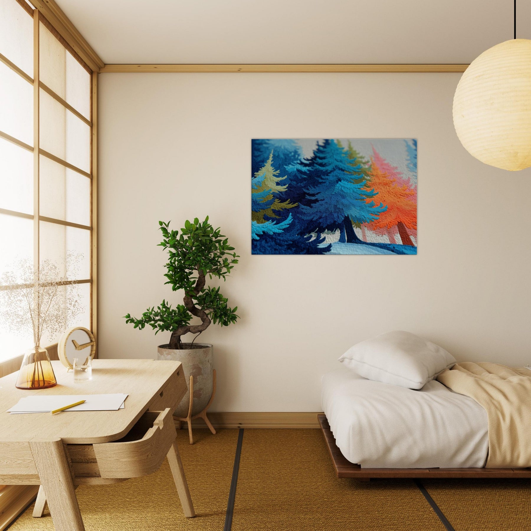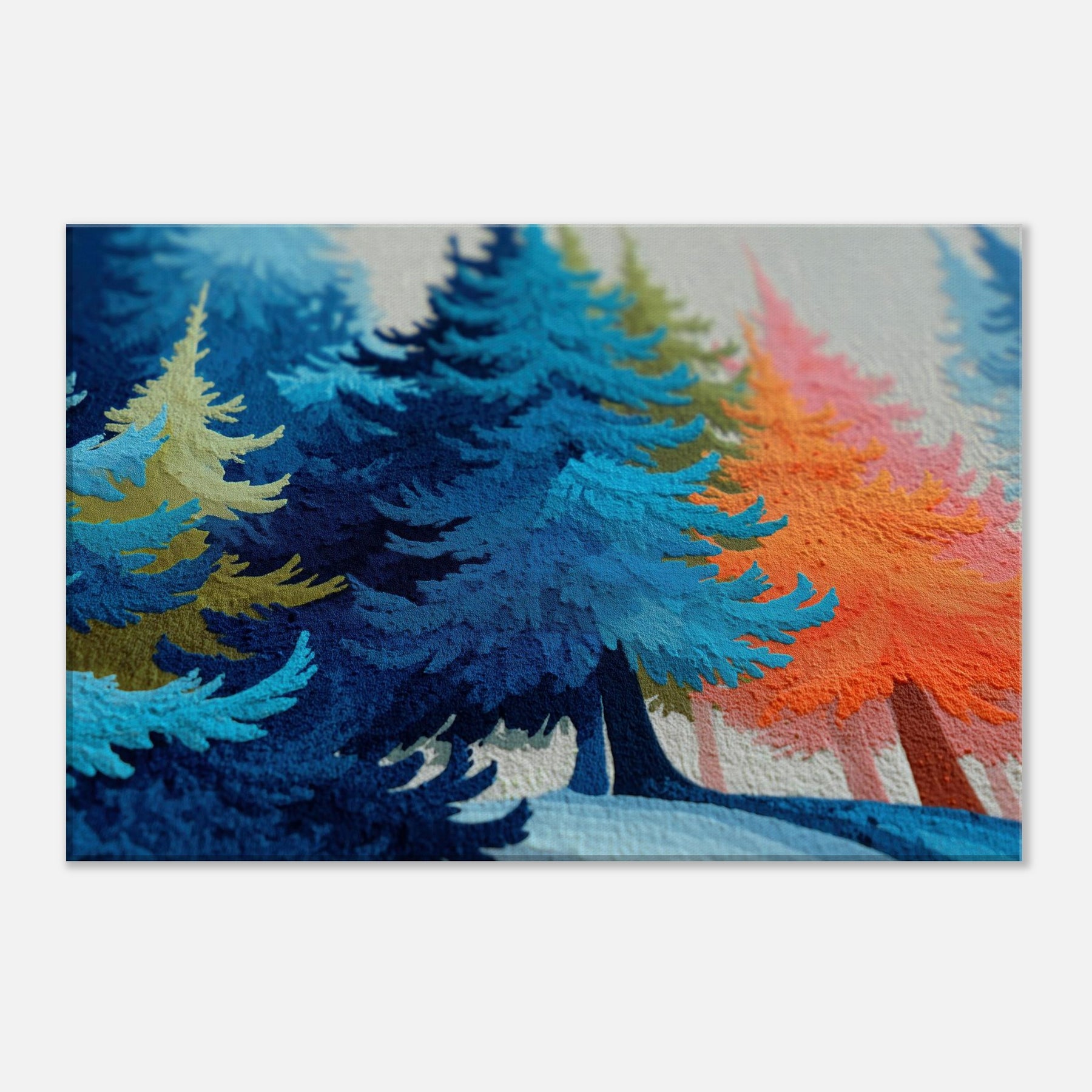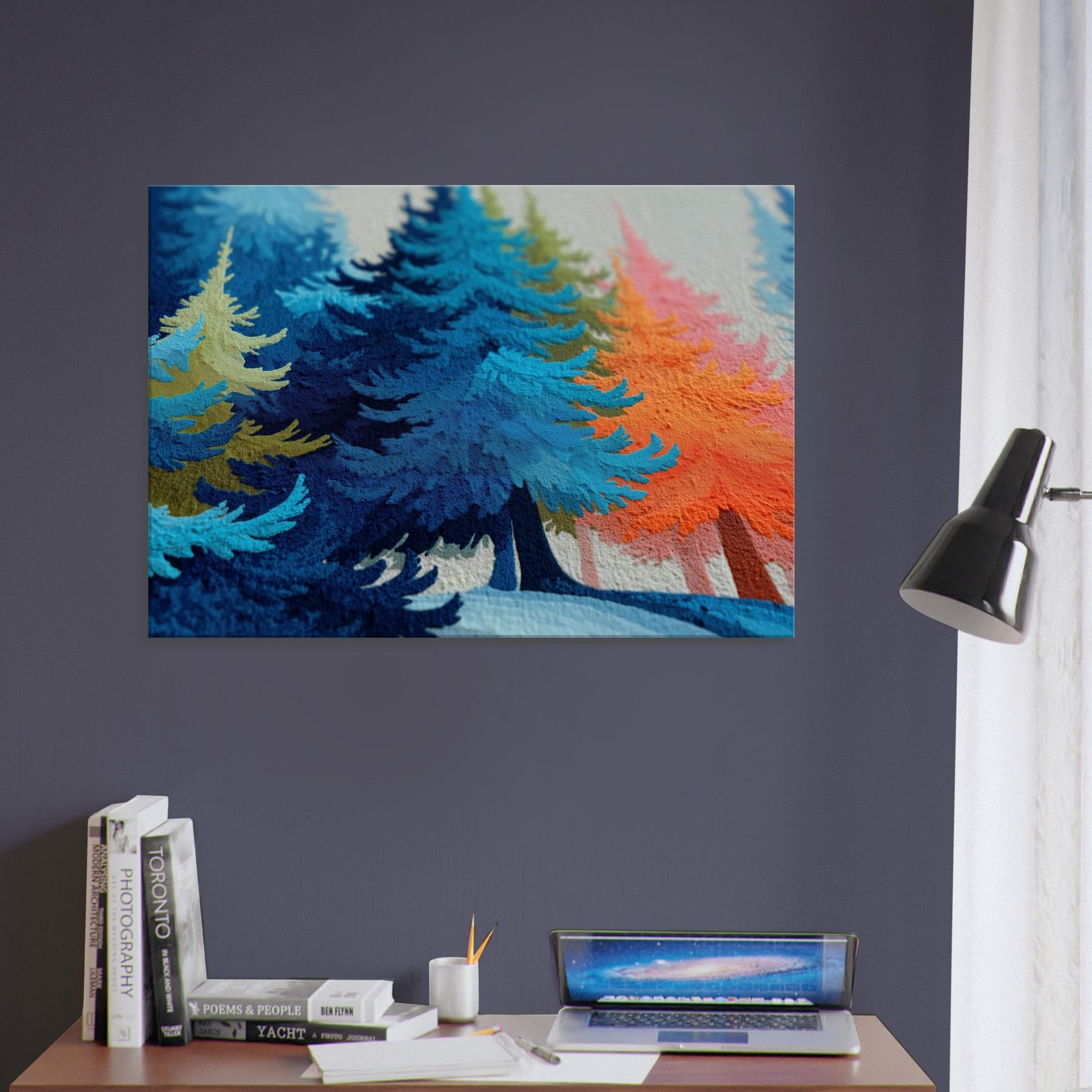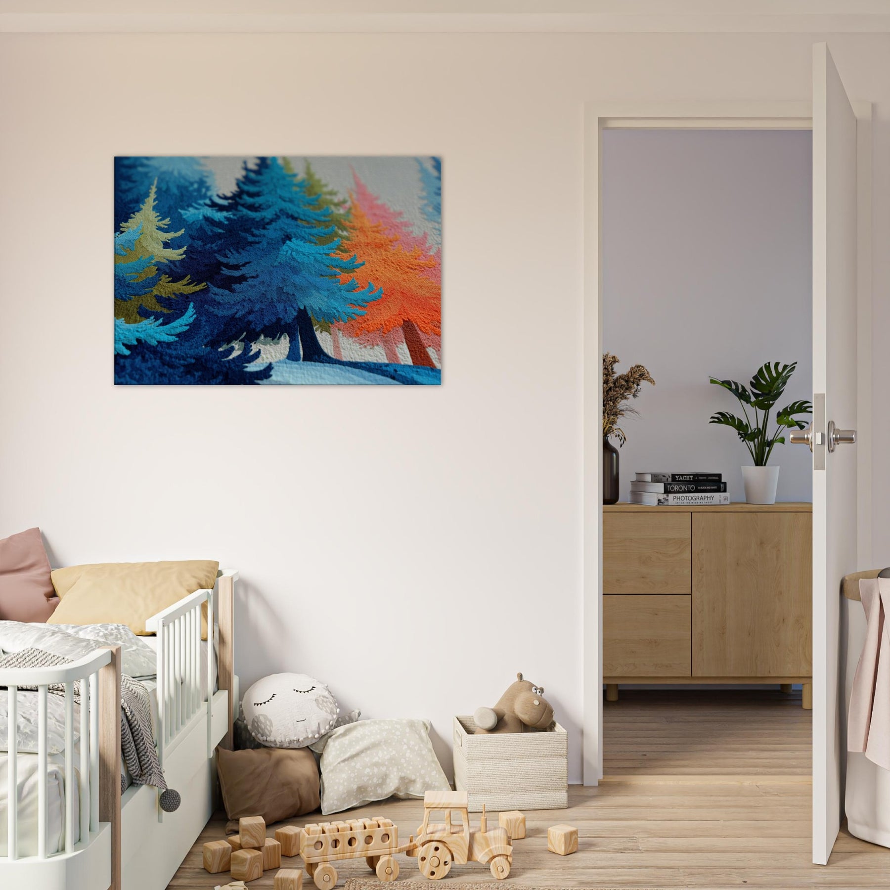 Snowy Forest unfurls in a quiet chorus of color, where every branch becomes a painterly whisper against soft winter light. The abstract composition wraps a living room in a cool, contemplative atmosphere crisp blues, emerald greens, and radiant apricot that glow like sunset on fresh powder. Hang it above a sofa or console to invite calm, spark conversation, and make the room feel larger, brighter, and more alive with the hush of Snowy Forest come to life.