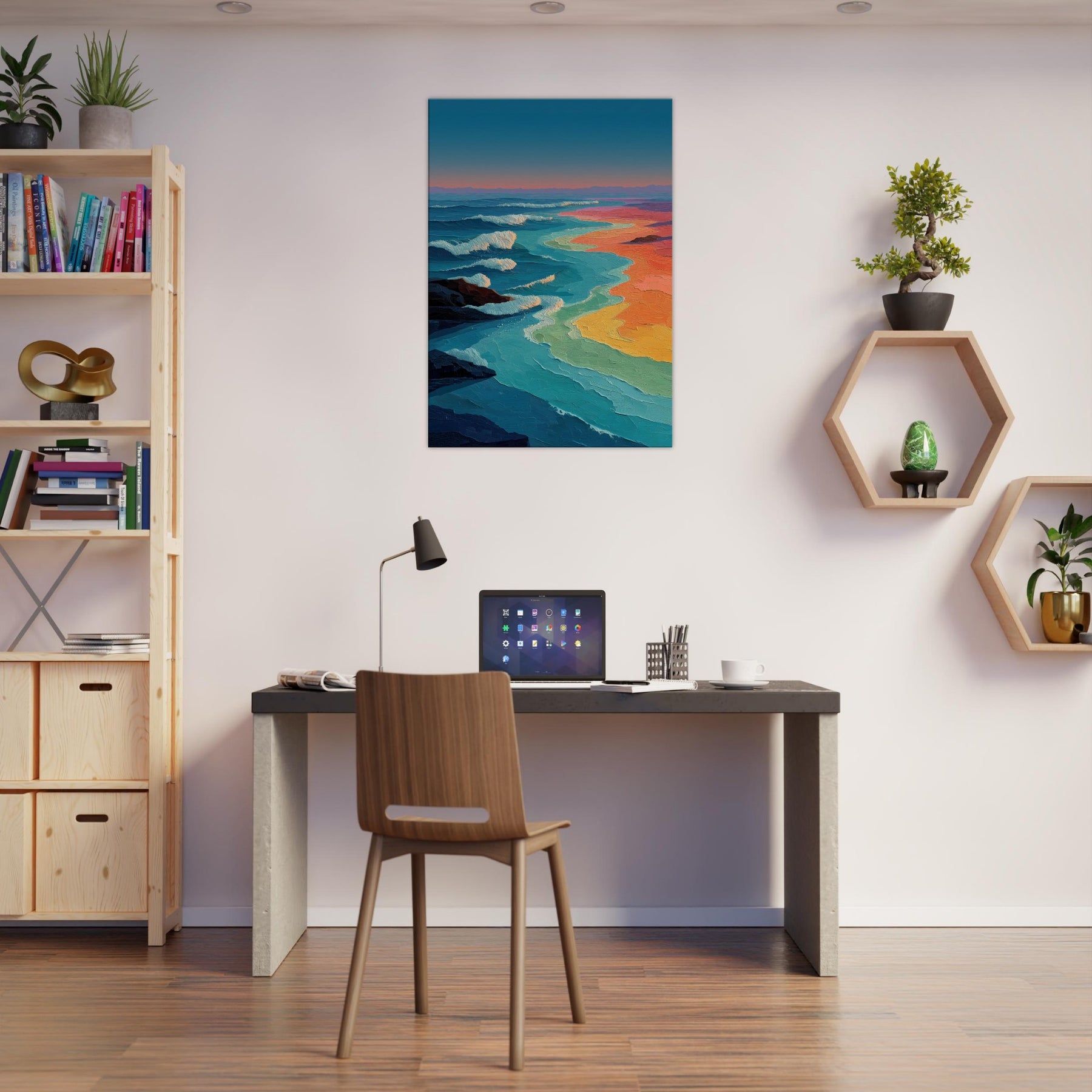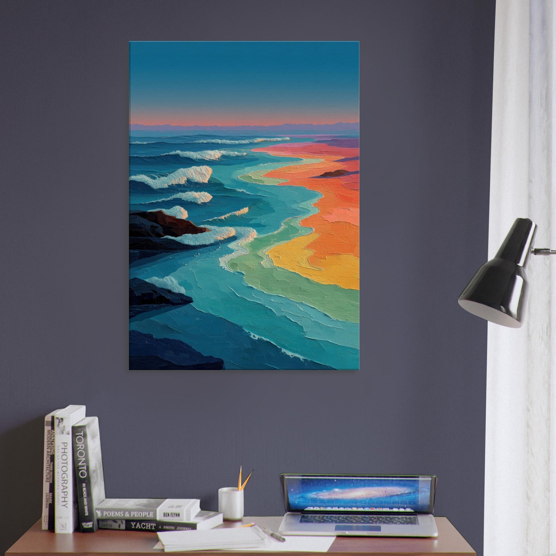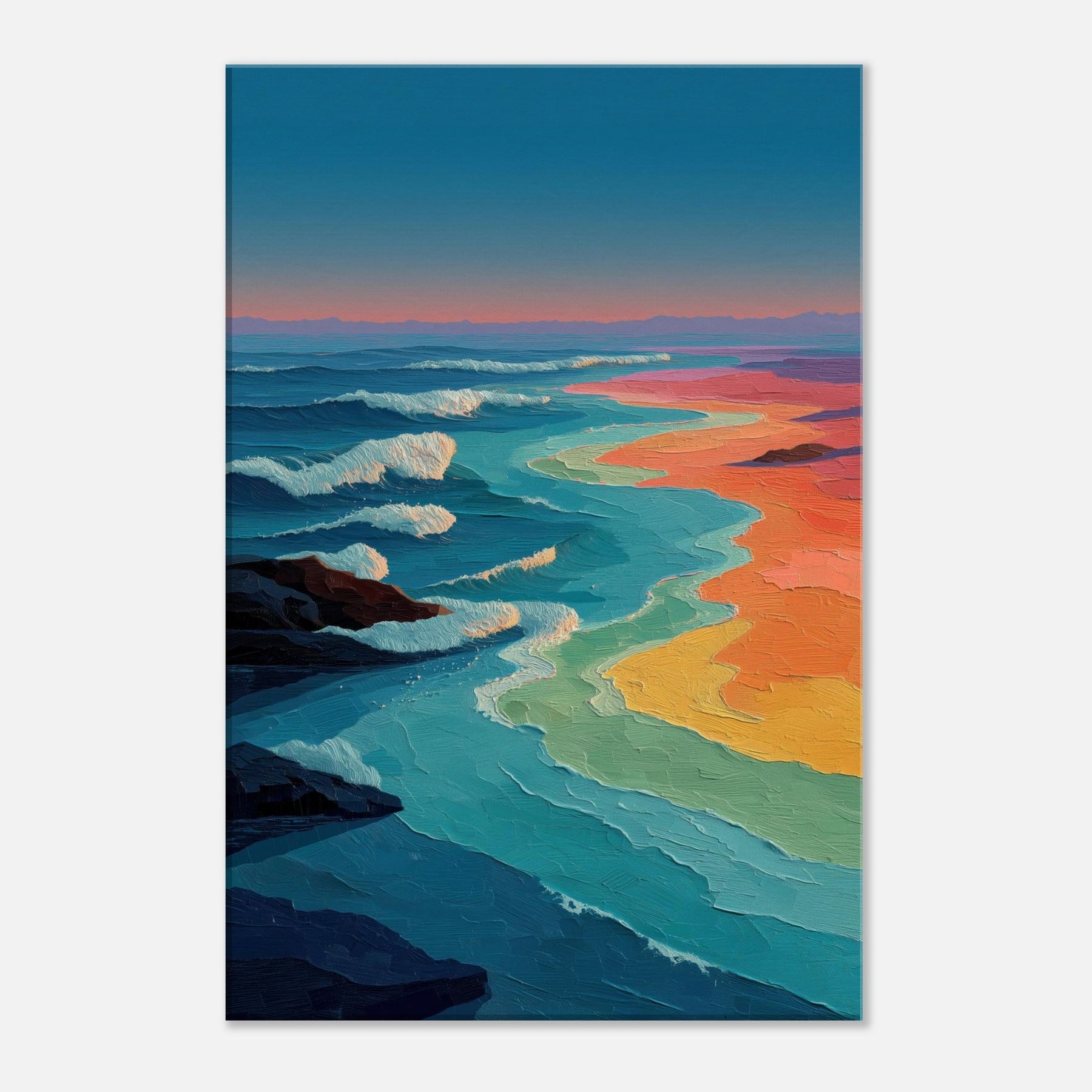 Ocean Waves unfolds as a luminous shoreline of color, where teal crests meet ribbons of coral, gold, and lavender. The abstract brushwork invites the eye to drift, as if listening to a distant shoreline while the room breathes with a tranquil tide. This piece infuses a living space with kinetic calm an ever changing horizon that anchors a seating arrangement, brightens a neutral wall, and heightens sensory mood in the evening. It pairs airy blues with sunset warmth, transforming a lounge or study into a sanctuary of movement and memory.