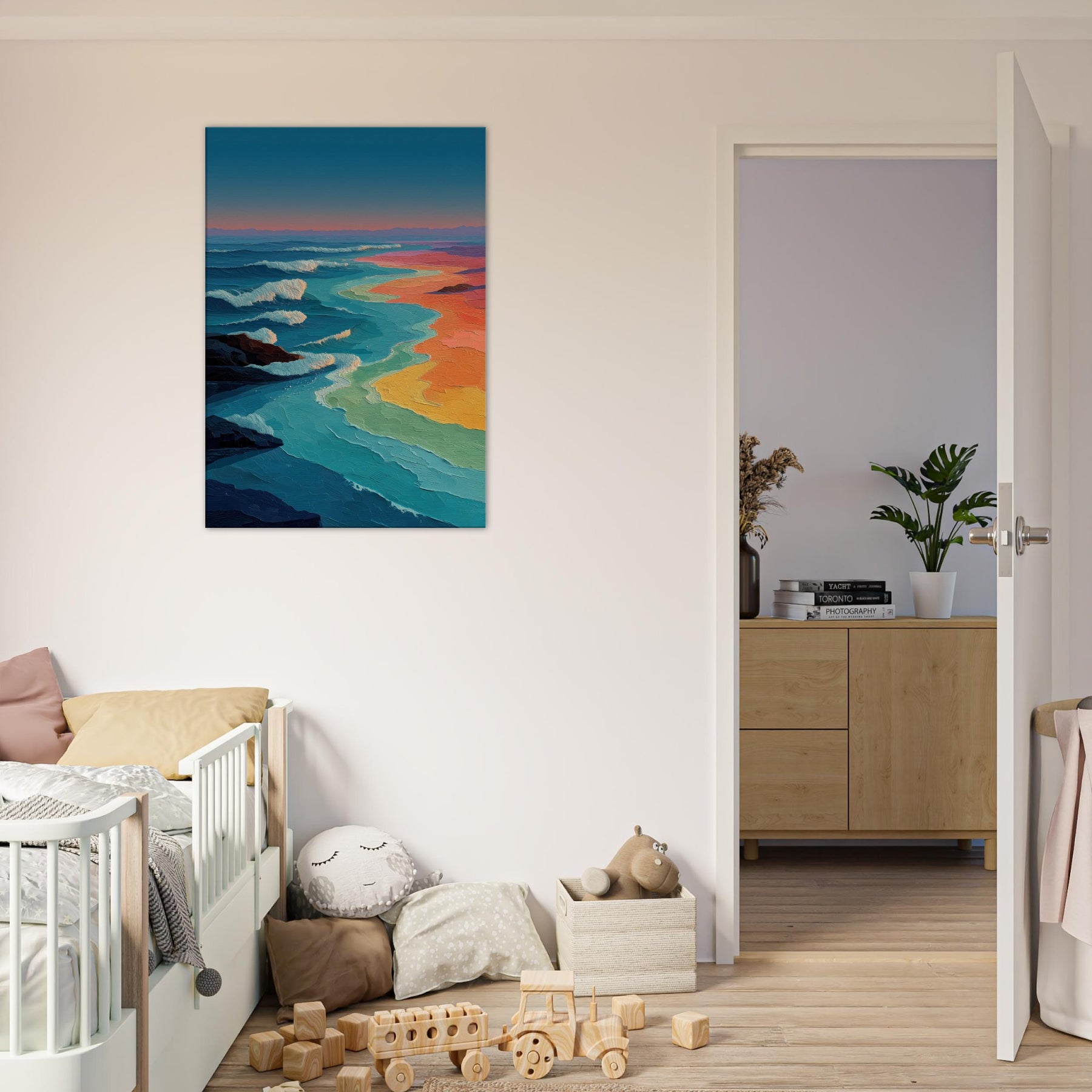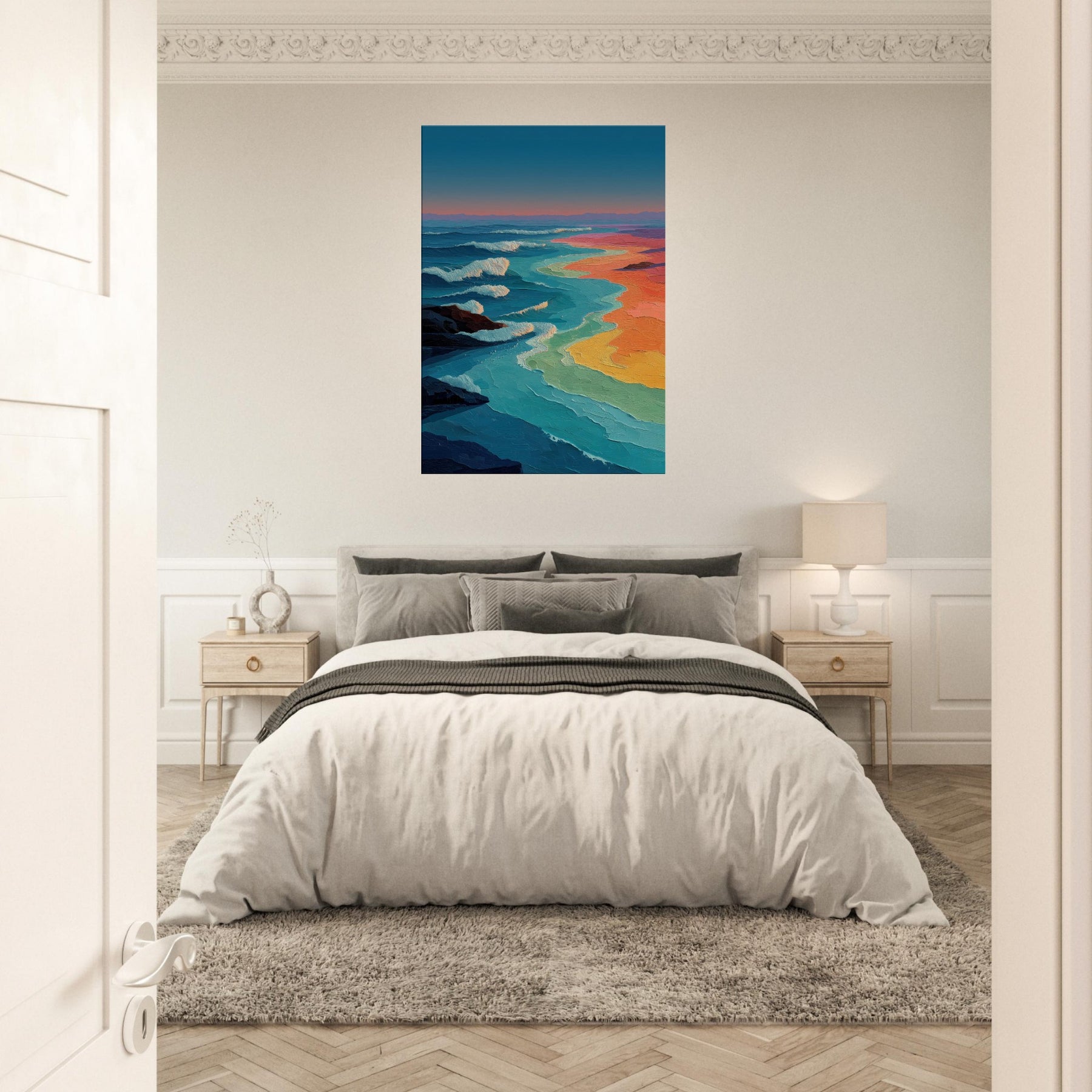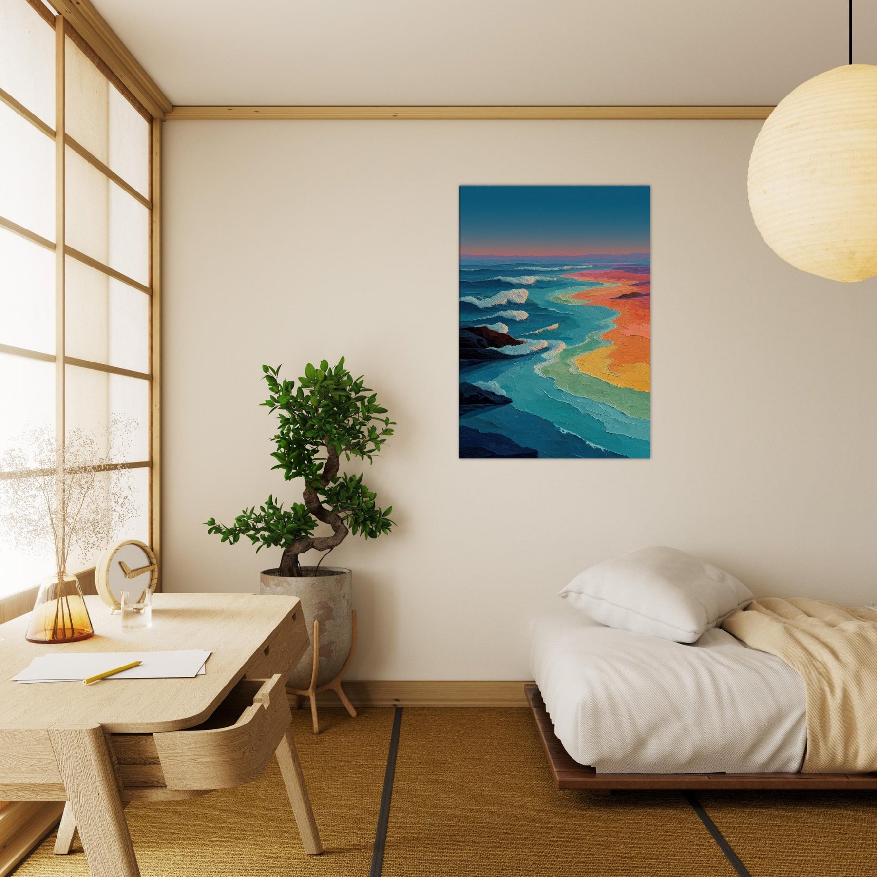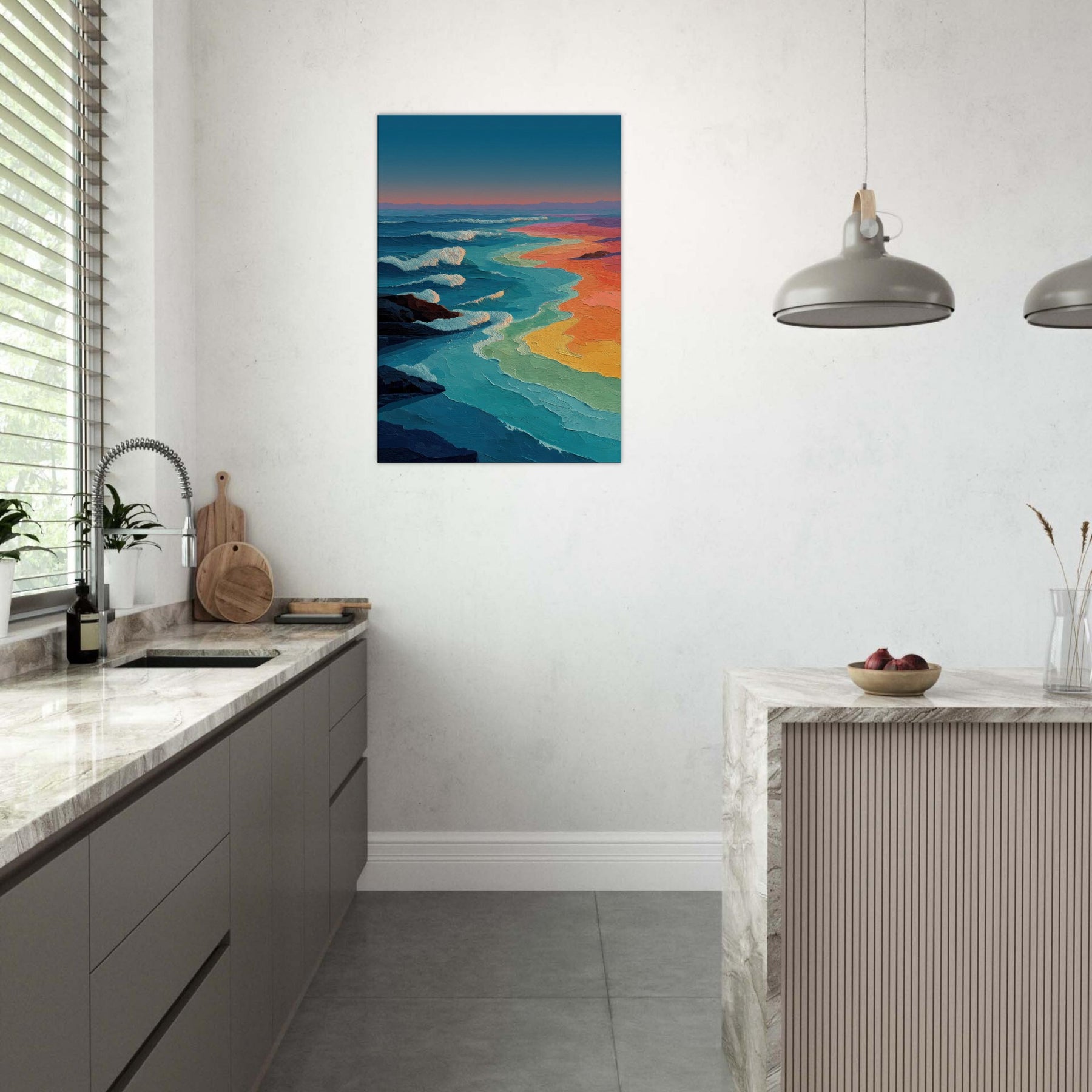 Ocean Waves unfolds as a luminous shoreline of color, where teal crests meet ribbons of coral, gold, and lavender. The abstract brushwork invites the eye to drift, as if listening to a distant shoreline while the room breathes with a tranquil tide. This piece infuses a living space with kinetic calm an ever changing horizon that anchors a seating arrangement, brightens a neutral wall, and heightens sensory mood in the evening. It pairs airy blues with sunset warmth, transforming a lounge or study into a sanctuary of movement and memory.