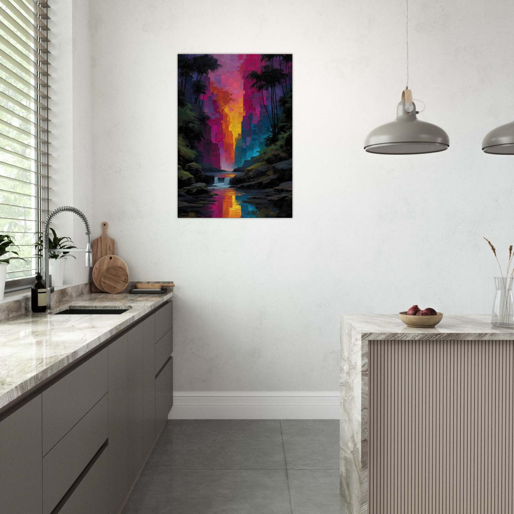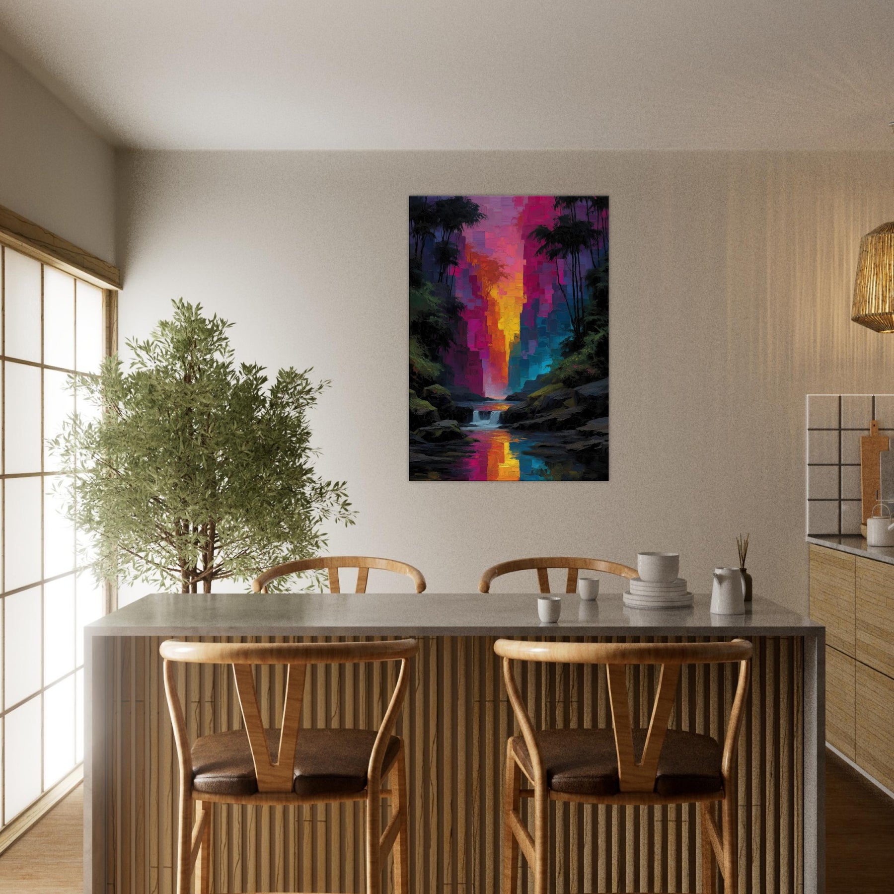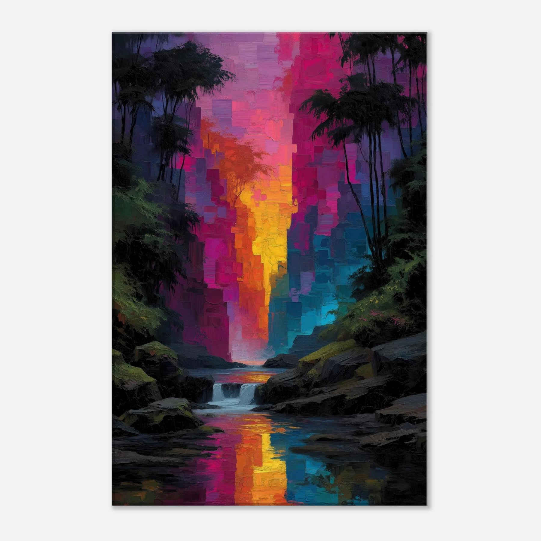 Step into a tropical rain of color where light spills through an abstract canyon and settles on your walls. This piece refracts the senses with luminous blocks that shimmer like rain kissed leaves, guiding the eye toward a river of sunset hues. The Tropical Rain subject bathes the scene in lush glow, turning a living room into a private rainforest alcove. Velvety depth and radiant reflections invite quiet, immersive moments and elevate everyday spaces with effortless elegance.