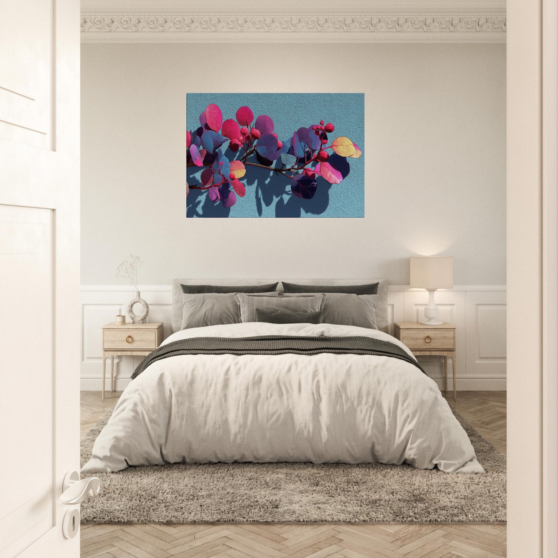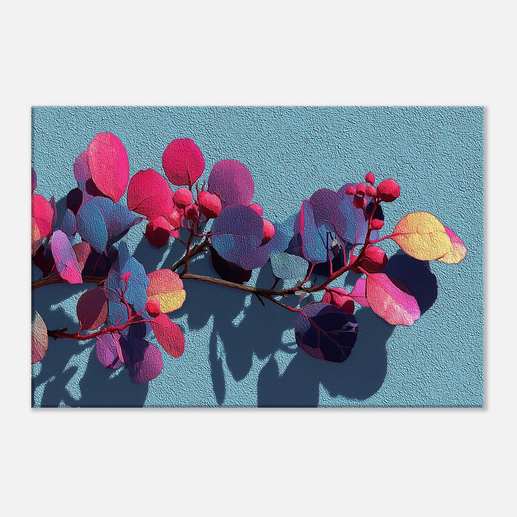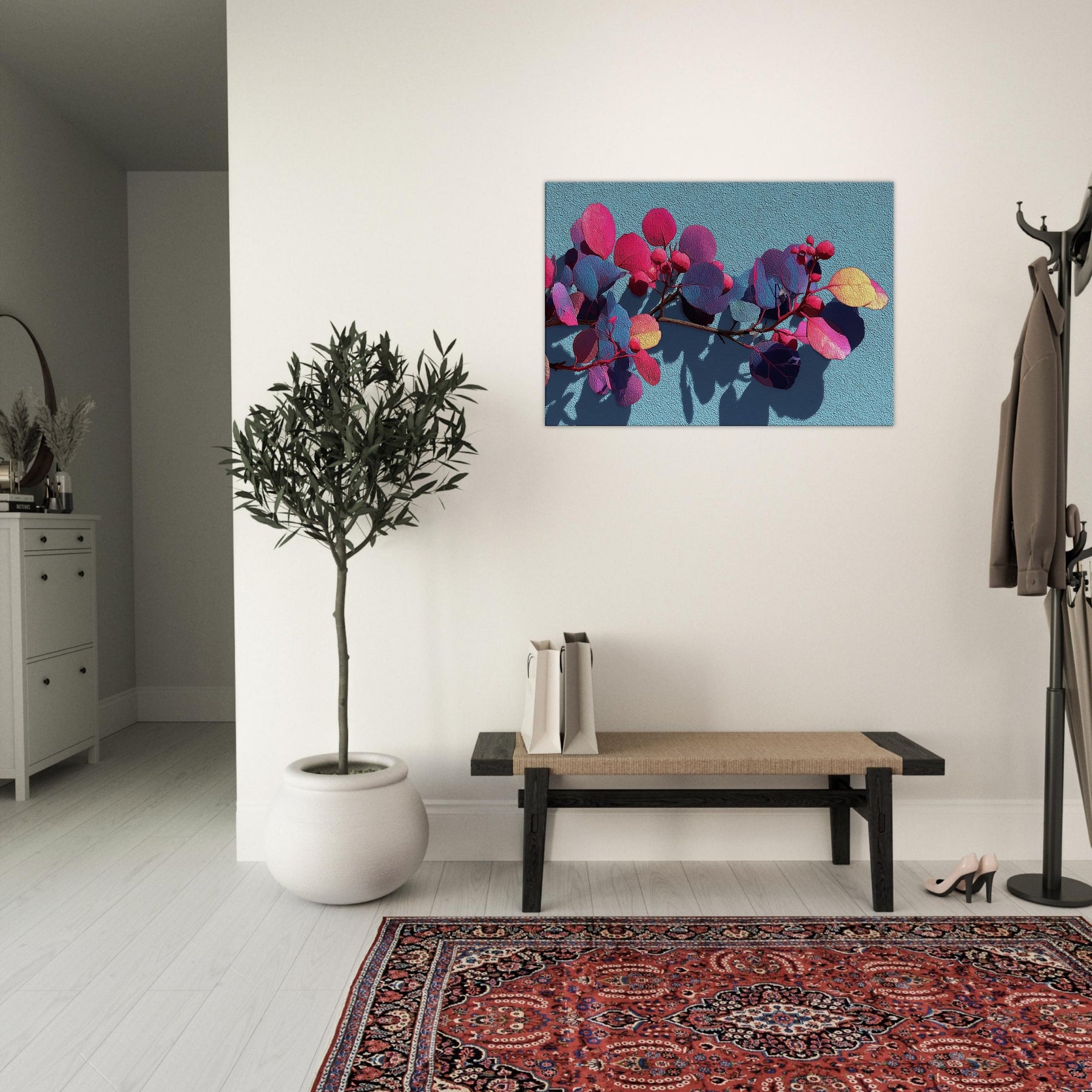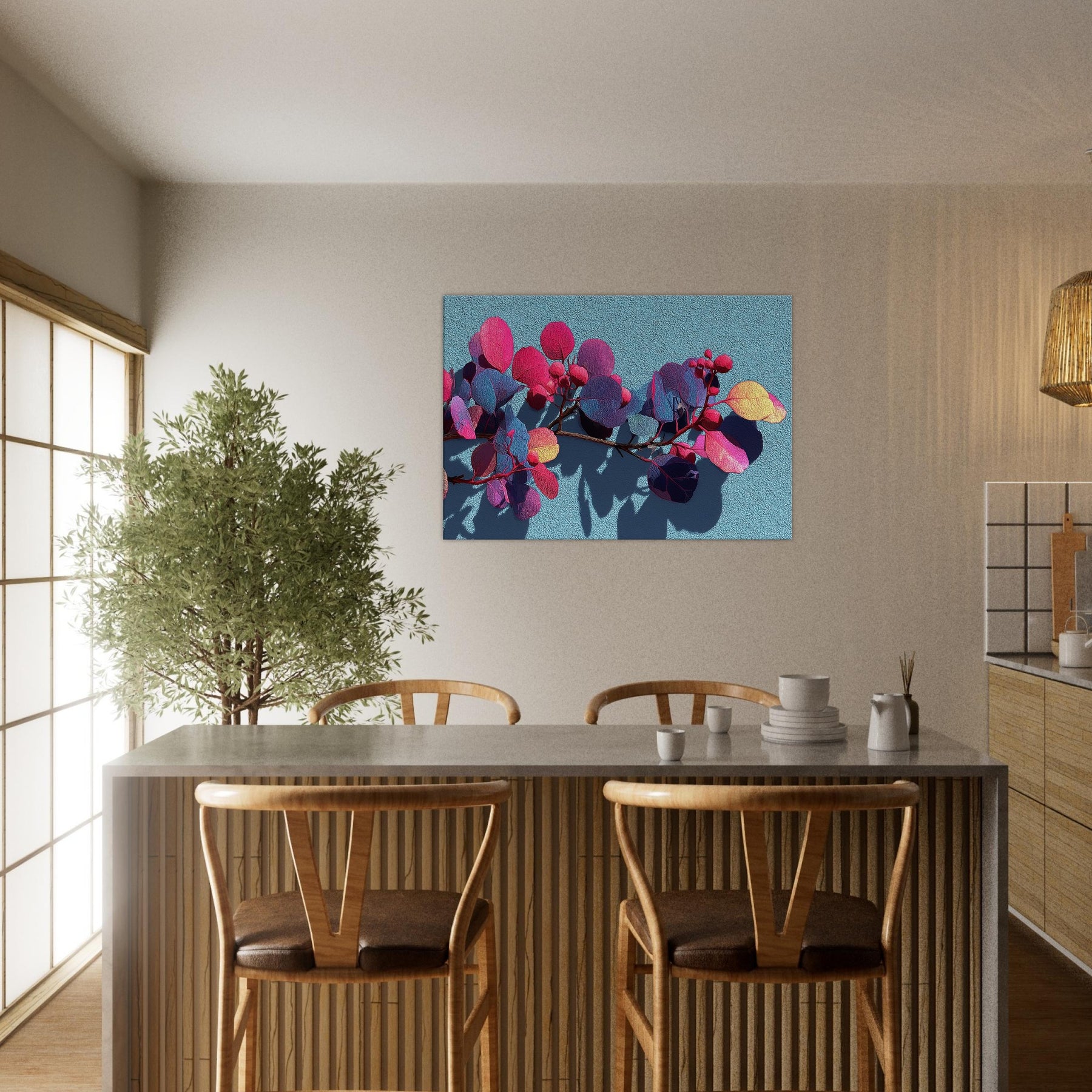 Let the Eucalyptus branches drift across your wall in a luminous, dreamlike shift of color. This abstract nature study gathers eucalyptus tones sage, rose, and indigo into a field of soft light that feels like early morning breeze. The composition invites quiet reflection and makes spaces glow with depth, texture, and a sense of movement. Perfect for living rooms and bedrooms, it pairs with natural woods and metallic accents to create a calm, stylish sanctuary.
