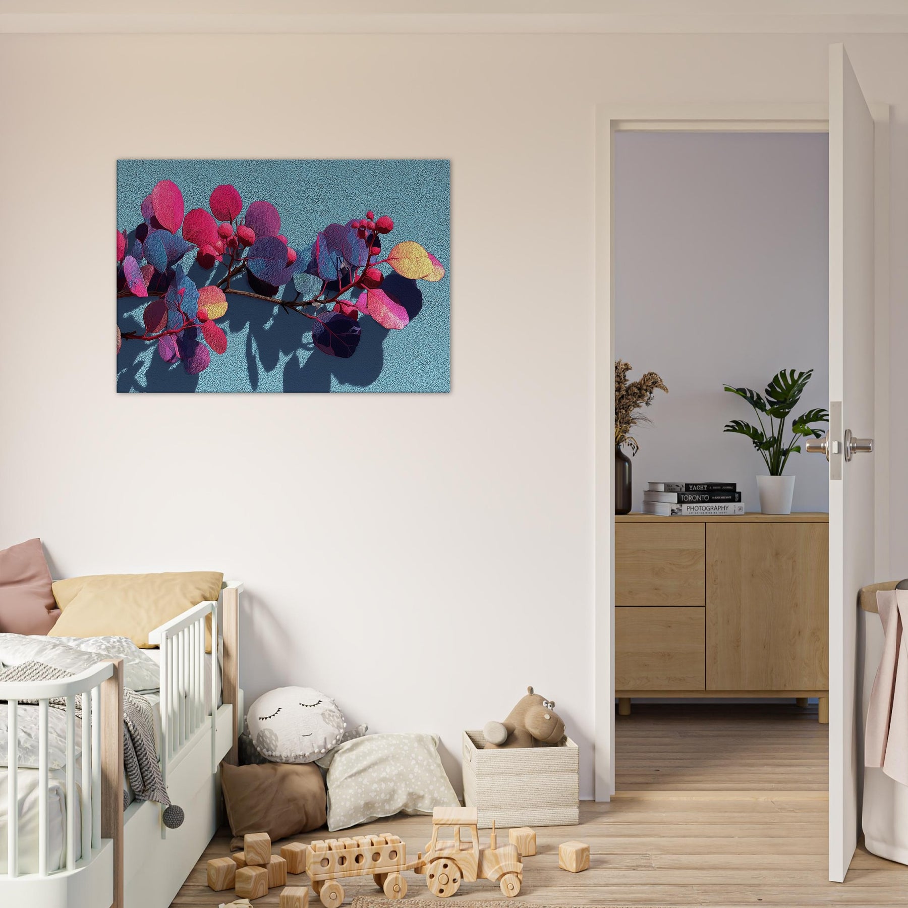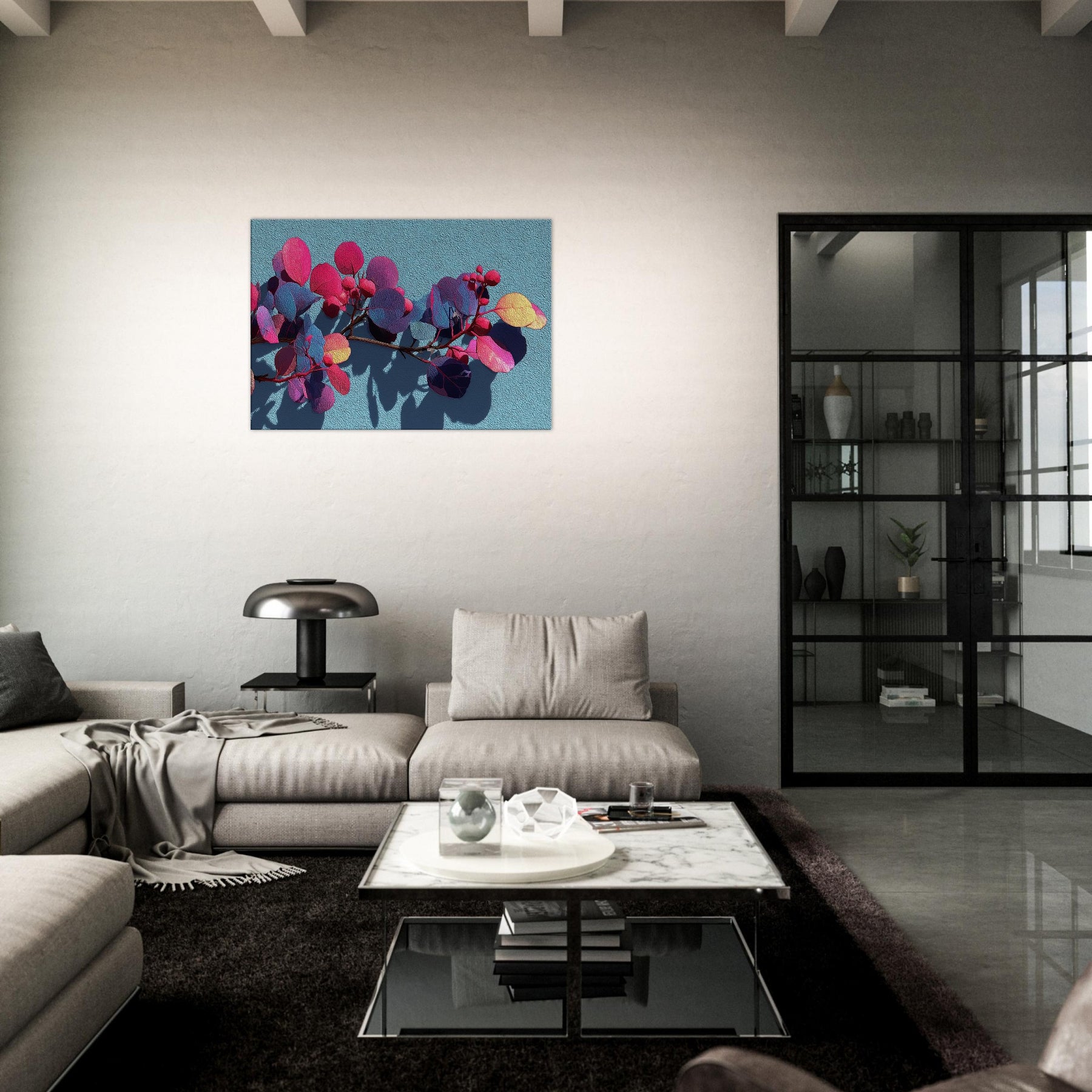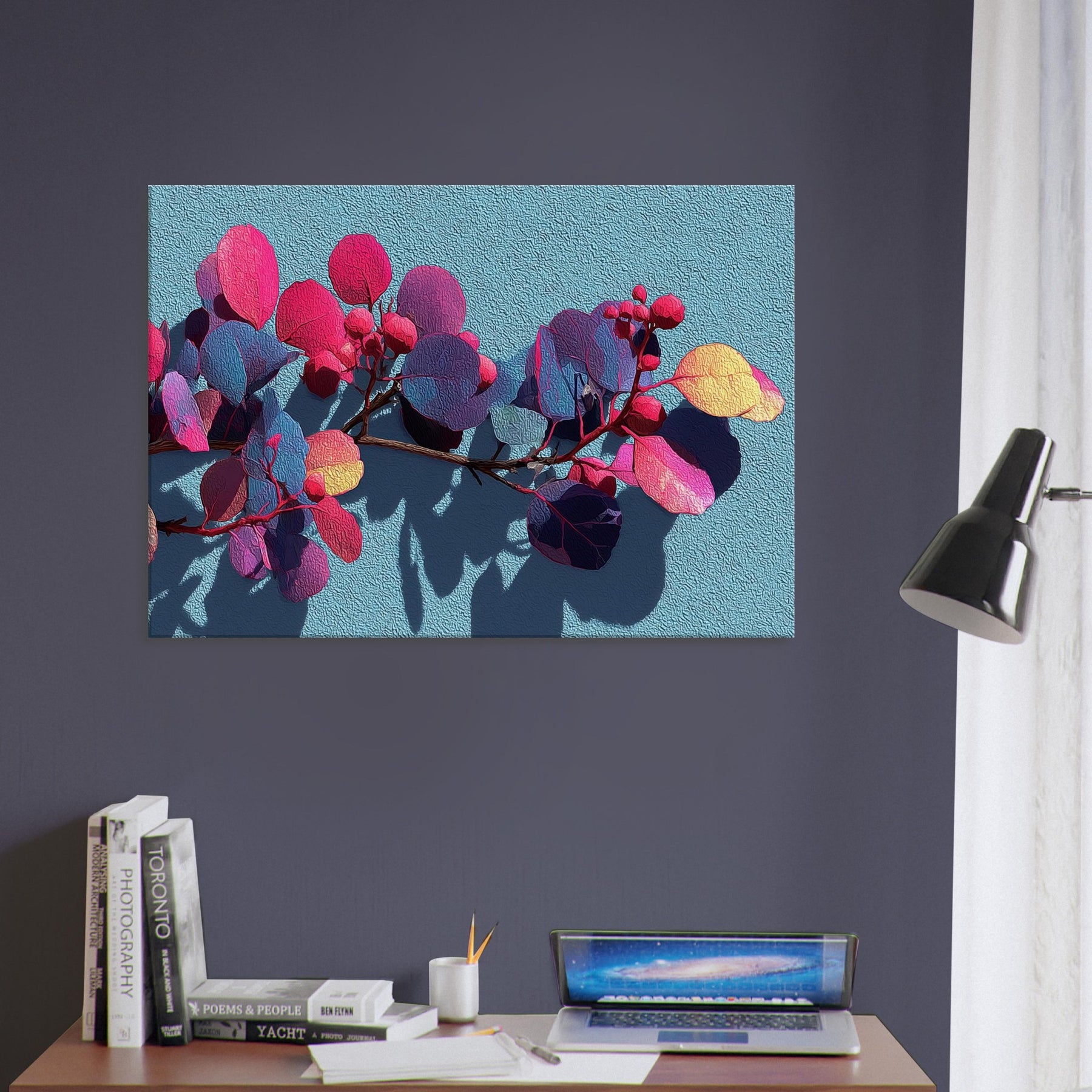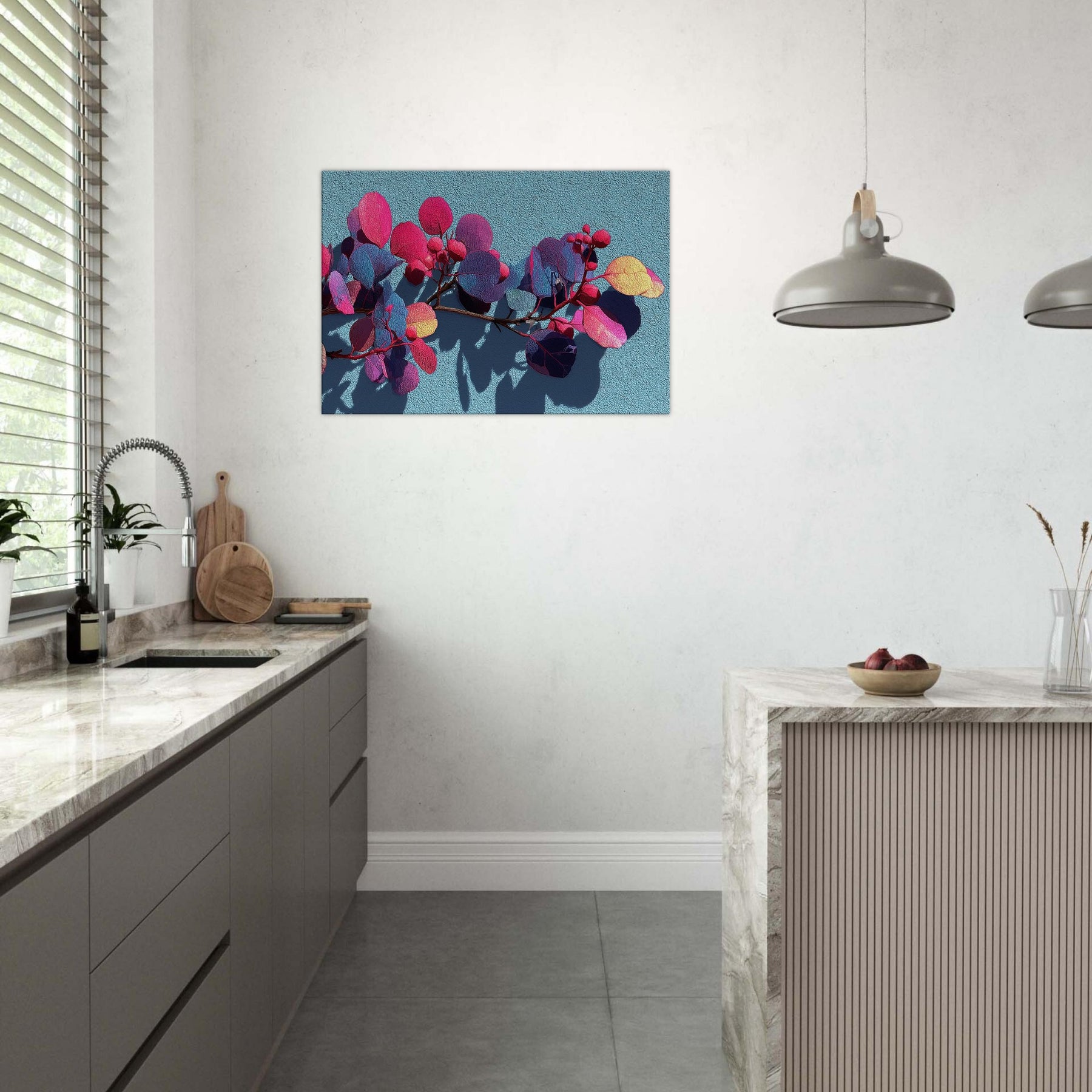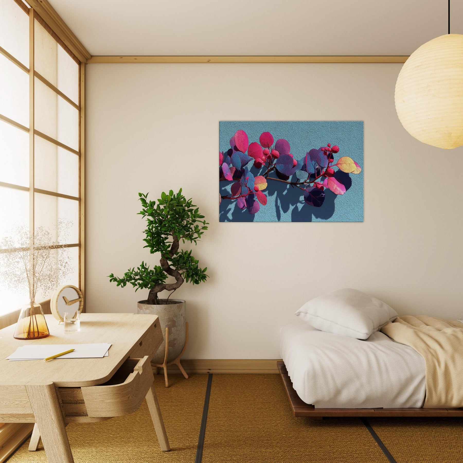 Let the Eucalyptus branches drift across your wall in a luminous, dreamlike shift of color. This abstract nature study gathers eucalyptus tones sage, rose, and indigo into a field of soft light that feels like early morning breeze. The composition invites quiet reflection and makes spaces glow with depth, texture, and a sense of movement. Perfect for living rooms and bedrooms, it pairs with natural woods and metallic accents to create a calm, stylish sanctuary.