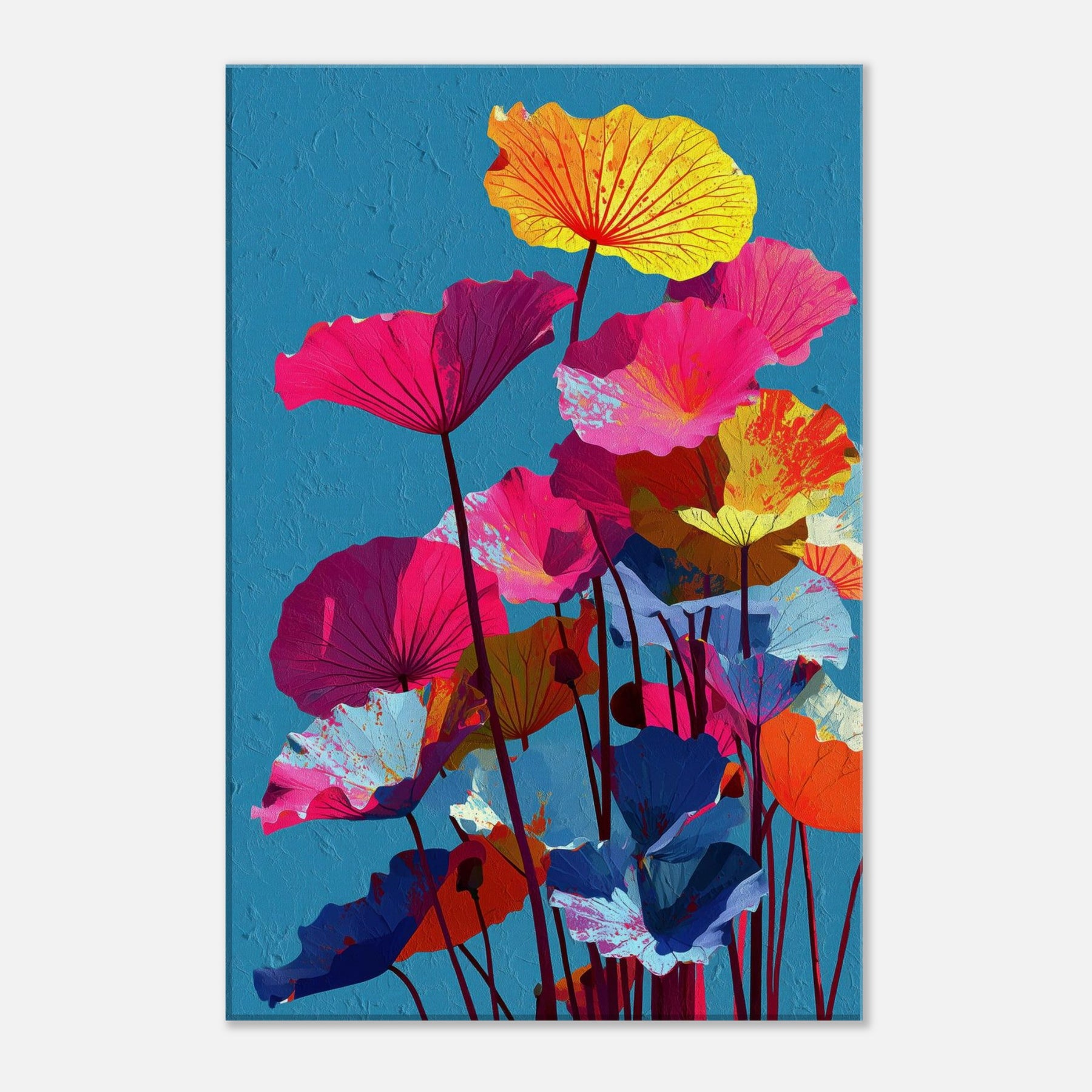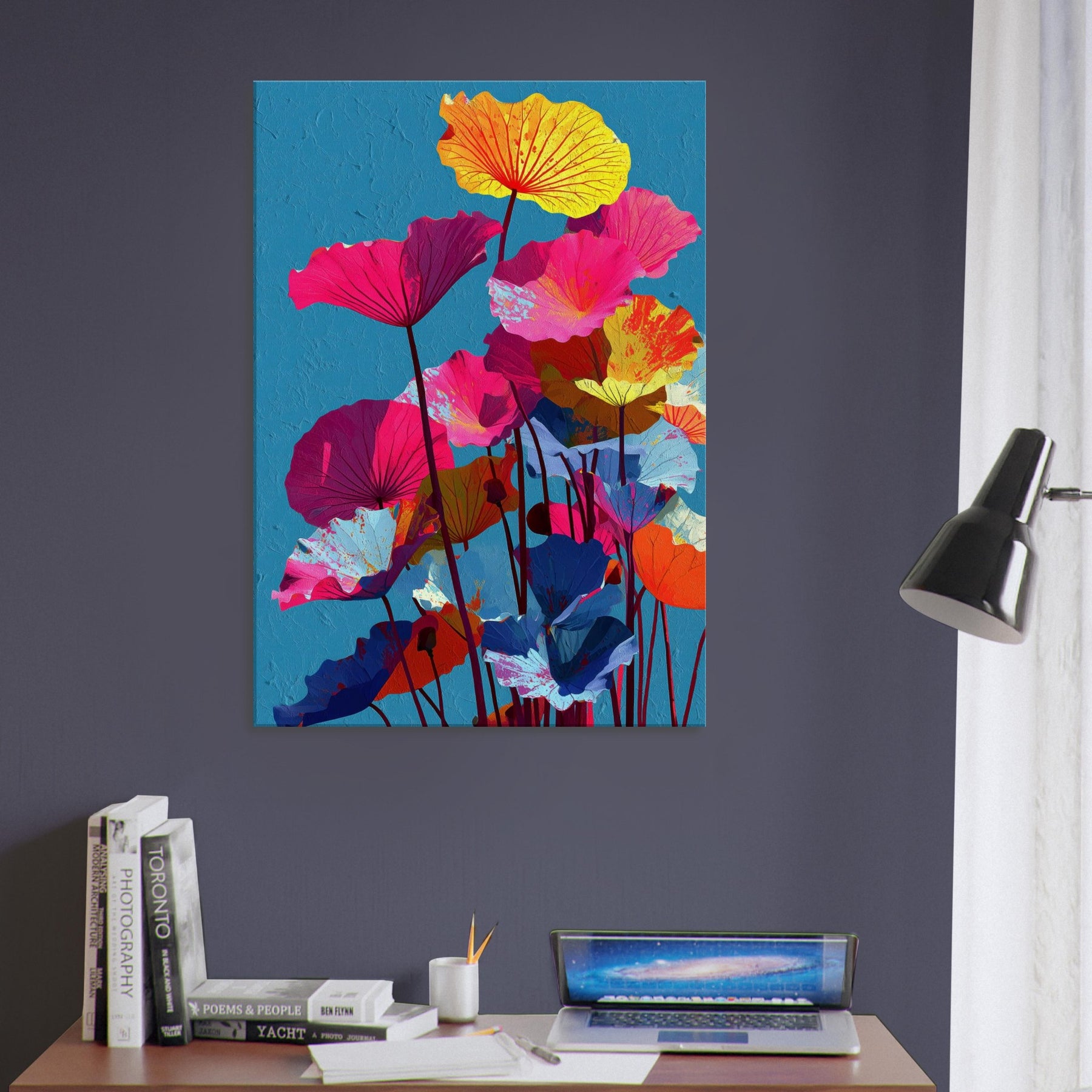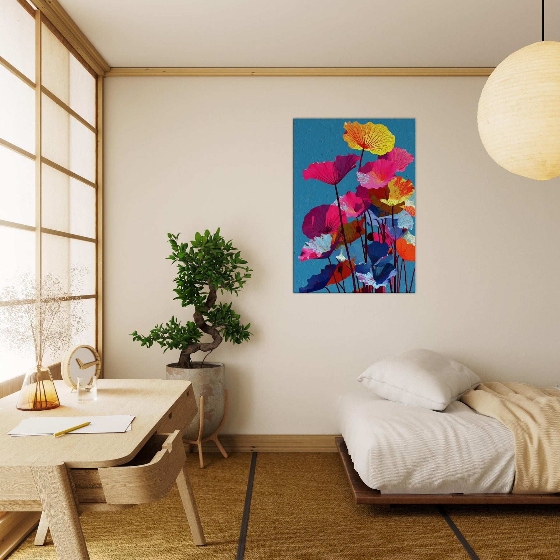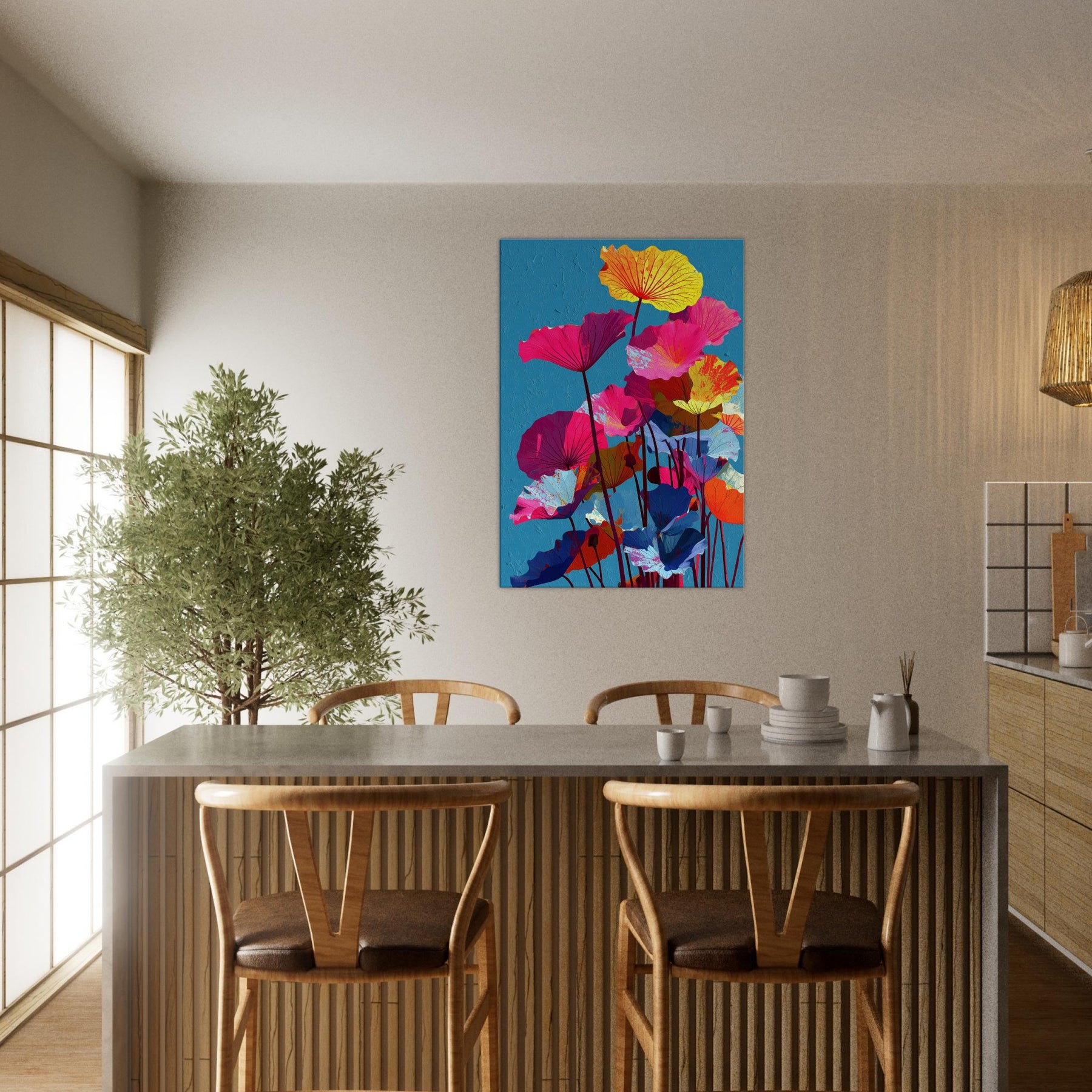 Immerse your space in a garden of luminous color with this abstract homage to the Lotus Leaves. The composition rises like a field of petals, hues shifting from electric pinks to sunlit yellows against a tranquil blue backdrop. It invites a quiet, meditative mood, turning walls into a serene harbor where nature and design meet. Placed above a sofa or in a sunlit corner, it breathes vitality into living spaces, inviting contemplation, energy, and a playful sense of movement.