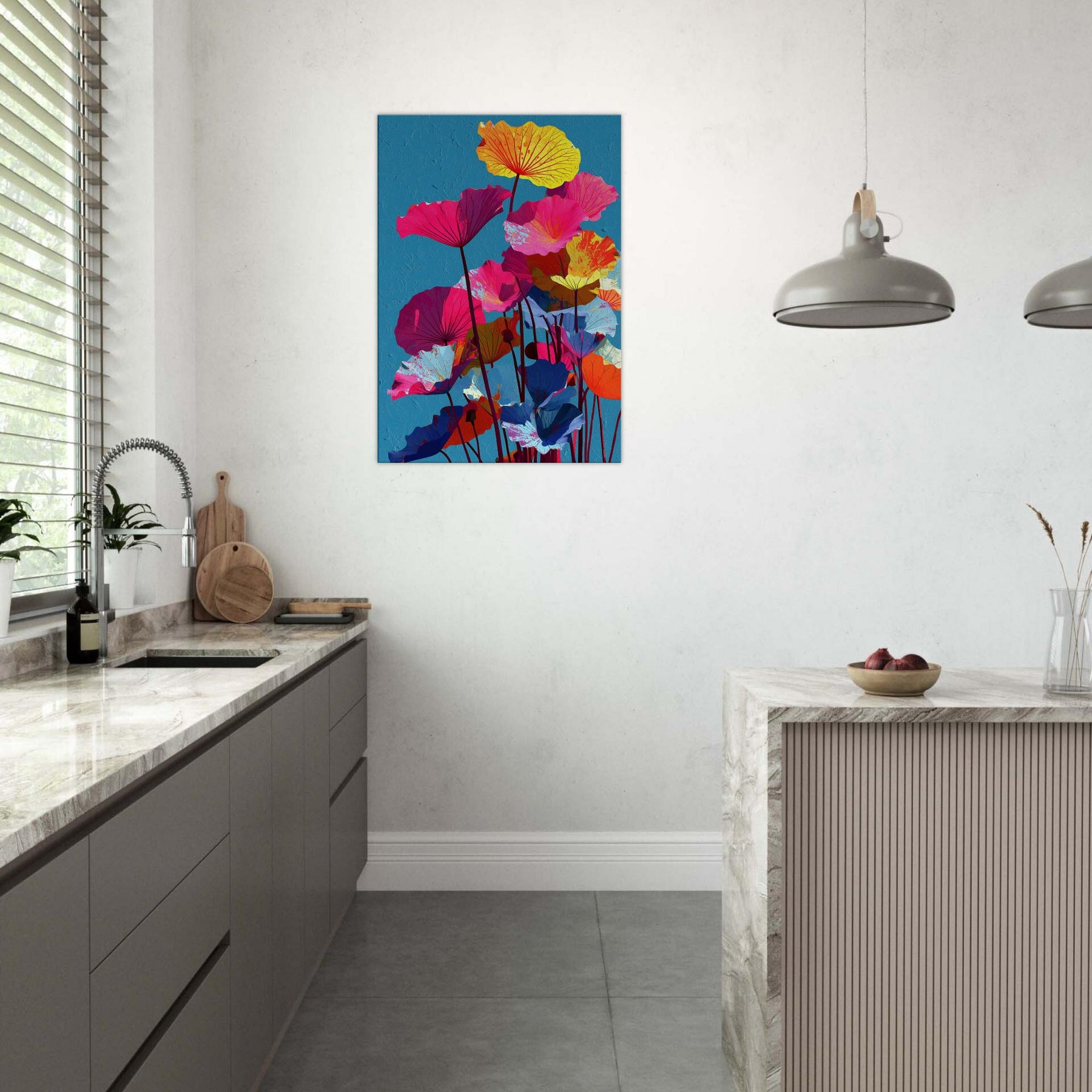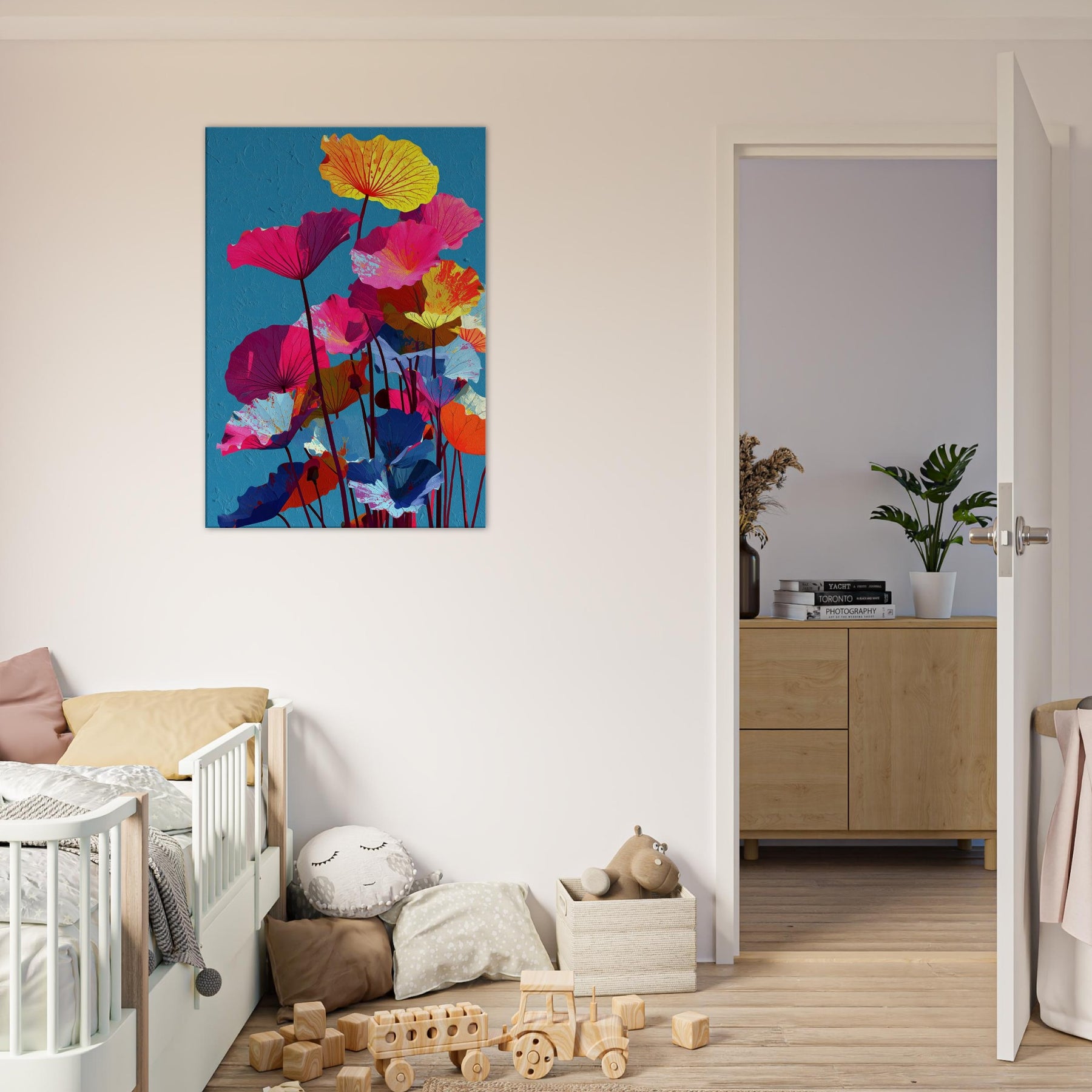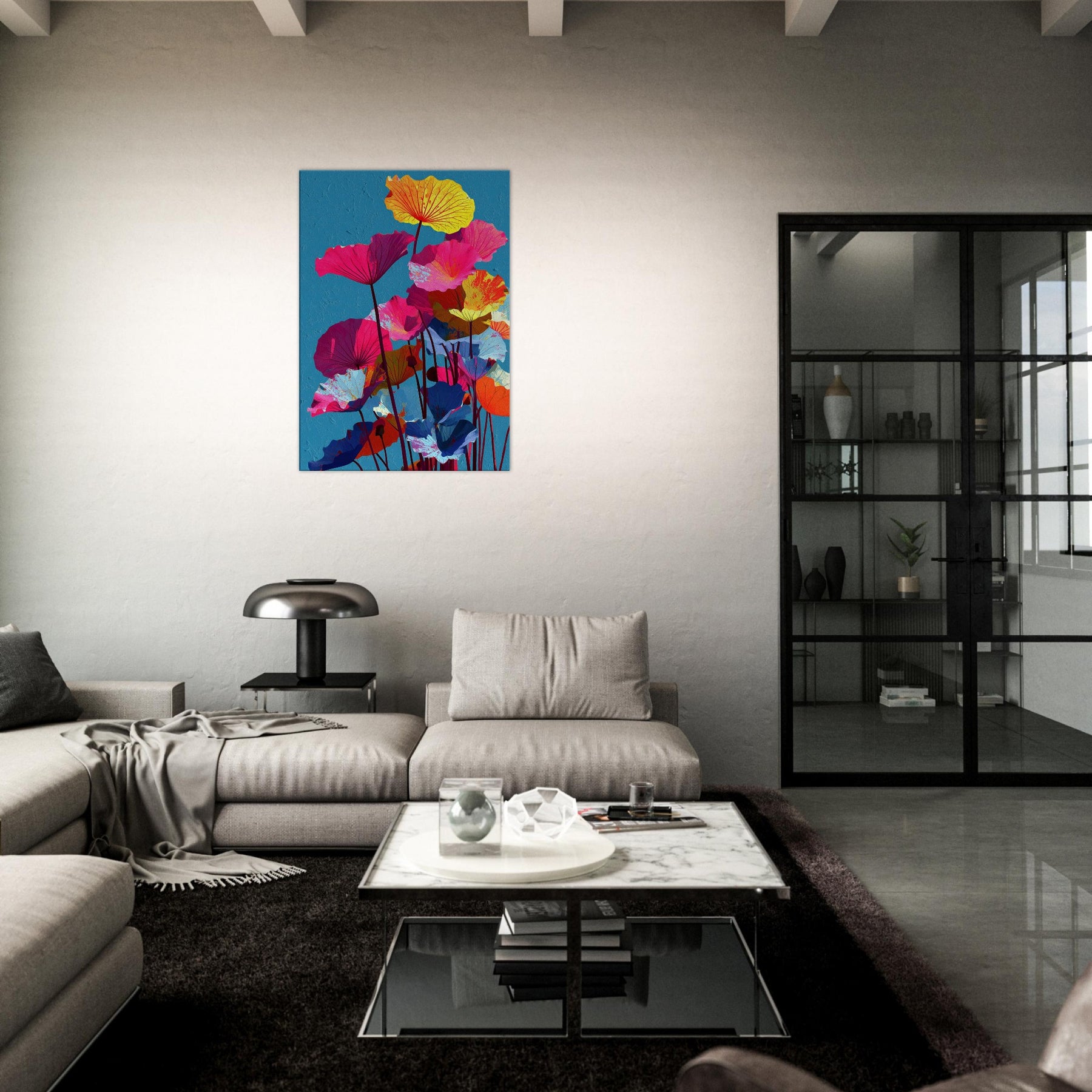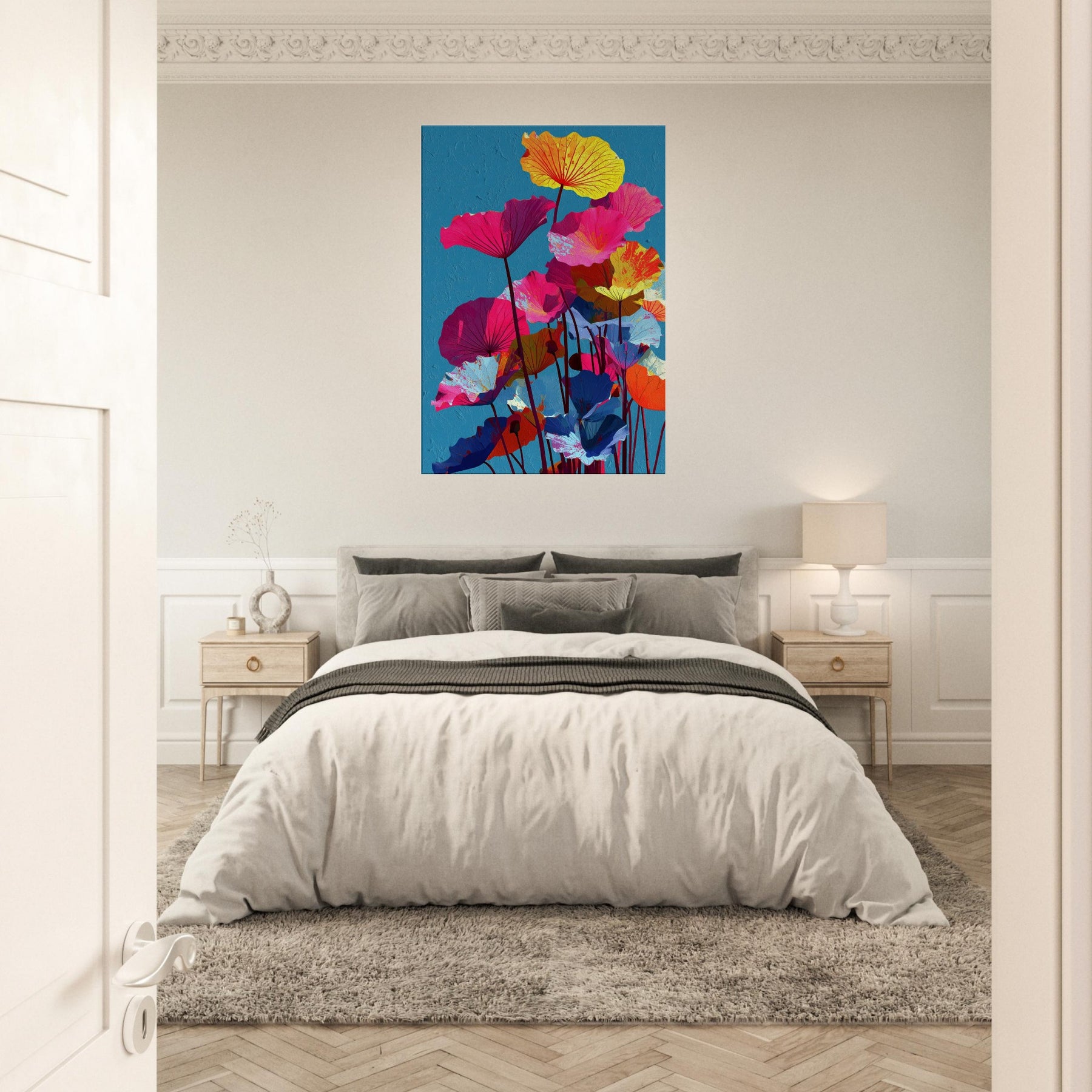 Immerse your space in a garden of luminous color with this abstract homage to the Lotus Leaves. The composition rises like a field of petals, hues shifting from electric pinks to sunlit yellows against a tranquil blue backdrop. It invites a quiet, meditative mood, turning walls into a serene harbor where nature and design meet. Placed above a sofa or in a sunlit corner, it breathes vitality into living spaces, inviting contemplation, energy, and a playful sense of movement.