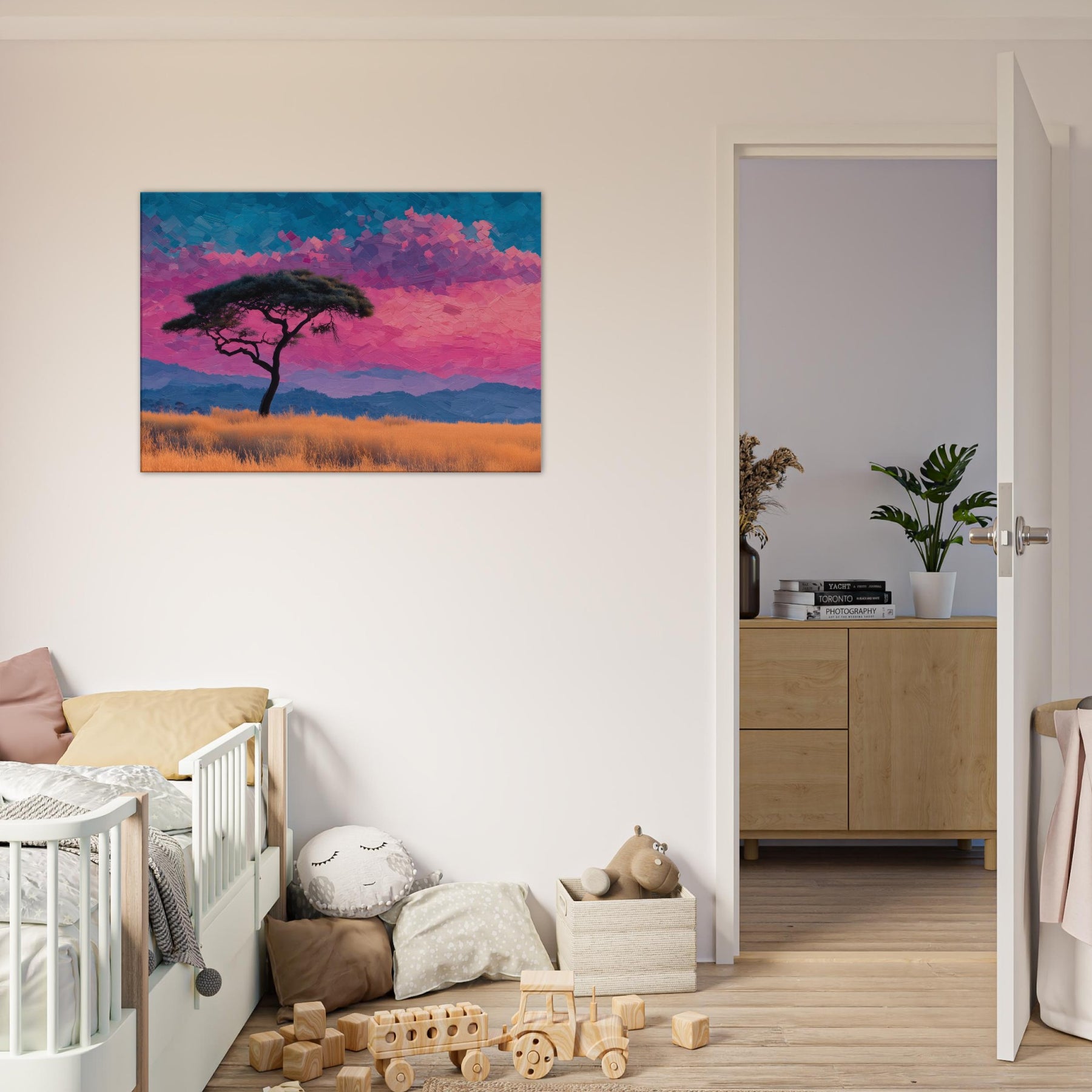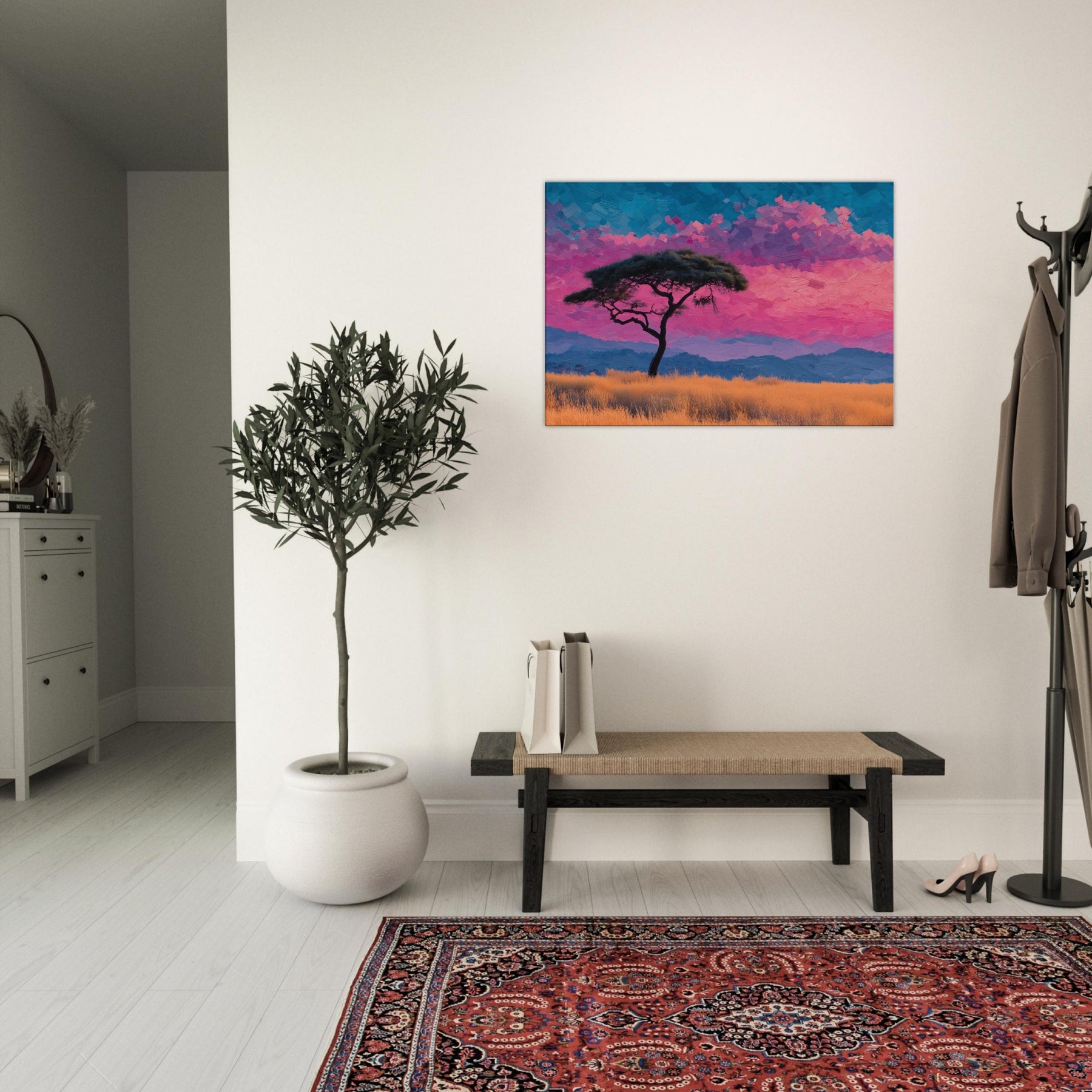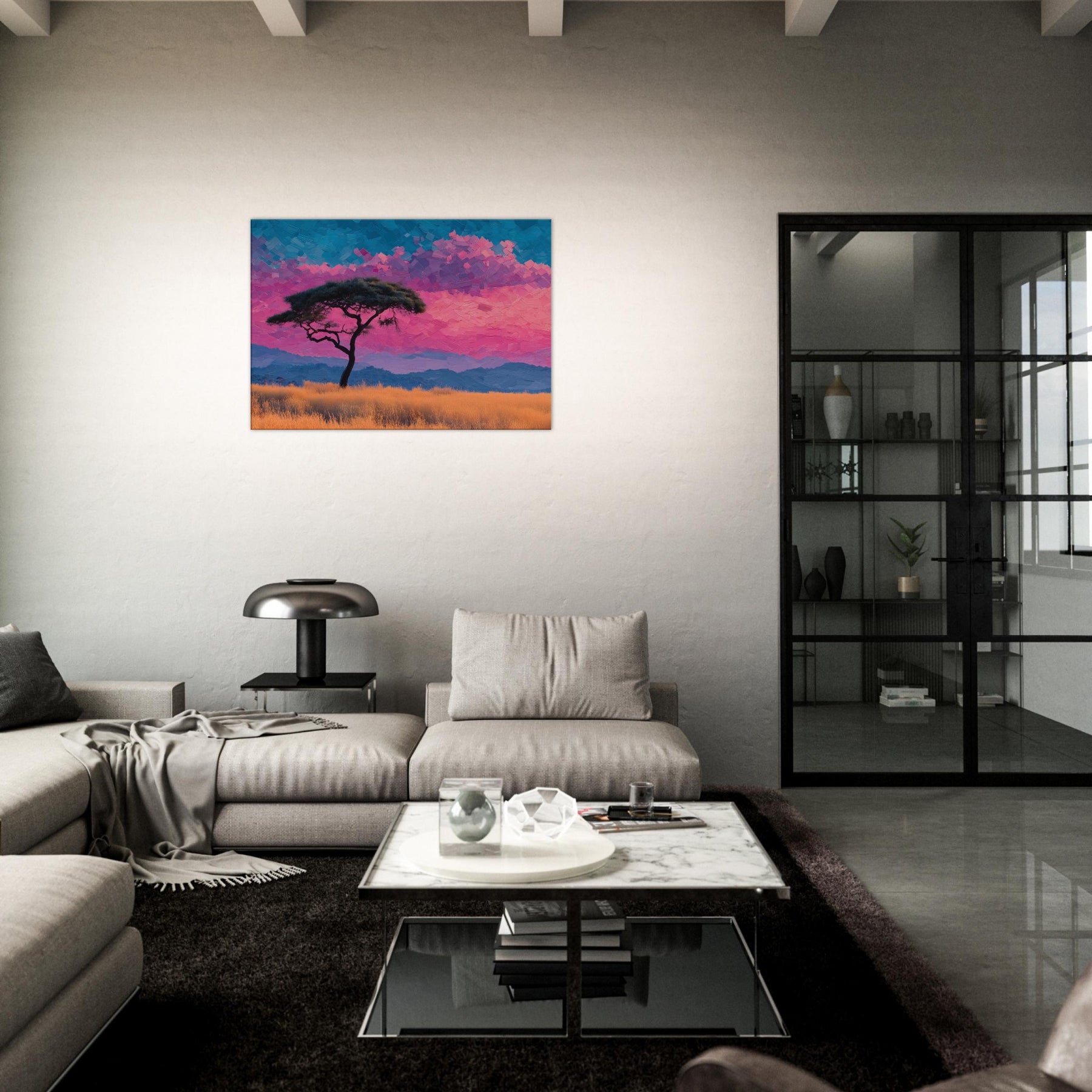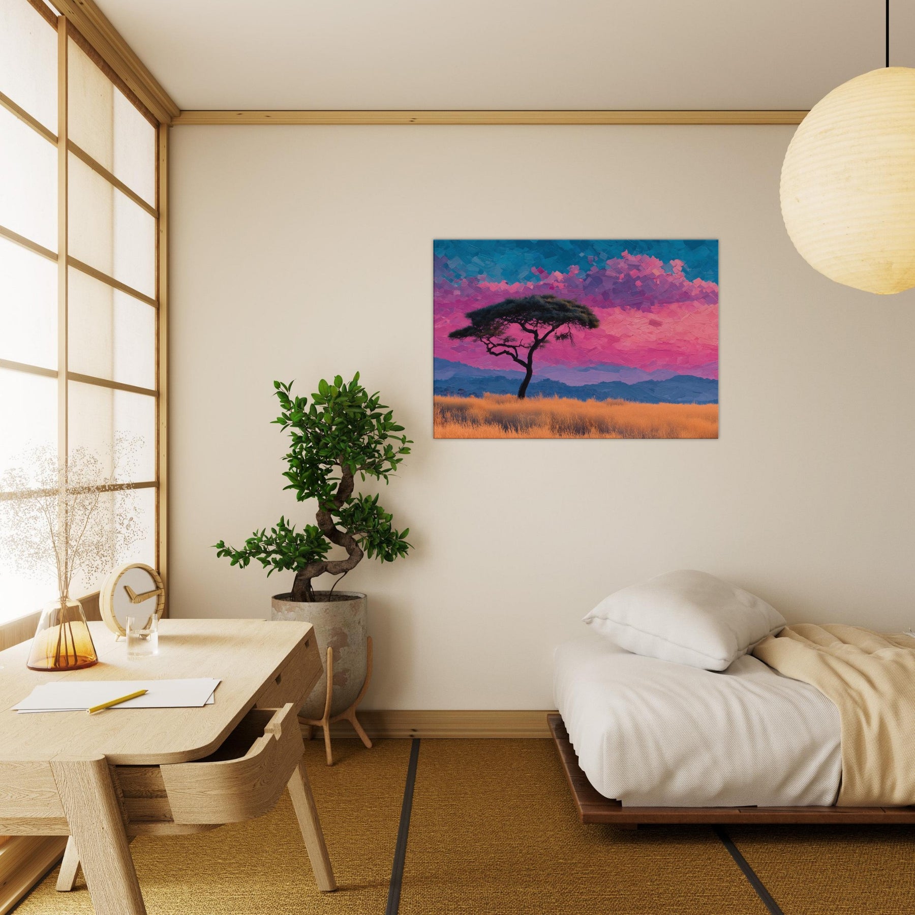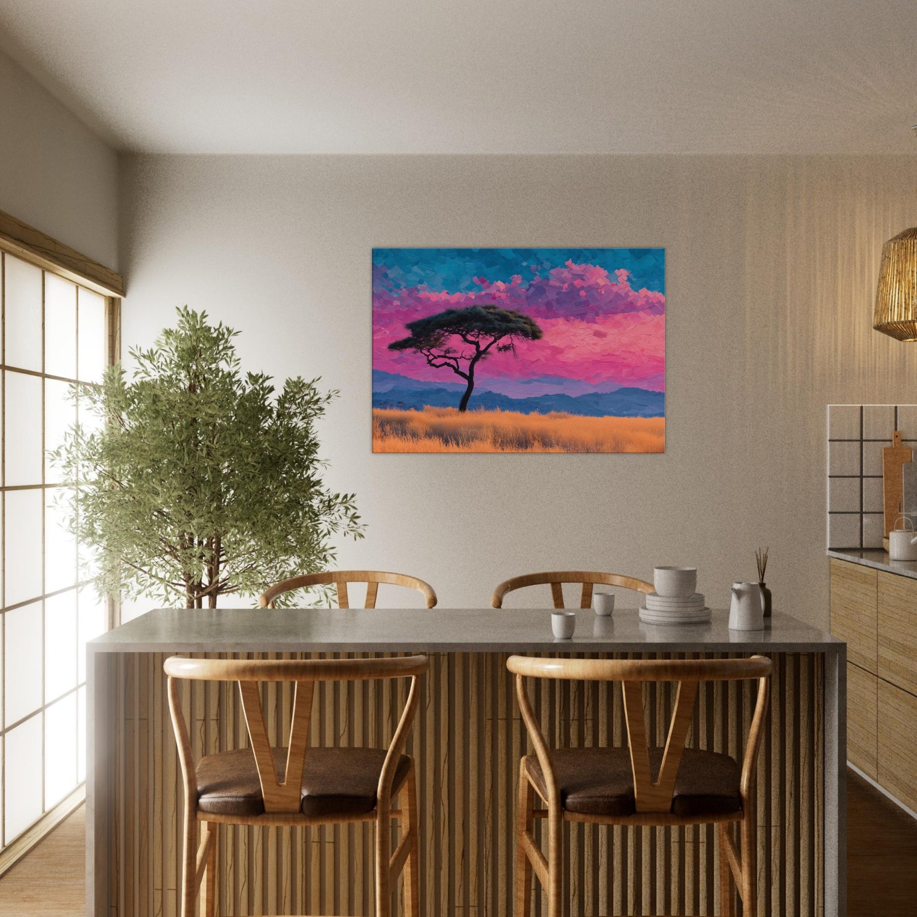Let your space breathe with a Savannah inspired dream where a solitary tree leans into a velvet dusk. This abstract invites the senses to slow: the warm grass, the soft blush of a pastel sky, the quiet hum of far hills. Printed on premium canvas with luminous color and textural brushwork, it creates depth and mood, turning a living room or bedroom into a sanctuary. The piece pairs with earthy woods and metallic accents, echoing nature’s resilience and quiet grandeur.
