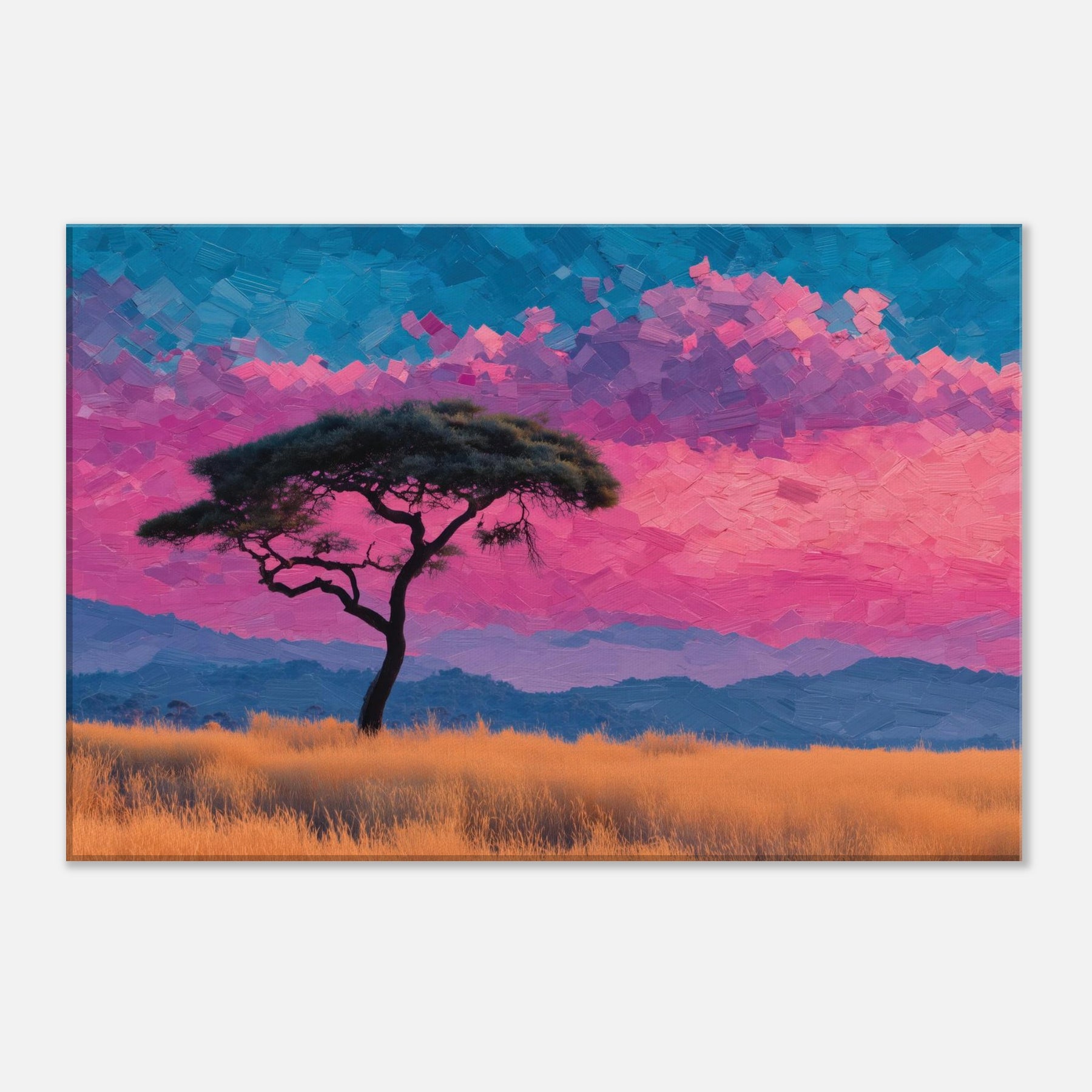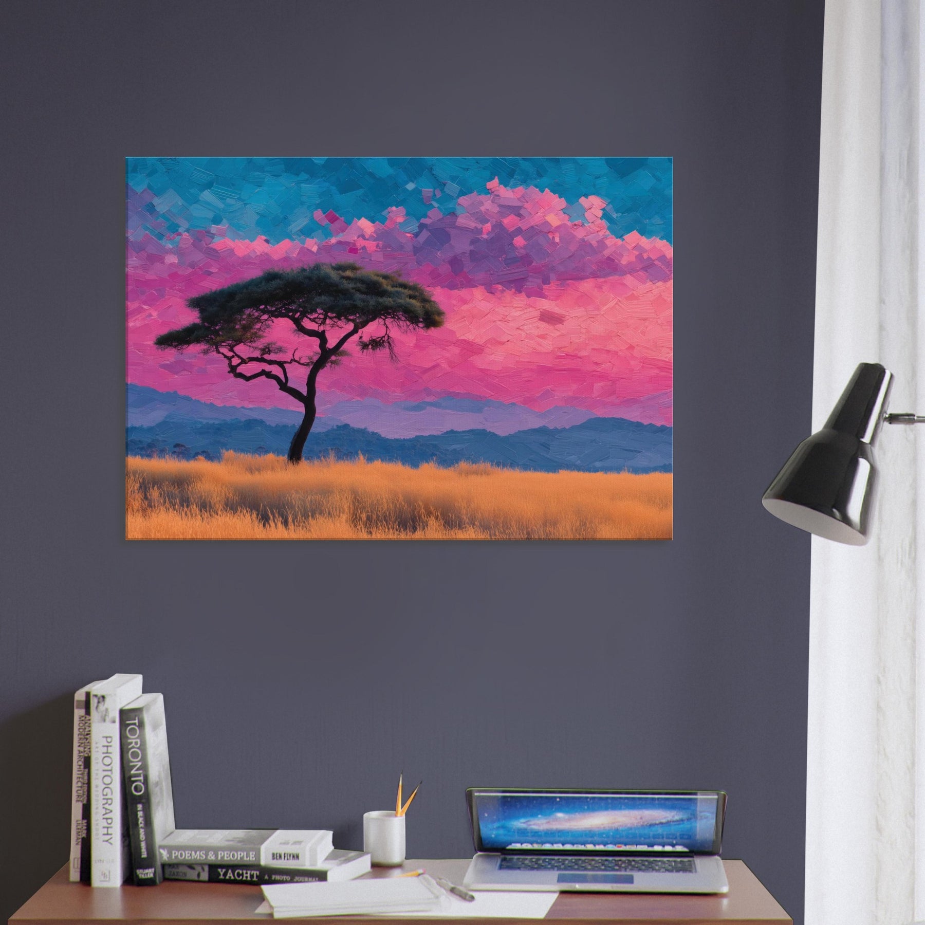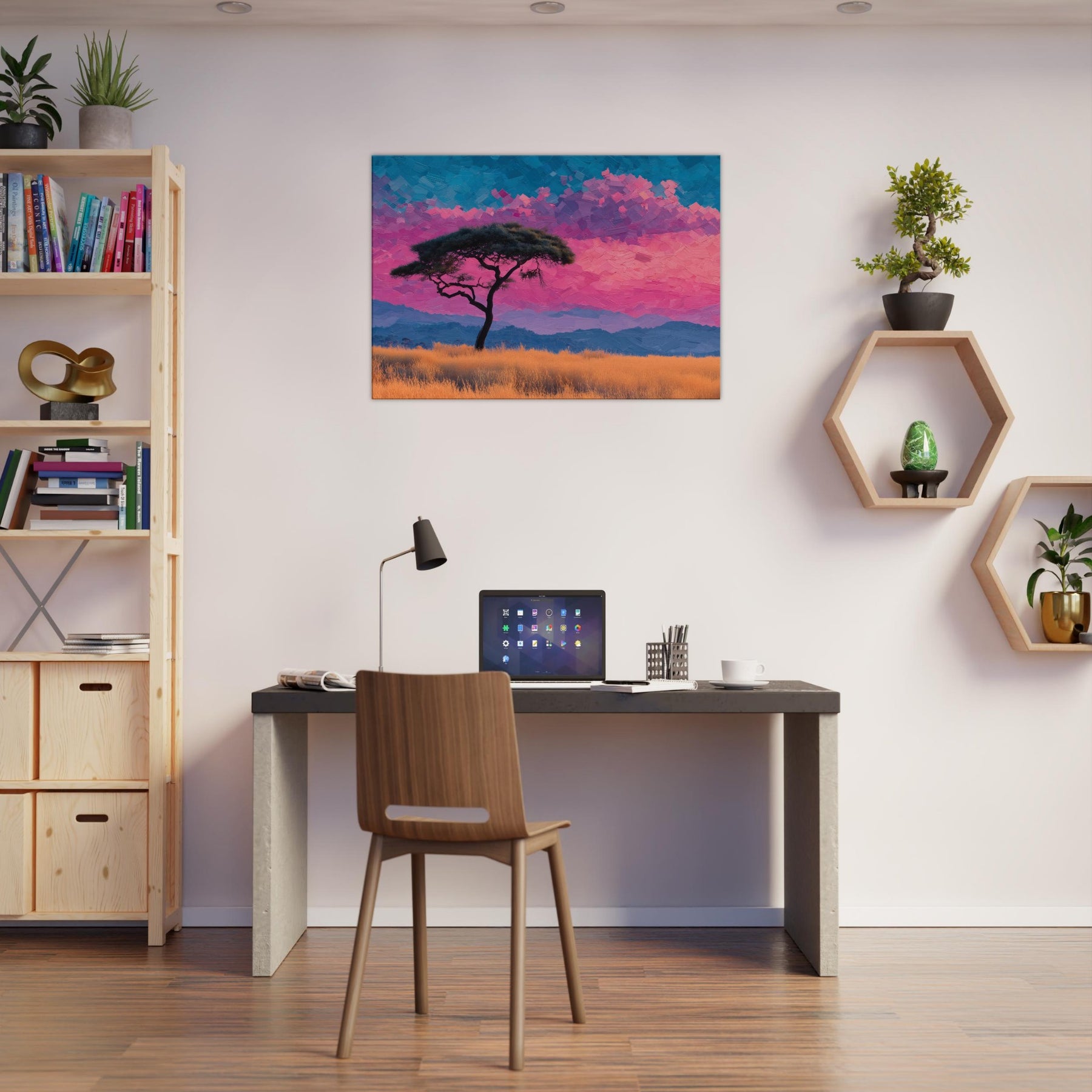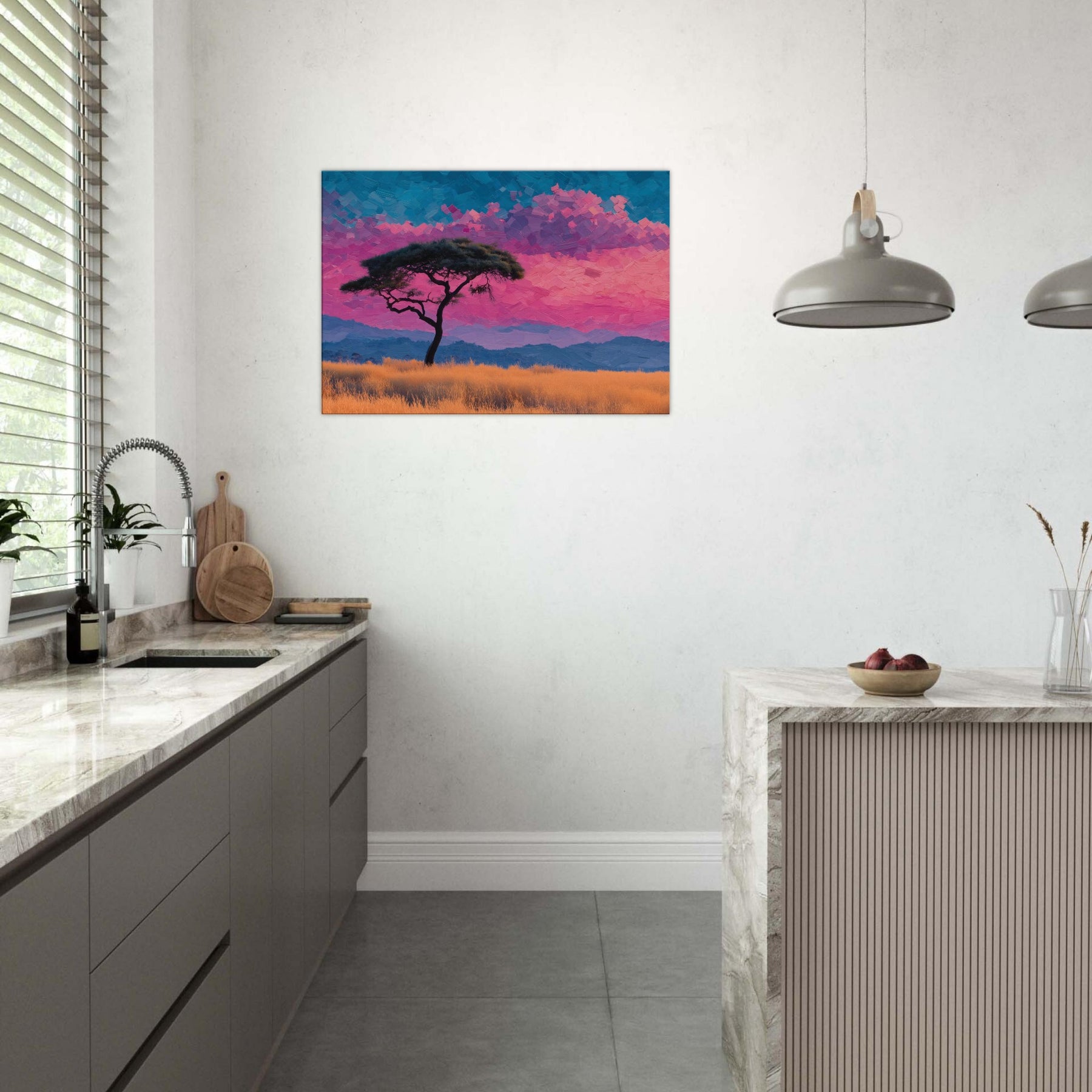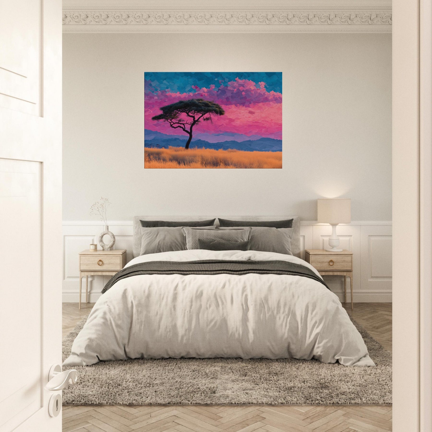 Let your space breathe with a Savannah inspired dream where a solitary tree leans into a velvet dusk. This abstract invites the senses to slow: the warm grass, the soft blush of a pastel sky, the quiet hum of far hills. Printed on premium canvas with luminous color and textural brushwork, it creates depth and mood, turning a living room or bedroom into a sanctuary. The piece pairs with earthy woods and metallic accents, echoing nature’s resilience and quiet grandeur.