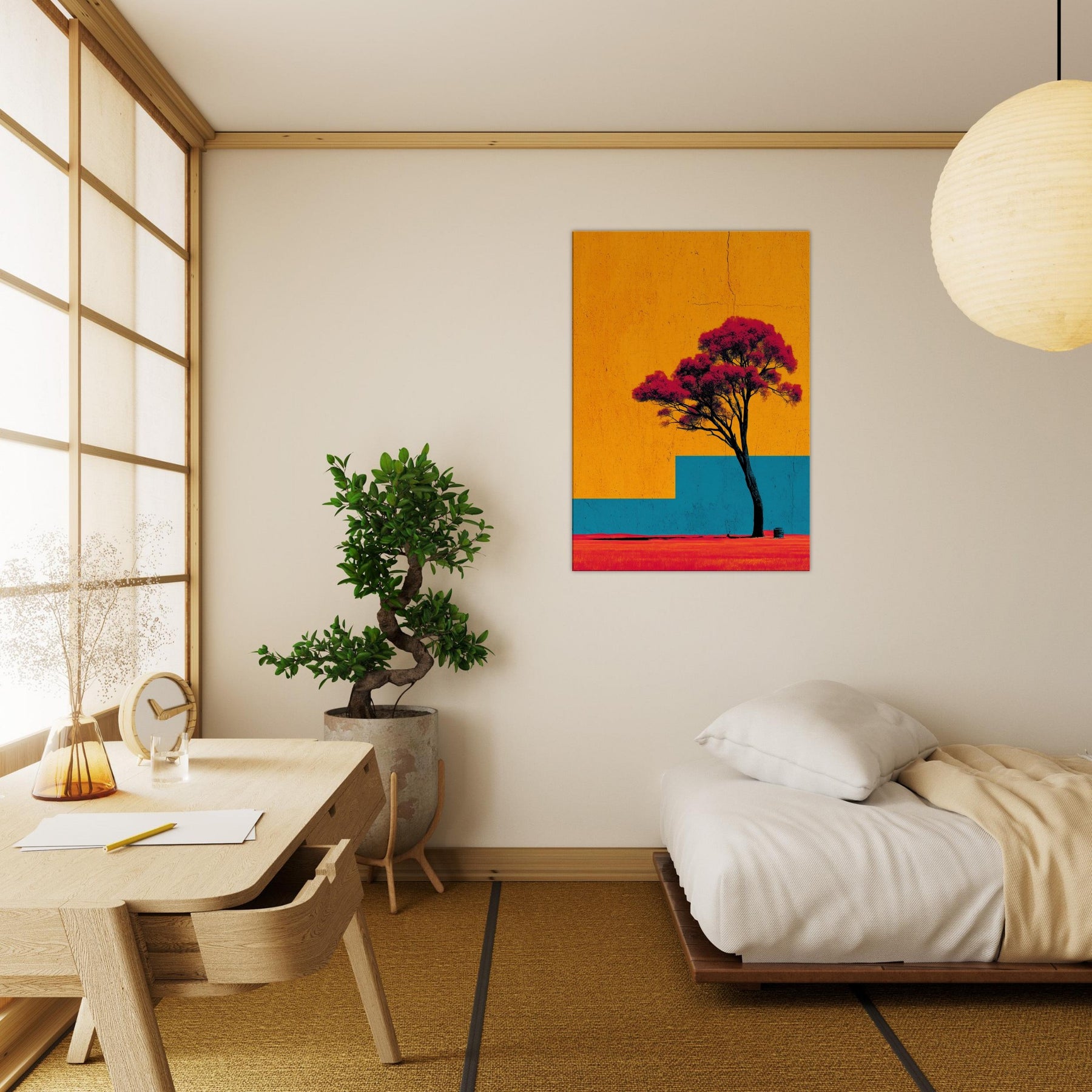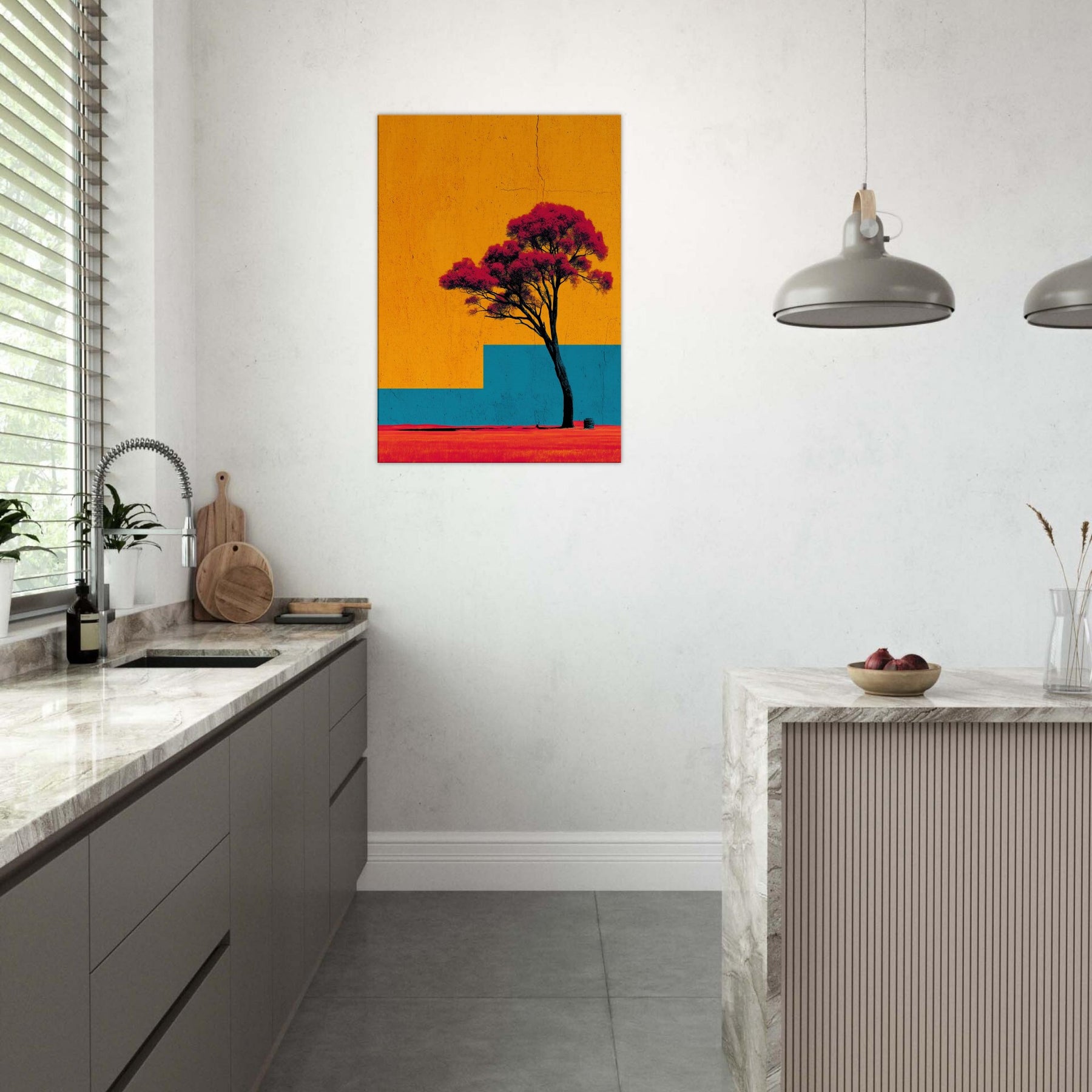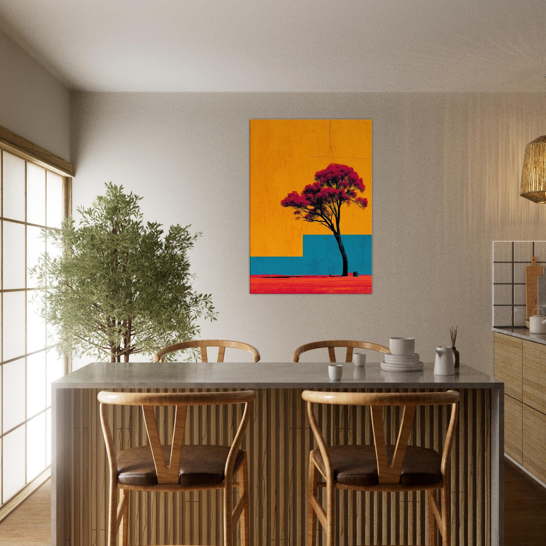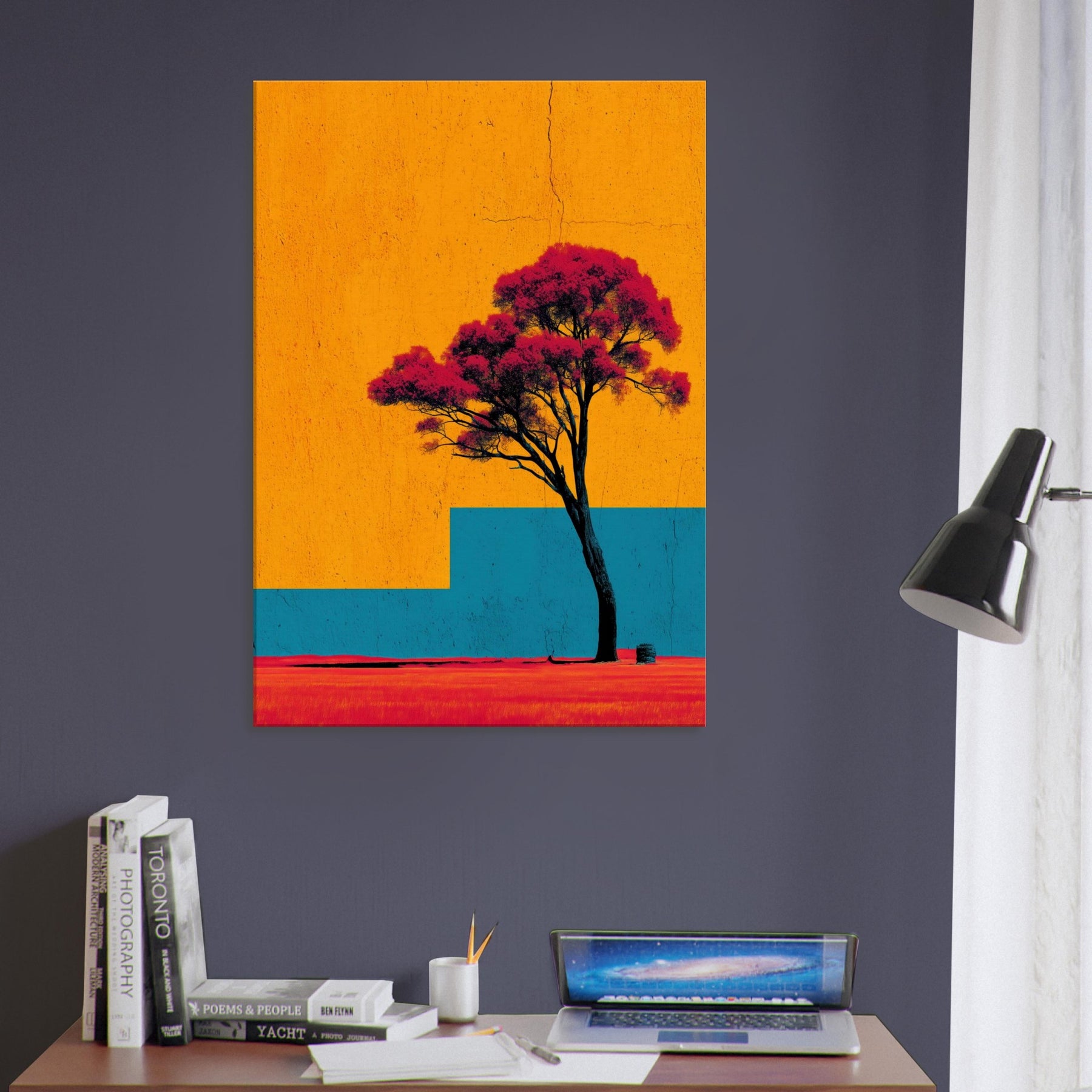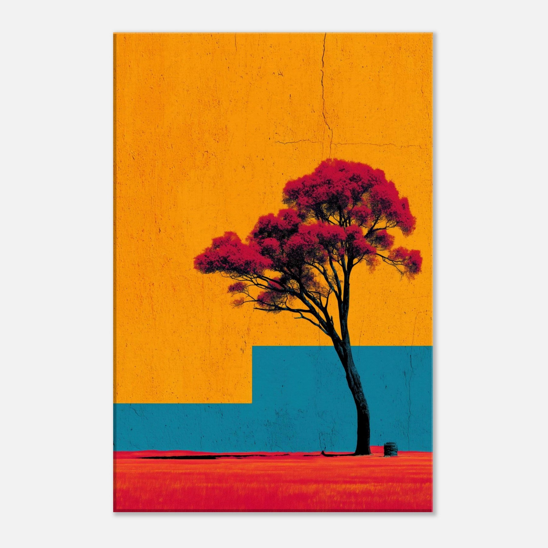 Emerging from a field of saturated color, the Lone Tree stands as a quiet witness to changing light. This abstract composition invites a moment of stillness: the tree’s dark trunk anchors a sky of bright orange and a blue architectural step that recedes into memory. The effect is tactile warmth on the skin, a breeze at the left shoulder as if outdoors were carried into your living room. Hang it to create a luminous, contemplative focal point that uplifts everyday moments.