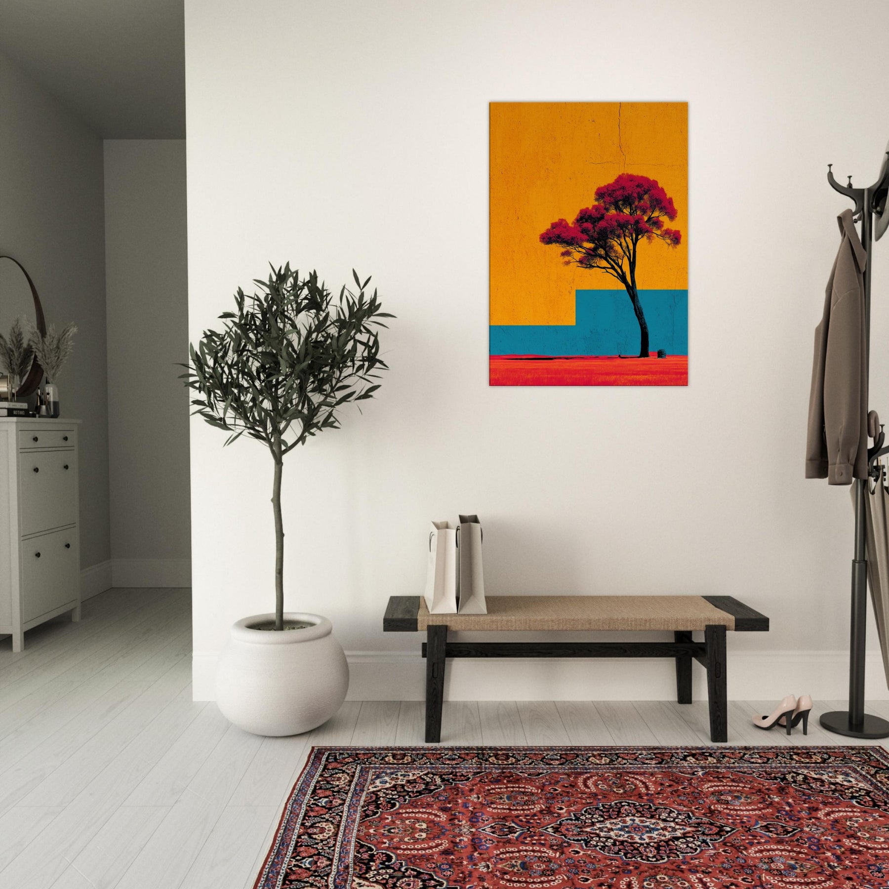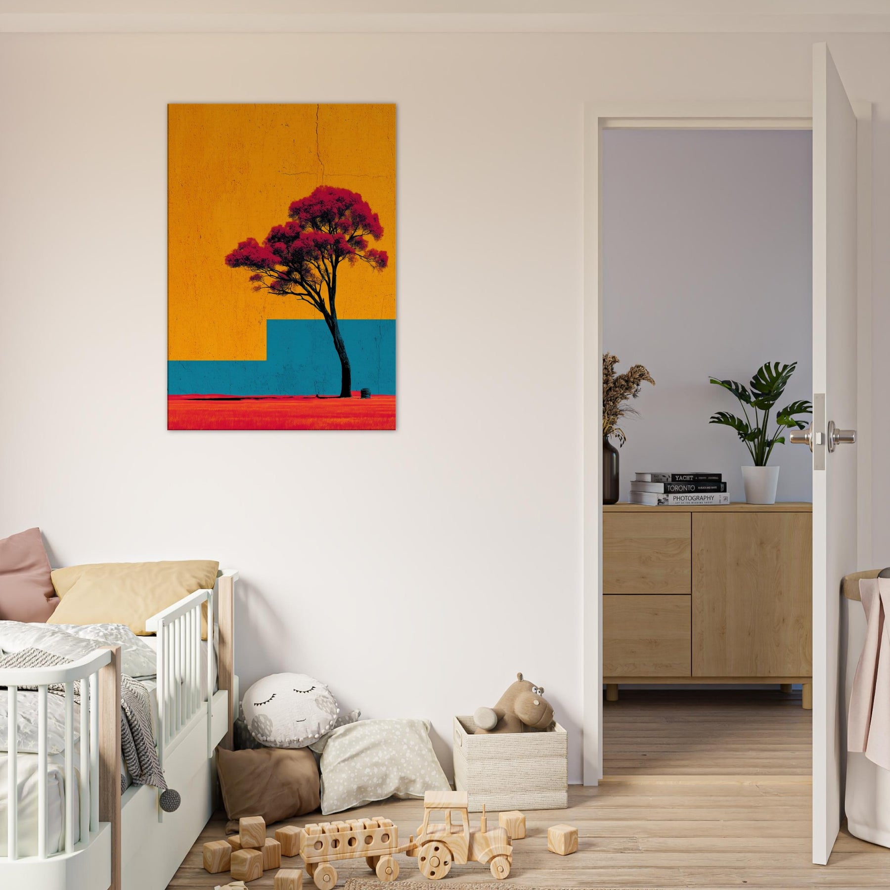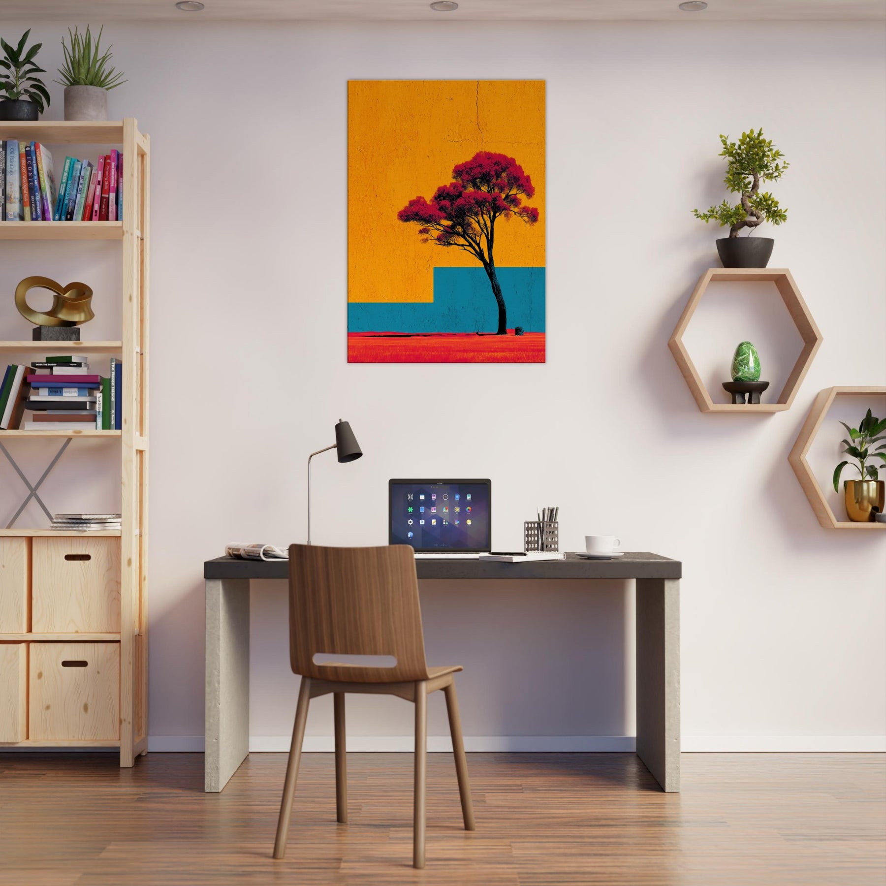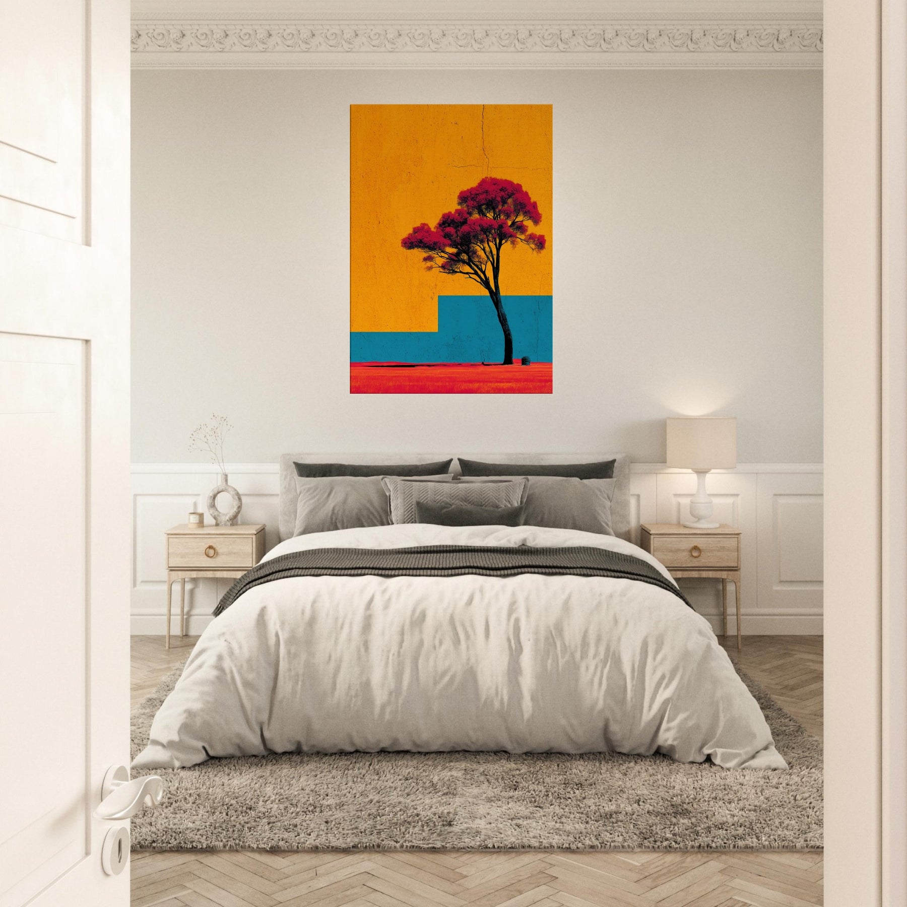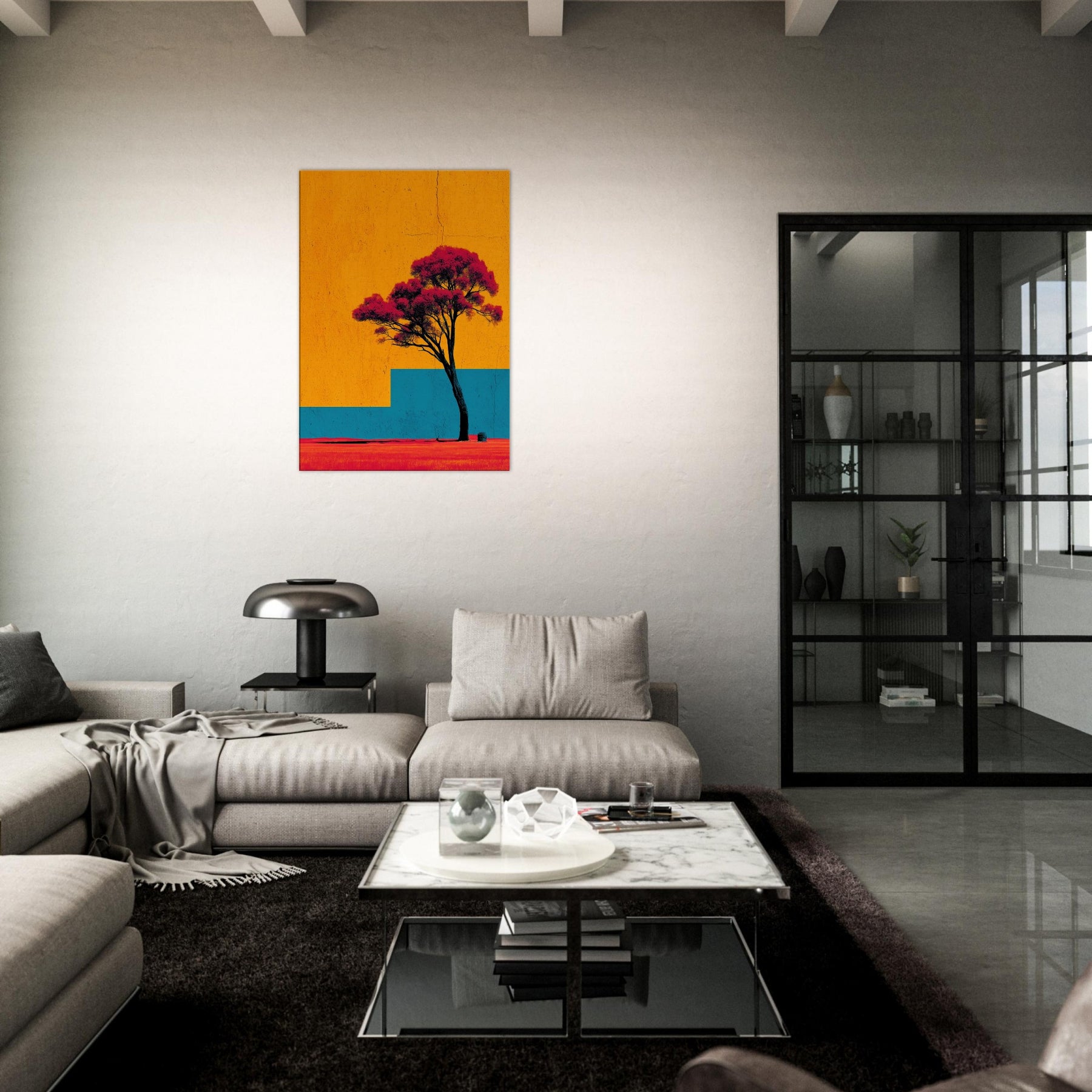 Emerging from a field of saturated color, the Lone Tree stands as a quiet witness to changing light. This abstract composition invites a moment of stillness: the tree’s dark trunk anchors a sky of bright orange and a blue architectural step that recedes into memory. The effect is tactile warmth on the skin, a breeze at the left shoulder as if outdoors were carried into your living room. Hang it to create a luminous, contemplative focal point that uplifts everyday moments.