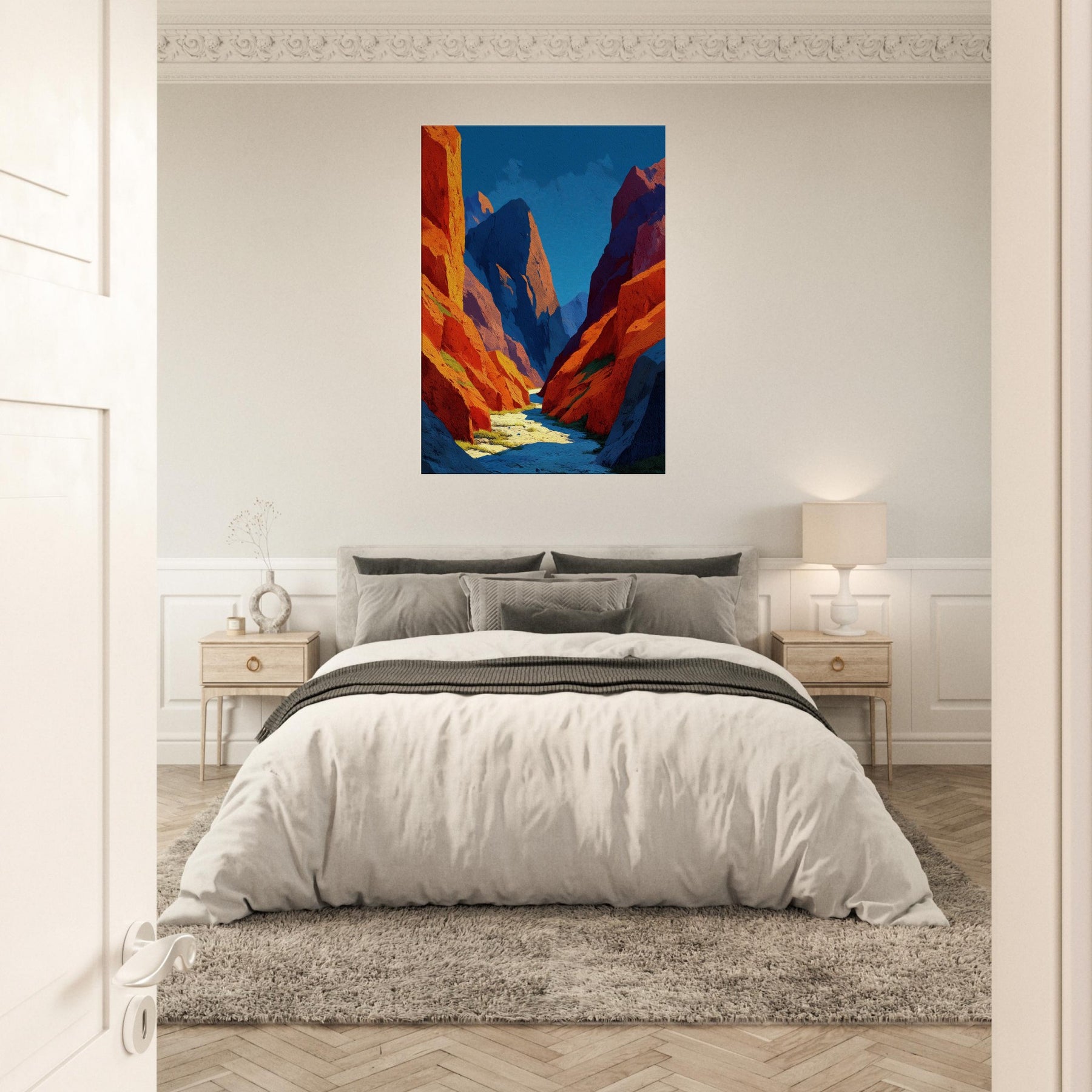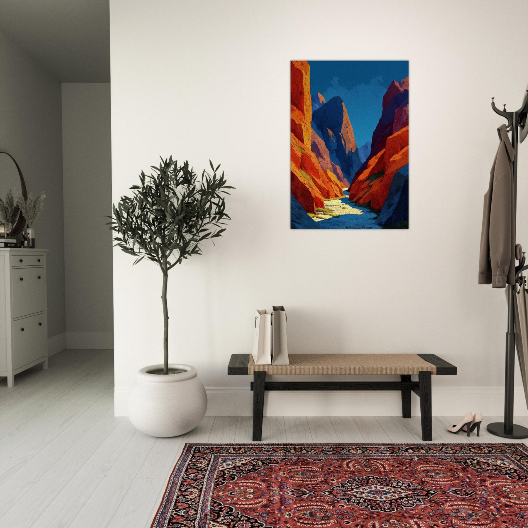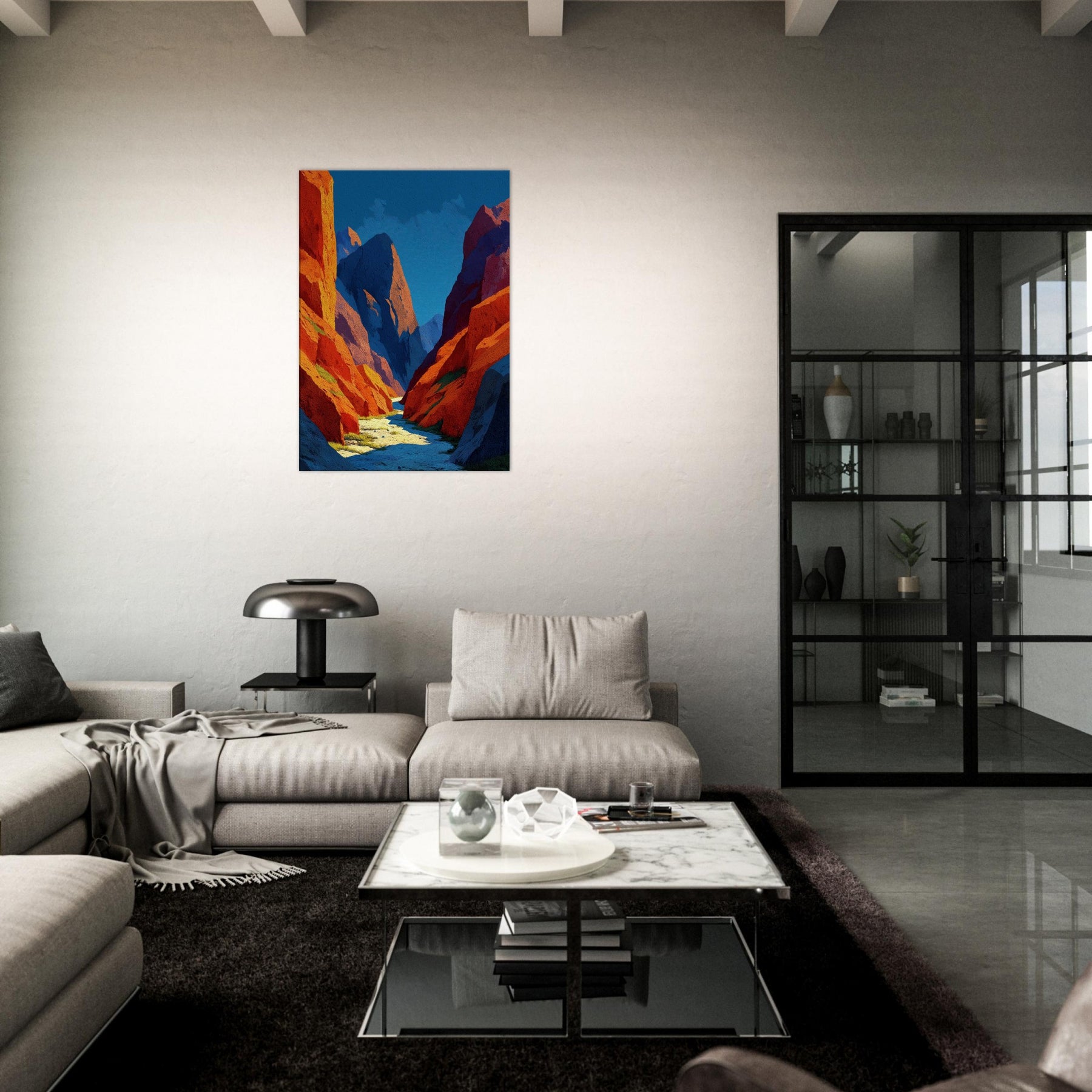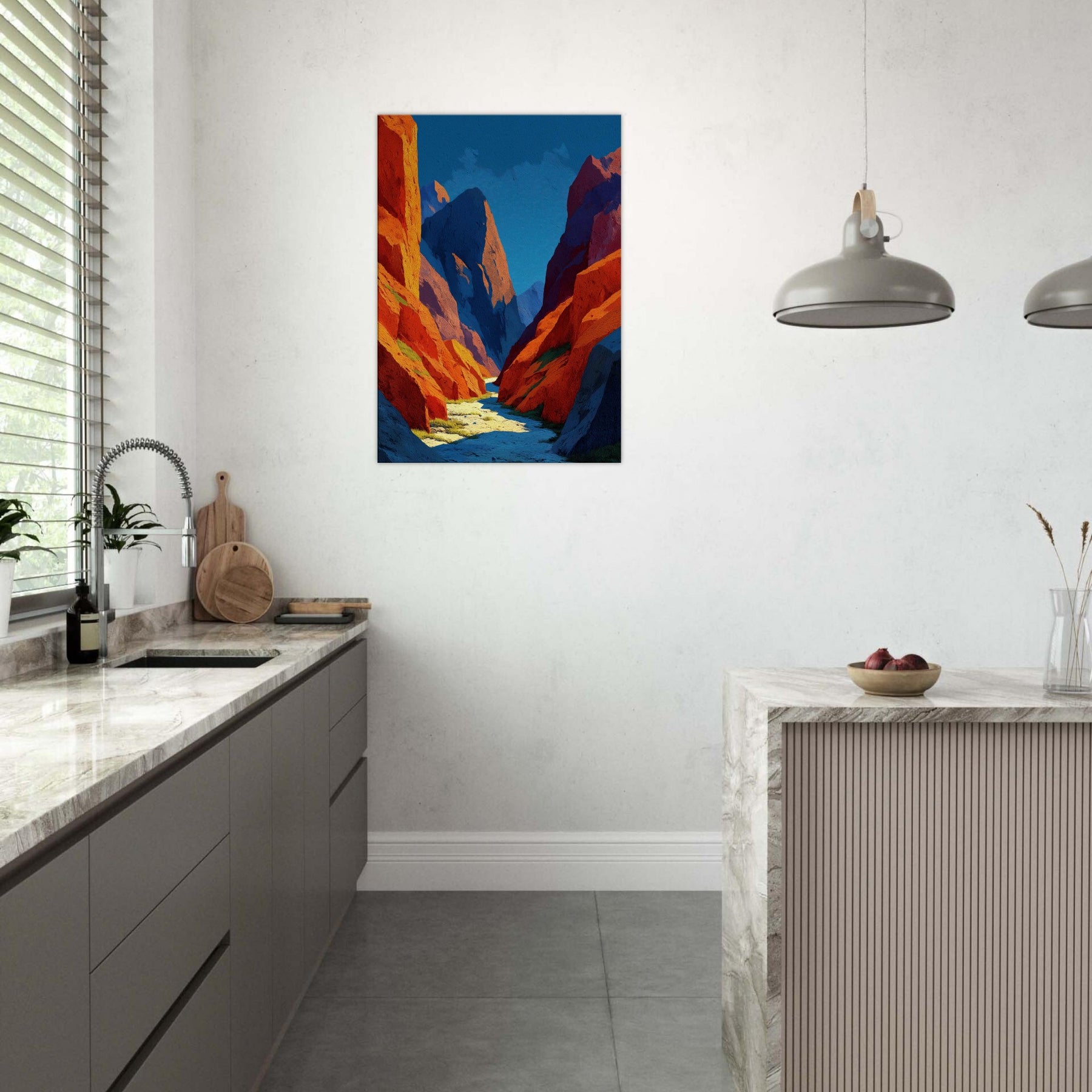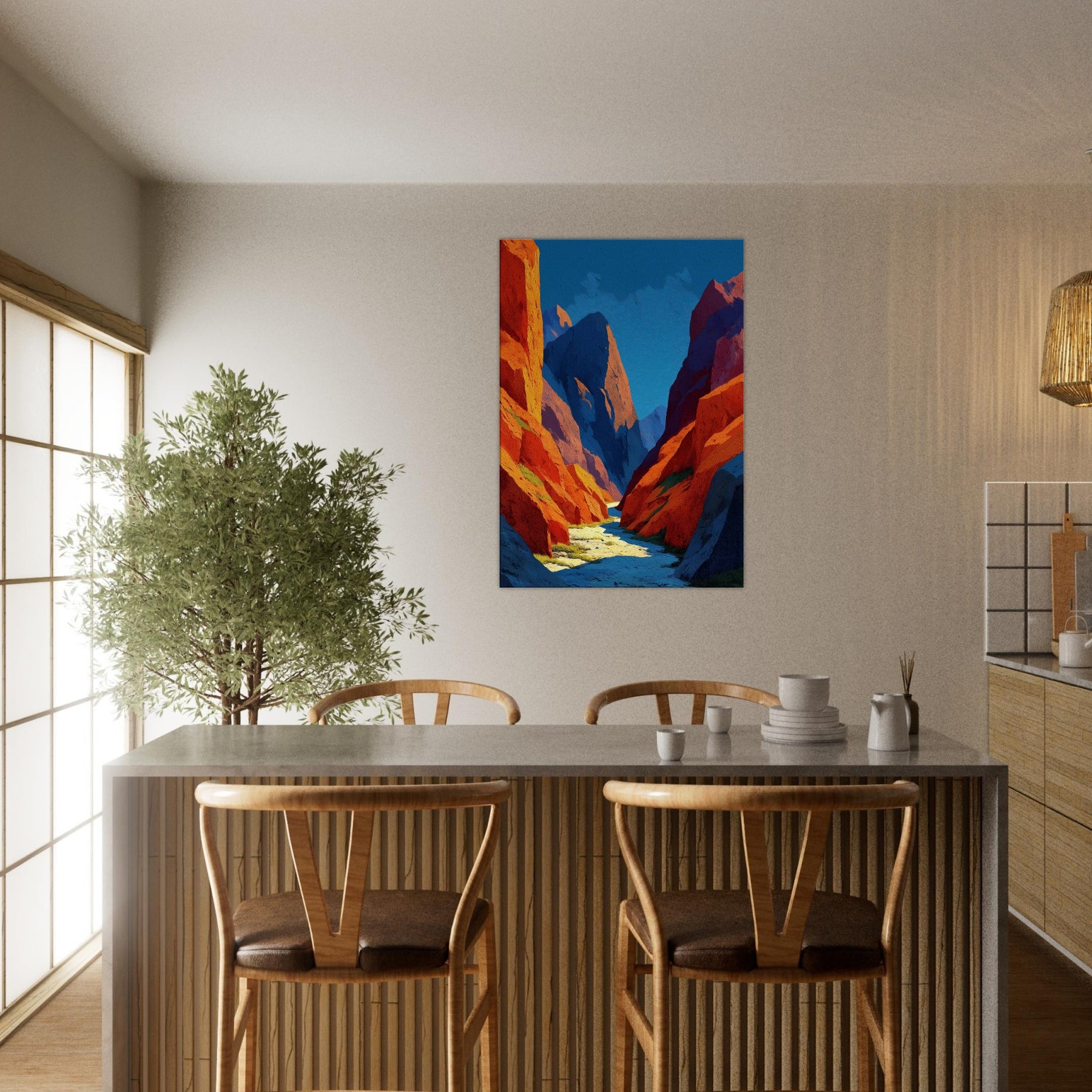 Step into a sunlit Canyon where sandstone flames meet a cool azure sky. This abstract invites stillness and curiosity, guiding the eye along winding light and shadow as if you were wandering a quiet, sun washed gorge. The piece breathes warmth into any room, catching incoming light and revealing new textures with every glance. Framed or hung solo, it softens hard edges while sharpening mood, turning a hallway, living room, or bedroom into a sanctuary of color, breath, and Canyon serenity.