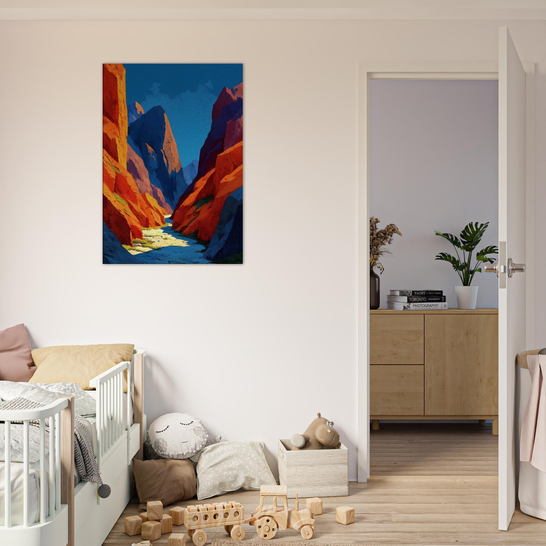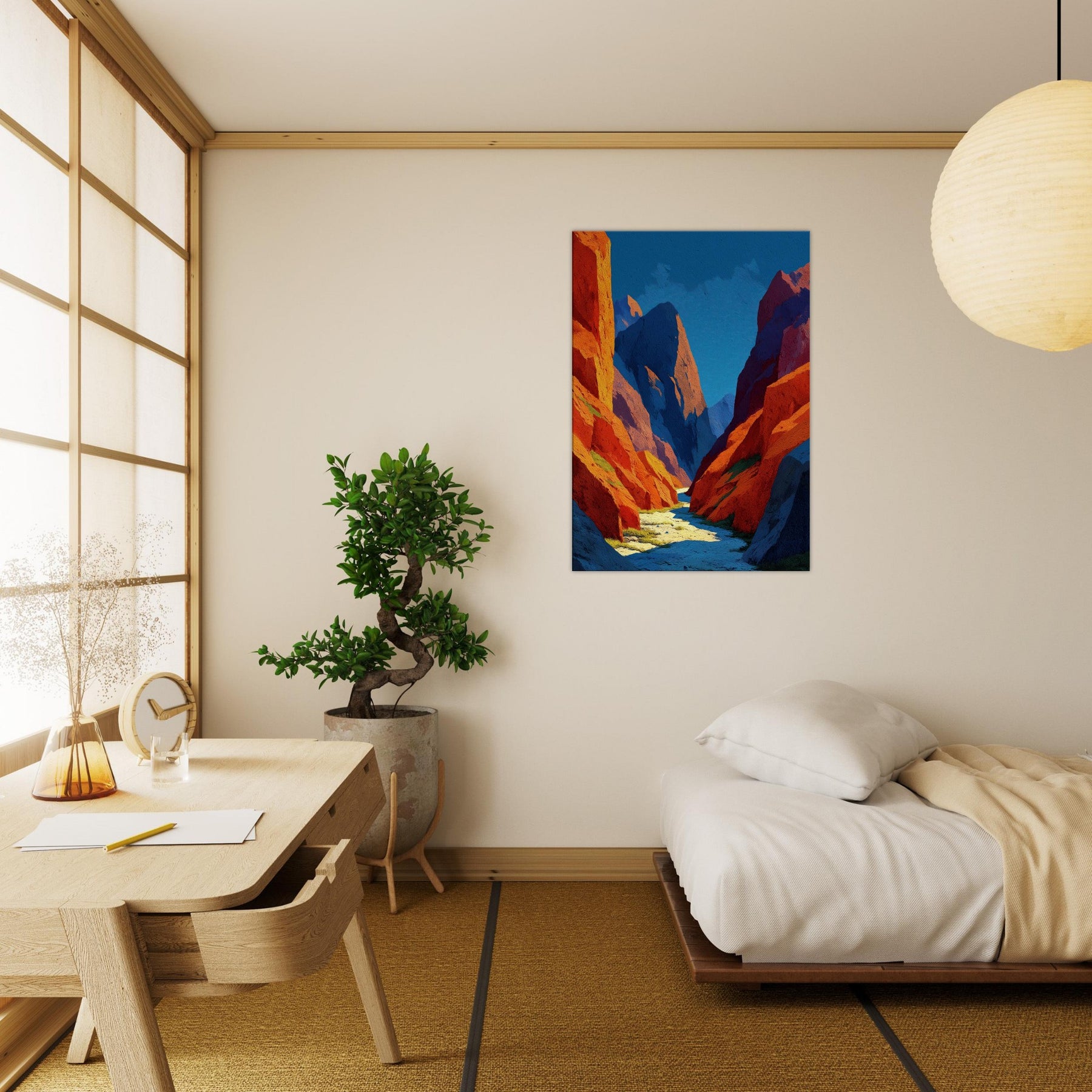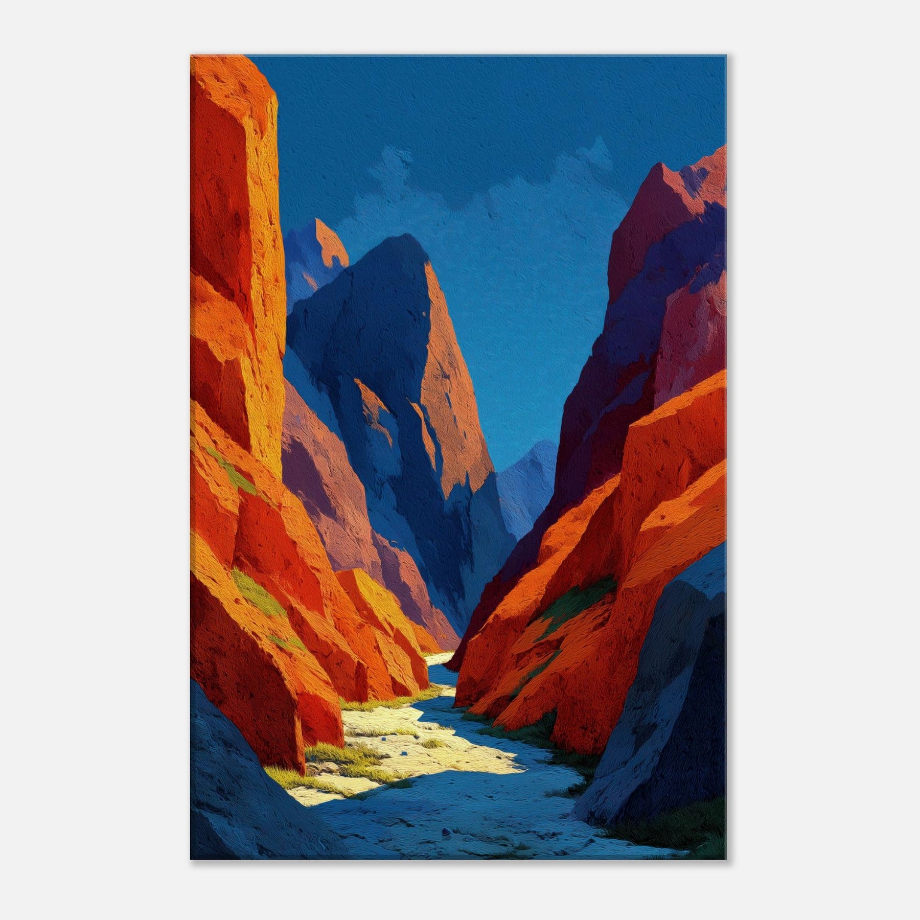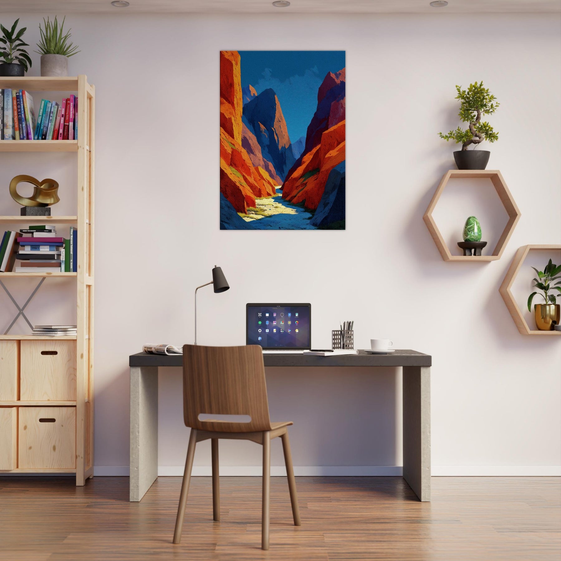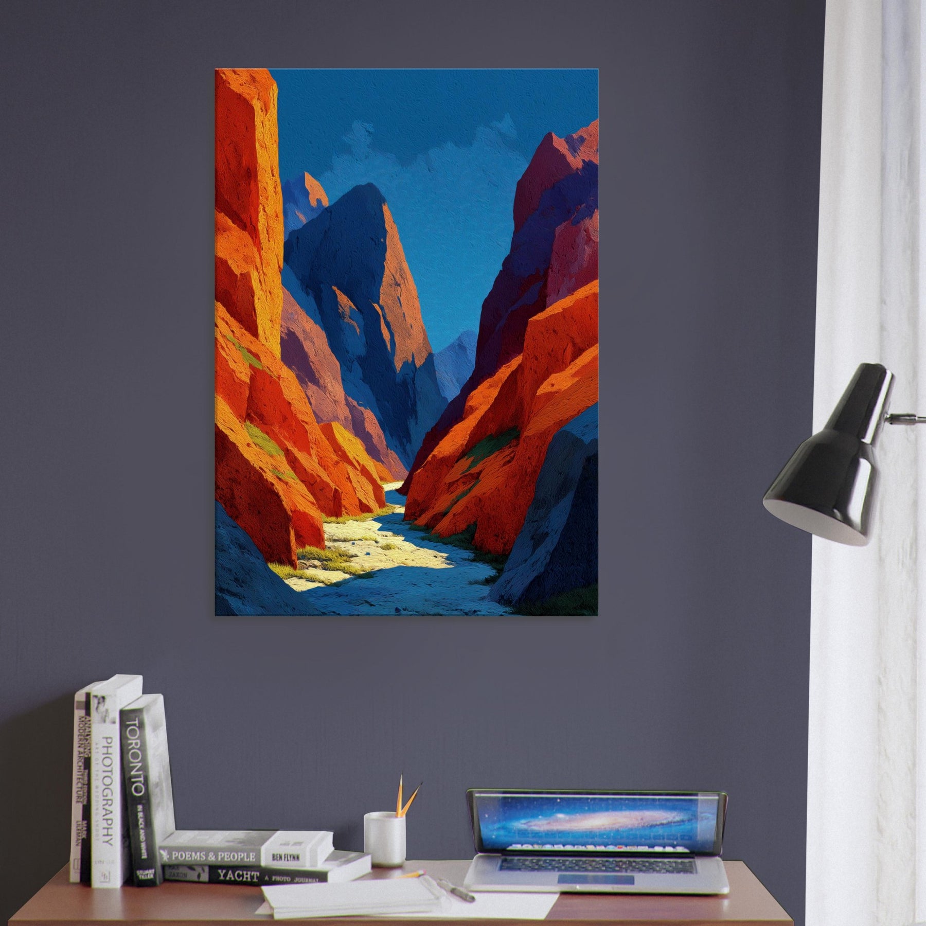 Step into a sunlit Canyon where sandstone flames meet a cool azure sky. This abstract invites stillness and curiosity, guiding the eye along winding light and shadow as if you were wandering a quiet, sun washed gorge. The piece breathes warmth into any room, catching incoming light and revealing new textures with every glance. Framed or hung solo, it softens hard edges while sharpening mood, turning a hallway, living room, or bedroom into a sanctuary of color, breath, and Canyon serenity.