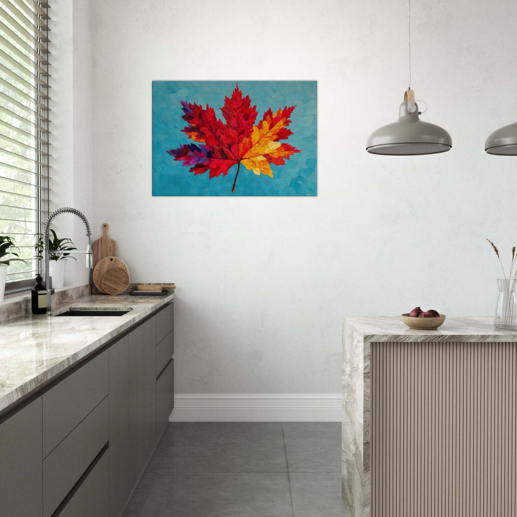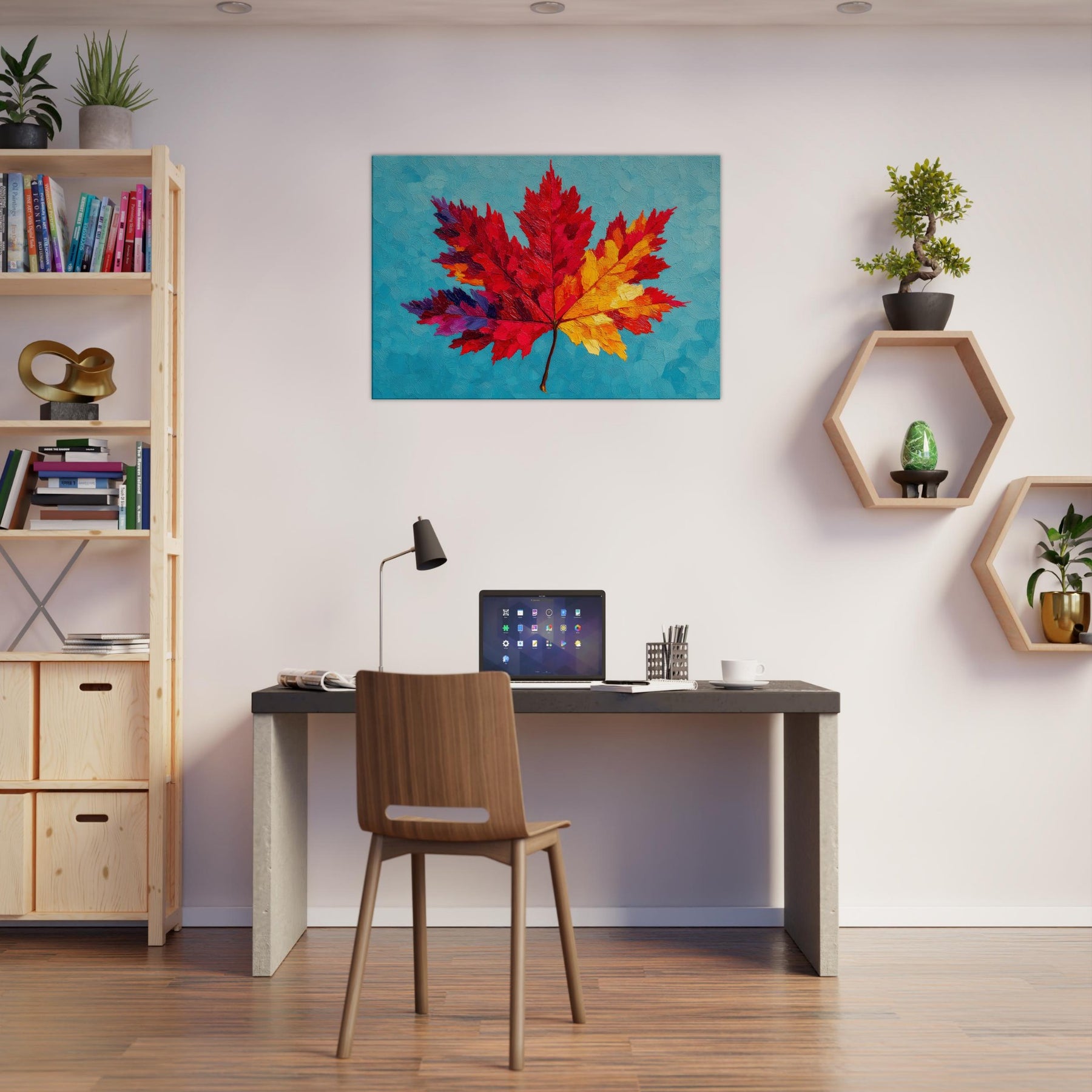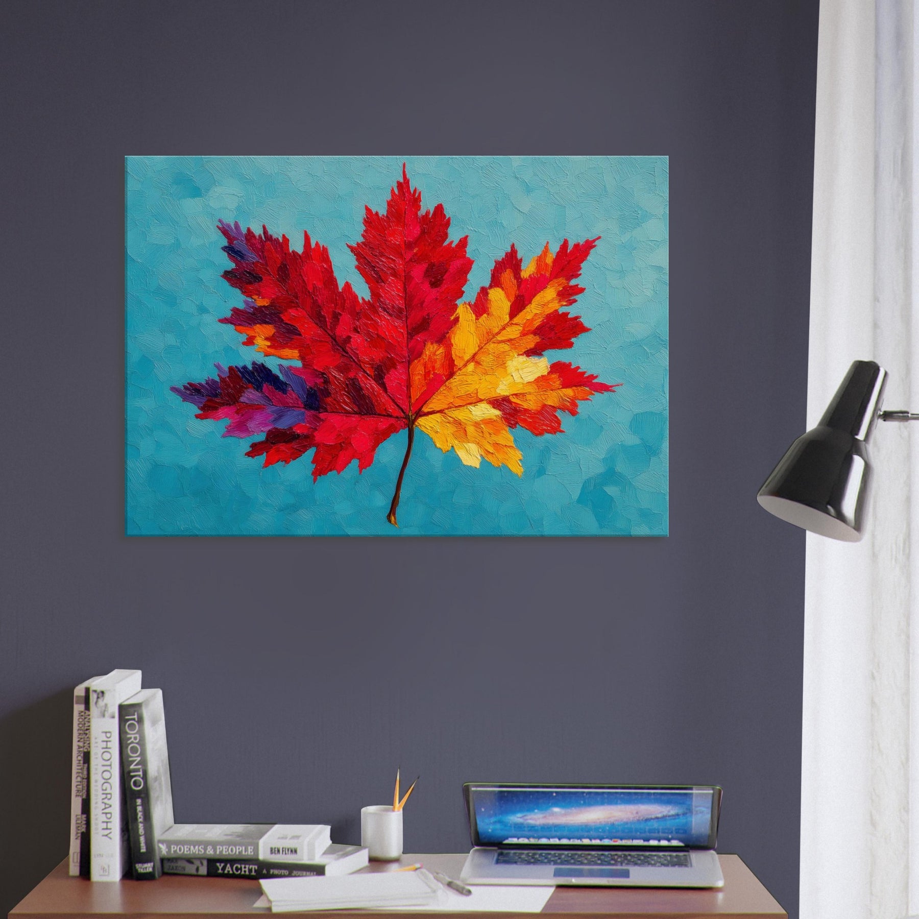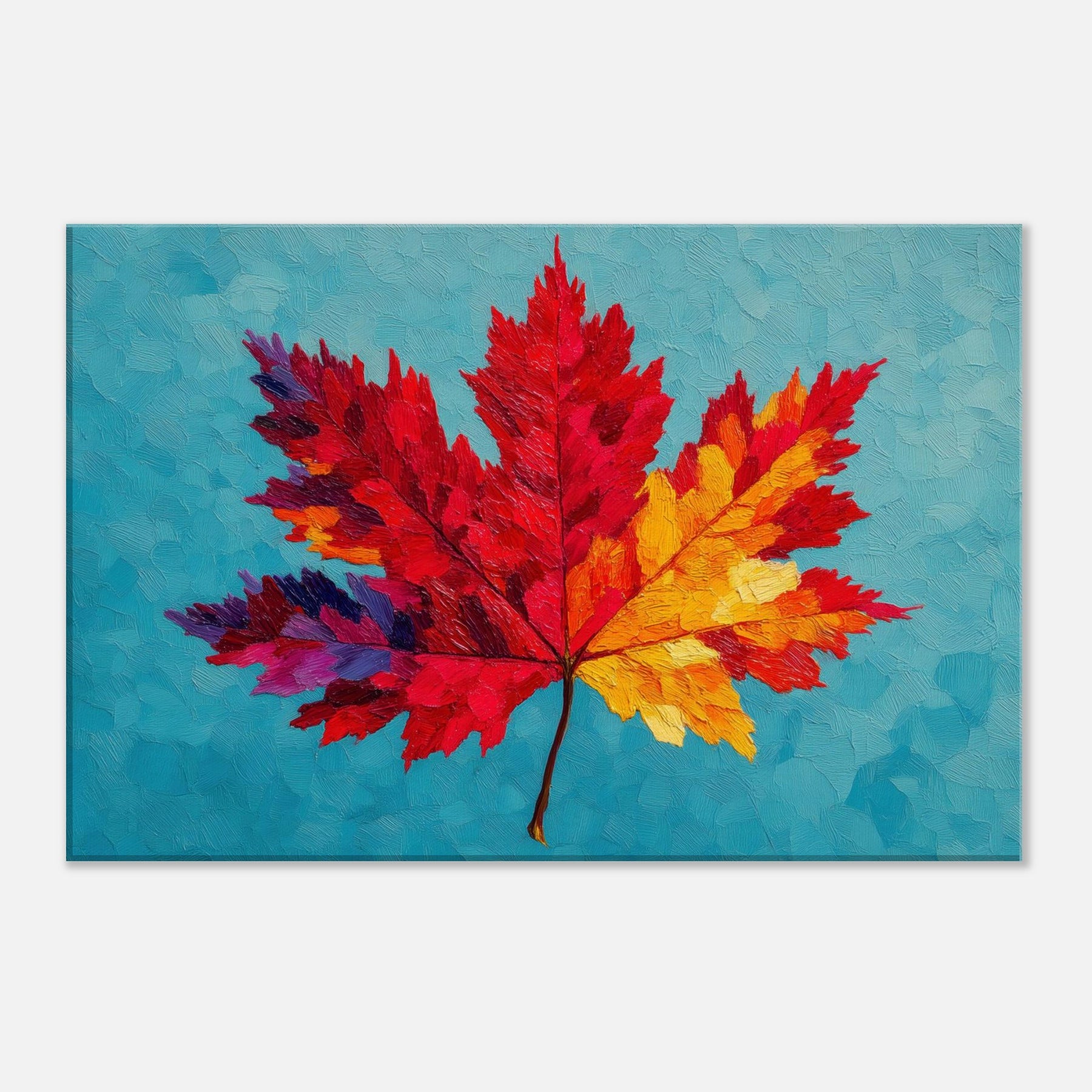 This Maple Leaf explodes in color, a bold abstract interpretation that shifts from ruby to sunlit yellow across its radiant veins. Set against a cool turquoise surface, the layered textures resemble brushed wind and heat, inviting a quiet, meditative gaze. The piece breathes warmth into a room, turning walls into a gallery of seasonal light. It feels both playful and contemplative, a nature inspired anthem for living spaces that crave texture, mood, and a luminous, nature infused focal point.