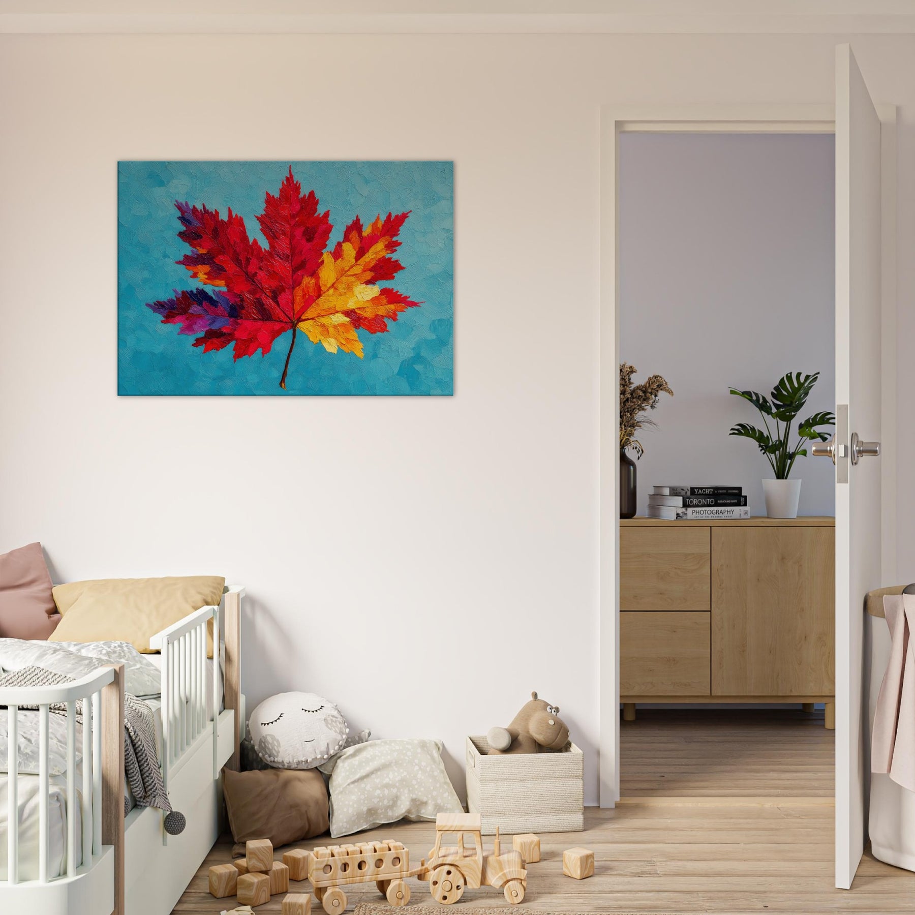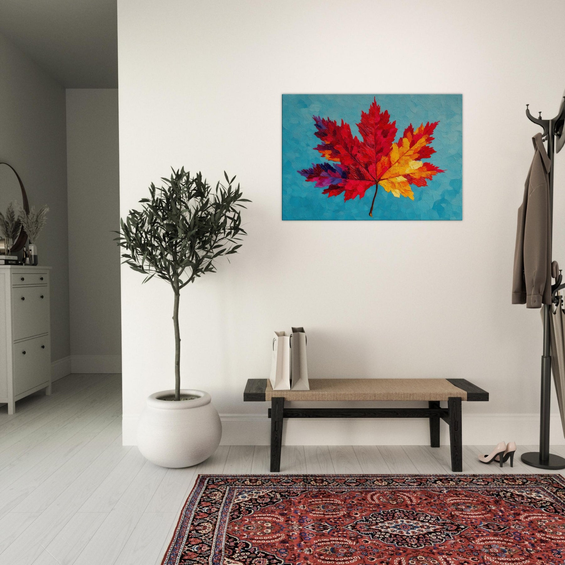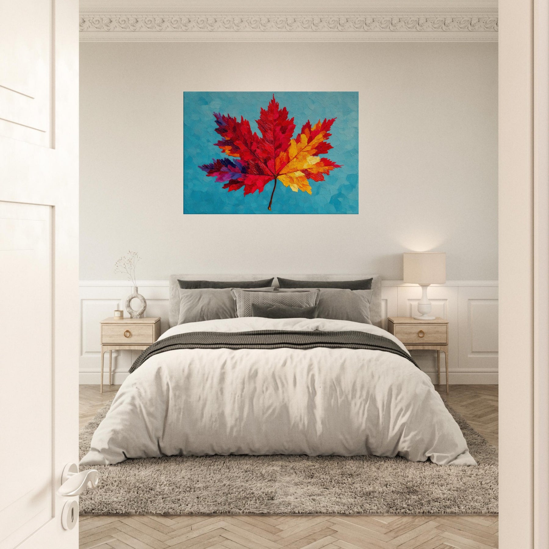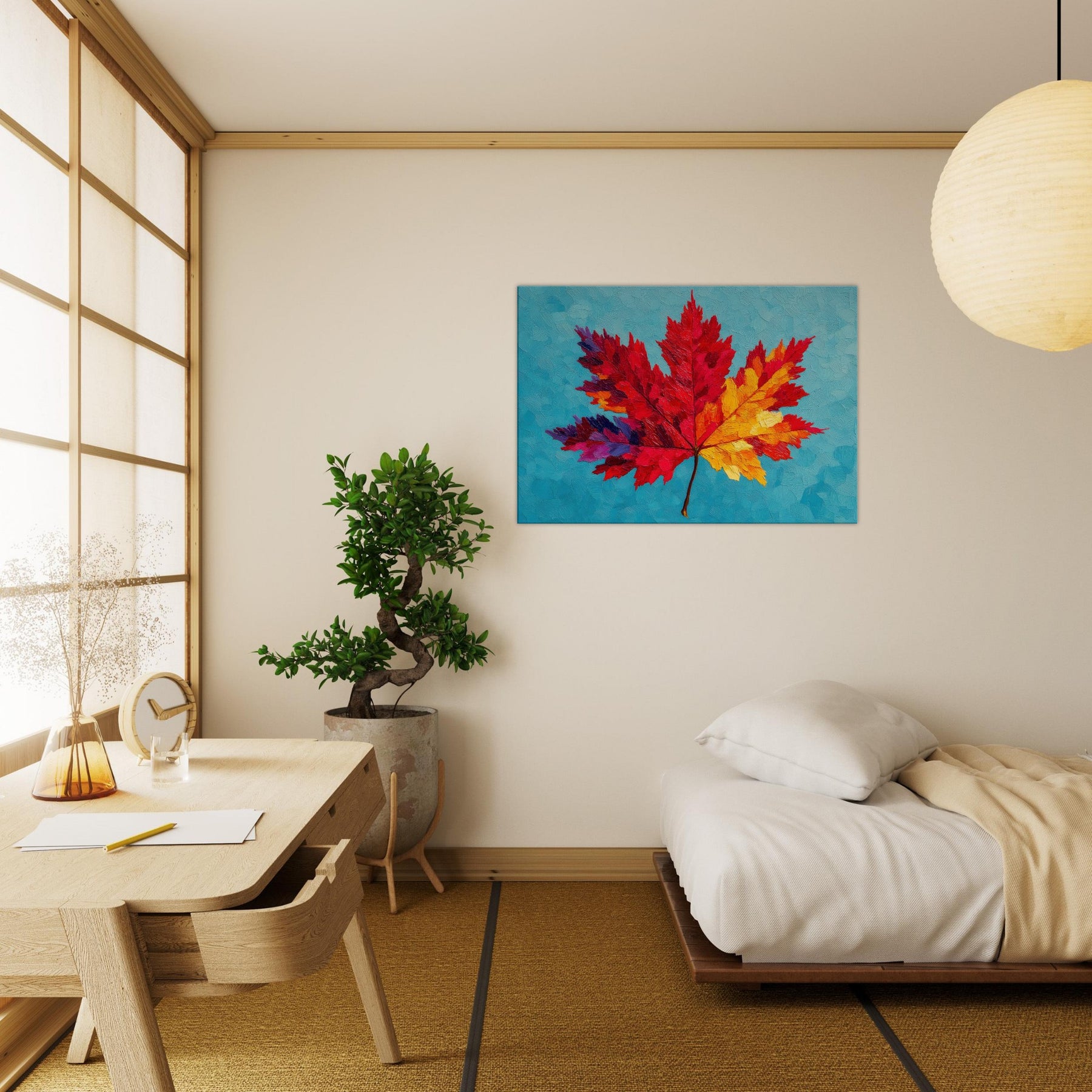 This Maple Leaf explodes in color, a bold abstract interpretation that shifts from ruby to sunlit yellow across its radiant veins. Set against a cool turquoise surface, the layered textures resemble brushed wind and heat, inviting a quiet, meditative gaze. The piece breathes warmth into a room, turning walls into a gallery of seasonal light. It feels both playful and contemplative, a nature inspired anthem for living spaces that crave texture, mood, and a luminous, nature infused focal point.