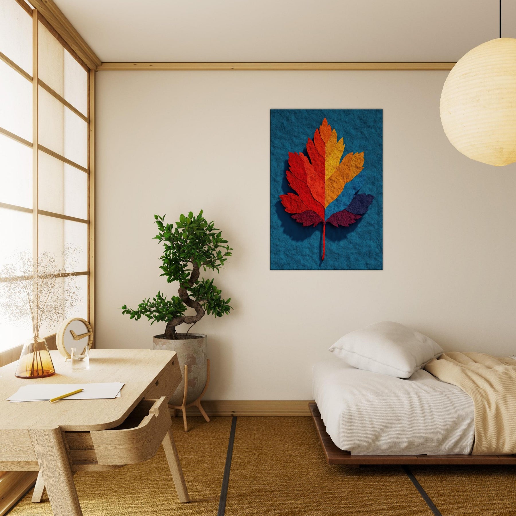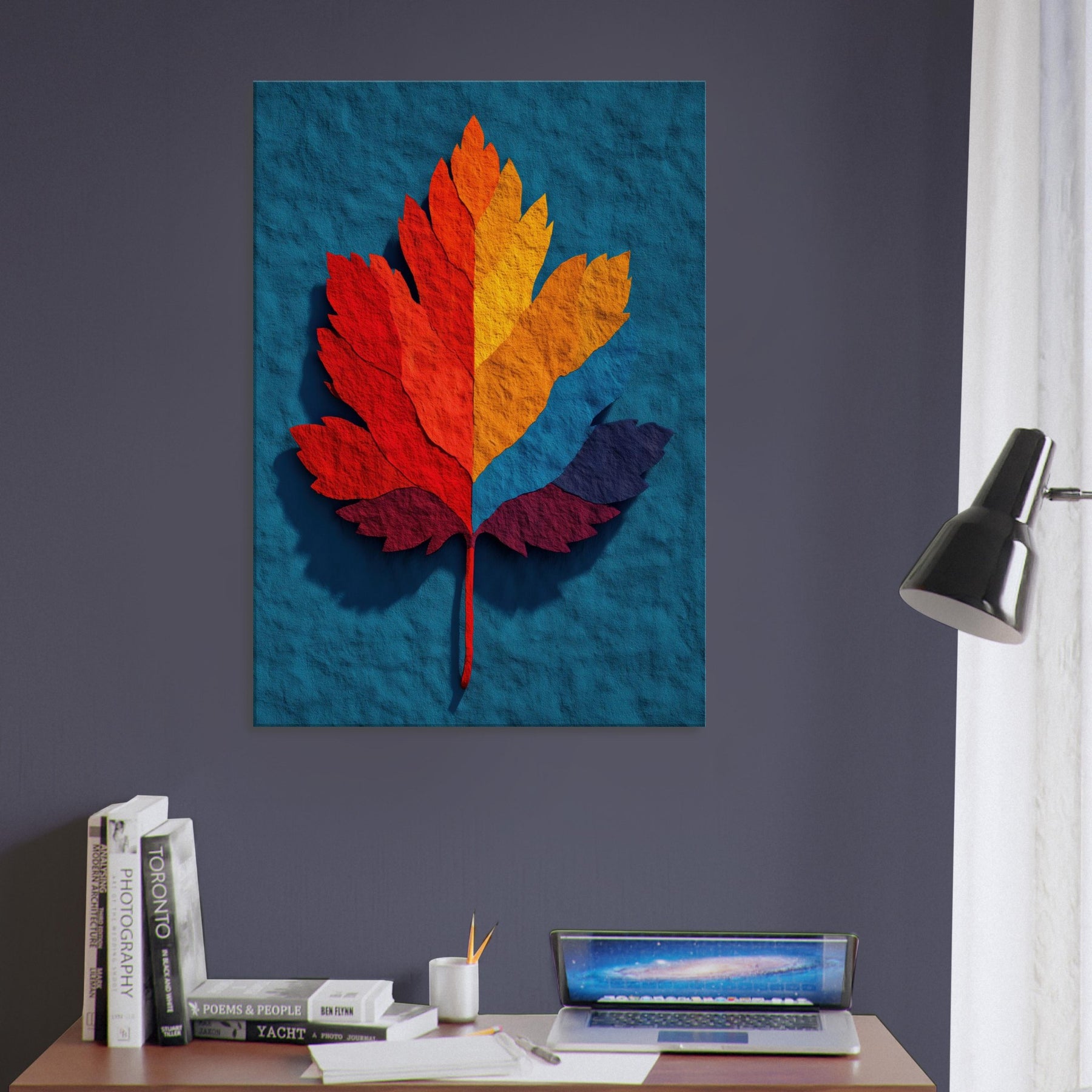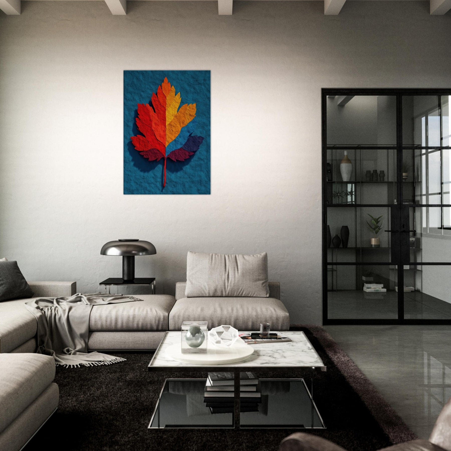 Maple Leaf unfolds across a field of color in this abstract study of nature. The layered silhouette, carved in sunset reds, warm ambers, and deep indigo, invites the room to breathe and dream. Its tactile texture and bold, organic rhythm evoke autumn light spilling over a quiet interior, turning walls into a living . Perfect above a sofa or in a hallway, it adds warmth, movement, and a subtle whisper of connection to the outdoors.