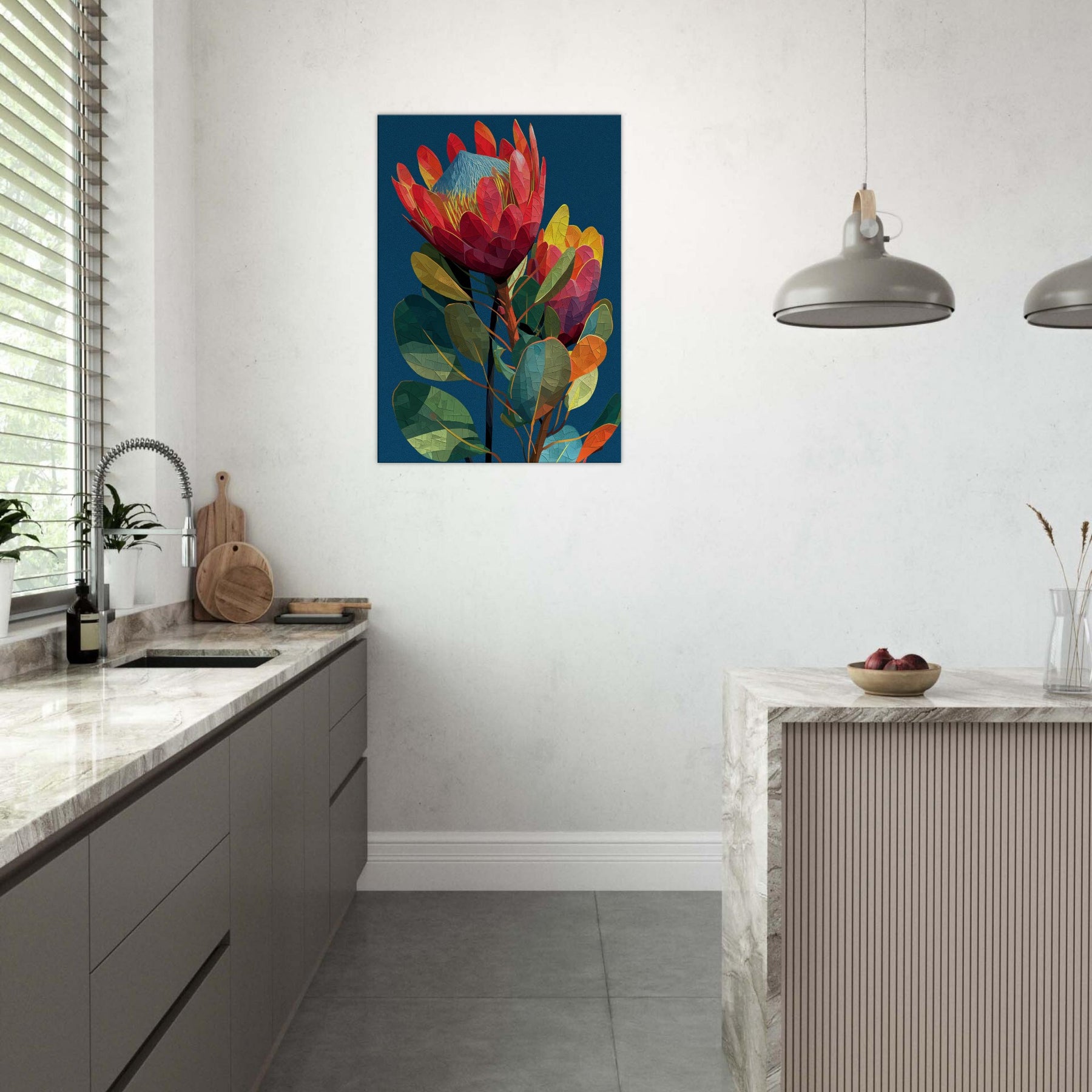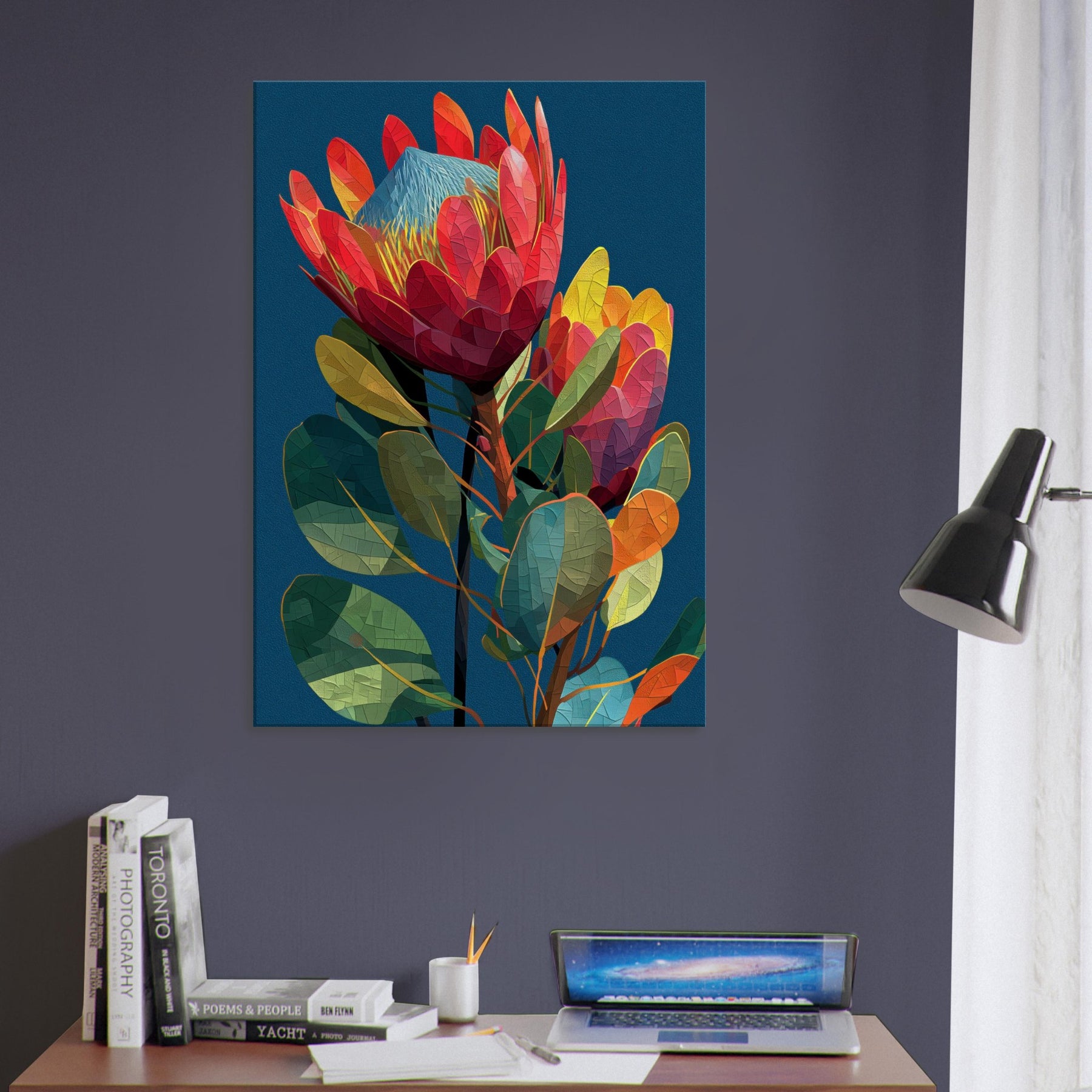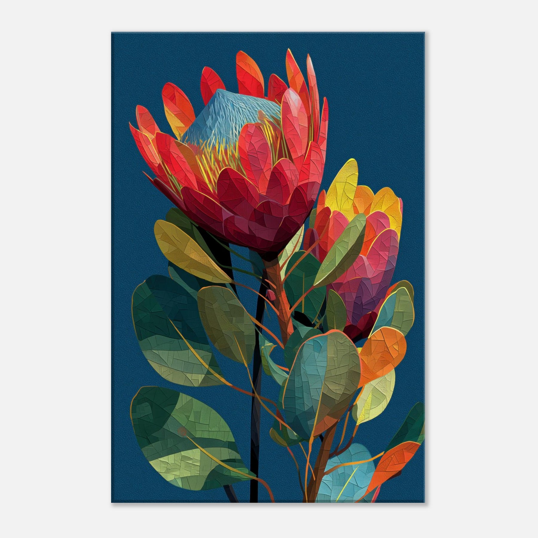 Like a secret garden captured in motion, this Protea blossoms in radiant, geometric facets that glow against a midnight blue backdrop. The abstract arrangement invites the eye to wander along curved stems and prismatic petals, evoking a warm breeze and the scent of rain on warm earth. In a living room, the piece becomes a focal point of color and texture, grounding airy spaces with lush greens, coral reds, and sunlit yellows. It whispers elegance while inviting quiet reflection and everyday wonder.