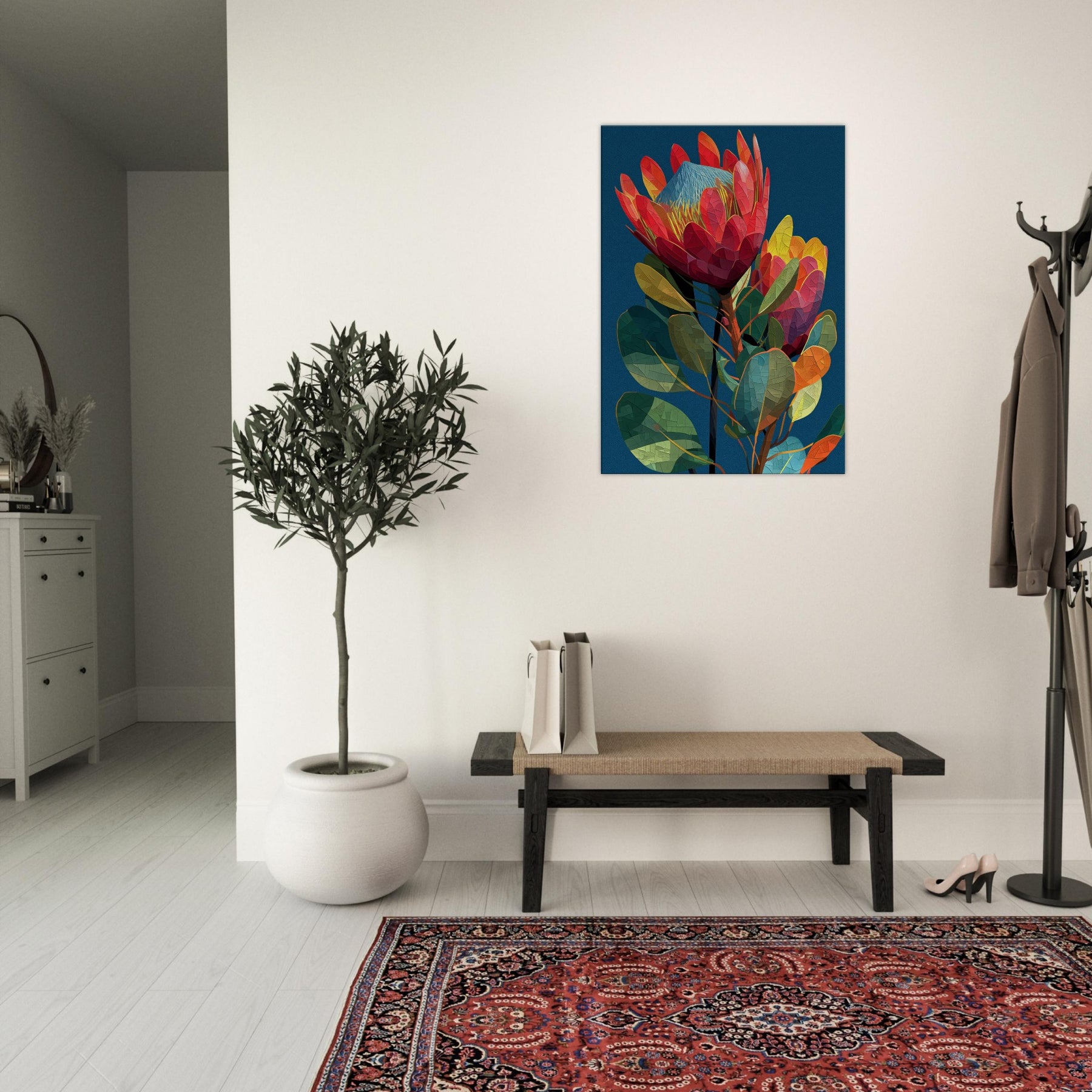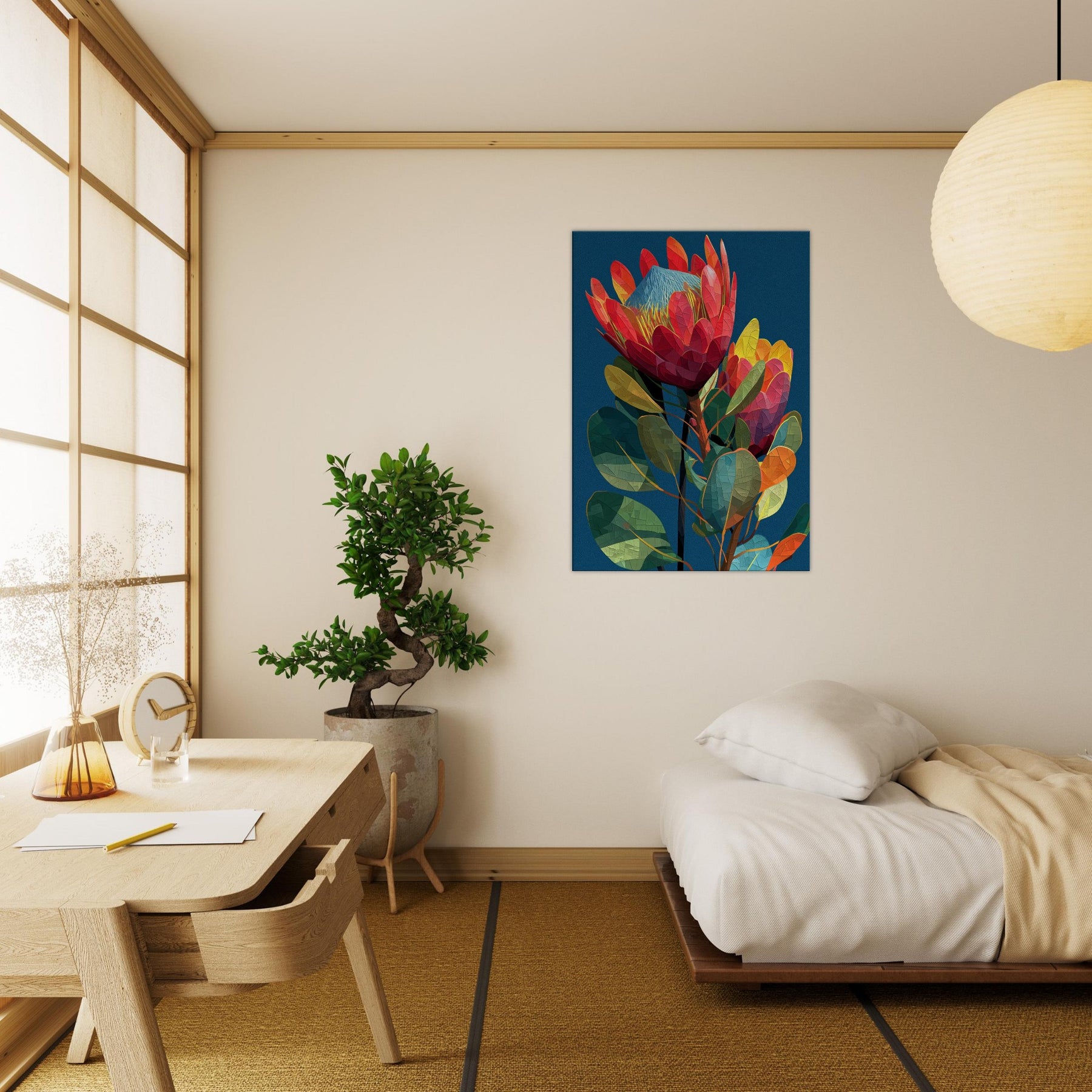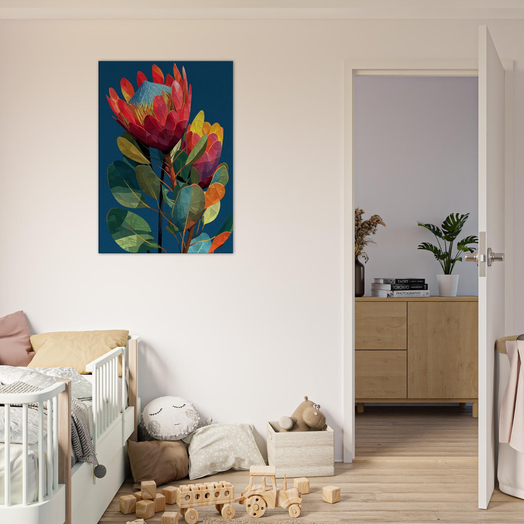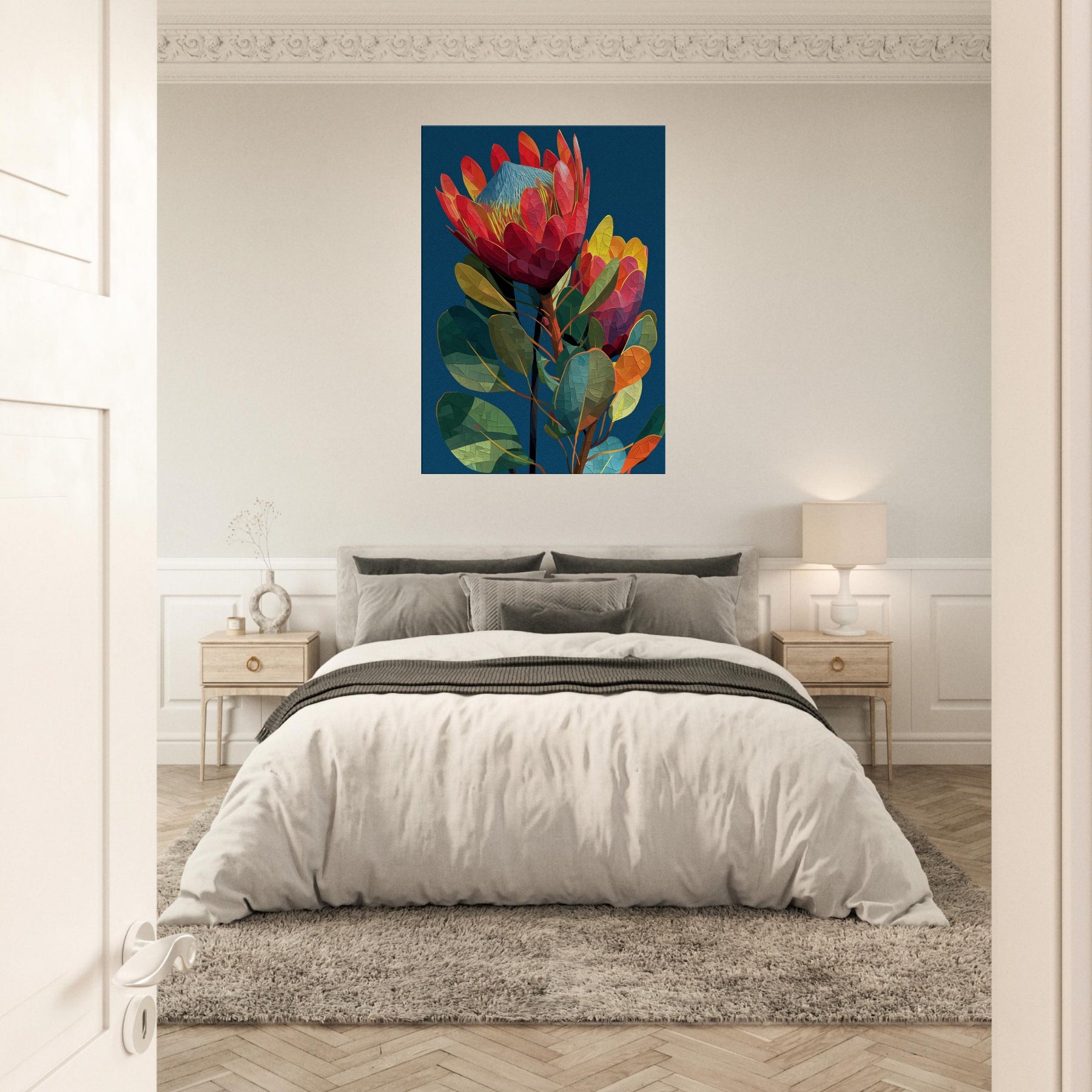 Like a secret garden captured in motion, this Protea blossoms in radiant, geometric facets that glow against a midnight blue backdrop. The abstract arrangement invites the eye to wander along curved stems and prismatic petals, evoking a warm breeze and the scent of rain on warm earth. In a living room, the piece becomes a focal point of color and texture, grounding airy spaces with lush greens, coral reds, and sunlit yellows. It whispers elegance while inviting quiet reflection and everyday wonder.