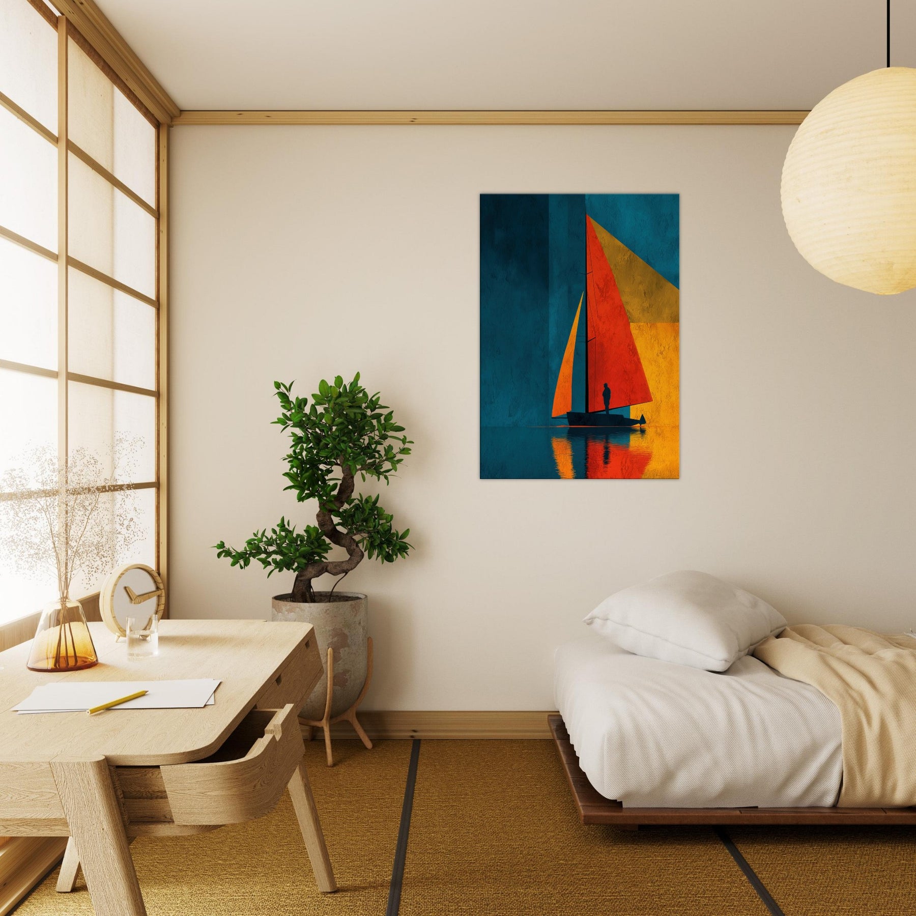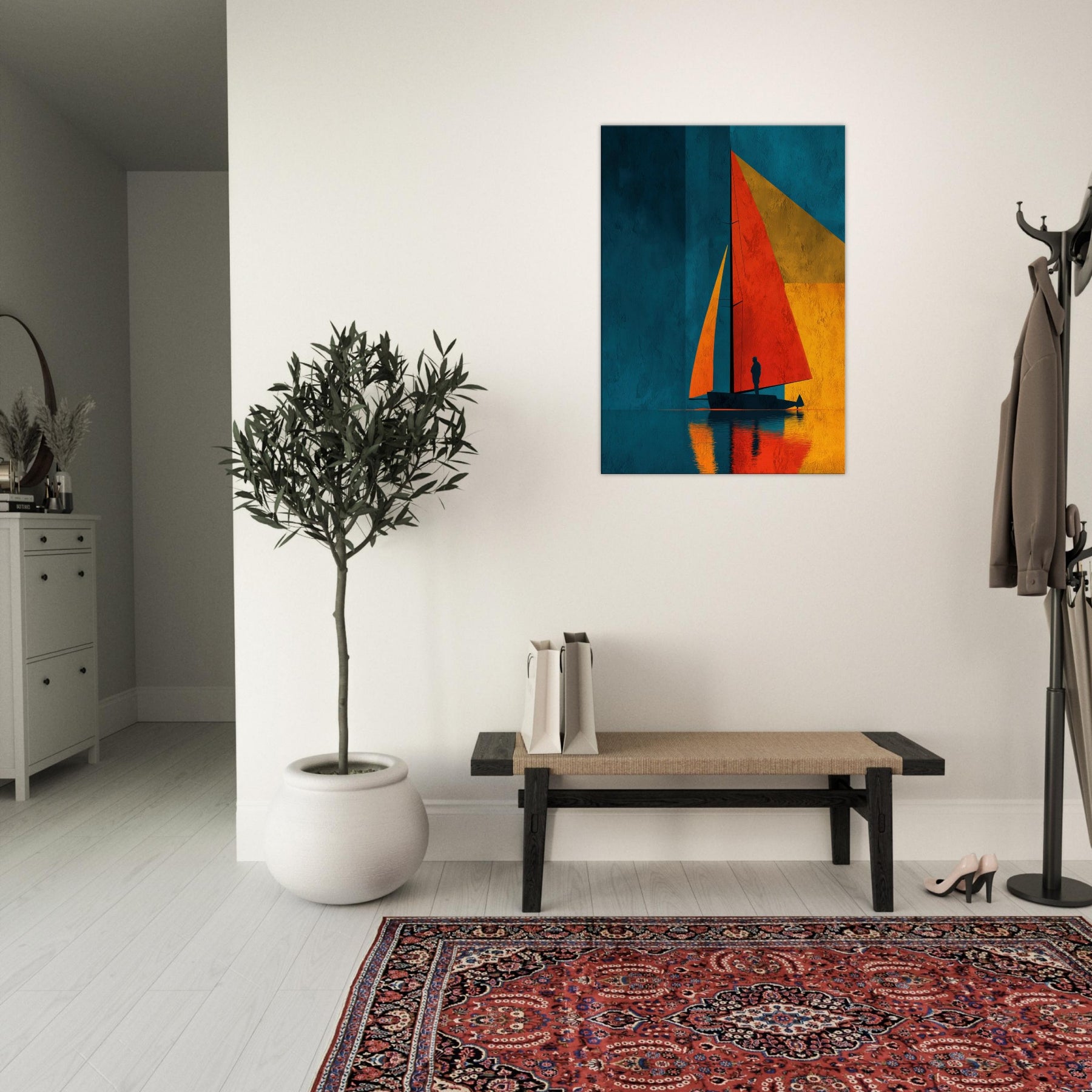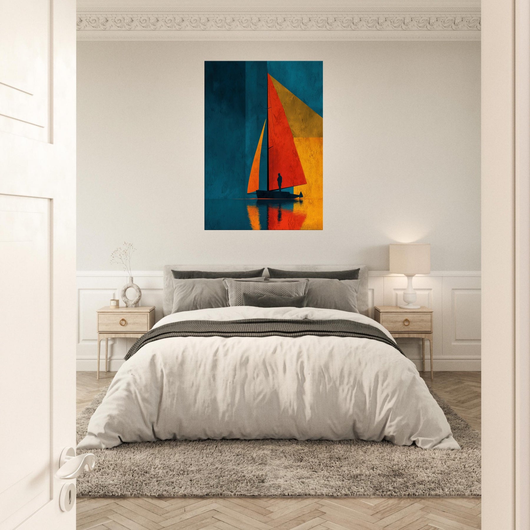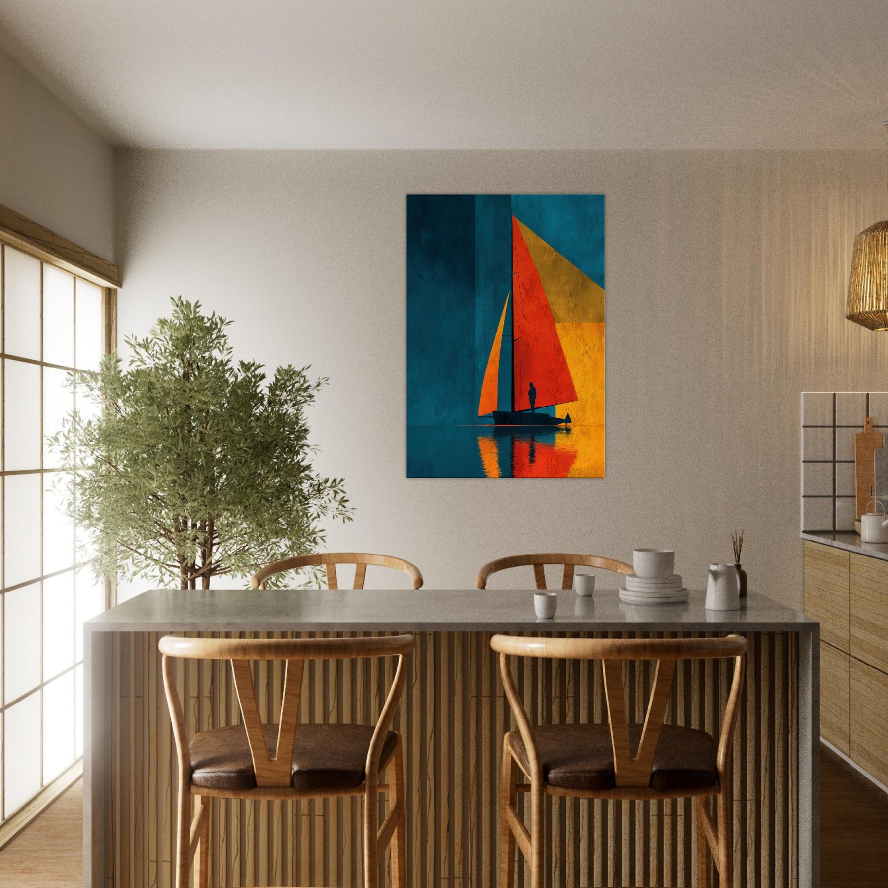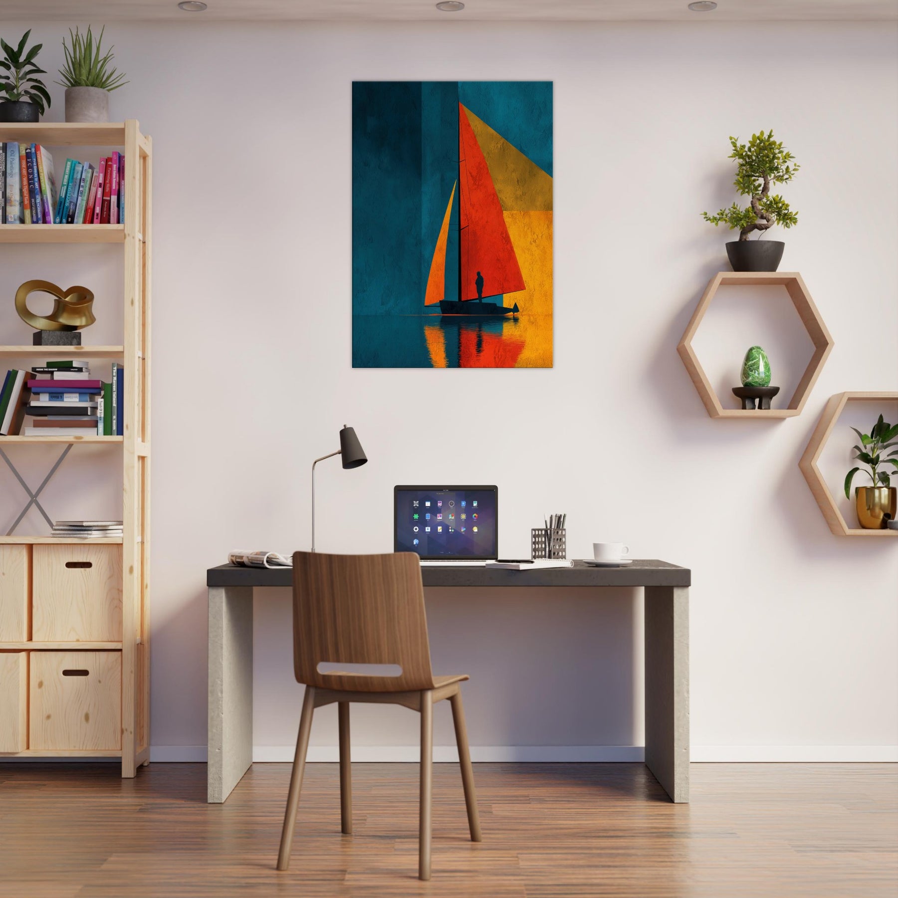 The Sailboat Silhouette glides through a harbor of teal and gold, its sails a blaze of orange and crimson against a quiet, ink blue sea. This evocative piece invites calm and contemplation, conjuring sea breeze and sunset light with a single, elegant line. In a living room or bedroom, it warms walls with a magnetic glow, converting everyday space into a harbor of memory and quiet adventure. A statement work that enhances ambience without shouting for attention.