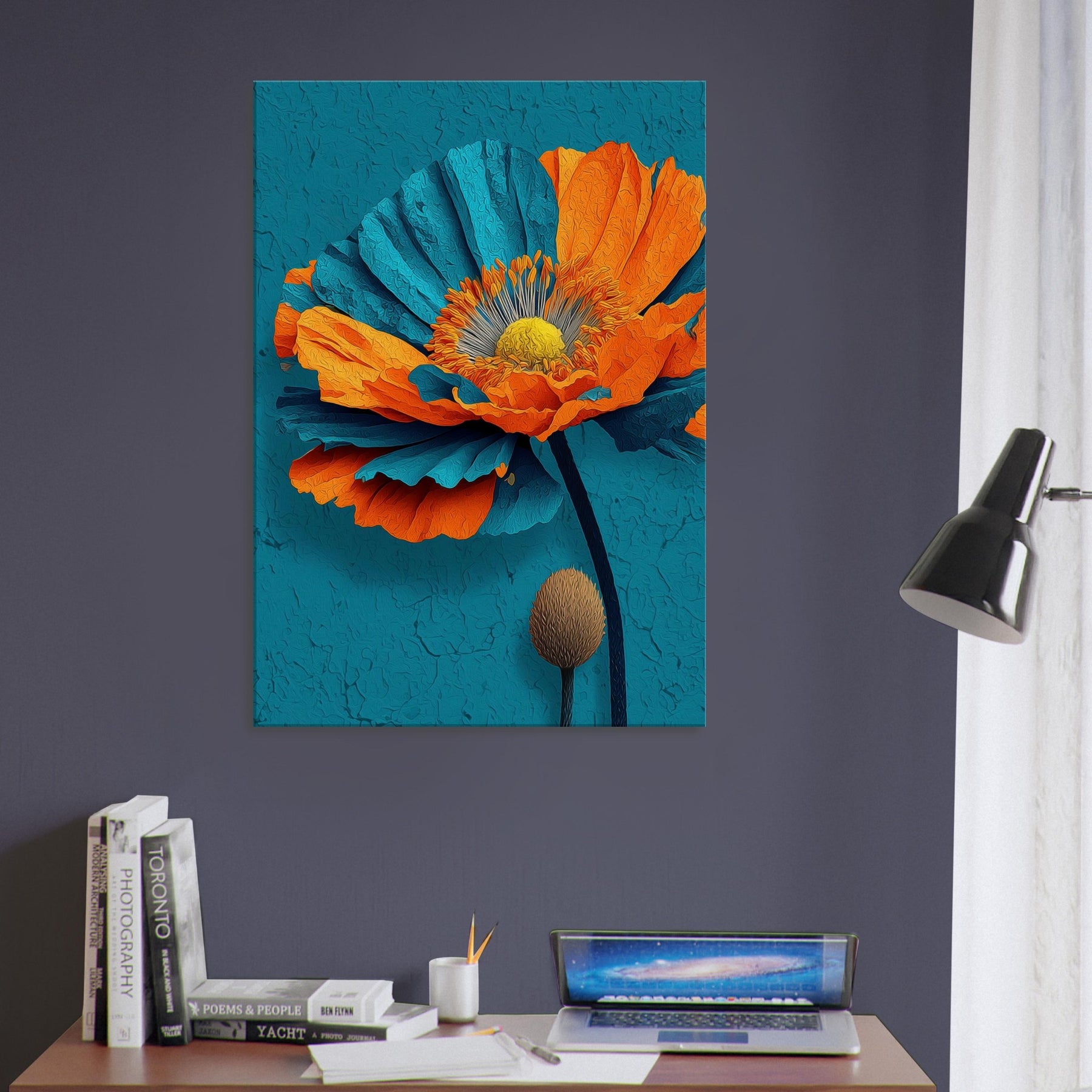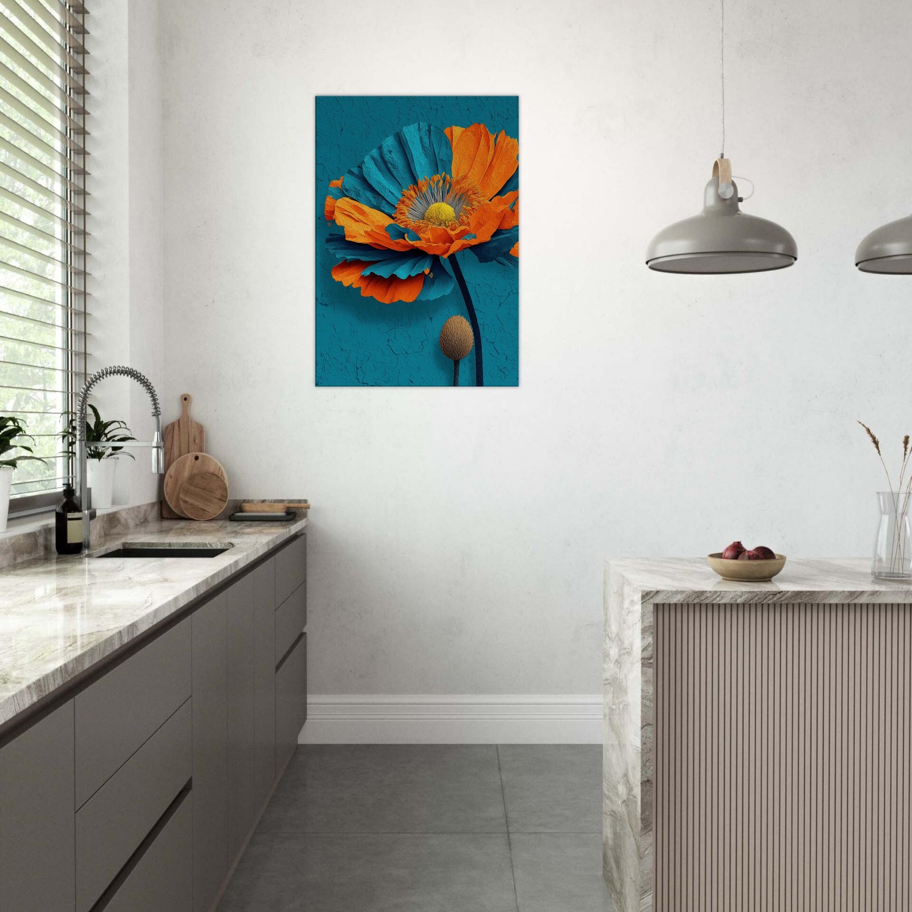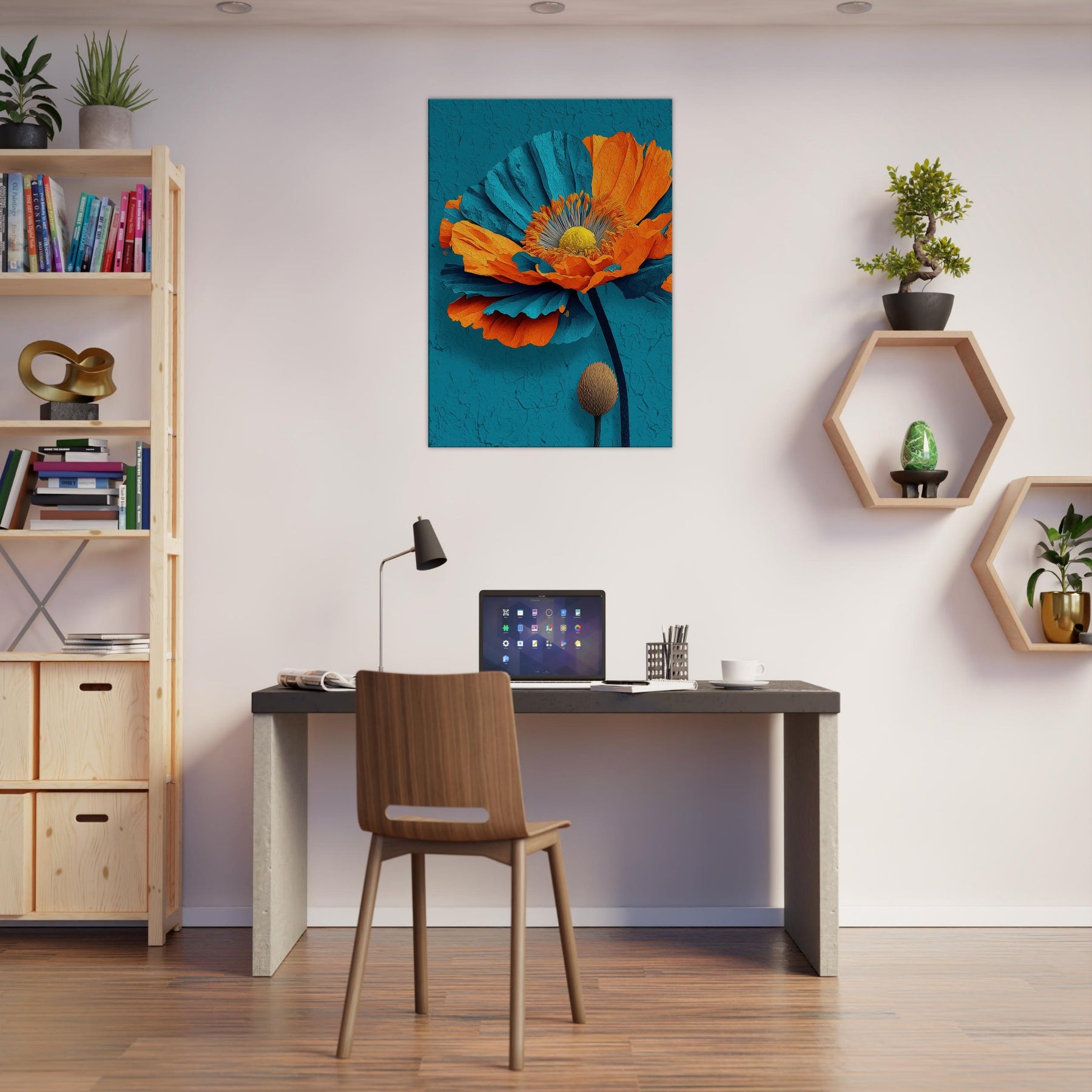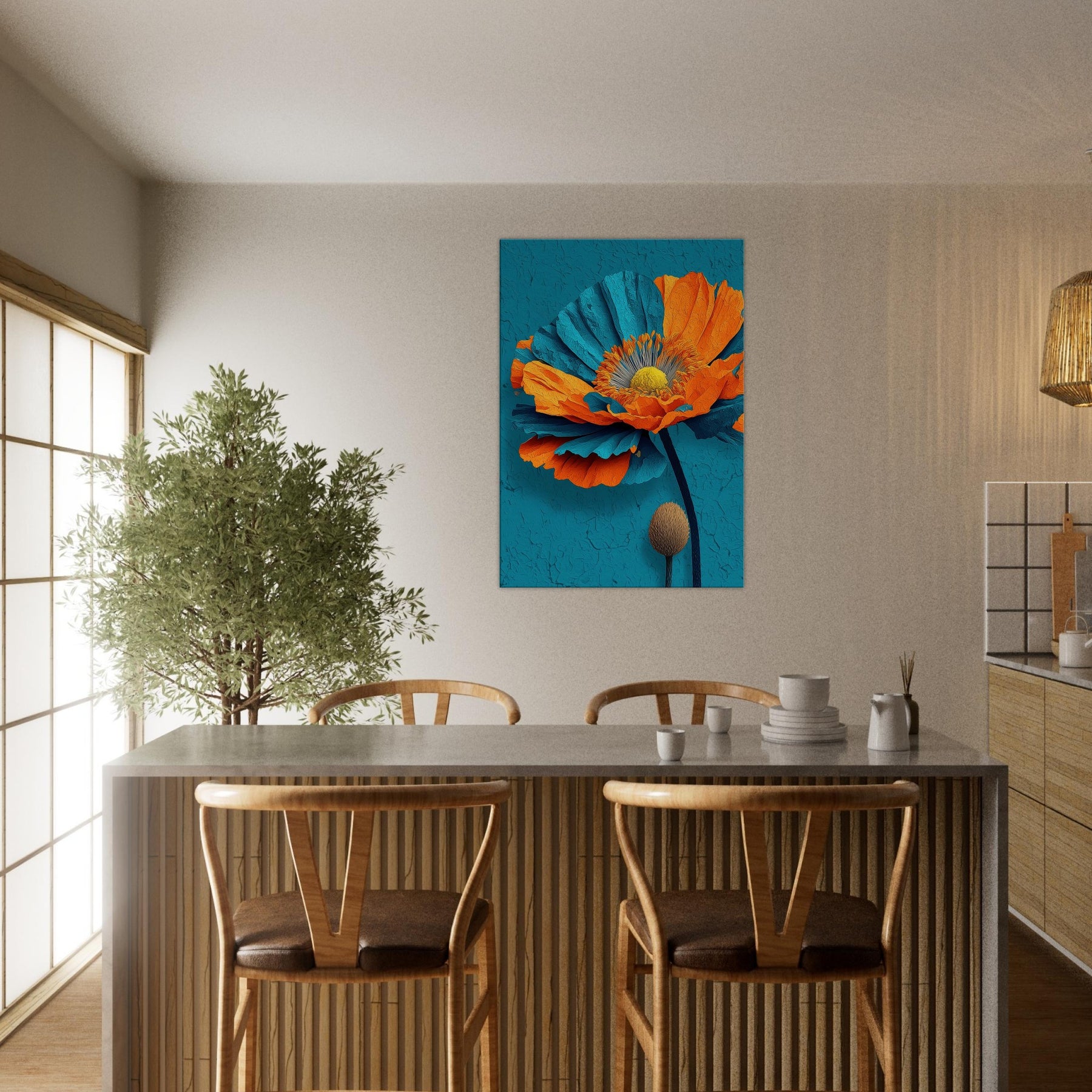 The Anemone bursts from a field of teal in this abstract study, where color spills and texture breathes. The orange petals curl with quiet gravity, while the sculpted surface invites a tactile sense of breeze and light. This piece exudes modern calm and luminous energy, perfect for a sunlit hallway or contemplative living room. It transforms walls into a window for nature’s quiet drama, combining organic form with contemporary abstraction to heighten mood and conversation.