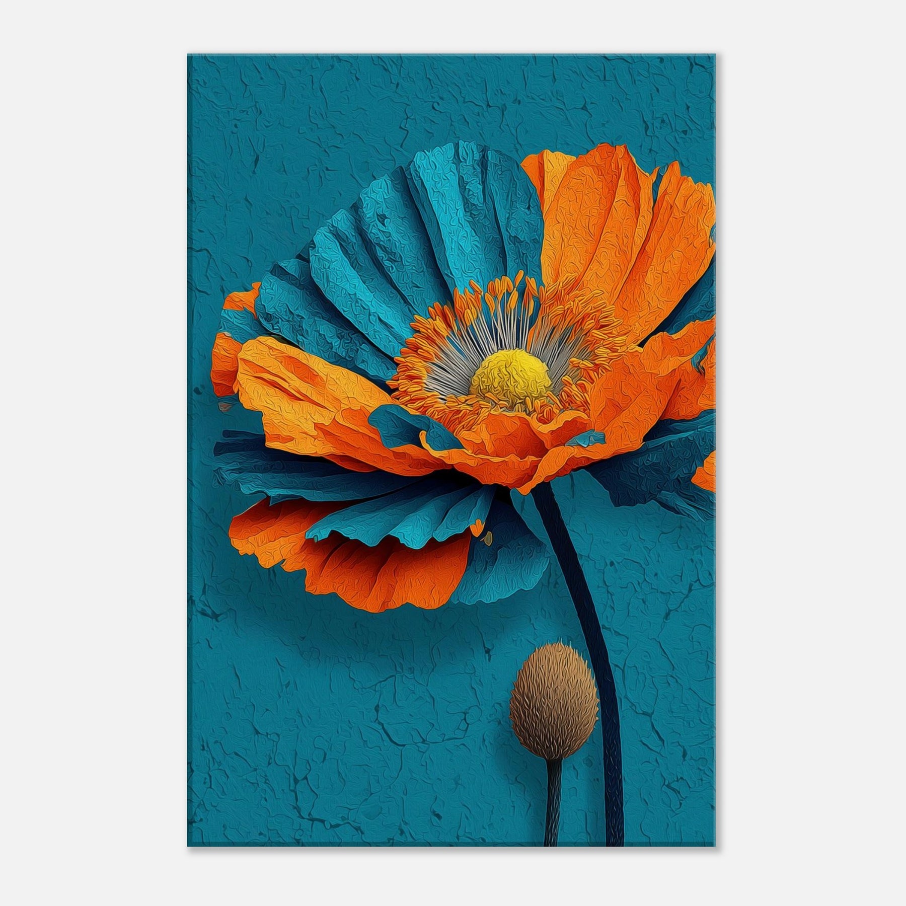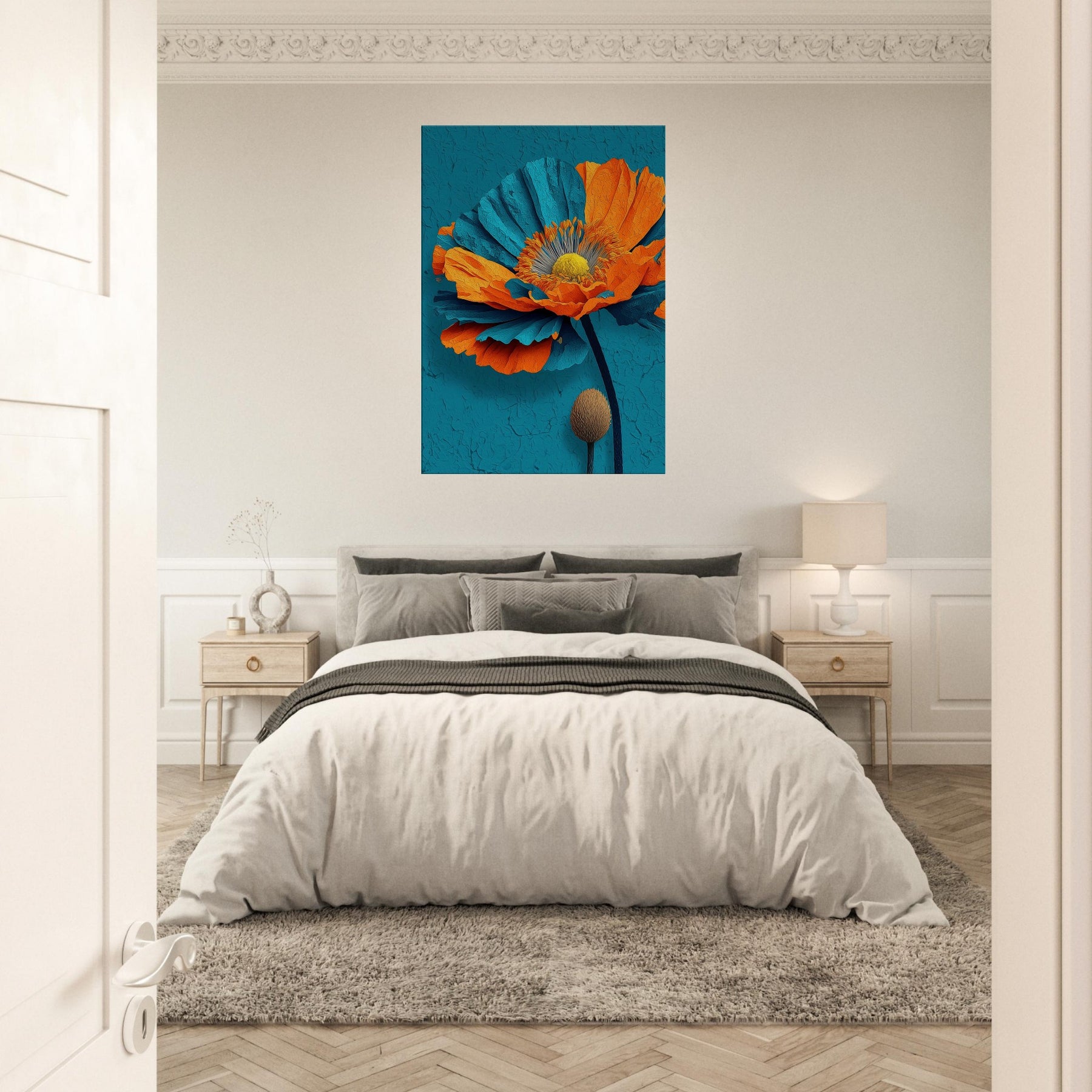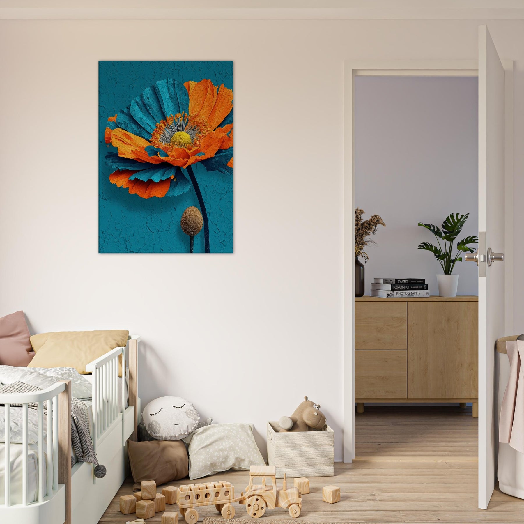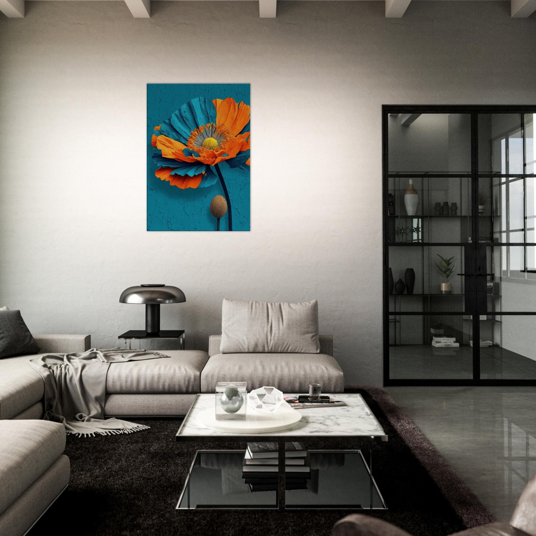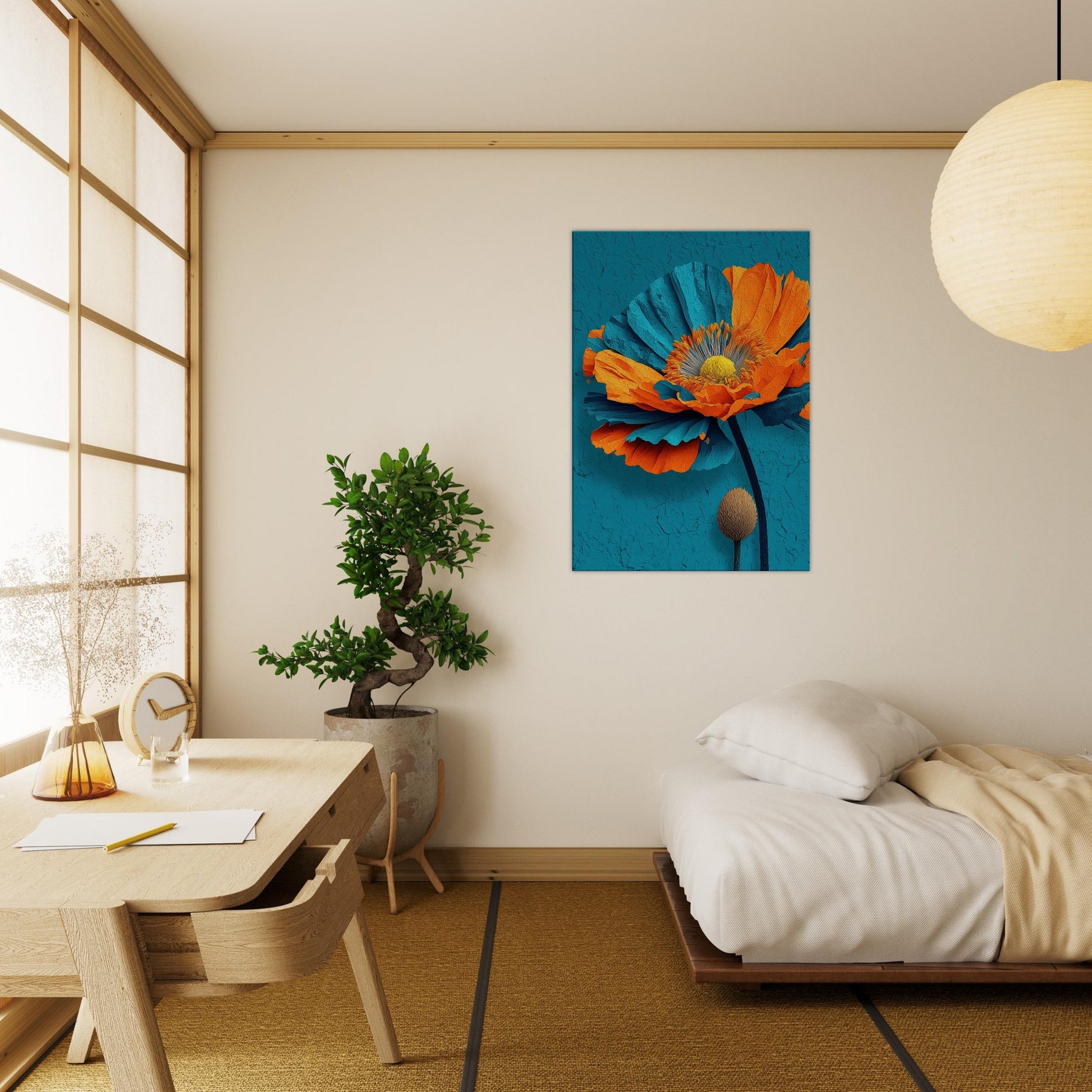 The Anemone bursts from a field of teal in this abstract study, where color spills and texture breathes. The orange petals curl with quiet gravity, while the sculpted surface invites a tactile sense of breeze and light. This piece exudes modern calm and luminous energy, perfect for a sunlit hallway or contemplative living room. It transforms walls into a window for nature’s quiet drama, combining organic form with contemporary abstraction to heighten mood and conversation.