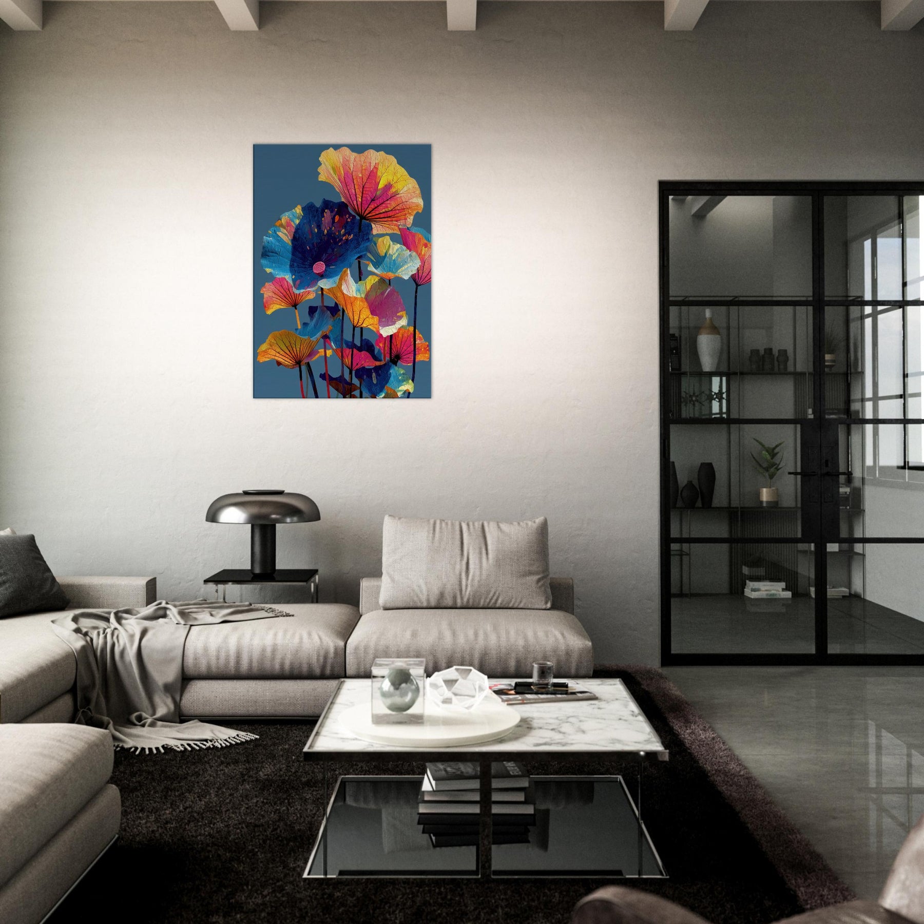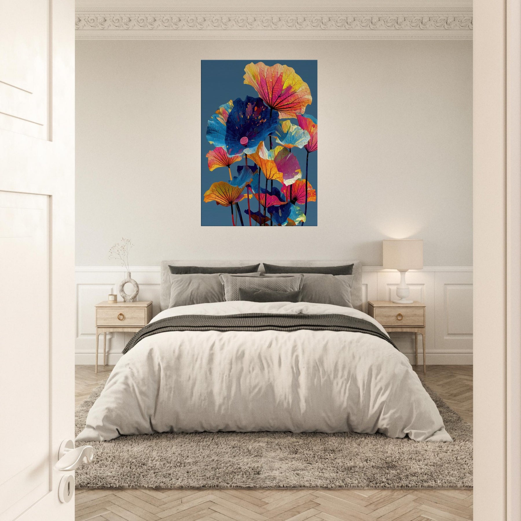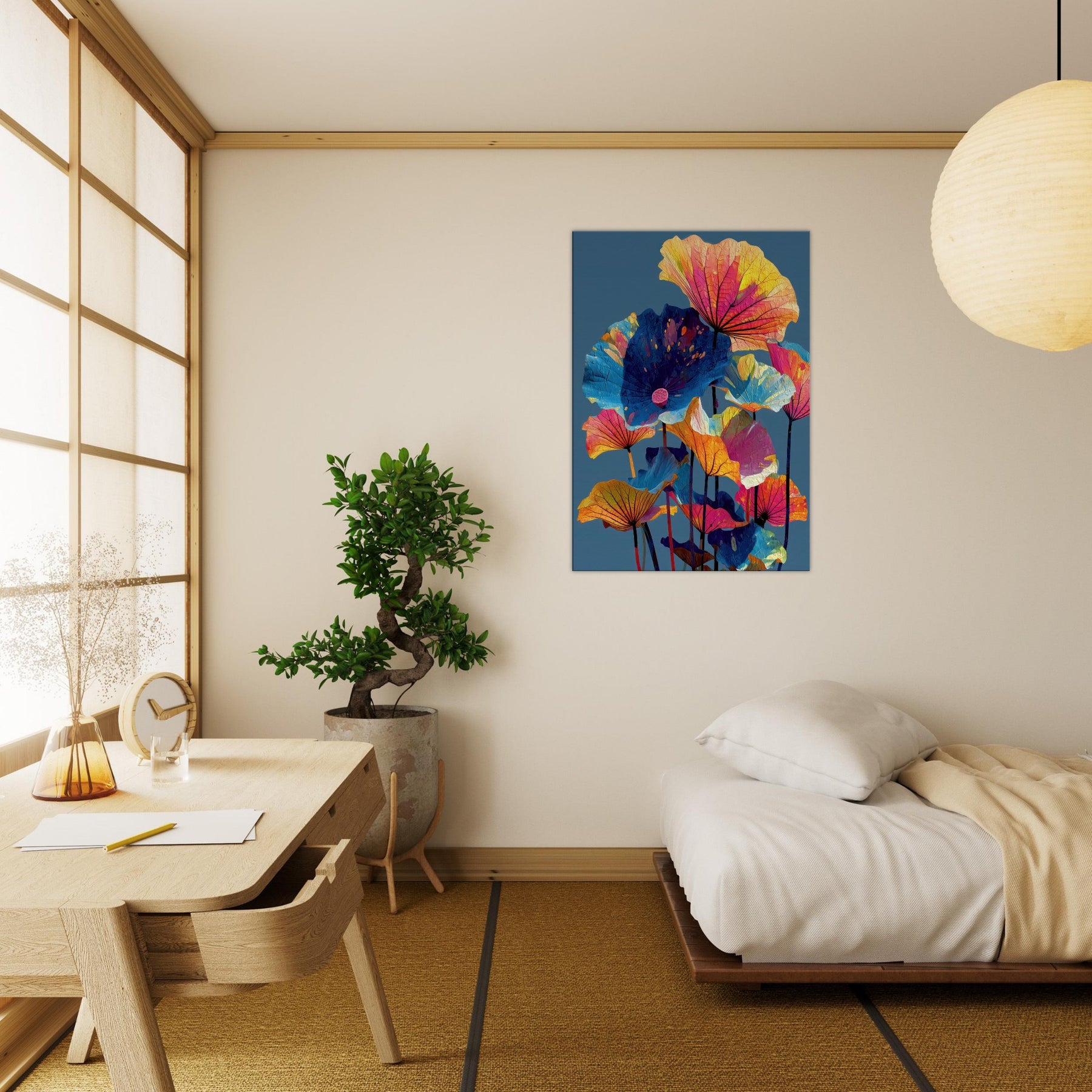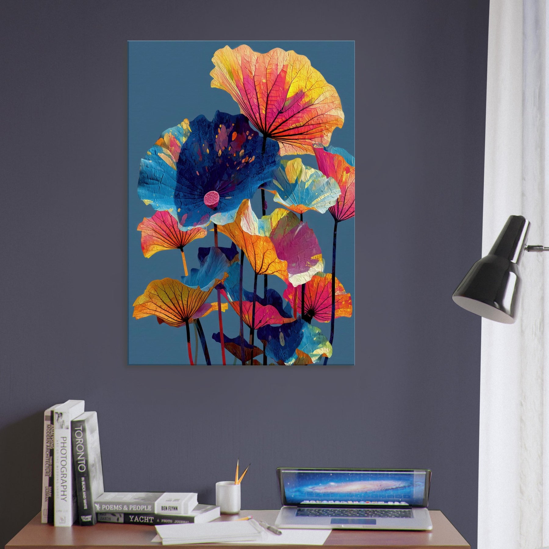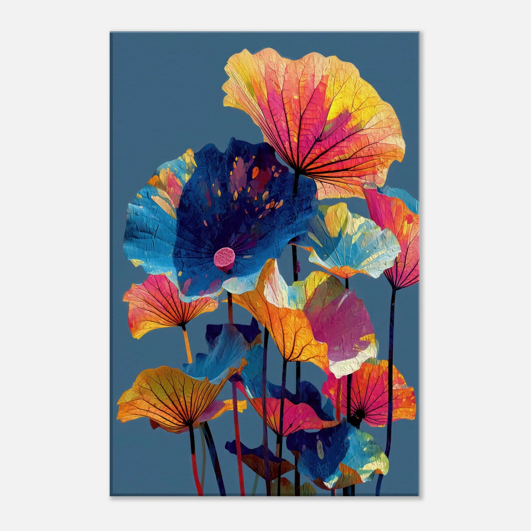 An ode to Lotus Leaves, this abstract composition draws the eye upward with sails of color. Floating petals in electric pinks, citrus yellows, and cobalt blues unfurl against a deep, serene backdrop, as if a quiet pond had become a living canvas. The piece invites calm focus and a playful glow, turning walls into a garden of memory. In a living room or study, it refracts light and mood, pairing botanicals with modern minimalism for a breath of refuge and joy.